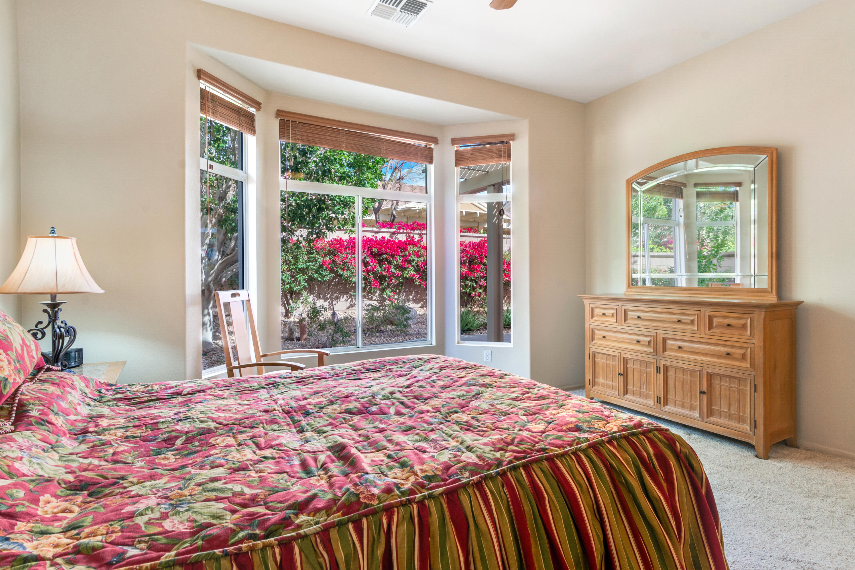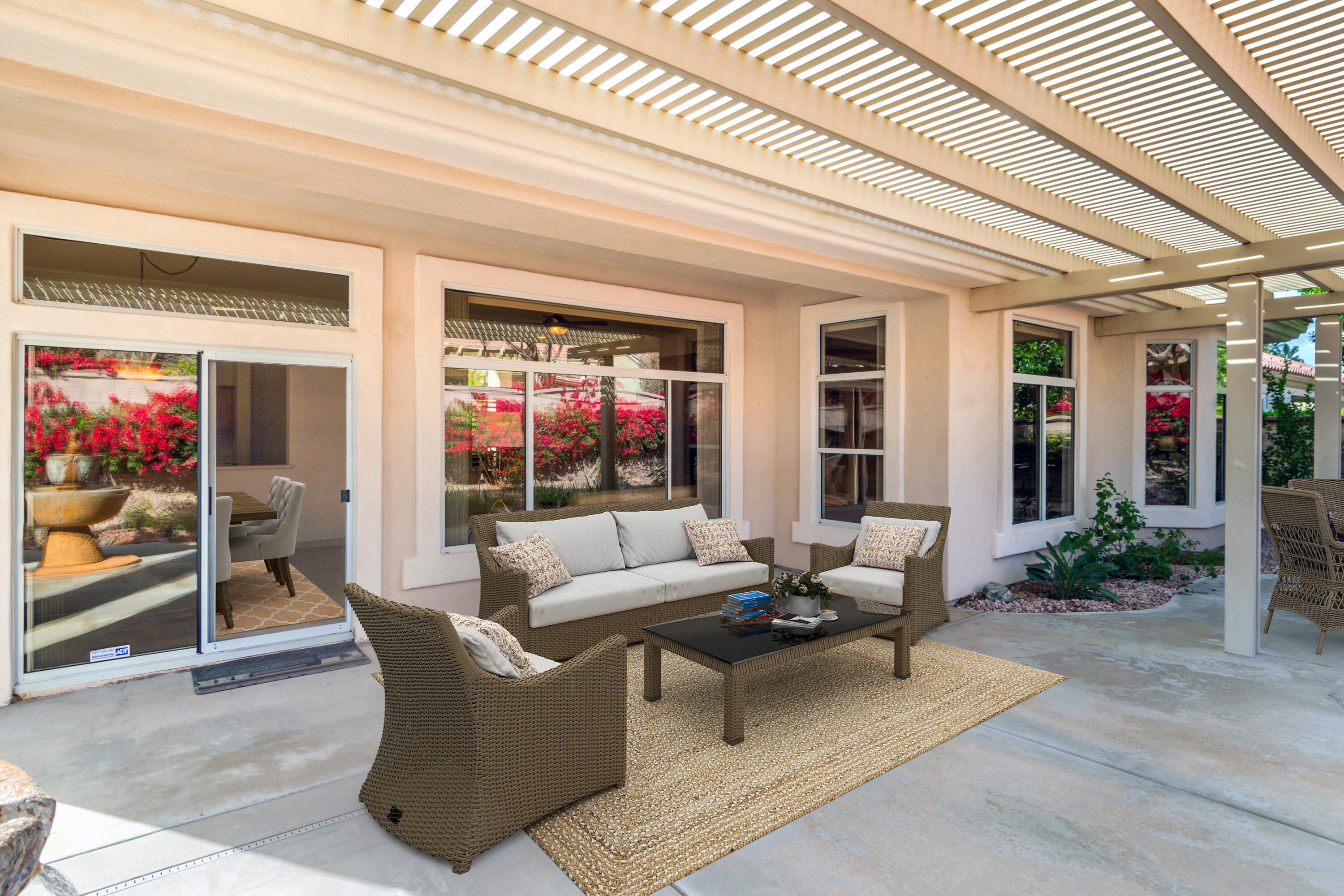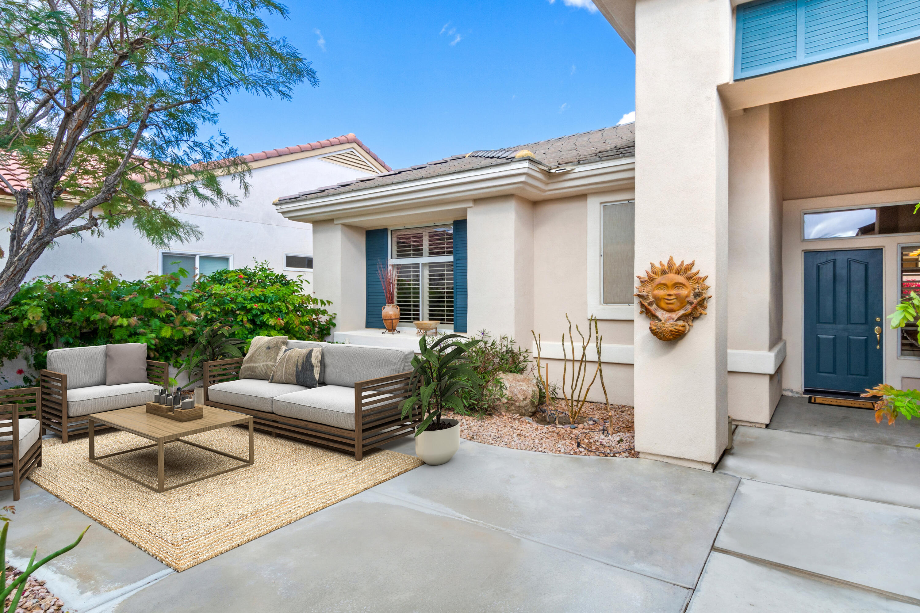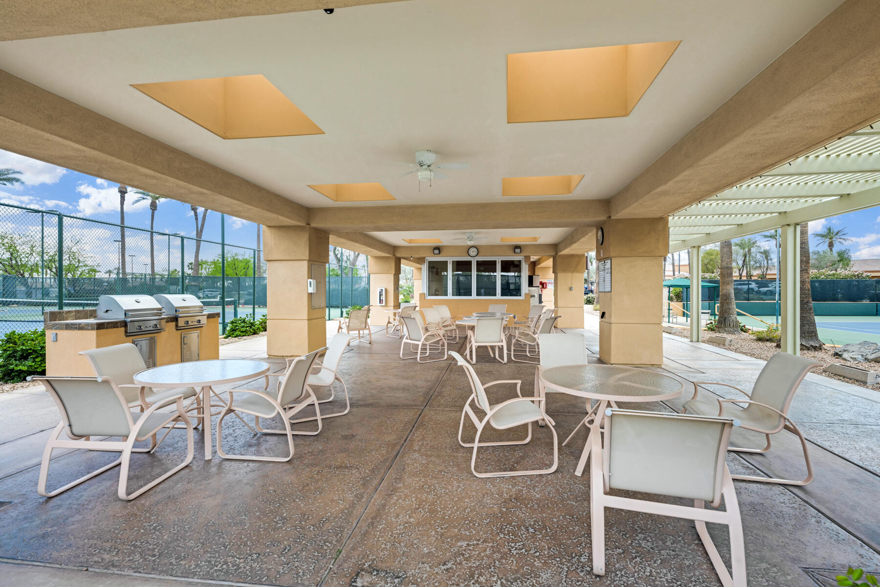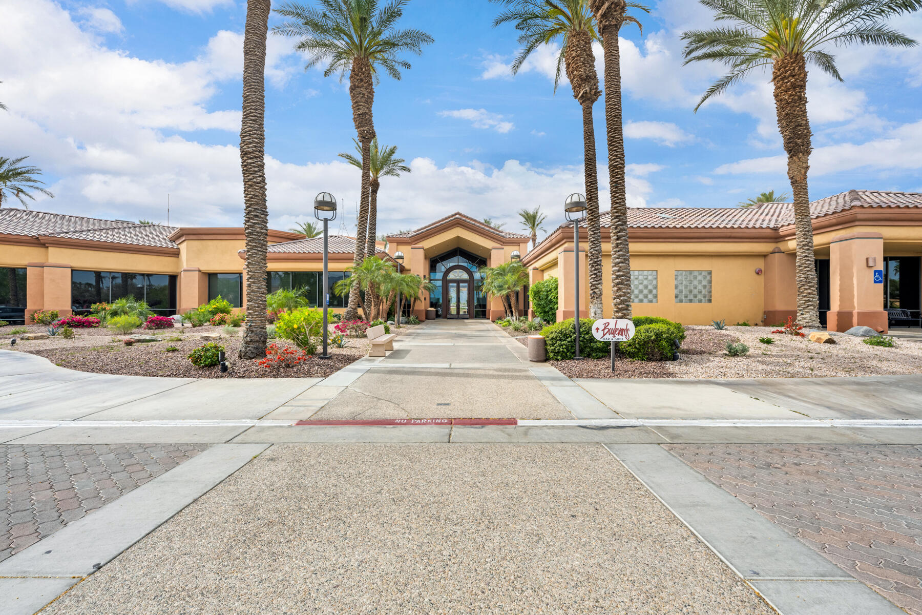 Sun City Palm Desert - Morocco. This popular great room, 2 bedroom, 2 bath plus den home features a north facing backyard with a spacious patio and an Aluma-wood cover. A private gated front courtyard provides a large south facing patio. Inside, 10ft ceilings and transom windows allows indirect natural light. The den has a built-in desk and cabinetry. The kitchen has Corian counters, new stainless appliances and a chef's island. Maple cabinetry adorns the kitchen, linen and bathrooms. Double doors lead to the primary suite with a bay window and a walk-in closet. The primary bath has dual sinks and a beautifully custom tiled shower. The indoor laundry room has a utility sink. The extended 2 car garage has a nook for golf cart parking. HVAC 2015.Interested in this Listing?