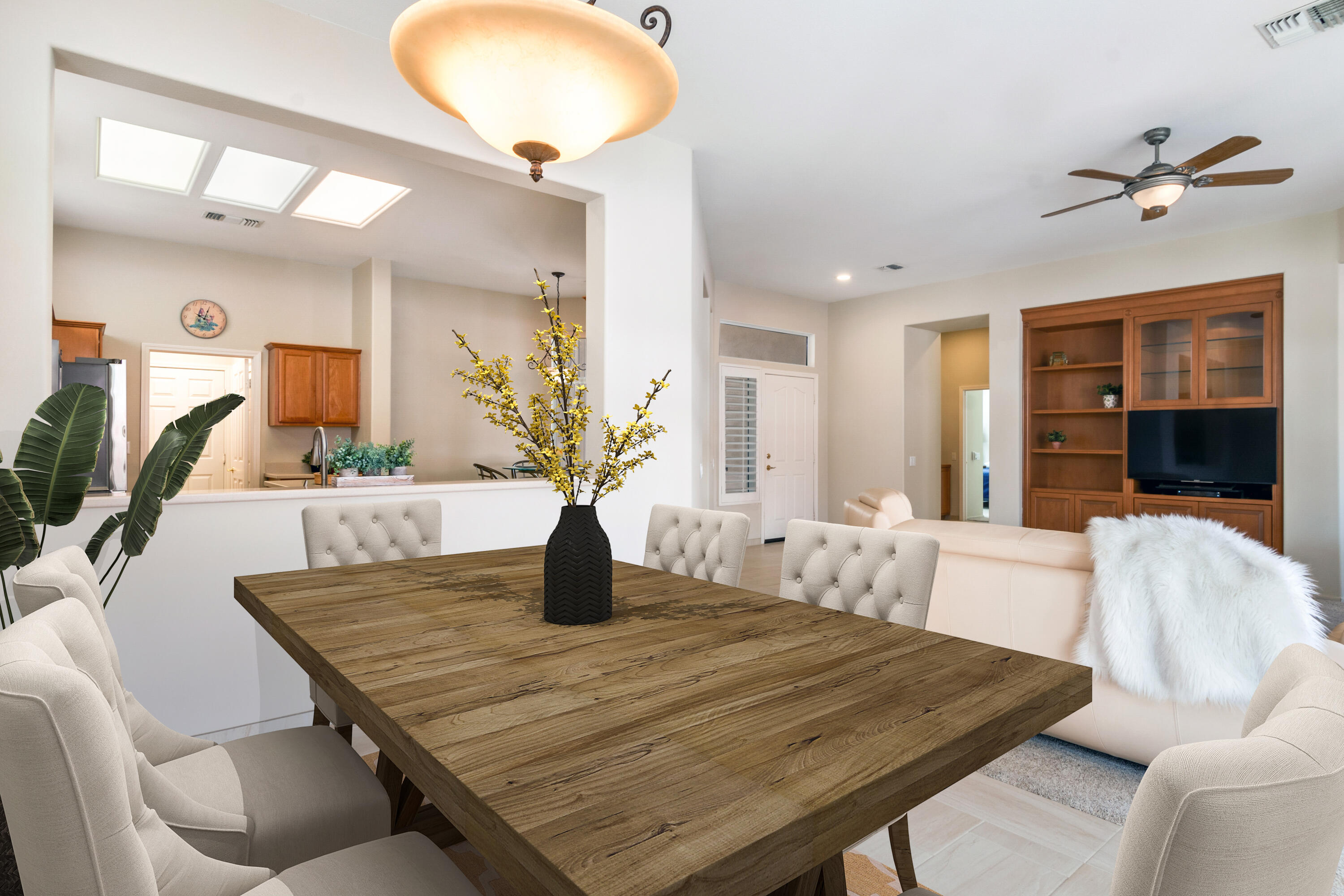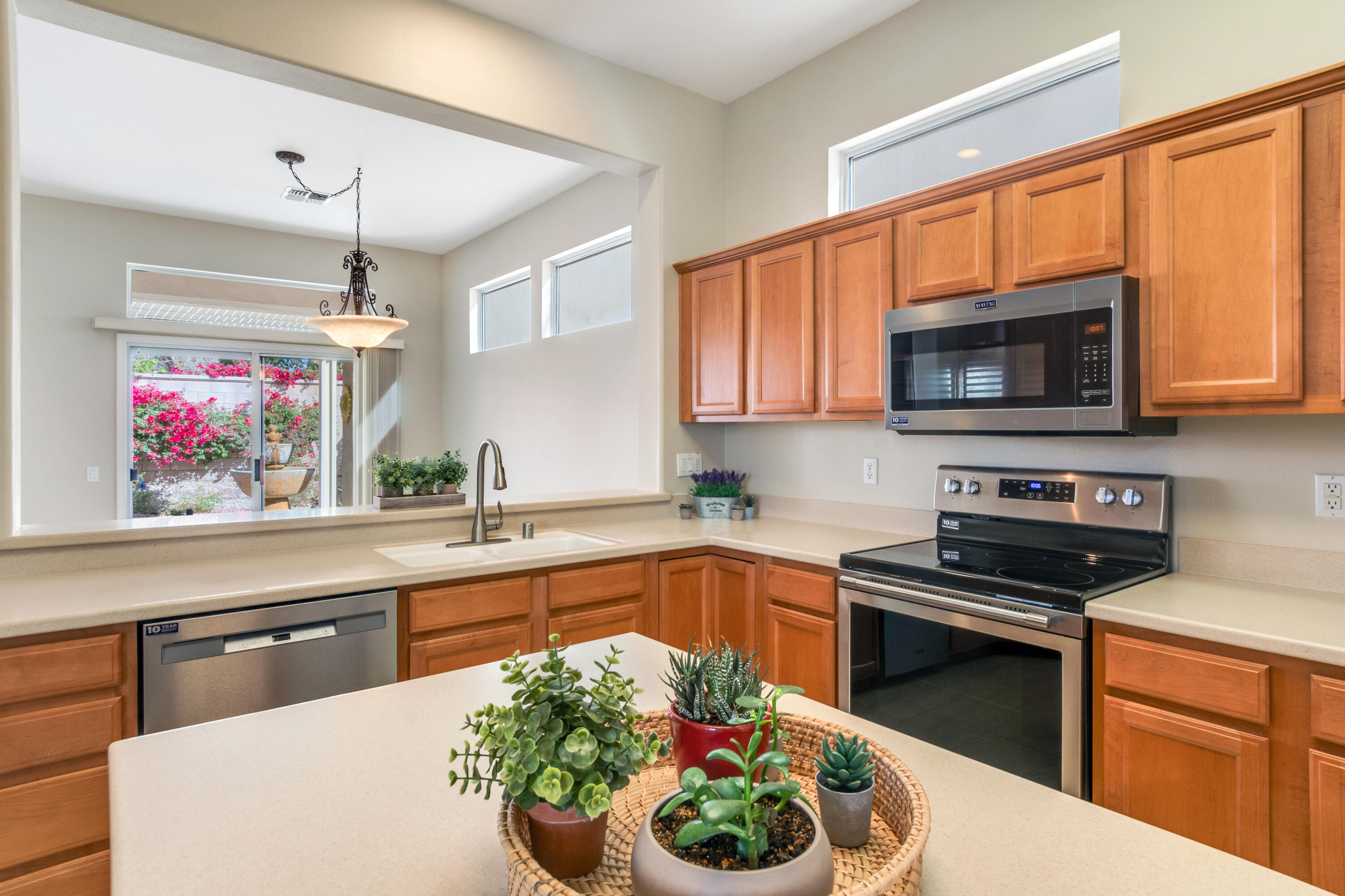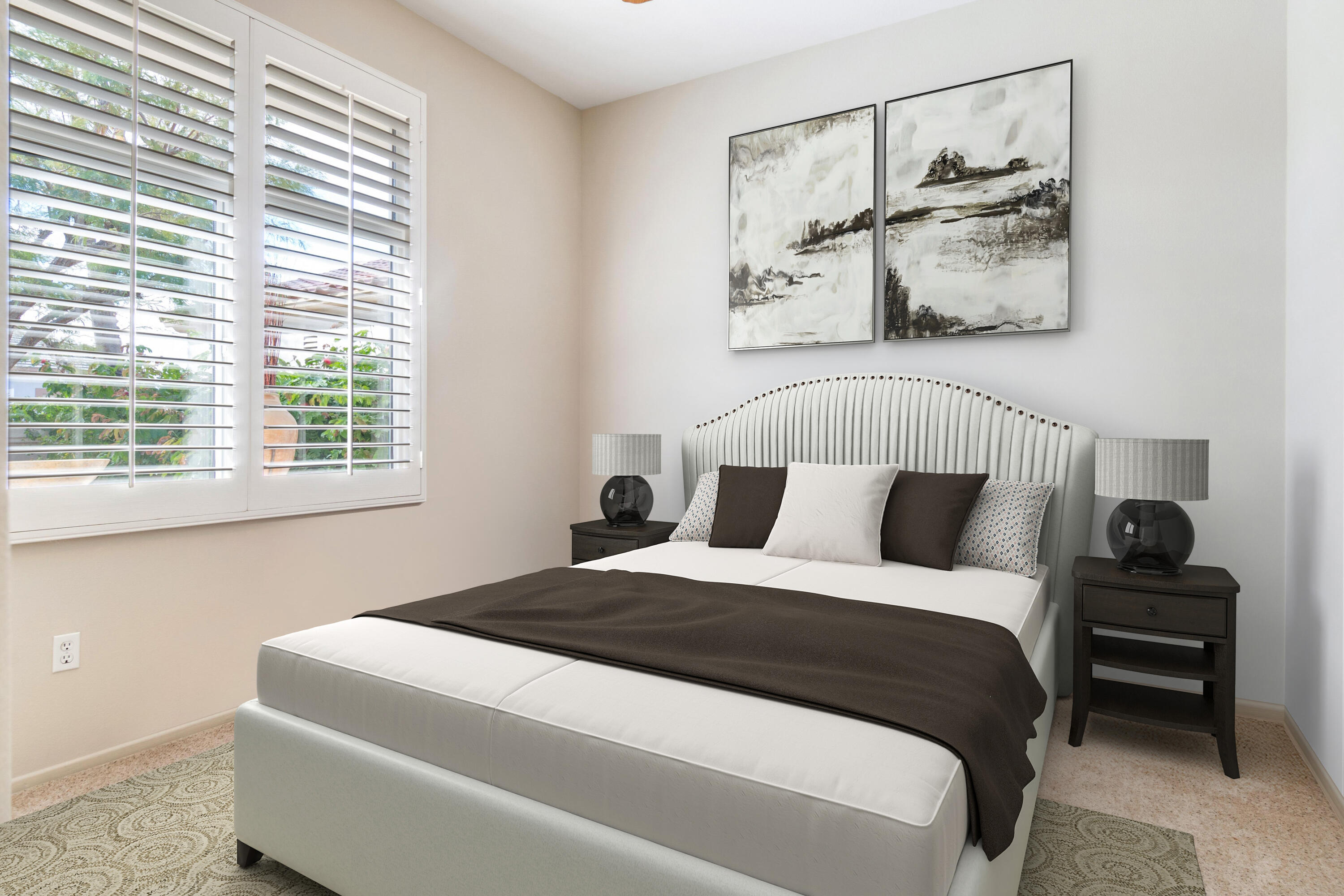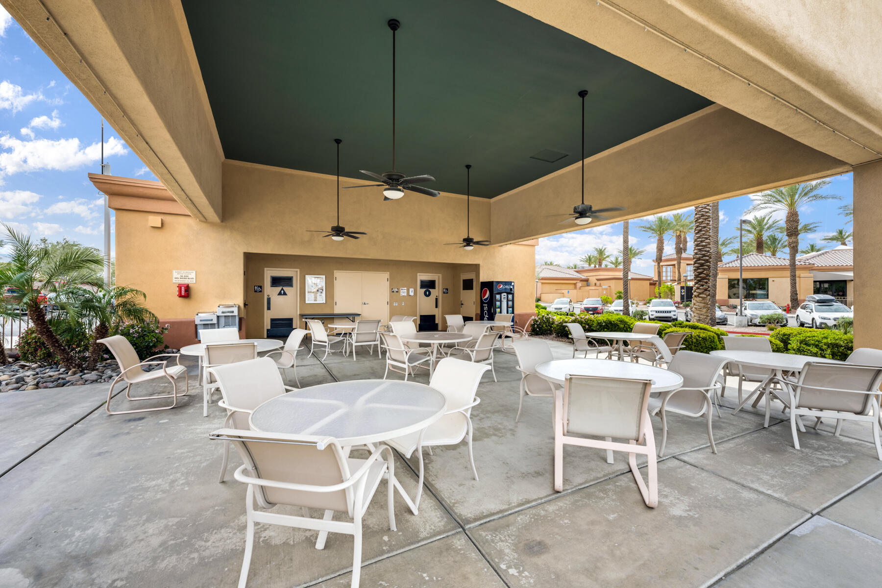 Sun City Palm Desert - Morocco. This popular great room, 2 bedroom, 2 bath plus den home features a north facing backyard with a spacious patio and an Aluma-wood cover. A private gated front courtyard provides a large south facing patio. Inside, 10ft ceilings and transom windows allows indirect natural light. The den has a built-in desk and cabinetry. The kitchen has Corian counters, new stainless appliances and a chef's island. Maple cabinetry adorns the kitchen, linen and bathrooms. Double doors lead to the primary suite with a bay window and a walk-in closet. The primary bath has dual sinks and a beautifully custom tiled shower. The indoor laundry room has a utility sink. The extended 2 car garage has a nook for golf cart parking. HVAC 2015.Interested in this Listing?