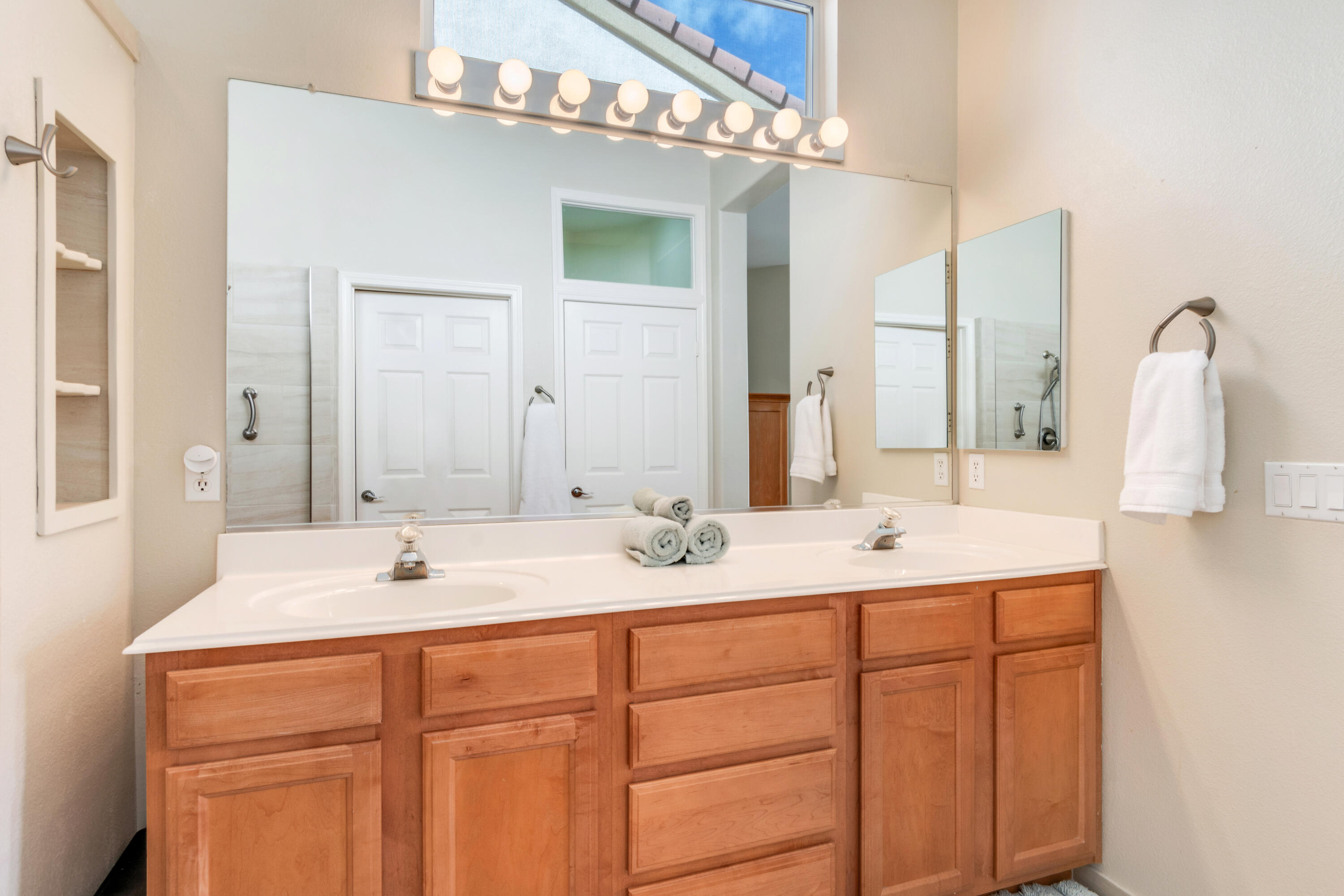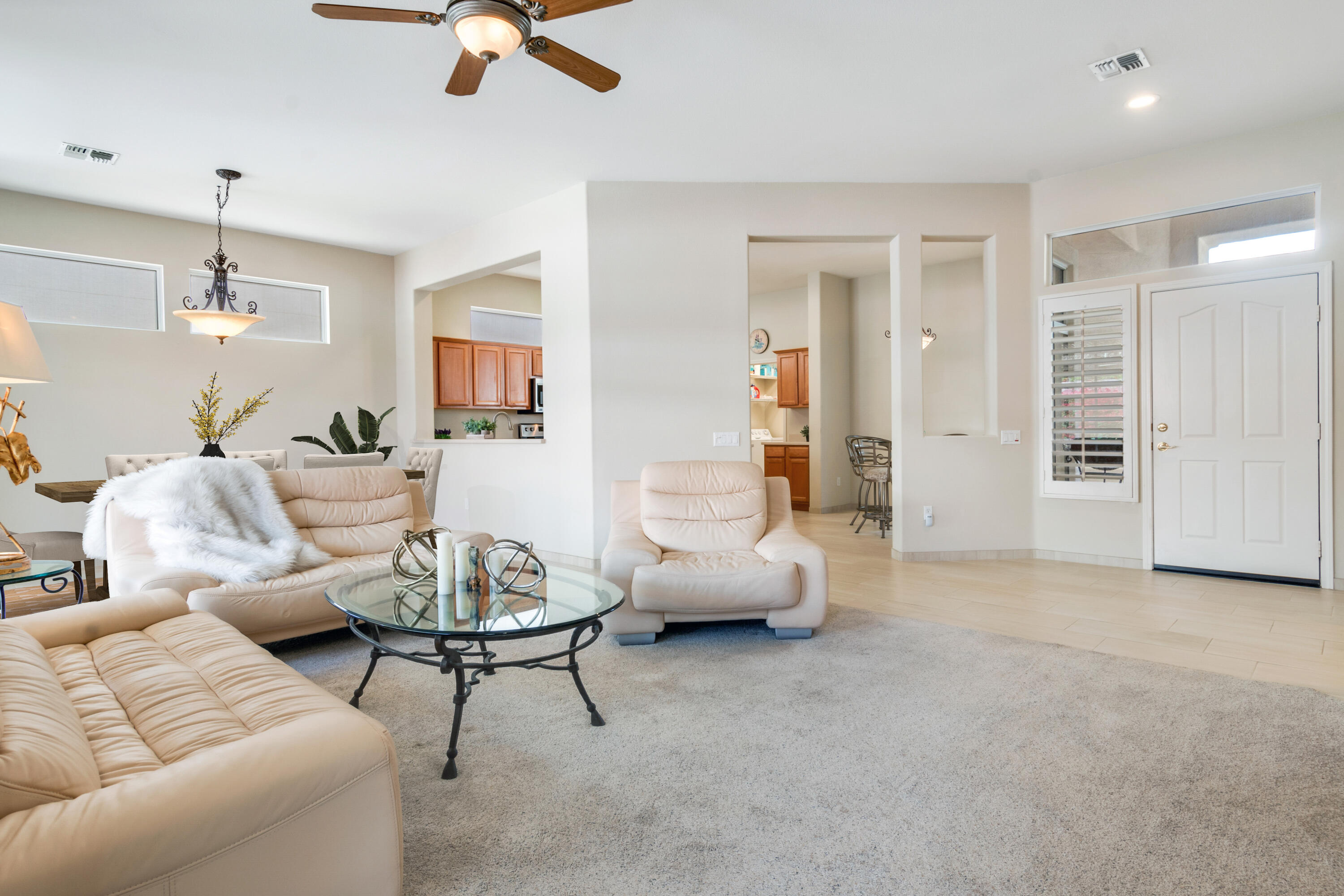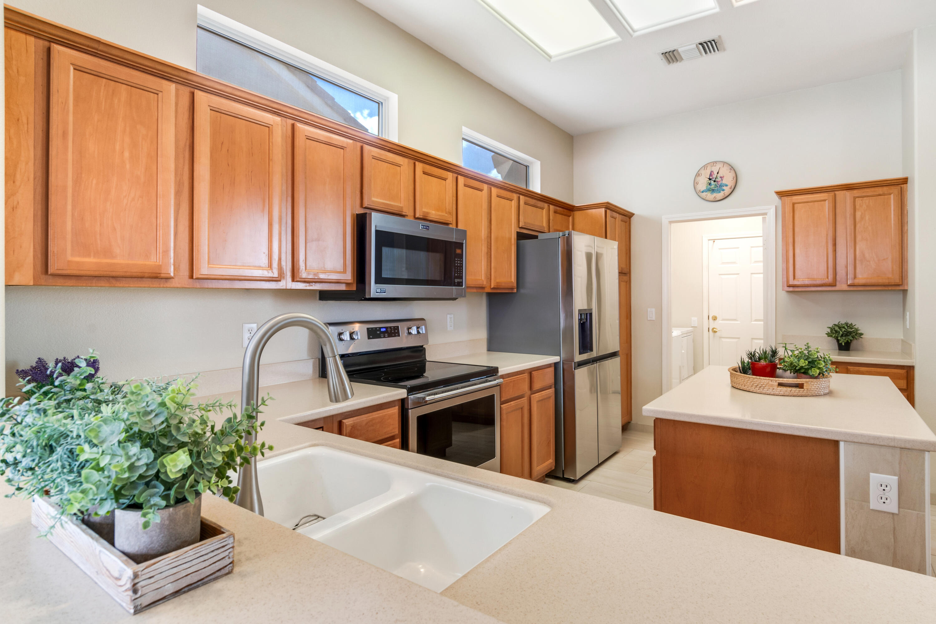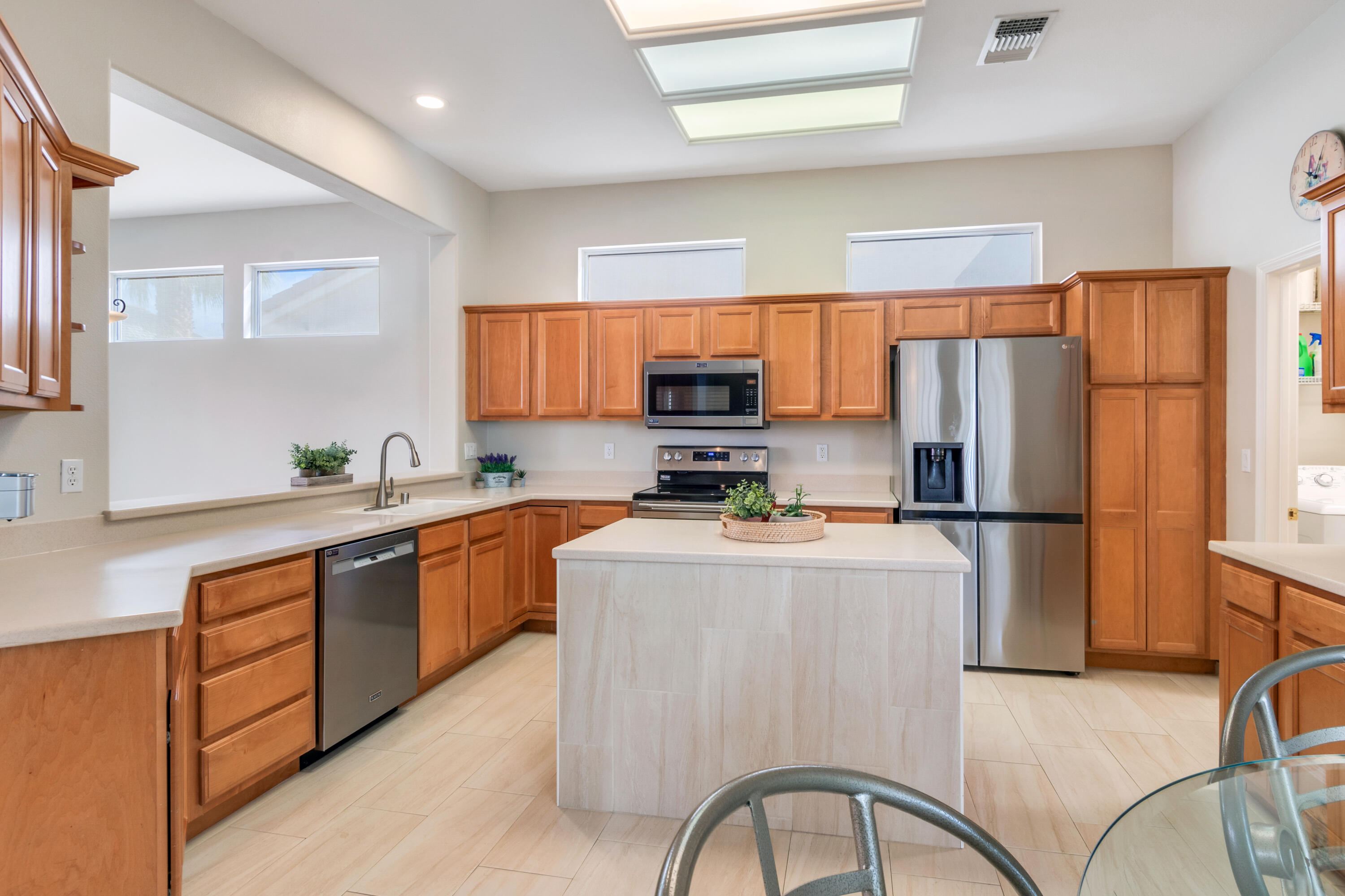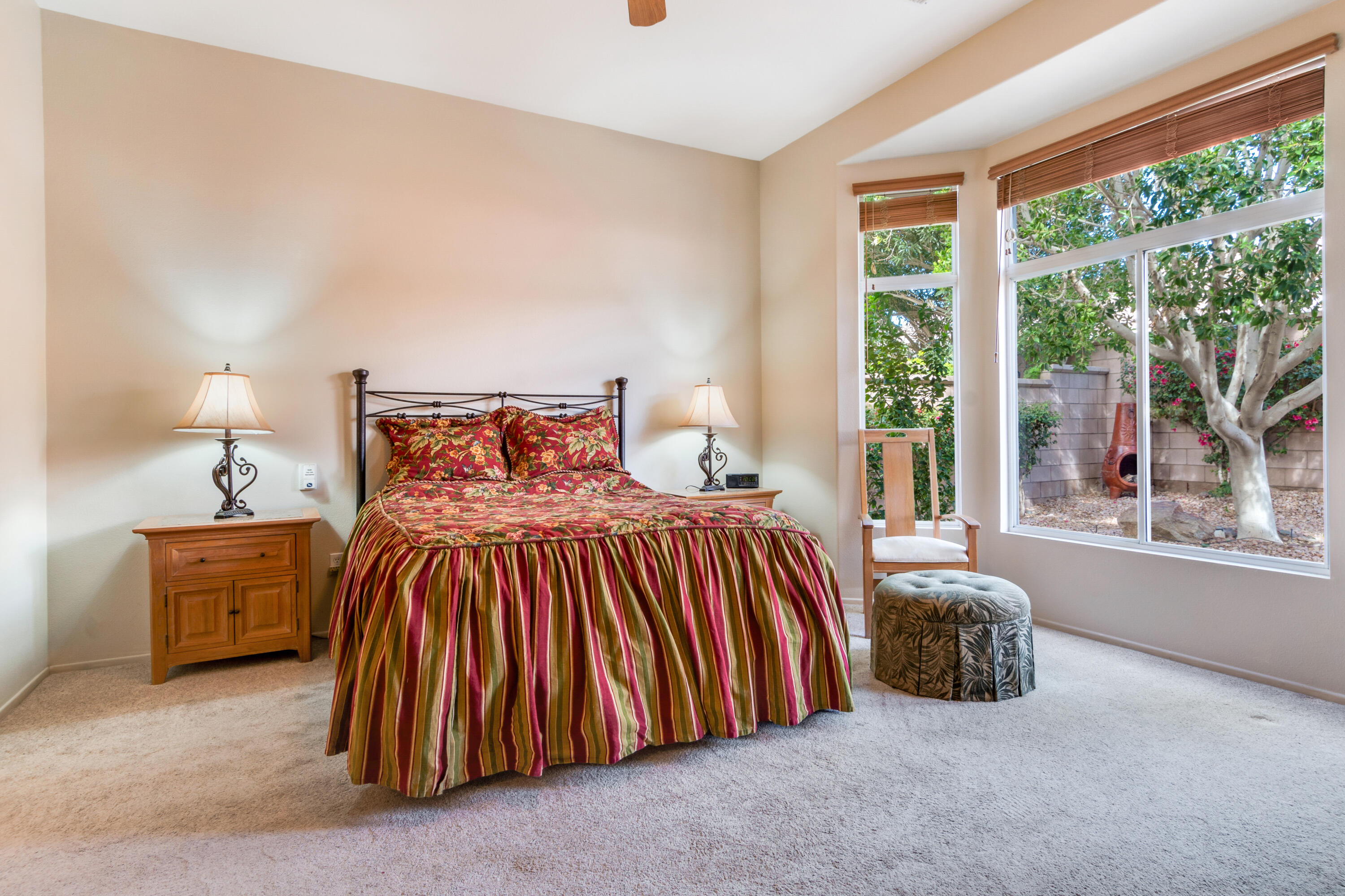 Sun City Palm Desert - Morocco. This popular great room, 2 bedroom, 2 bath plus den home features a north facing backyard with a spacious patio and an Aluma-wood cover. A private gated front courtyard provides a large south facing patio. Inside, 10ft ceilings and transom windows allows indirect natural light. The den has a built-in desk and cabinetry. The kitchen has Corian counters, new stainless appliances and a chef's island. Maple cabinetry adorns the kitchen, linen and bathrooms. Double doors lead to the primary suite with a bay window and a walk-in closet. The primary bath has dual sinks and a beautifully custom tiled shower. The indoor laundry room has a utility sink. The extended 2 car garage has a nook for golf cart parking. HVAC 2015.Interested in this Listing?