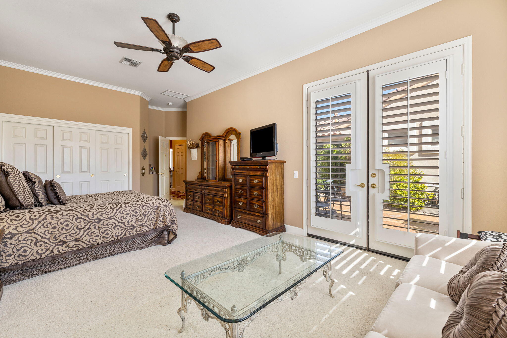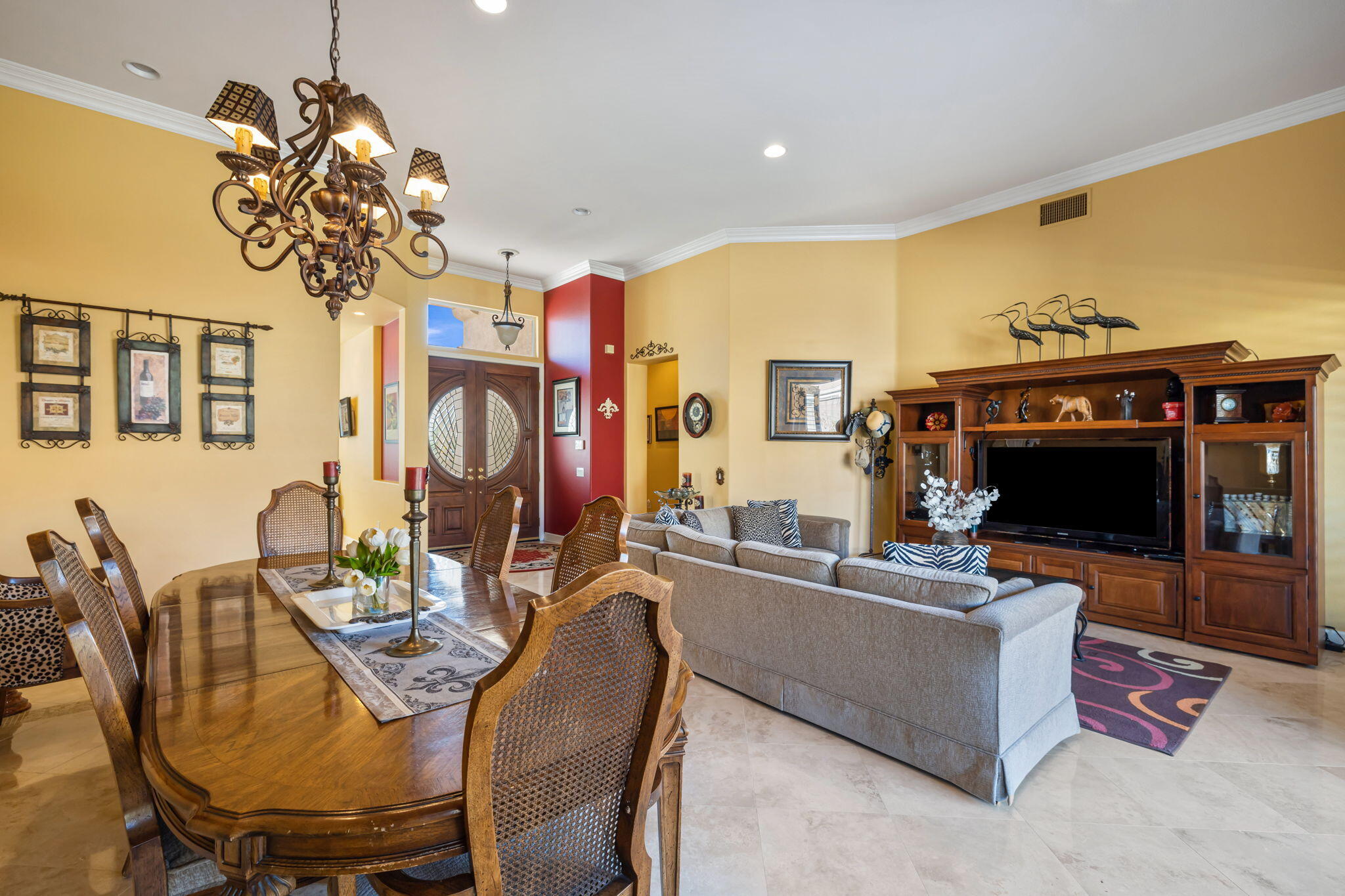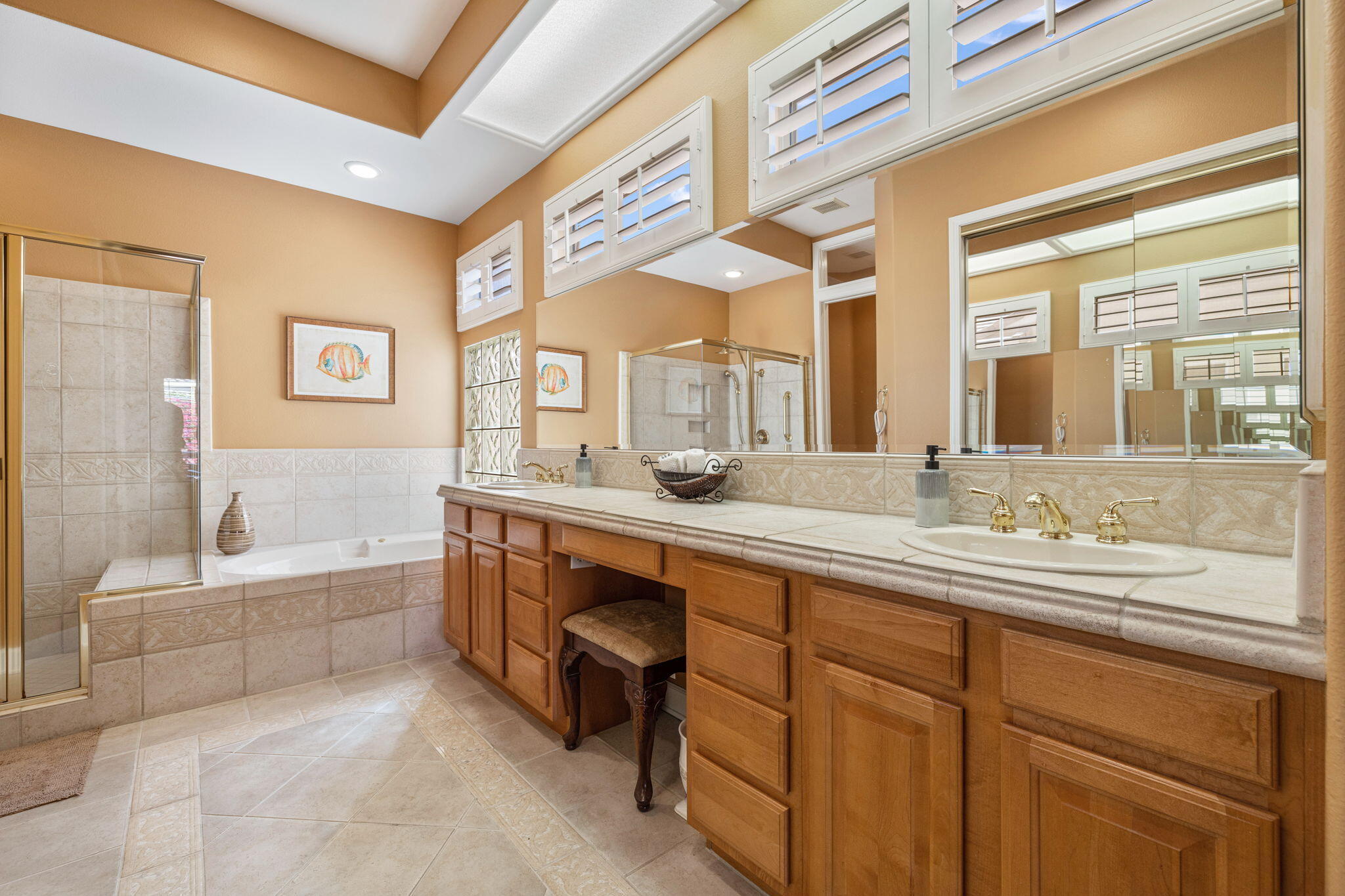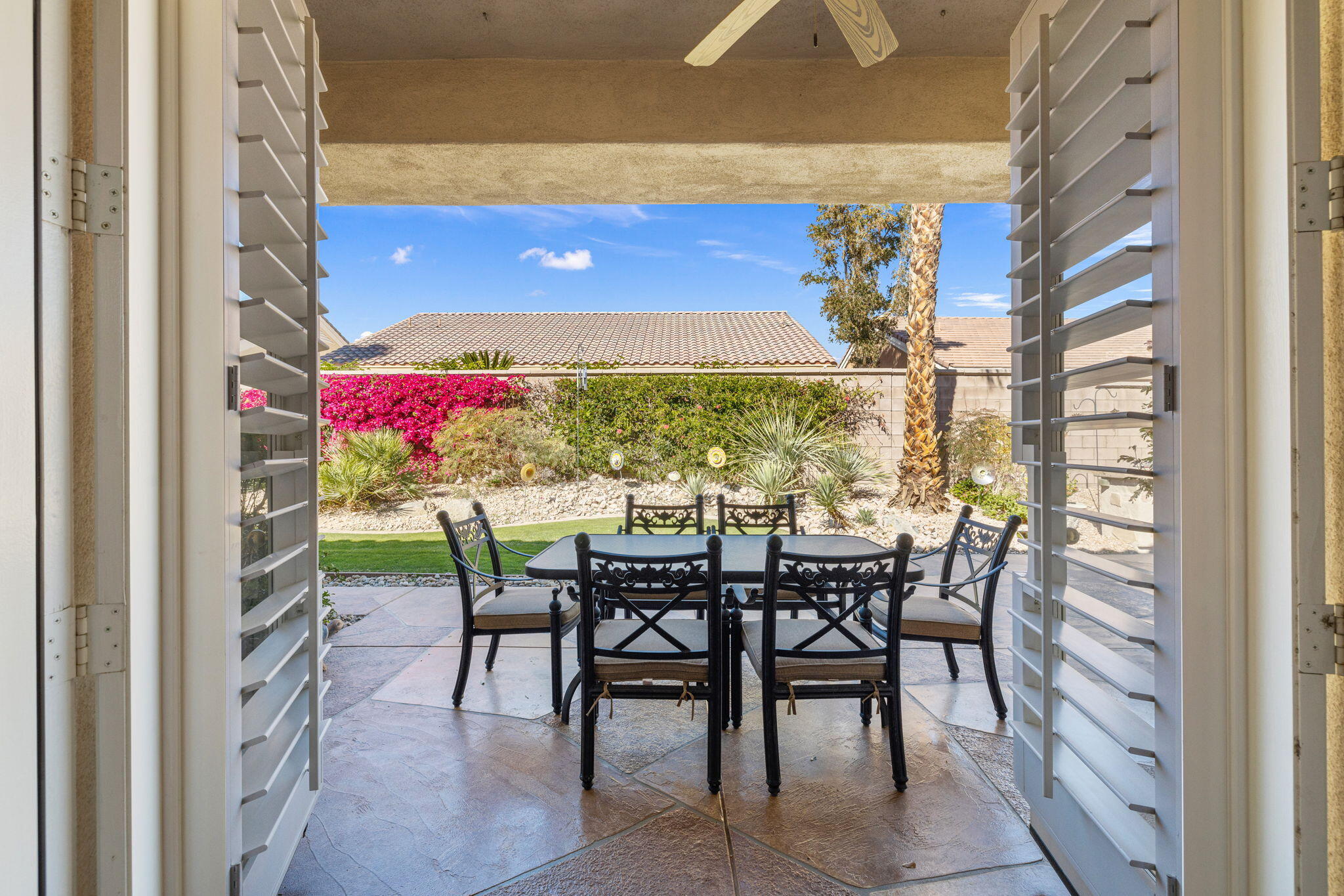 Located in the best 55+ community in the valley, Sun City Palm Desert, The Monaco is one of the most popular floor plans in the community. It is 2439 sq. ft. and has beautiful light travertine floors, rich bold interior colors, Plantation shutters and crown molding throughout. It has 2 NEWER AIR CONDITIONERS IN 2022. It has 2 bedrooms, a den, 2.5 bathrooms, and a 2 car garage plus a golf cart garage. The kitchen has slab granite, upgraded original maple cabinets with hardware, recessed lights, and a skylight. It's open to the family room and kitchenette area. The living and dining rooms have a wall of windows with a slider out to the backyard. The master bedroom is extended and also has a door out to the private, north-facing backyard, which has citrus trees, a patio cover, misters, a built-in BBQ, and gorgeous concrete overlay. The bathroom has a double vanity, a soaking tub, walk-in shower, and a walk-in closet. The extended guest bedroom is an ''attached casita'', with a separate entrance through double French doors in the courtyard. It has a full bathroom, and plenty of space for a sitting area or an office. The den has been opened up and has tray ceilings, plantation shutters, recessed lights and would be perfect for a guest room or office. The laundry has upper cabinets and includes the washer and dryer. The extended 2-car garage has a golf cart garage, lots of storage cabinets, a washer and dryer, and a newer mini-split A/C. What a beautiful home. Turnkey furnishings are available. SUN CITY PALM DESERT IS ALL ABOUT LIFESTYLE!! It has many clubs, activities, amenities, and low HOA dues. Play at 2 championship 18-hole golf courses and practice facilities, pickle ball, tennis, softball, bocci ball, 18-hole miniature golf course, an honor library, arts and crafts, a ballroom for special entertainment, and 4 saltwater pools kept at 87 degrees with hot tubs. Enjoy 2 great restaurants, a martini/coffee bar, and even a post office. It has a newly renovated classy indInterested in this Listing?