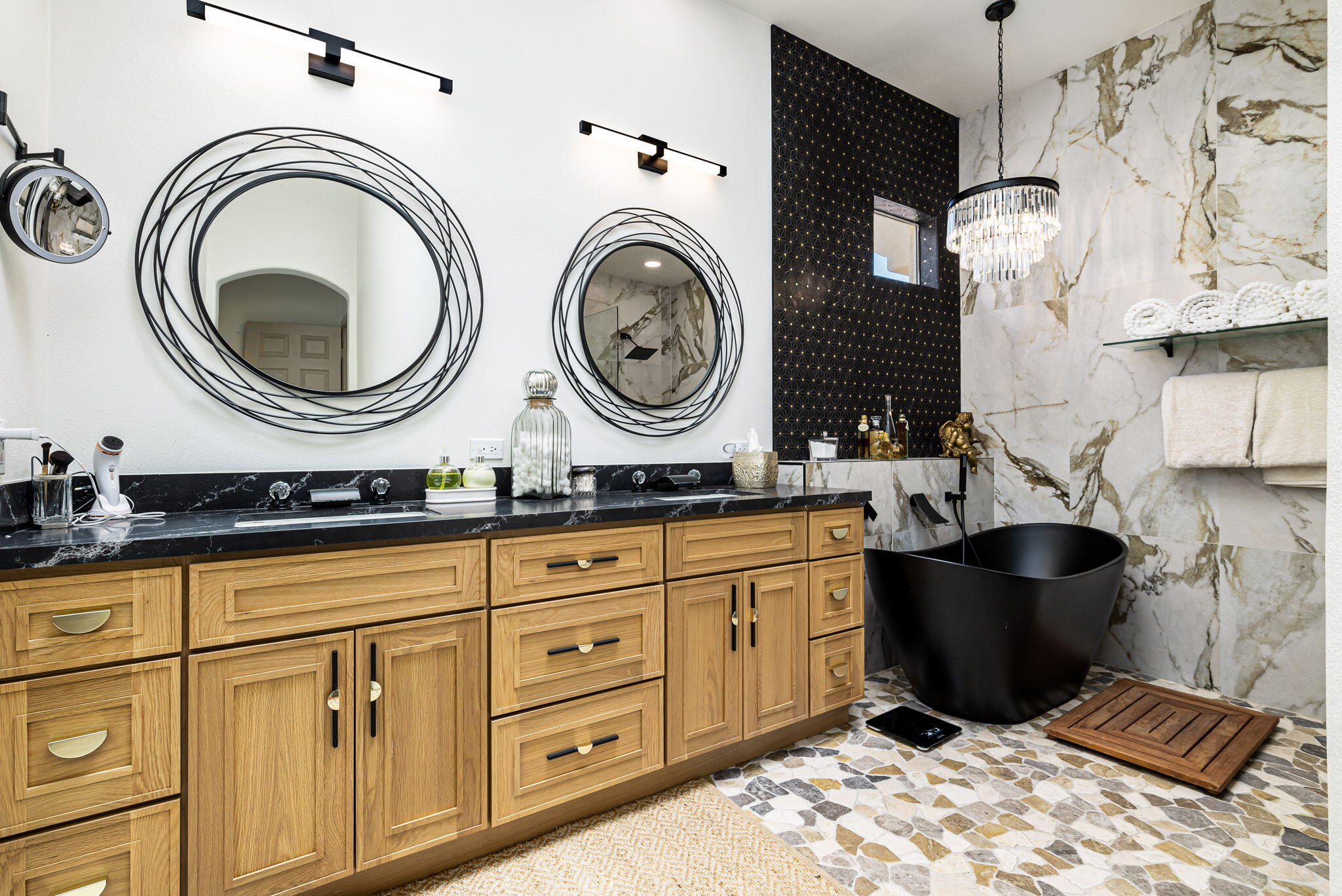 OPEN HOUSE SUNDAY 5/11 12-3 PMFURNISHEDEnter through leaded glass double doors into an open concept living/dining area with added electric fireplace. The 'Chef's' kitchen features a 10' stone island, coordinating stone perimeter, and a coffee/tea bar. A 48' Italian dual range stove with custom vent hood encased in wood, creates a cook's workshop. French design cabinetry includes large pantry with slide-out shelves.The master bath has an extended walk-in shower, soaking tub, and double vanity. The office/den offers privacy with pocket doors.A new glass slider opens to a lush yard for stargazing. Close to amenities like golf, sport courts, and clubs.Interested in this Listing?