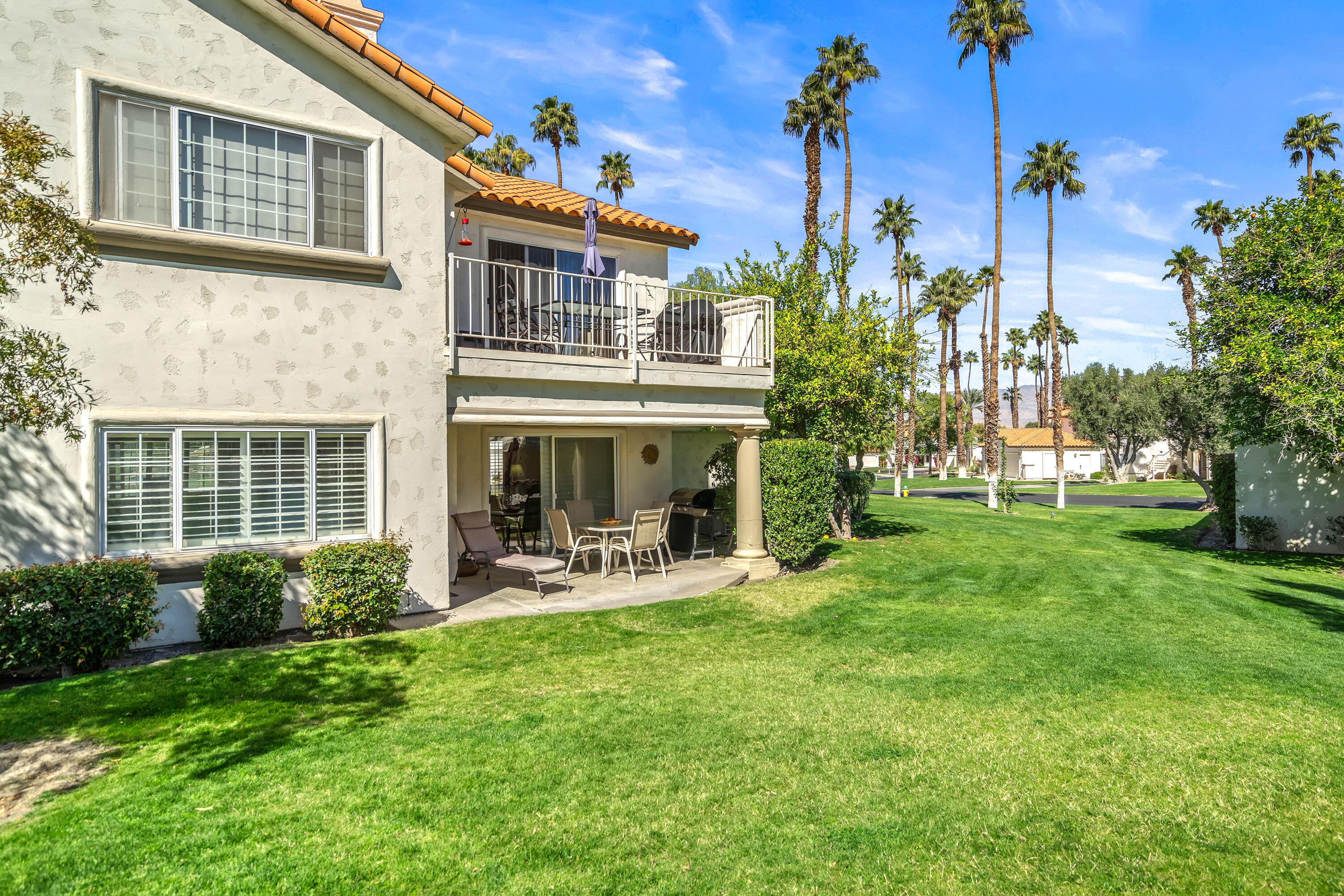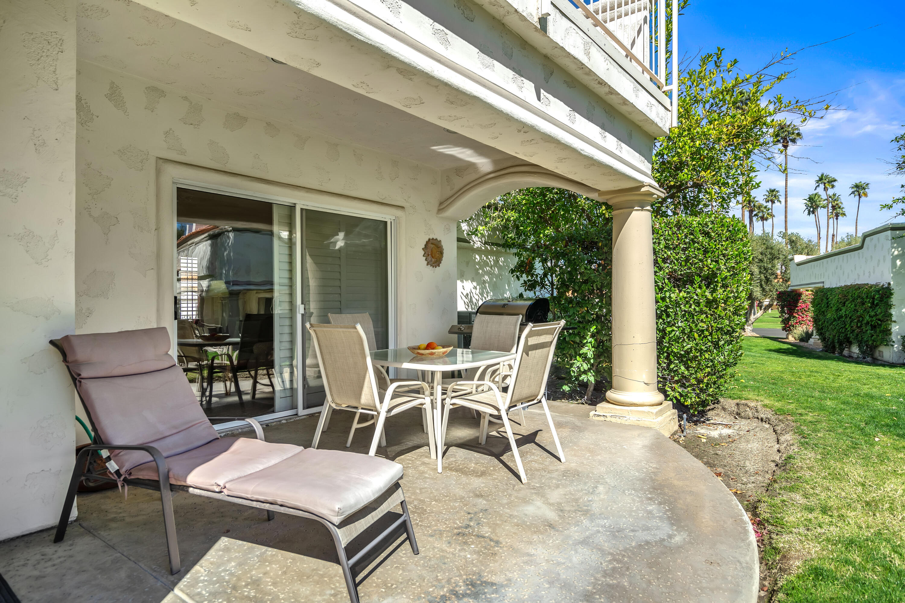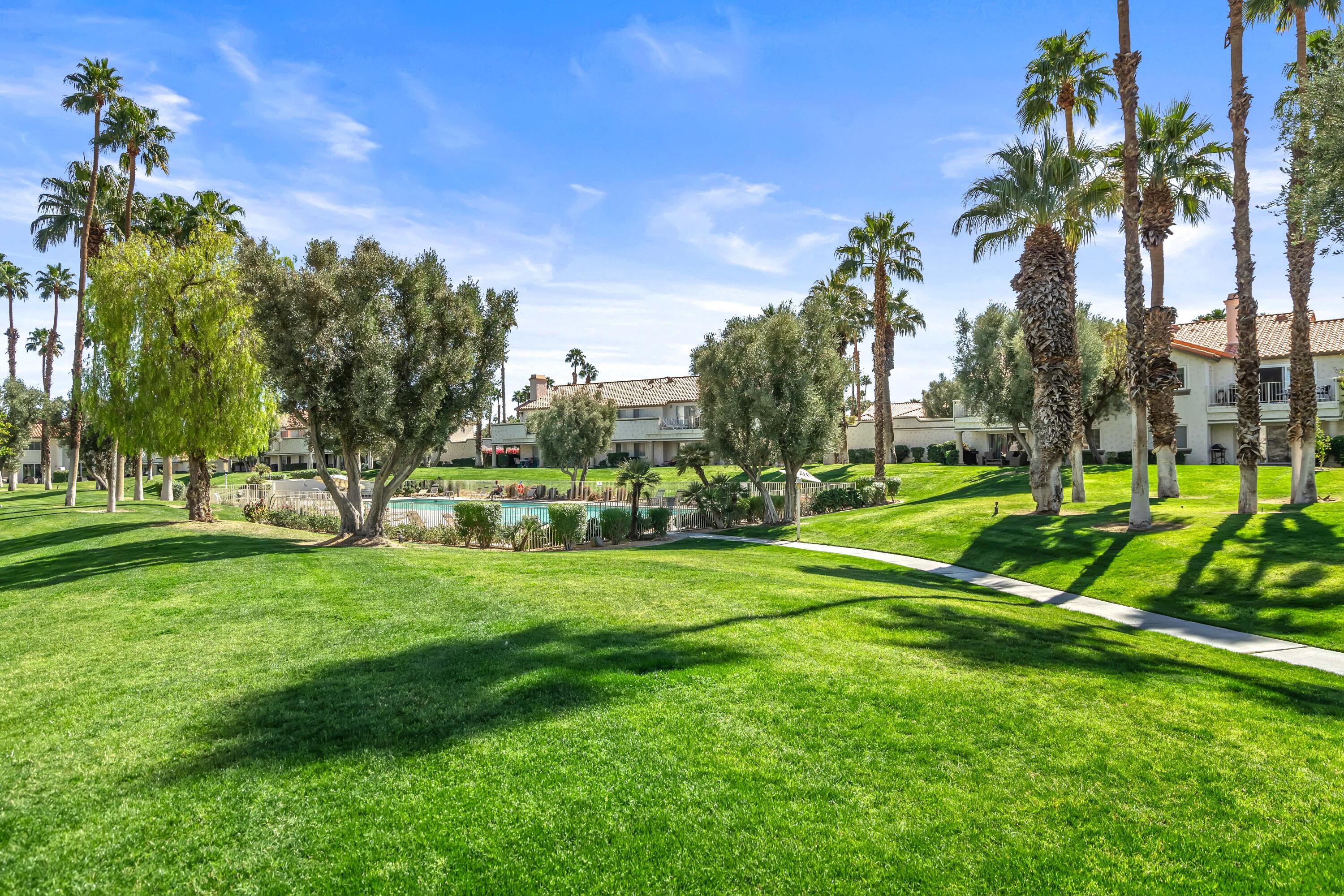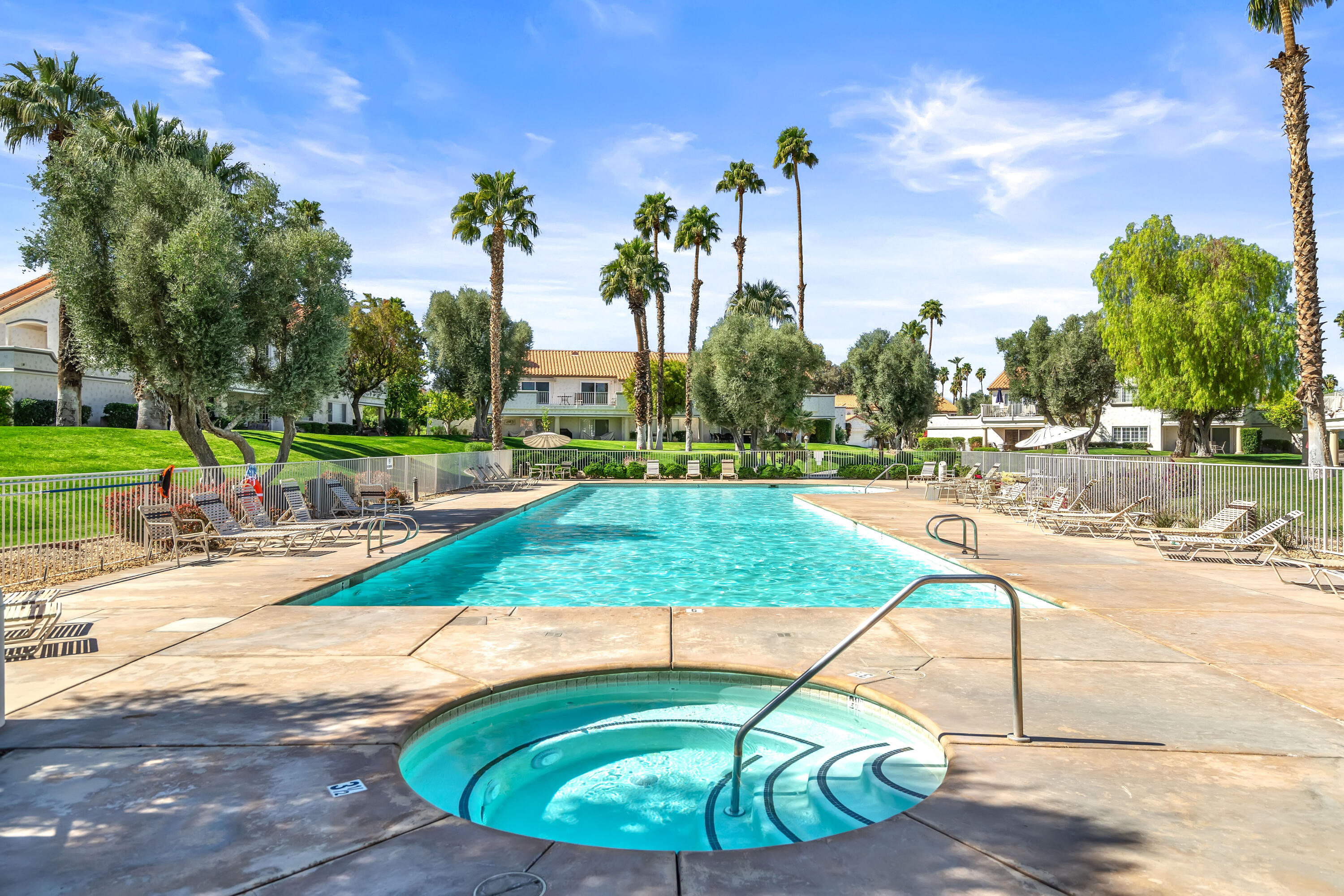 Enjoy the peacefully greenbelt setting with views of the trees and HUGE pool just steps away from this GROUND LEVEL 2 bedroom 2 bath condo in Desert Falls C.C. Featuring beautiful slab granite kitchen counters, stainless steel appliances, light maple cabinetry and cozy fireplace in the family room. The large primary suite also has slab granite counters, dual vanities, custom cabinetry and a French door to your sunny covered rear patio with views. Additional upgrades include Plantation shutters, garage storage cabs, replaced A/C unit, water heater and garage door opener. Desert Falls C.C. features an 18 hole golf course, pickle ball & tennis courts, fitness center, pools, clubhouse restaurant and more. Centrally located in the Coachella Valley. close to fabulous dining, shopping, Accusure Arena, Indian Wells Tennis gardens, casinos and great golf courses.Interested in this Listing?