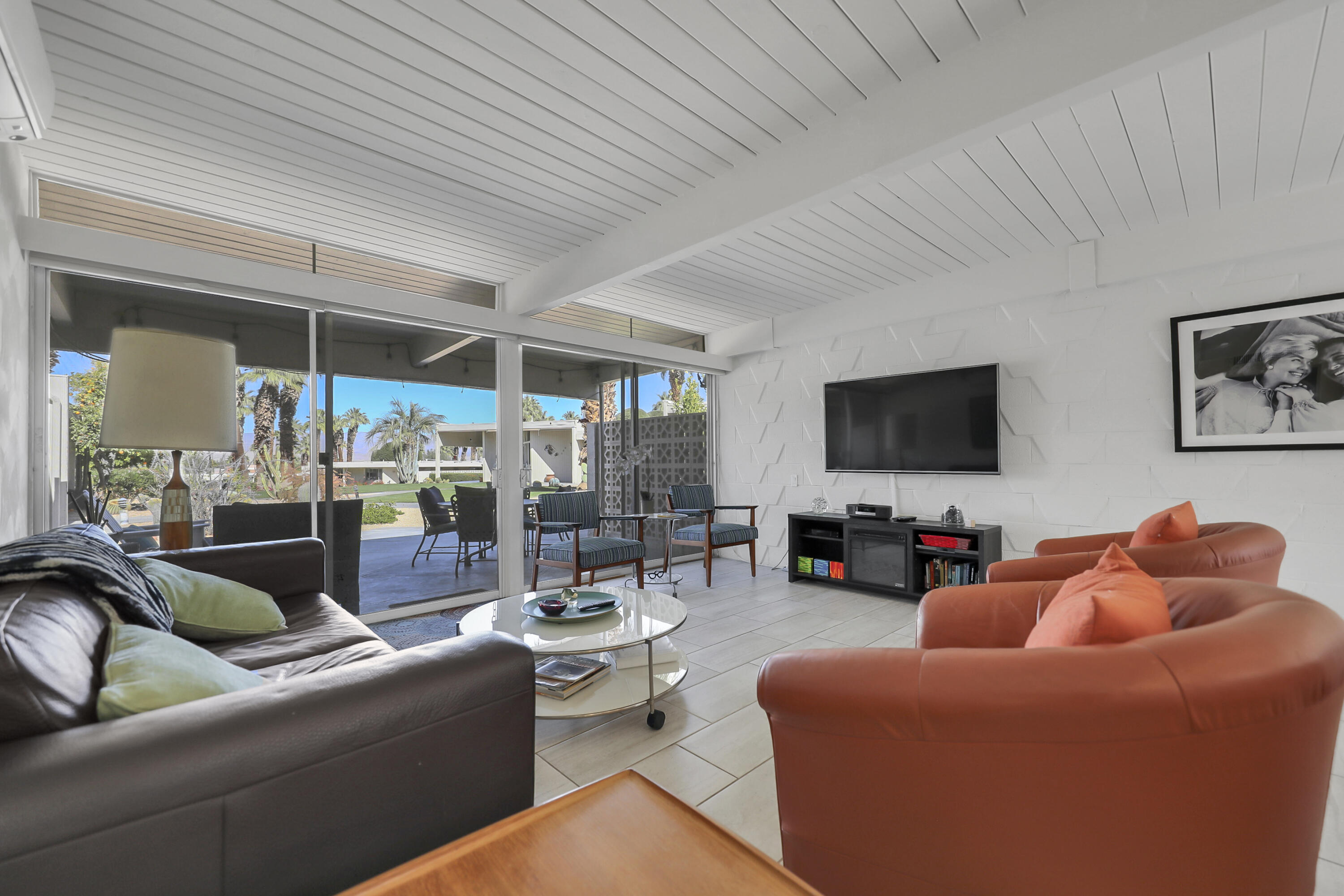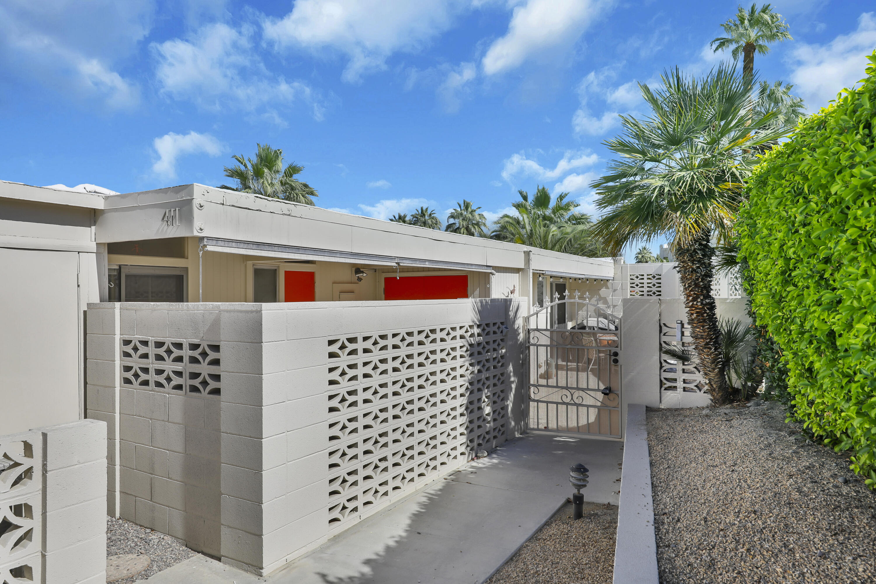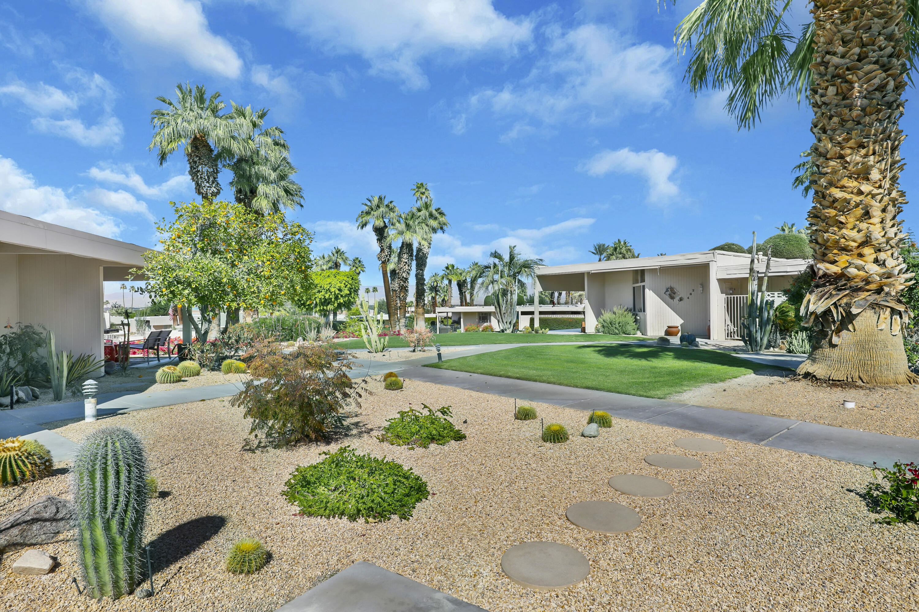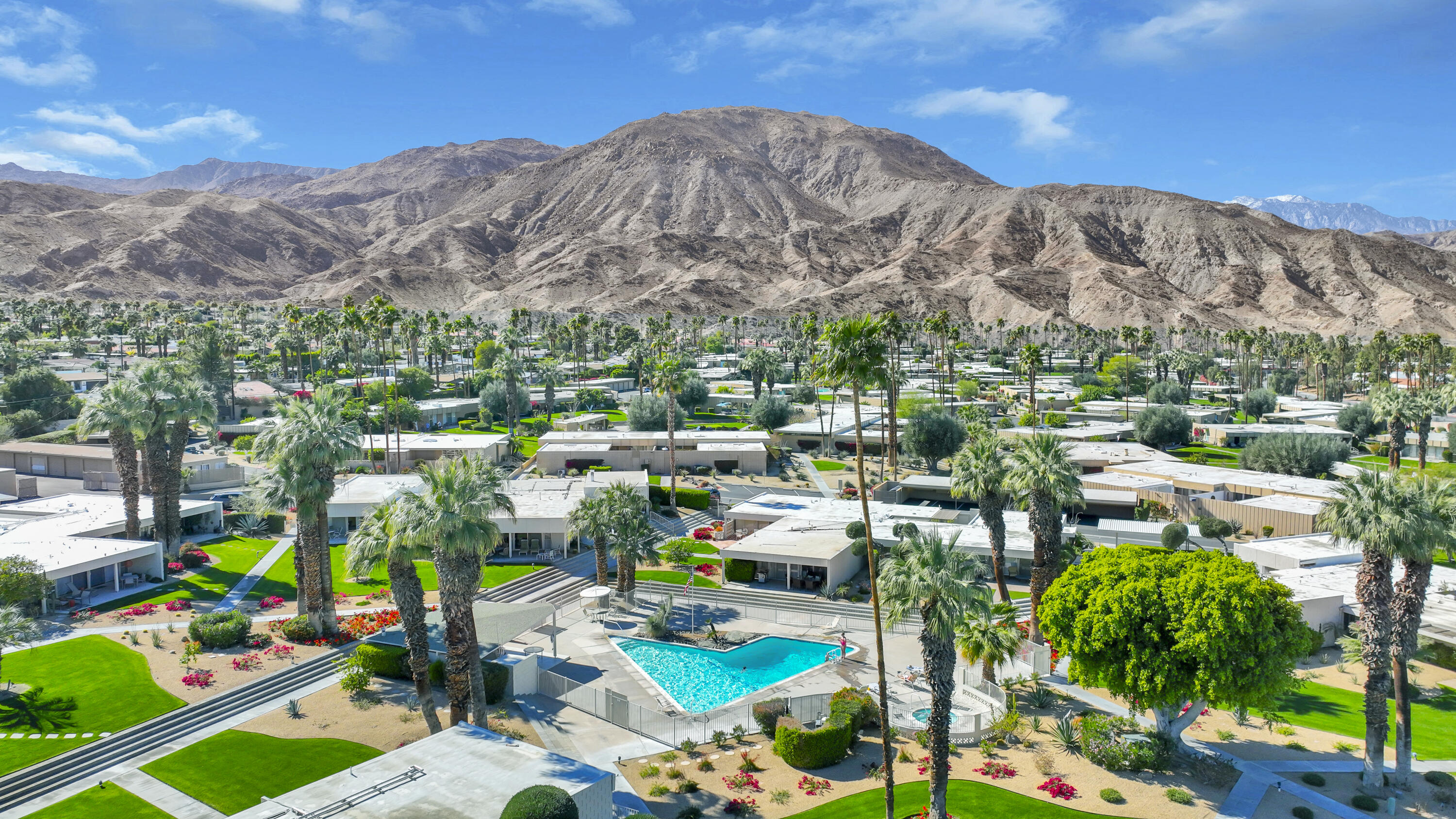 Step into a piece of history with this exquisite William Krisel MCM masterpiece, built in 1960. This extraordinary 2-bedroom, 2-bath home offers timeless elegance, featuring beautiful tile flooring throughout, low beamed ceilings, and expansive floor-to-ceiling glass that bathes the interior in natural light. This residence combines classic mid-century design with modern comforts, creating the perfect retreat for both relaxation and entertainment. The home boasts exceptional climate control with a new coat of elastomeric on the roof and mini-splits in each bedroom & the living room, ensuring year-round comfort. Outside, you'll find serene outdoor spaces designed for tranquility and leisure. Enjoy a private patio off the primary, bordered by a wall for extra privacy, and a partly covered outdoor dining area ideal for casual lounging and al fresco meals. A tranquil cactus garden off the dining room provides a unique workspace amidst nature. The prime location allows you to walk to El Paseo with upscale shops, dining and much more. Surrounded by mature palms, this community features keyed access to common areas, including a sparkling pool and spa located steps from your back patio. This home is not just a residence; it's an invitation to embrace your Rat-Pack dreams in a serene and stylish setting. This mid-century development features 306 units spread across 49 acres, organized into 18 circles with 9 homeowners associations. Each circle centers around a common swimming pool, with units designed for privacy and a blend of public and private spaces. Featuring decorative concrete block, shadow block, and breezeblocks in a variety of textures and patterns, along with clerestory windows, expansive glass panels, detailed eaves, and flat roofs. Don't miss the opportunity to come see it today!Interested in this Listing?