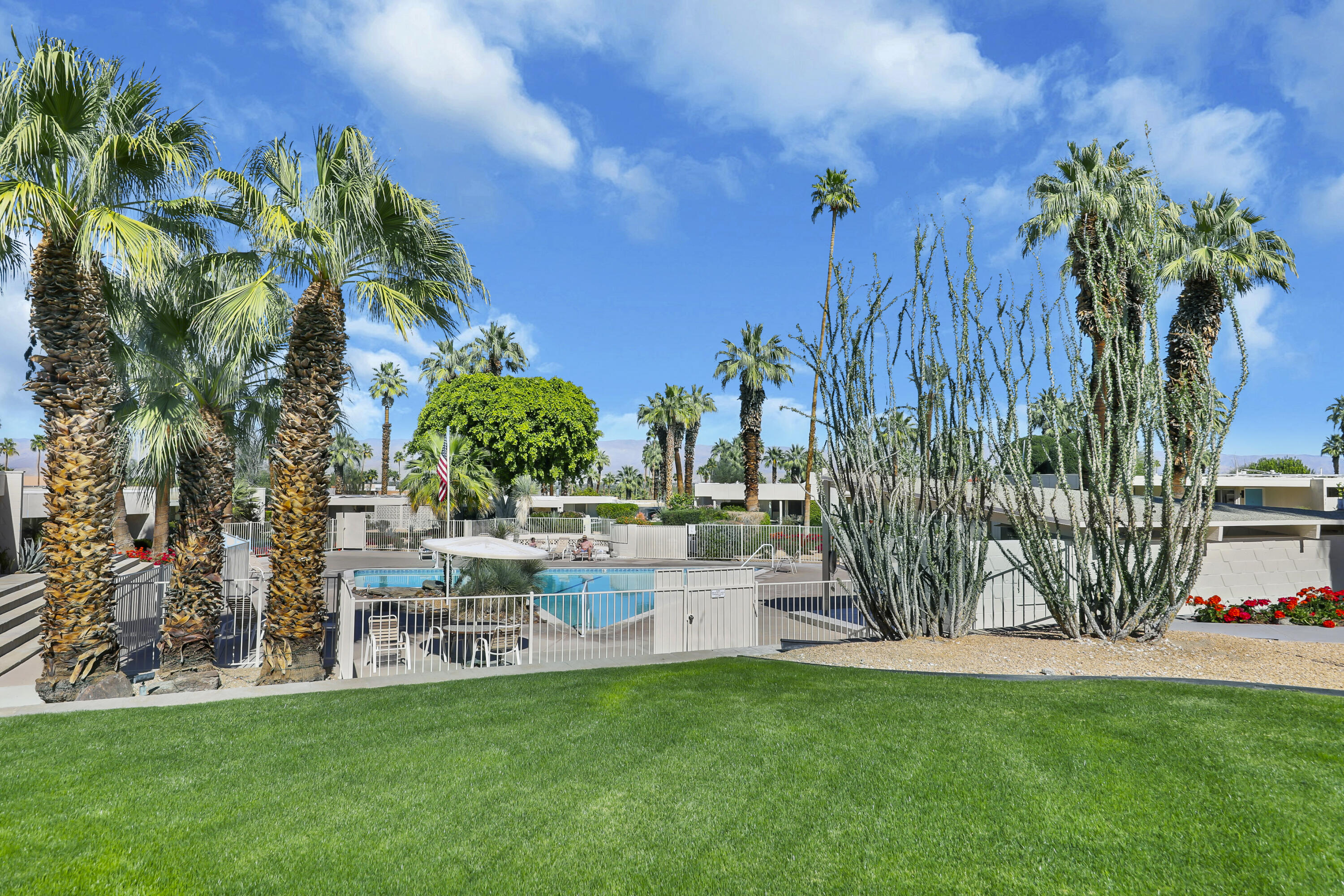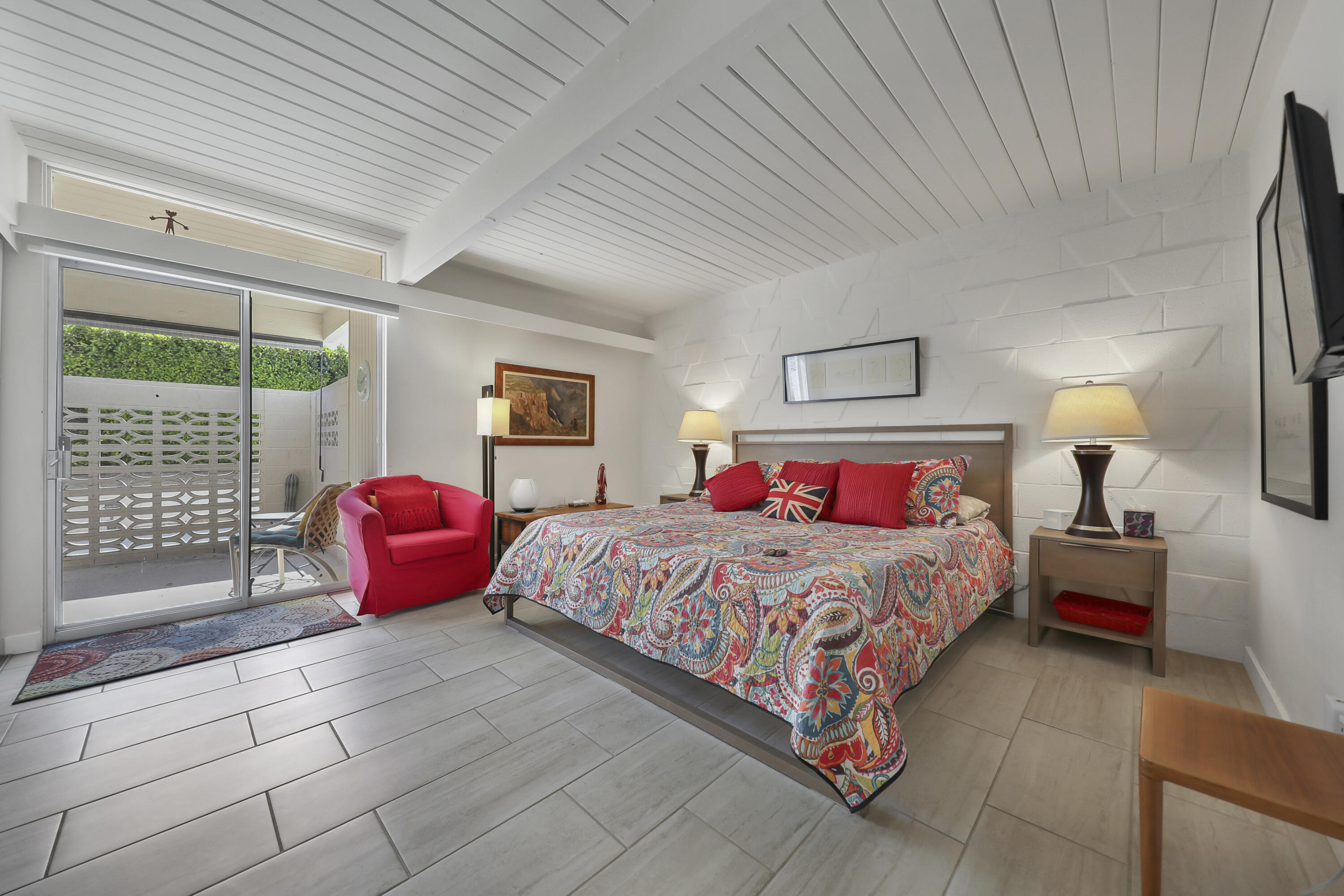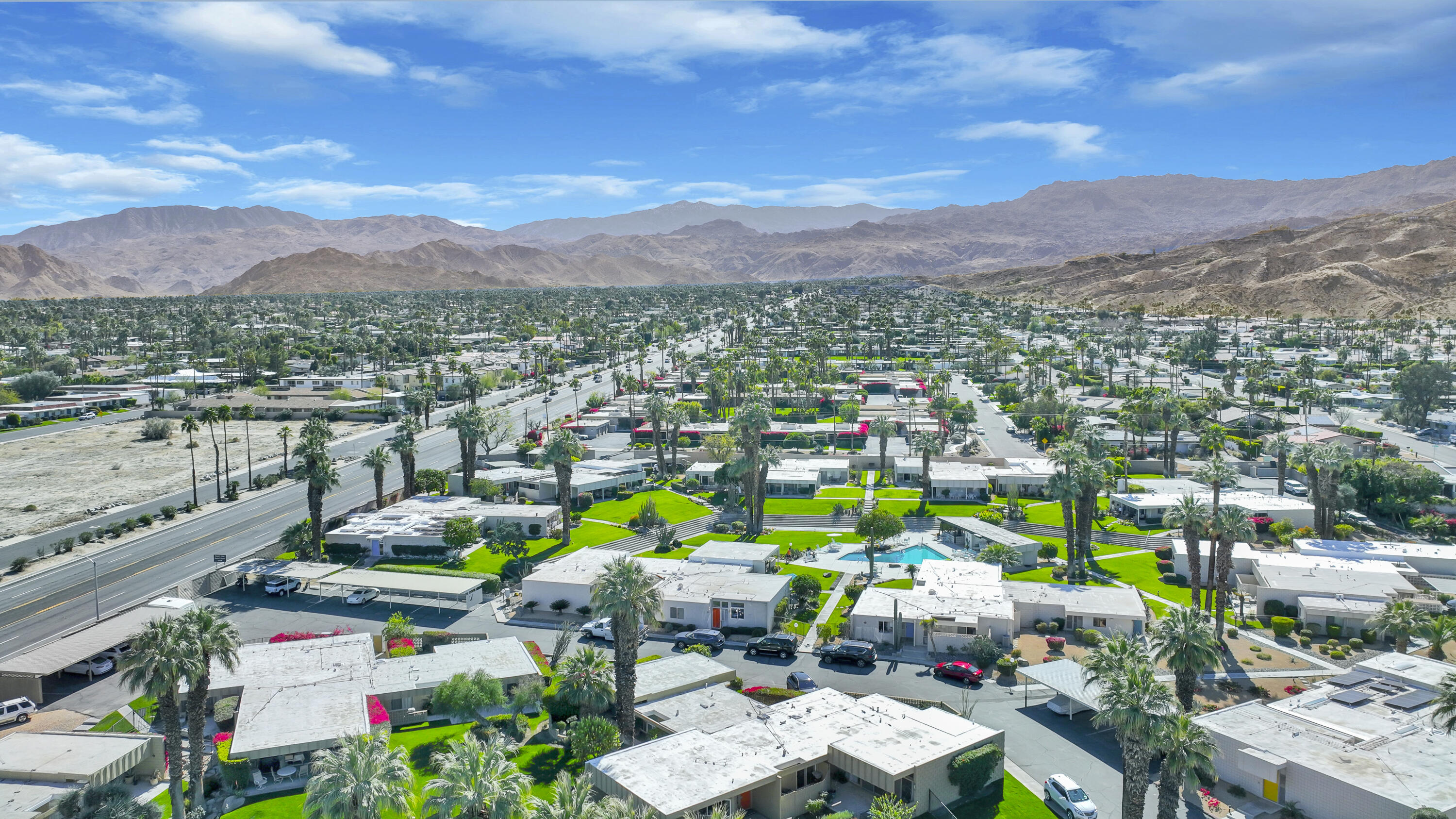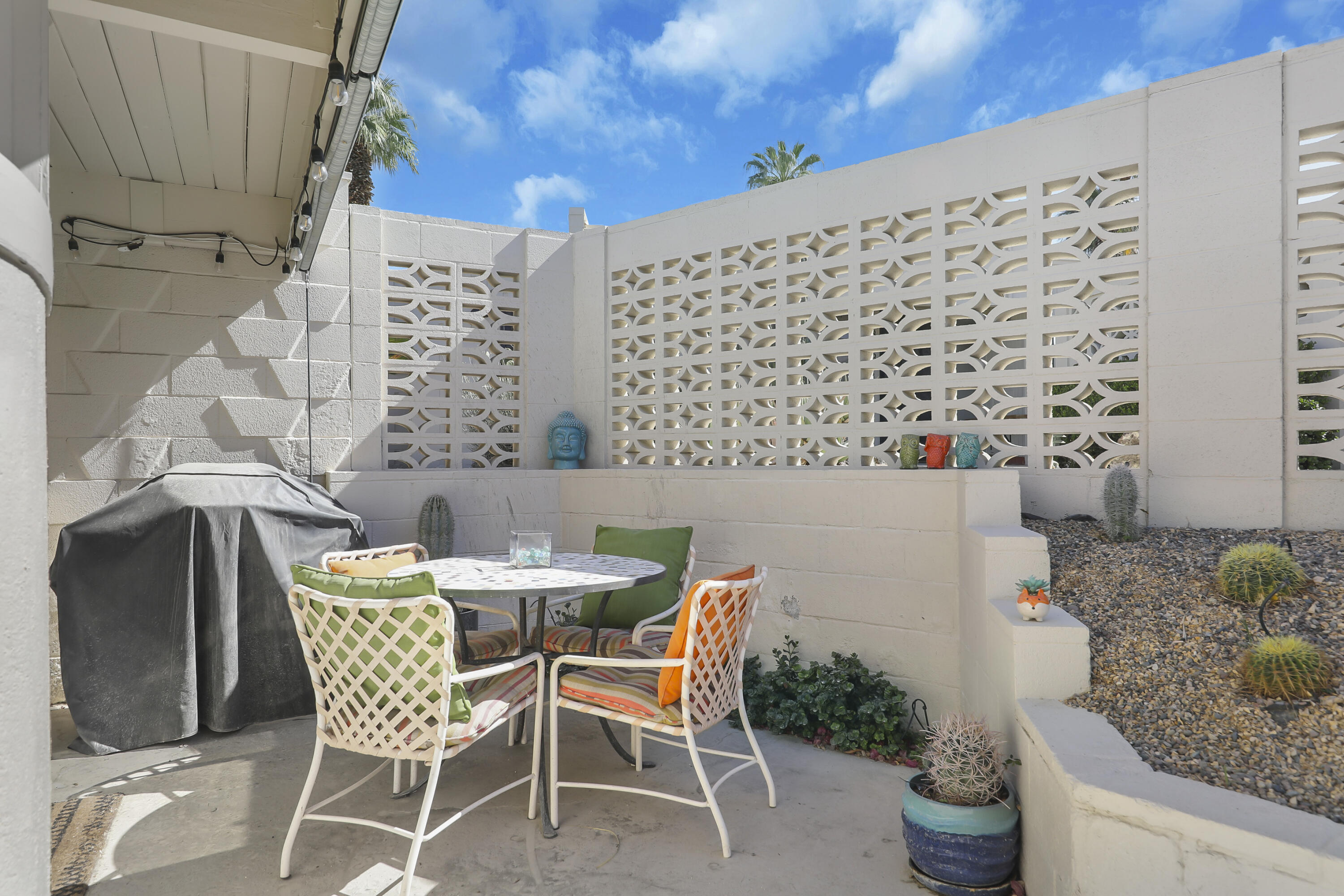 Step into a piece of history with this exquisite William Krisel MCM masterpiece, built in 1960. This extraordinary 2-bedroom, 2-bath home offers timeless elegance, featuring beautiful tile flooring throughout, low beamed ceilings, and expansive floor-to-ceiling glass that bathes the interior in natural light. This residence combines classic mid-century design with modern comforts, creating the perfect retreat for both relaxation and entertainment. The home boasts exceptional climate control with a new coat of elastomeric on the roof and mini-splits in each bedroom & the living room, ensuring year-round comfort. Outside, you'll find serene outdoor spaces designed for tranquility and leisure. Enjoy a private patio off the primary, bordered by a wall for extra privacy, and a partly covered outdoor dining area ideal for casual lounging and al fresco meals. A tranquil cactus garden off the dining room provides a unique workspace amidst nature. The prime location allows you to walk to El Paseo with upscale shops, dining and much more. Surrounded by mature palms, this community features keyed access to common areas, including a sparkling pool and spa located steps from your back patio. This home is not just a residence; it's an invitation to embrace your Rat-Pack dreams in a serene and stylish setting. This mid-century development features 306 units spread across 49 acres, organized into 18 circles with 9 homeowners associations. Each circle centers around a common swimming pool, with units designed for privacy and a blend of public and private spaces. Featuring decorative concrete block, shadow block, and breezeblocks in a variety of textures and patterns, along with clerestory windows, expansive glass panels, detailed eaves, and flat roofs. Don't miss the opportunity to come see it today!Interested in this Listing?