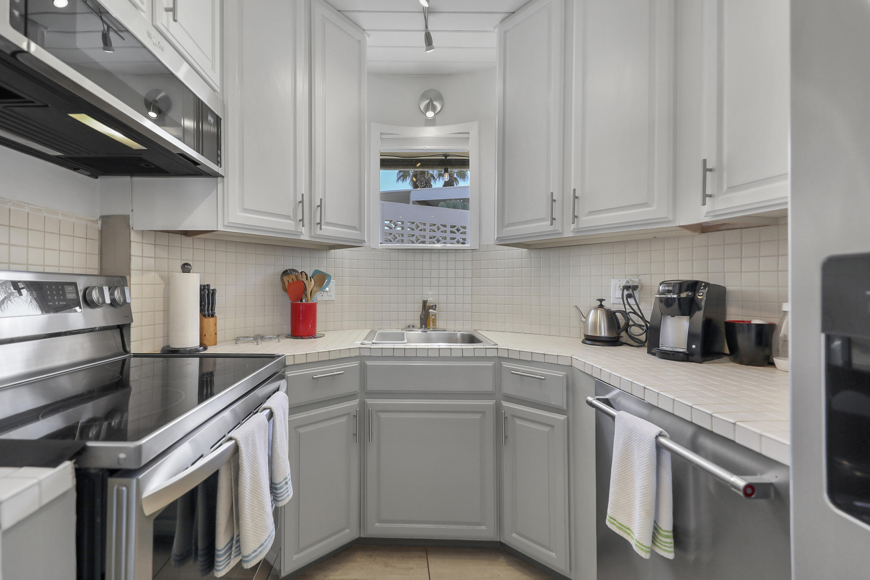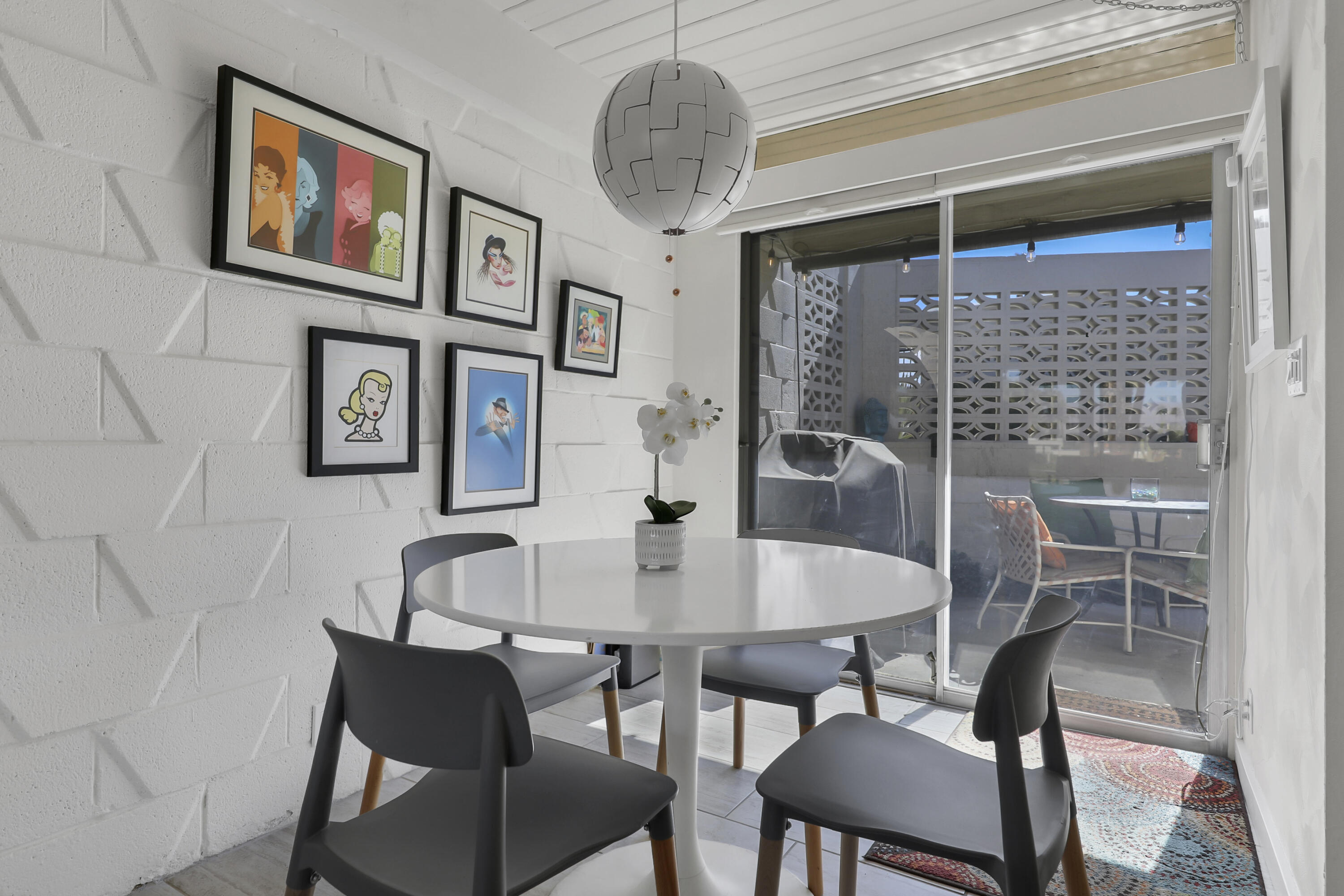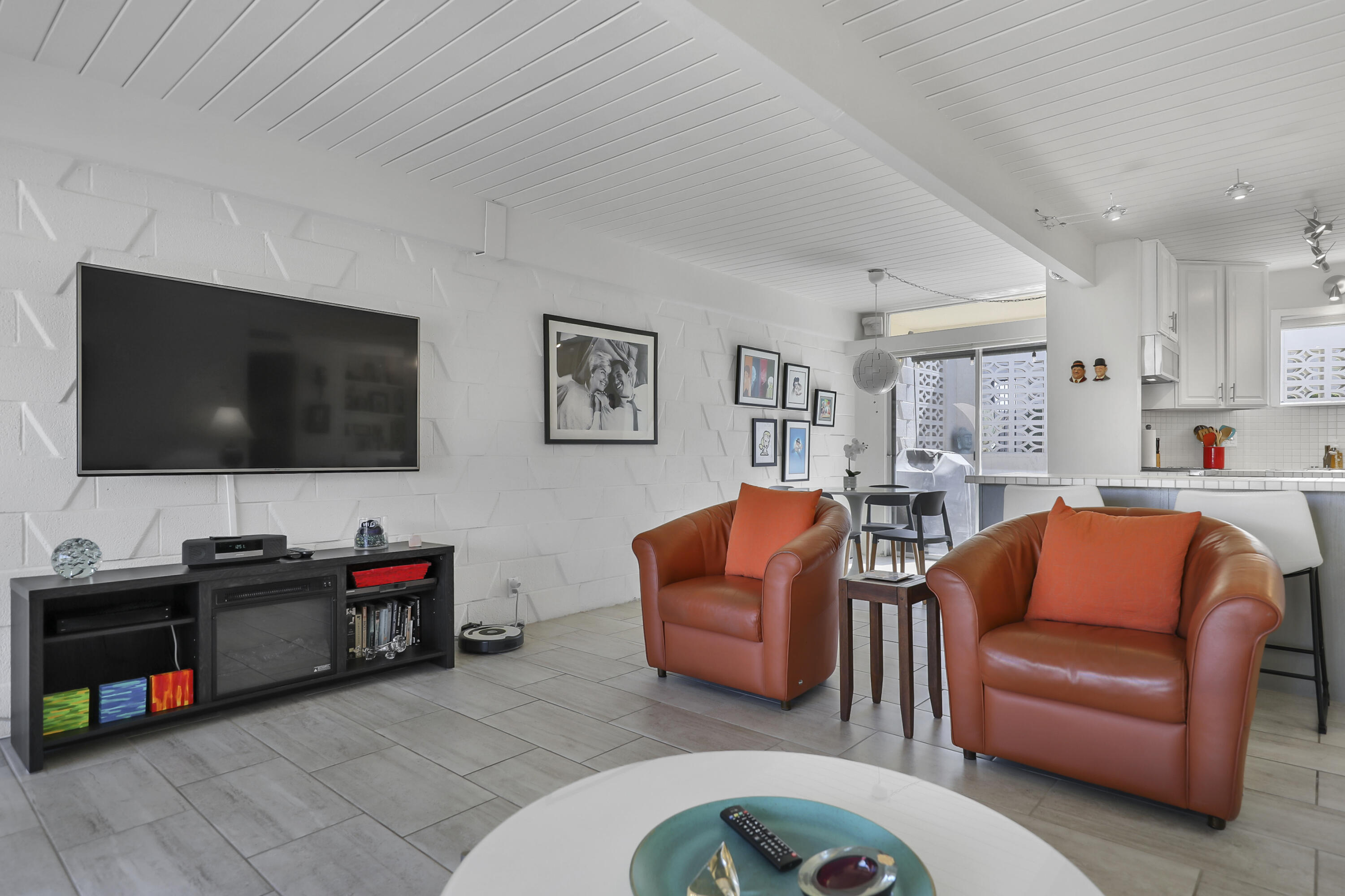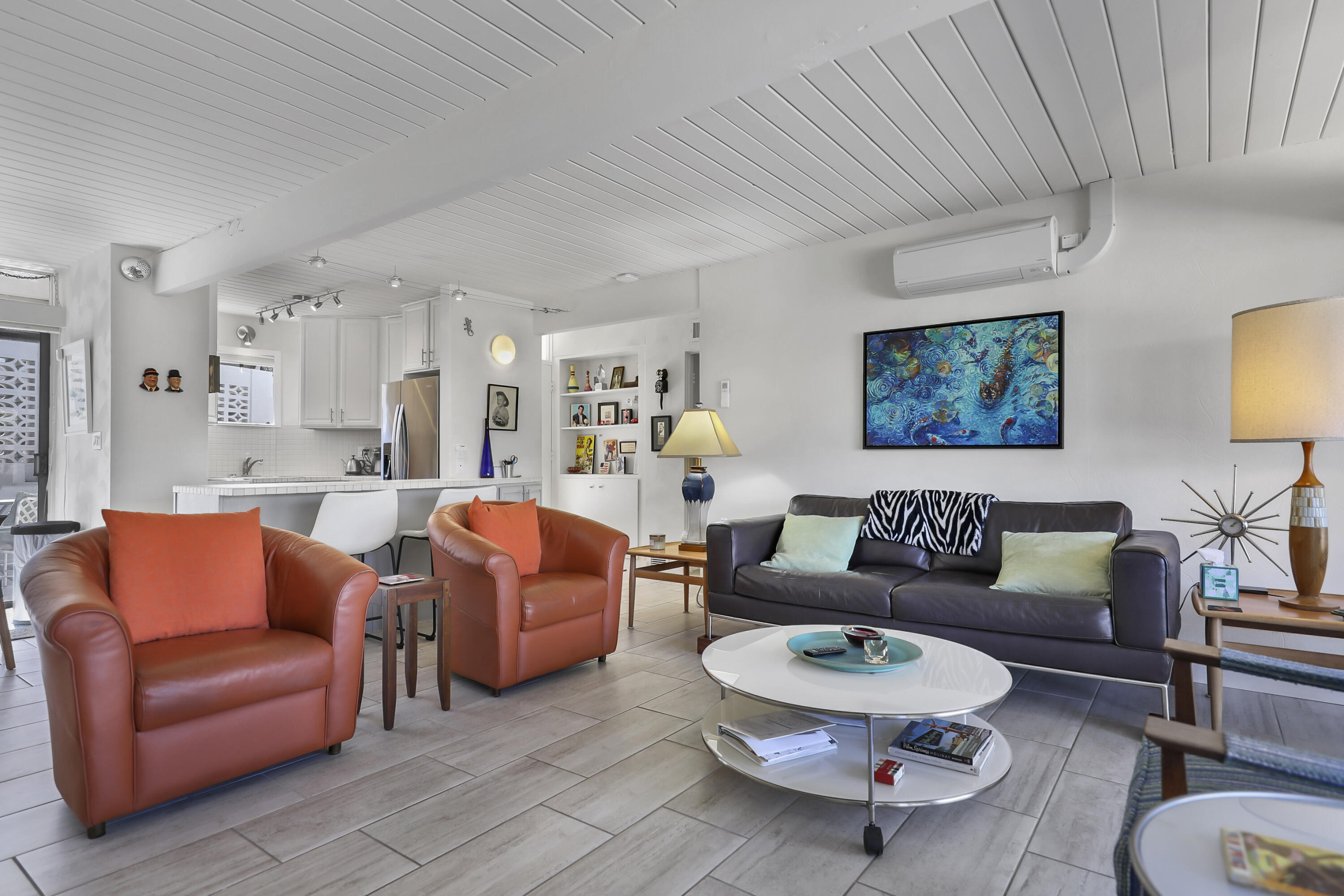 Step into a piece of history with this exquisite William Krisel MCM masterpiece, built in 1960. This extraordinary 2-bedroom, 2-bath home offers timeless elegance, featuring beautiful tile flooring throughout, low beamed ceilings, and expansive floor-to-ceiling glass that bathes the interior in natural light. This residence combines classic mid-century design with modern comforts, creating the perfect retreat for both relaxation and entertainment. The home boasts exceptional climate control with a new coat of elastomeric on the roof and mini-splits in each bedroom & the living room, ensuring year-round comfort. Outside, you'll find serene outdoor spaces designed for tranquility and leisure. Enjoy a private patio off the primary, bordered by a wall for extra privacy, and a partly covered outdoor dining area ideal for casual lounging and al fresco meals. A tranquil cactus garden off the dining room provides a unique workspace amidst nature. The prime location allows you to walk to El Paseo with upscale shops, dining and much more. Surrounded by mature palms, this community features keyed access to common areas, including a sparkling pool and spa located steps from your back patio. This home is not just a residence; it's an invitation to embrace your Rat-Pack dreams in a serene and stylish setting. This mid-century development features 306 units spread across 49 acres, organized into 18 circles with 9 homeowners associations. Each circle centers around a common swimming pool, with units designed for privacy and a blend of public and private spaces. Featuring decorative concrete block, shadow block, and breezeblocks in a variety of textures and patterns, along with clerestory windows, expansive glass panels, detailed eaves, and flat roofs. Don't miss the opportunity to come see it today!Interested in this Listing?