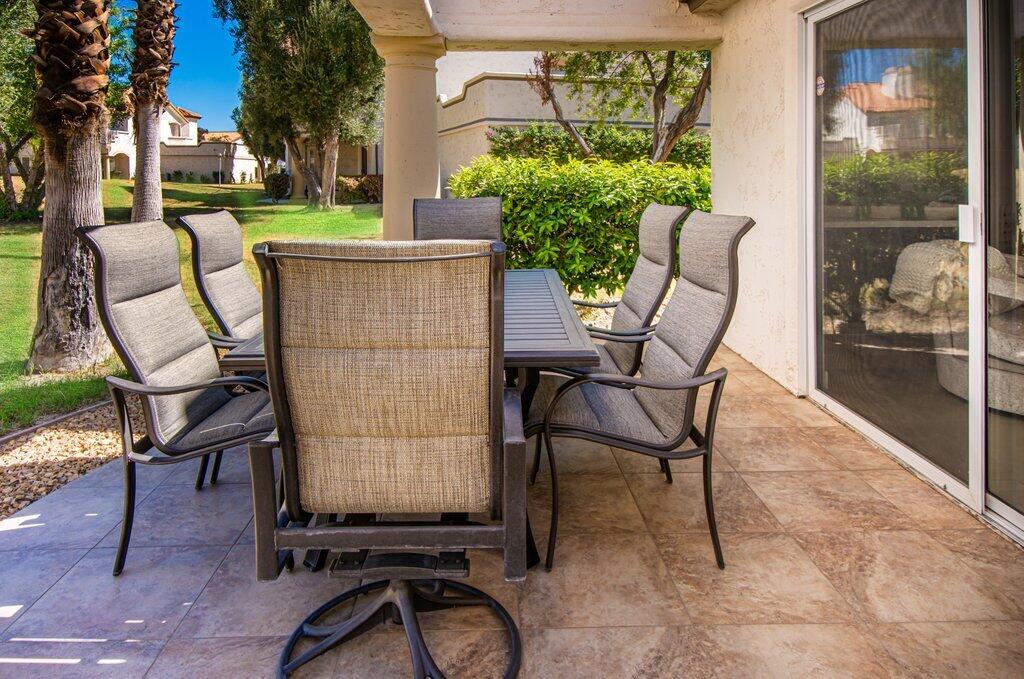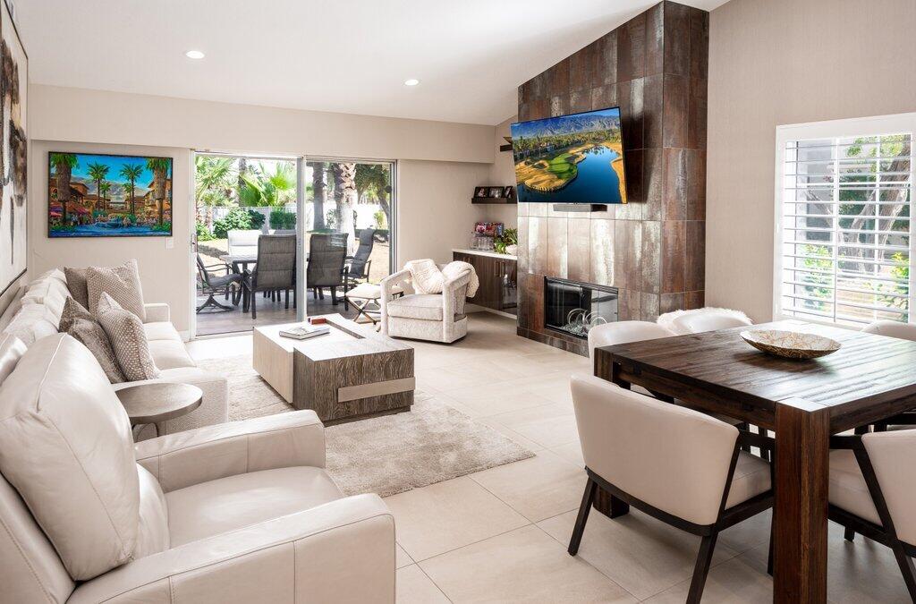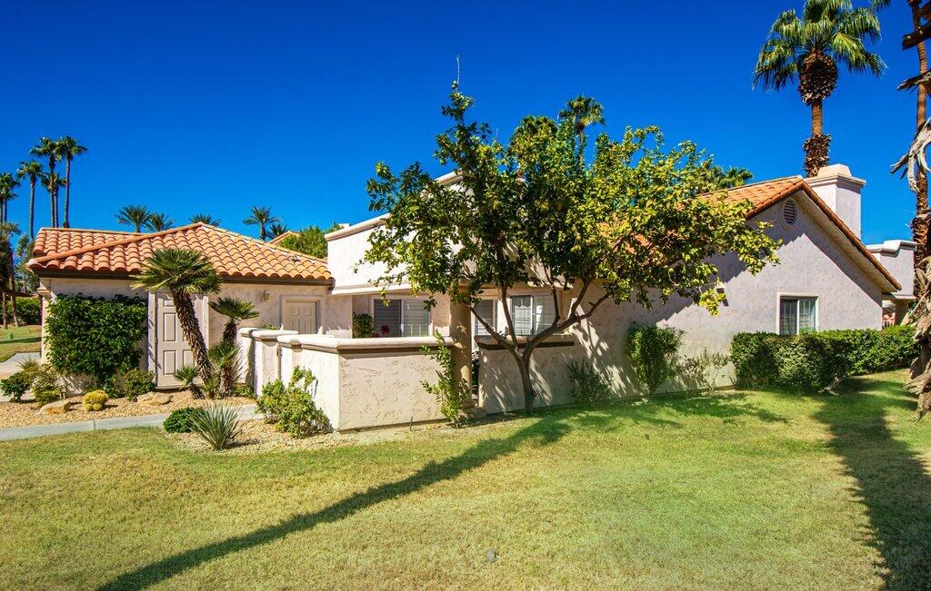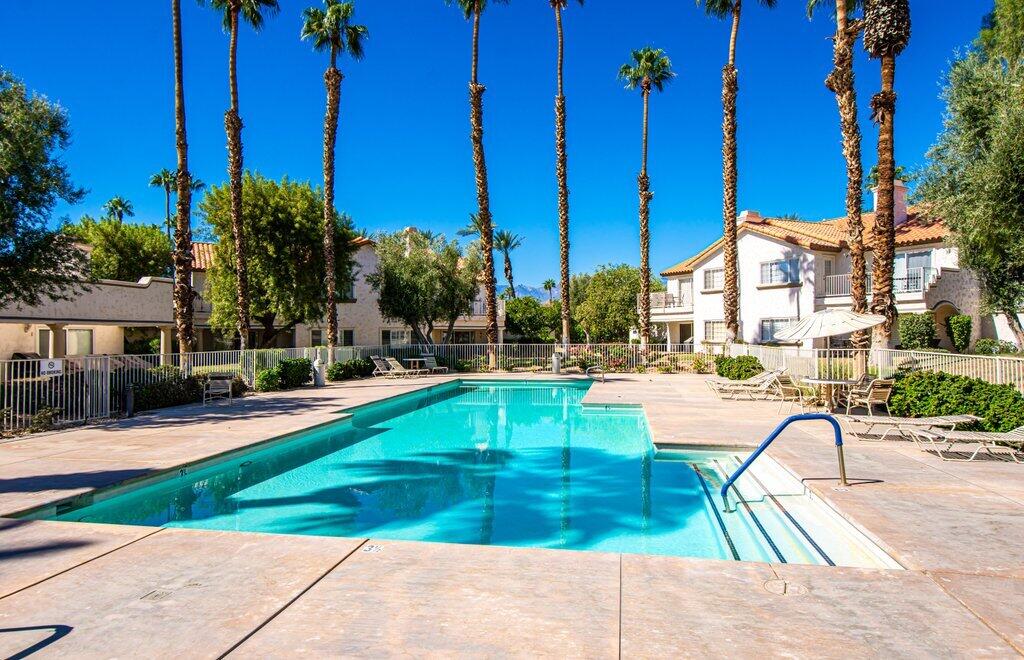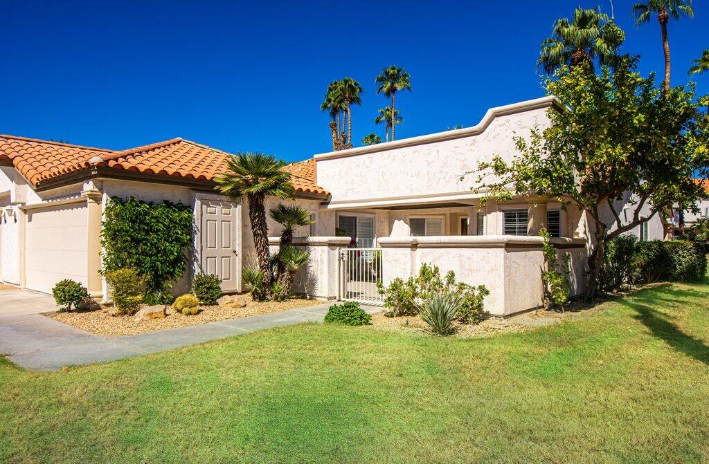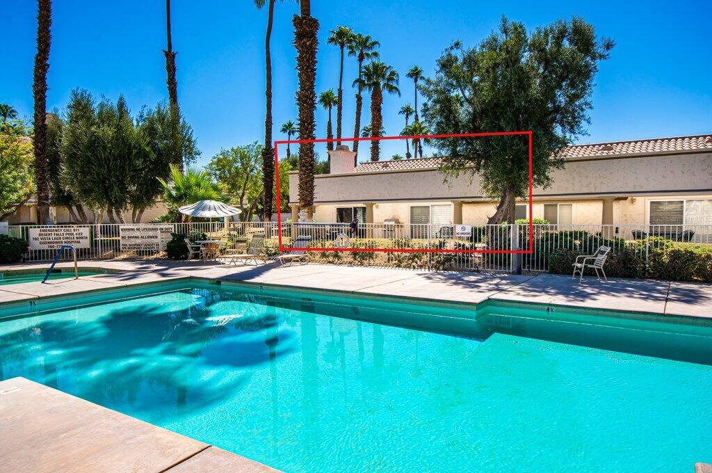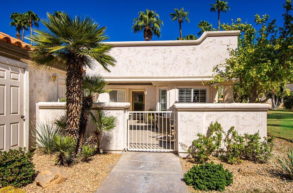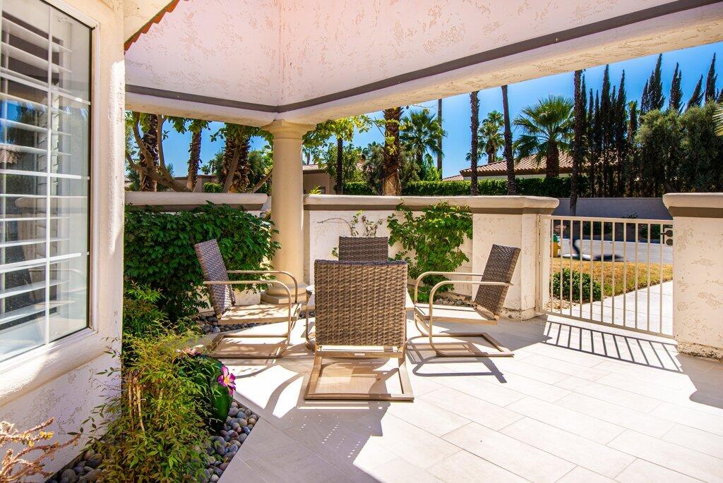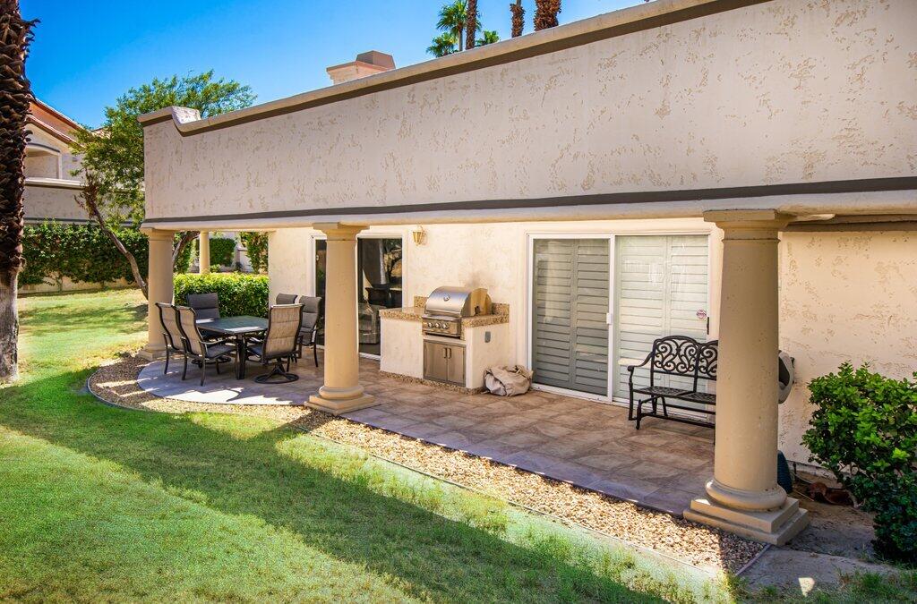 Very rare, seldom on the market, ideal location next to large greenbelt and pool/spa, this Plan 3 Villa offers 3 bedrooms, 2.5 baths, impeccably renovated in 2022 with attention to every detail. Kitchen opens to vaulted ceiling living room, dining nook with banquette, all new LED lighting, hardware, fixtures, custom tile floors, including both patios, new appliances, quartz counters, custom cabinetry and built-ins throughout. Living room complete with fireplace, electric blinds, custom window treatments everywhere else. Open plan feels larger than 1814 SF with front private courtyard and rear patio. Additional features include new built-in barbecue, closet upgrades, additional storage space, detached remodeled 2 car garage with cabinets and new epoxy floor. Desert Falls allows weekly rentals, no guest fees for using the state-of-the-art fitness center, 8 Pickleball courts, 7 tennis courts, 30+ pools and spas. 24-hour guard gated security, Association fees ($677 p/month) cover all exterior maintenance, building structure insurance, cable/internet package, trash, fitness and sport center. Golf course is private/public. A short golf cart ride to shopping centers, restaurants and Club amenities.Interested in this Listing?