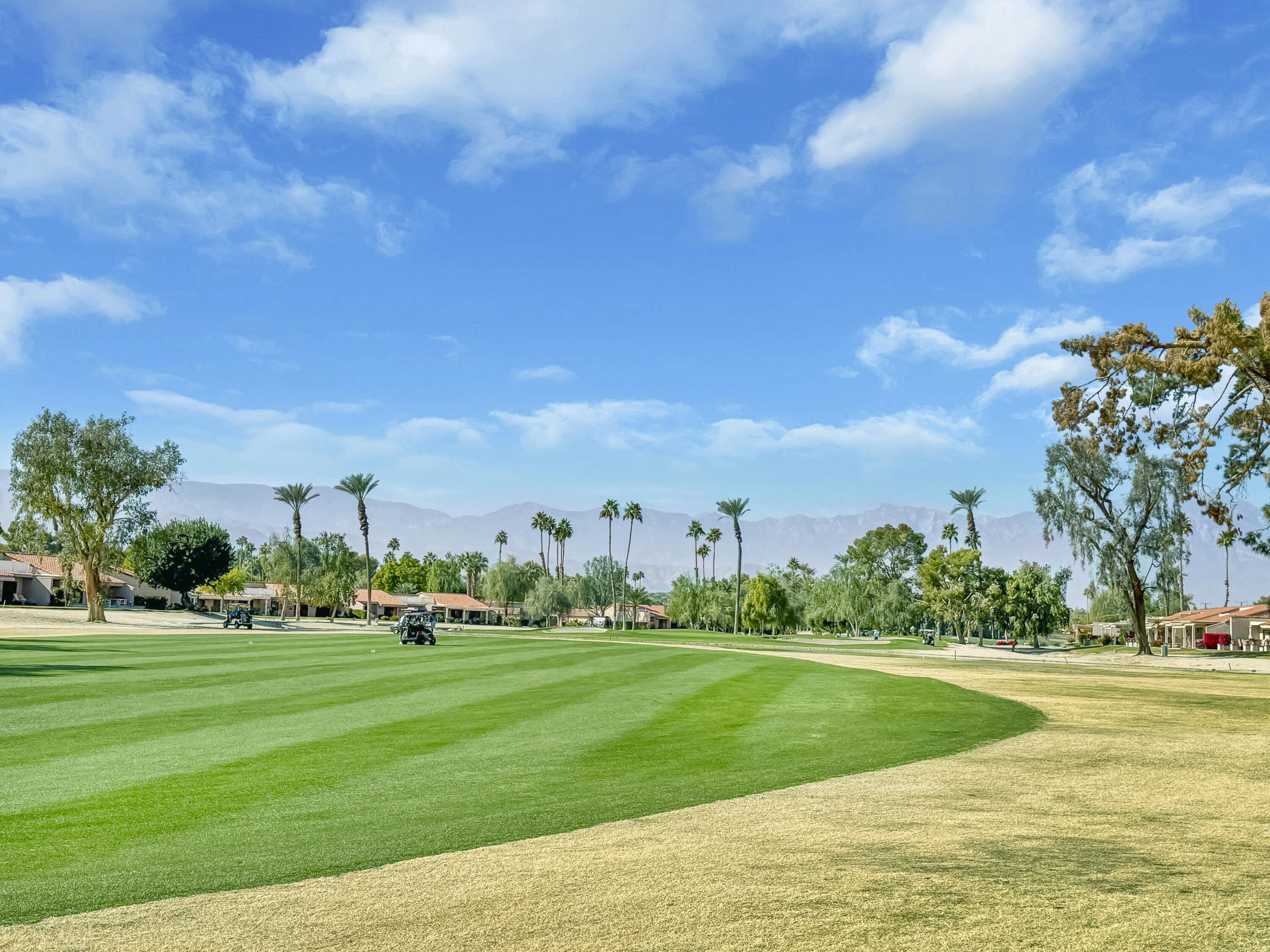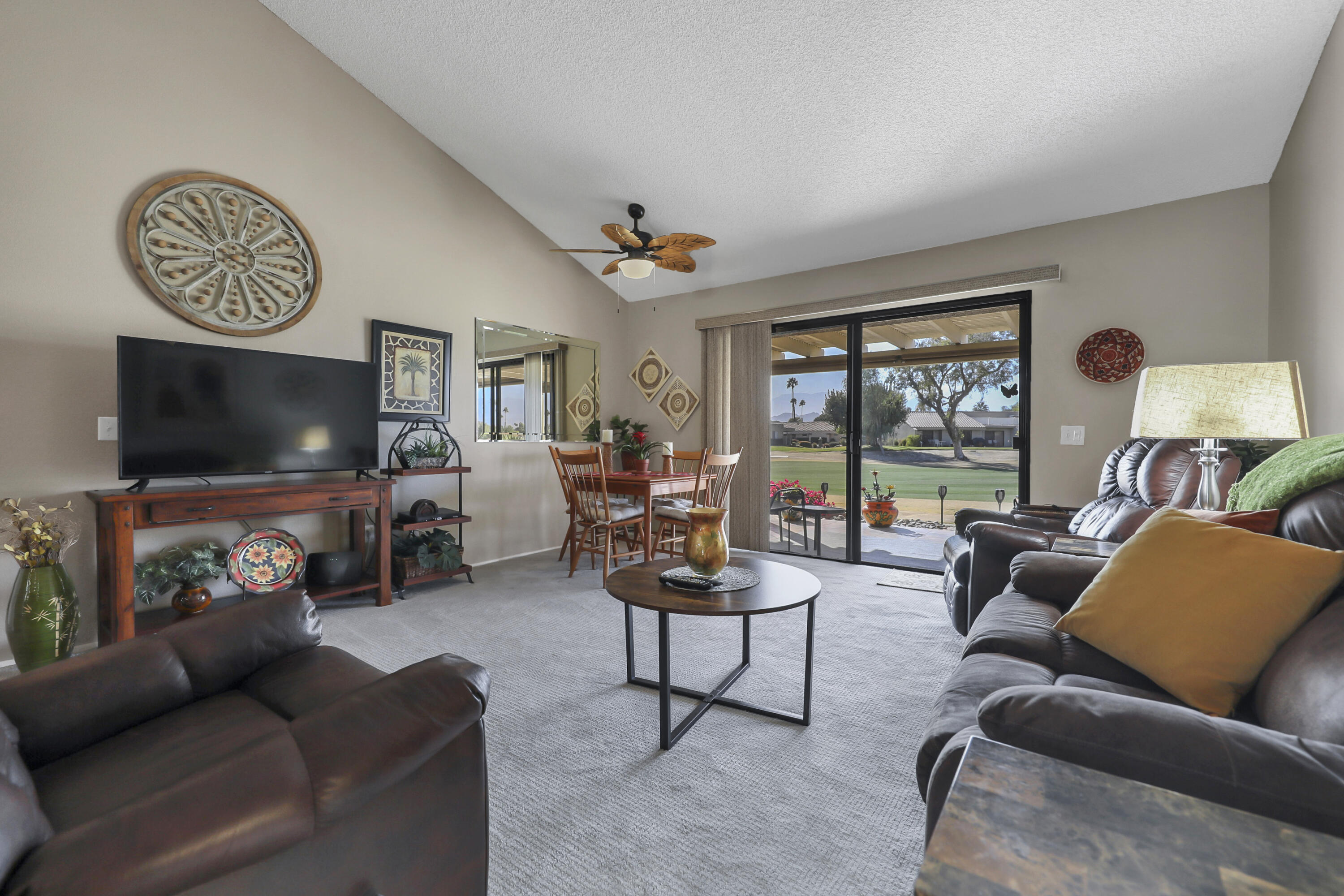 THIS IS THE VIEW PROPERTY YOU'VE BEEN LOOKING FOR! Sensational Golf Course and Snow Capped Mountain Views from a tastefully updated Vintage unit. The SUNNY SOUTH/WEST facing elongated patio is bordered by artistically designed landscaping of beautiful plants and stones. The kitchen features Stainless Steel appliances and this unit's open concept kitchen/ living/ dining spaces are anchored by an attractive island. The 2 bedrooms, located on either side of the living area are separate worlds unto themselves. Walk-in closets in both the primary bedroom suite and 2nd bedroom provide plenty of storage. Laundry machines are situated inside for maximum convenience. 2 car side by side parking, 1 under the carport, 1 next to it. Easy in and out access as Preston Trail is the first street from the main gate. Great opportunity to enjoy resort-like living, in a secure guard gated community offering fun events, plenty of sports: golf, tennis, pickle ball, bocce ball, biking, walking, plus 20 swimming pools, active clubhouse. Pet friendly. Short terms leases allowed. Turnkey, including 3 BIG SREENS! GREAT VALUE. A GREAT DEAL!Interested in this Listing?