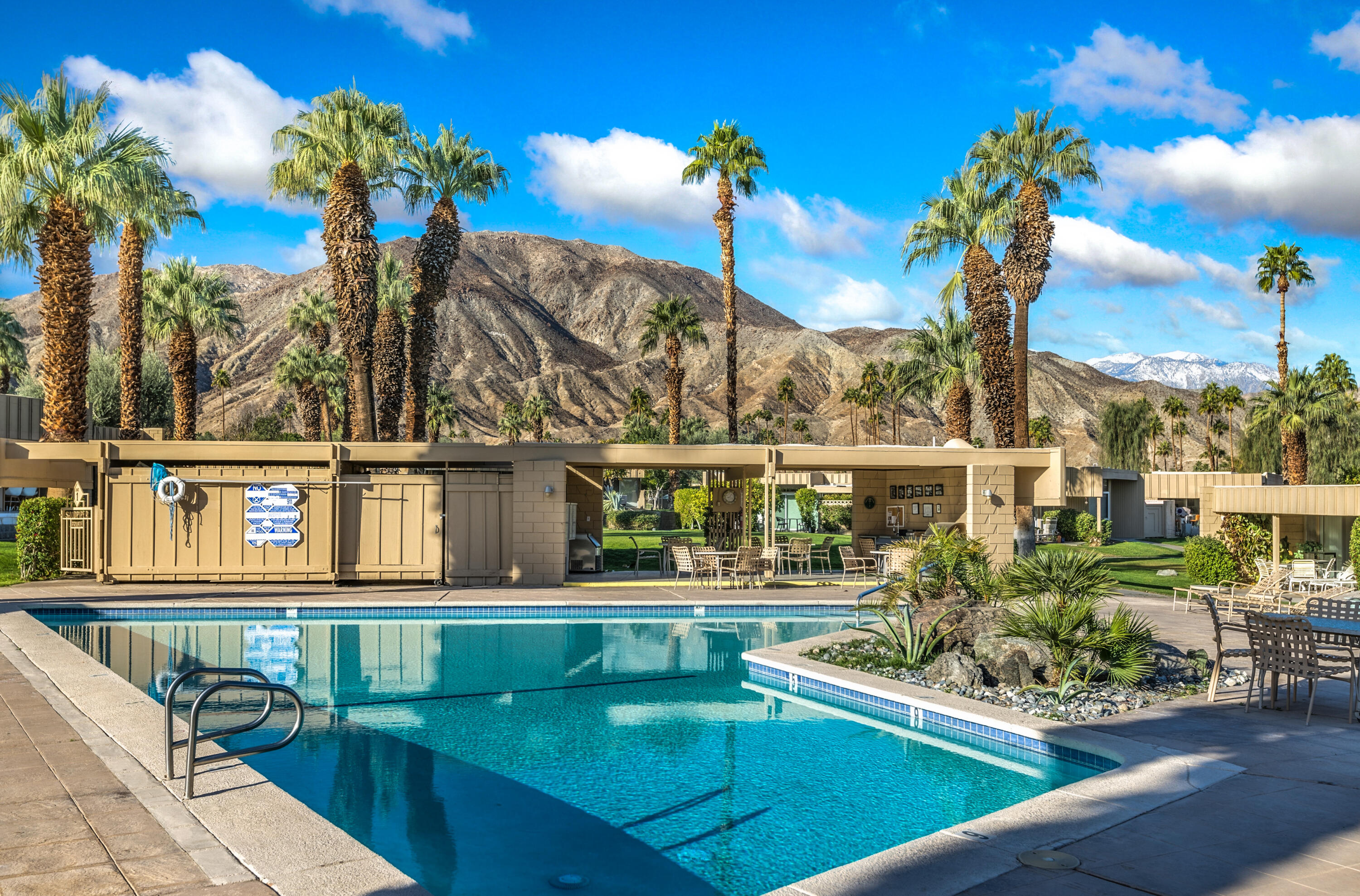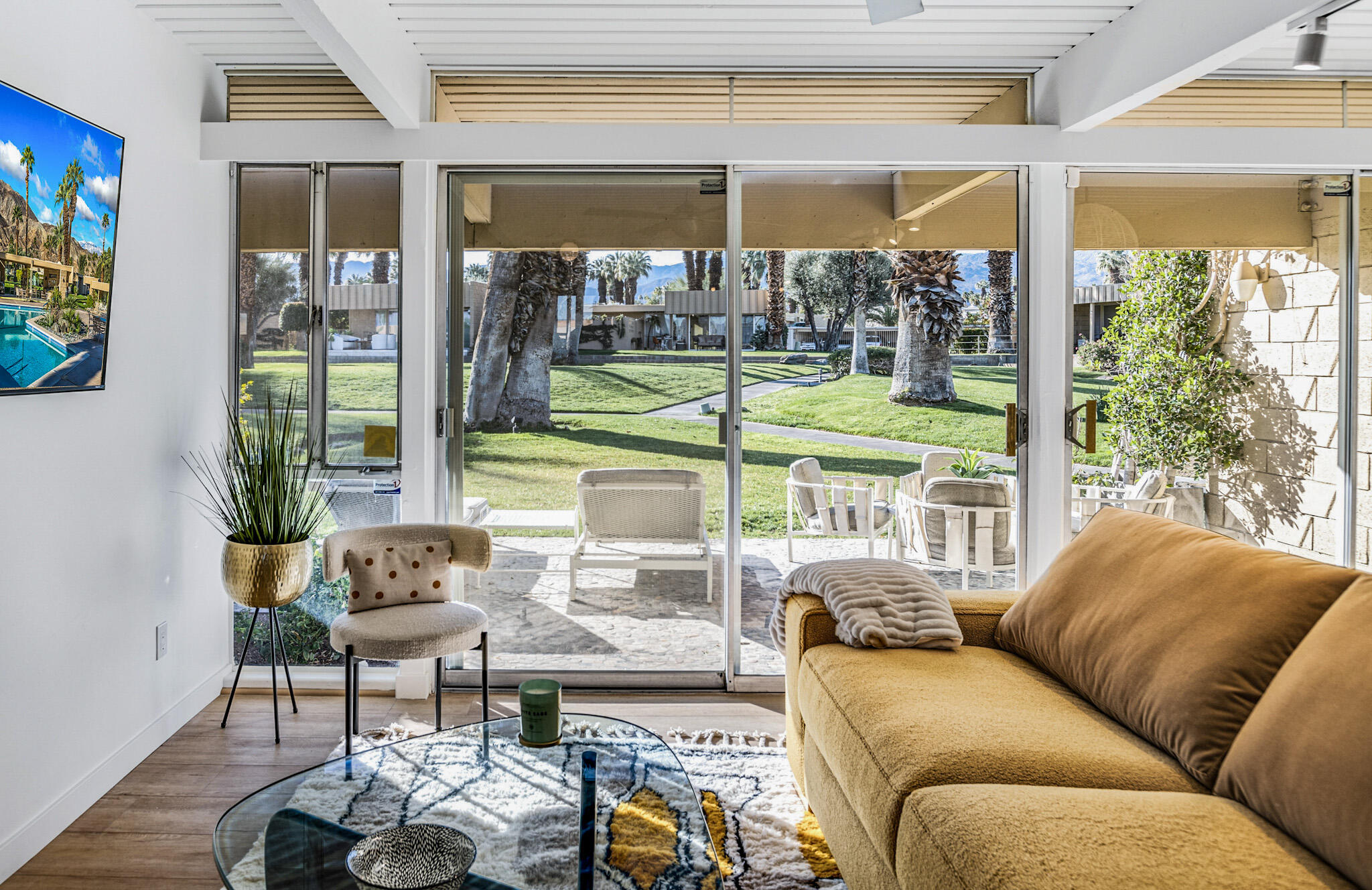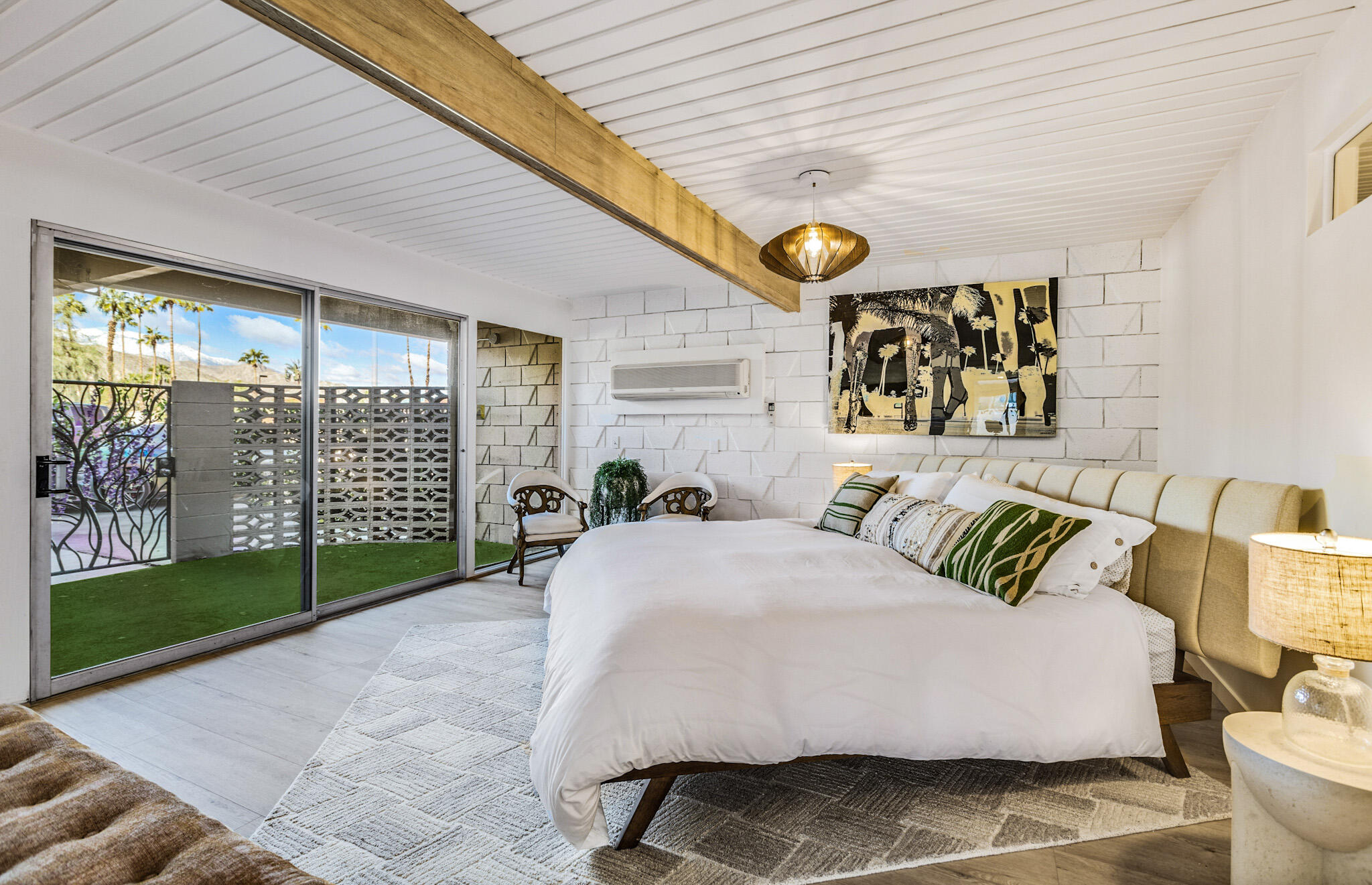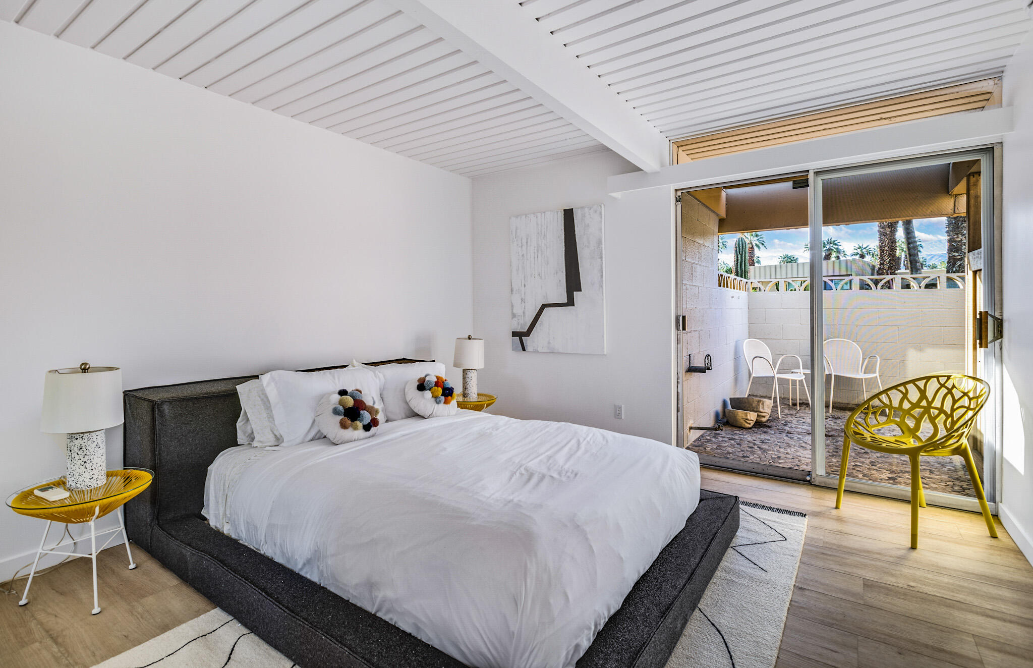 Escape to the ultimate desert getaway in this stunning three-bedroom, two-bath vacation rental located in the highly sought-after Sandpiper Palm Desert. Designed by renowned architect William Krisel, this mid-century modern condo boasts classic architectural elements such as concrete block walls, clerestory windows, and tongue & groove wood plank ceilings. Newly updated with exquisite finishes, this condo is beautifully furnished and features wood-look tile flooring, modern quartz countertops, and designer touches throughout. With four ductless mini-split systems, enjoy separate temperature controls in each room. Floor-to-ceiling windows offer a breathtaking view of the greenbelt, palm trees, and mountains, and the south-facing patios are flooded with sunlight all day long. Enjoy a dip in the pool or cook up a delicious meal in the covered outdoor cooking and dining area with a built-in BBQ. This condo is in one of the best locations in Palm Desert. It couldn't be more convenient! Just walk across the street and find a Starbucks, a juice bar, a pilates studio, a nail salon, and great restaurants. World-class public golf courses, tennis courts, and pickleball courts are just minutes away, and you'll enjoy easy access to nearby hiking trails and luxury shopping on El Paseo, the ''Rodeo Drive of the Desert''. Book your stay today and experience the best of Palm Desert living! Monthly Rental Rates: Jan- Apr $7,500 , May $6,000, Jun - Aug $4,500, Sep - Dec $6,500