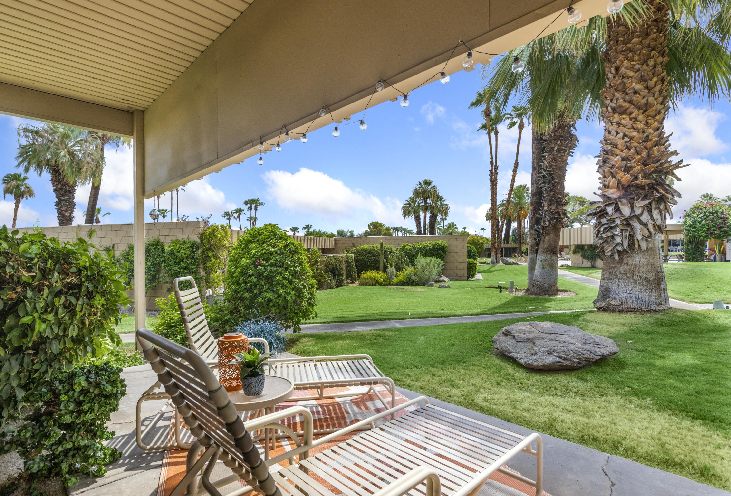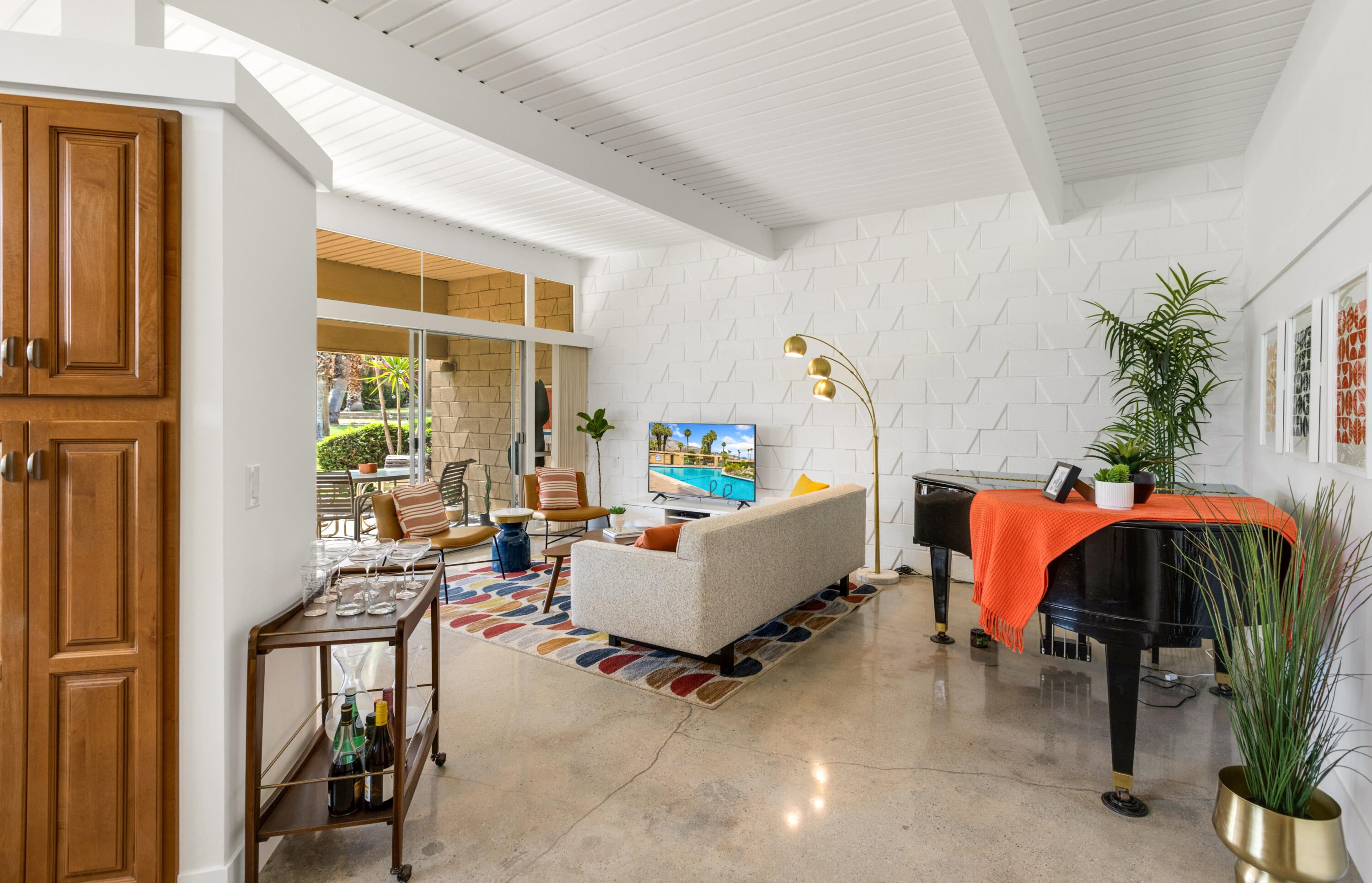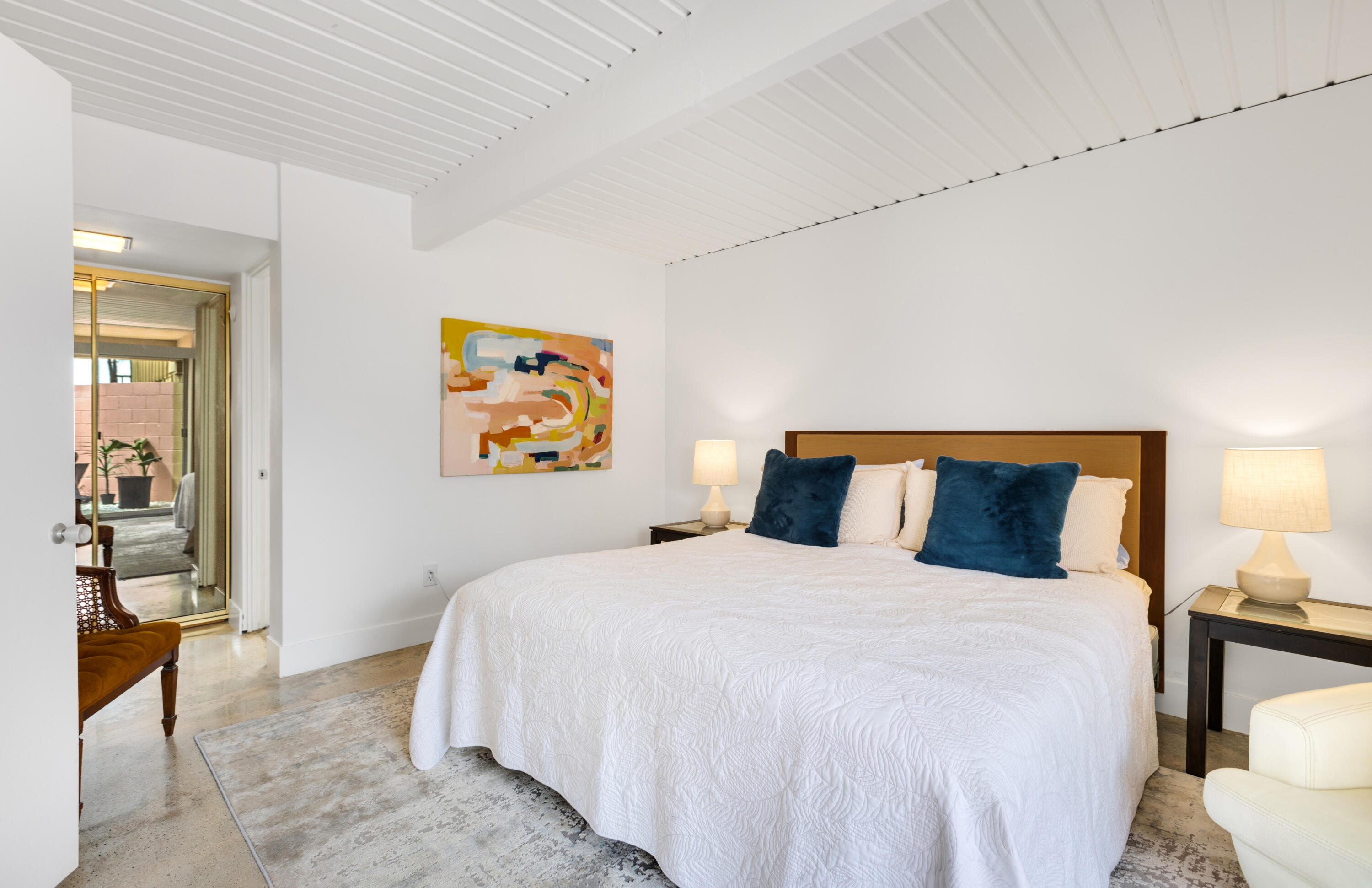Here's your chance to experience one of the first William Krisel designs built in Sandpiper, Palm Desert. This mid-century modern features classic mid-century modern architectural details, including exposed concrete block walls, clerestory windows, and tongue & groove ceilings wood plank ceilings throughout. Natural light from the wall of windows in the living room brightens this home, and the east-facing patio offers serene views of the greenbelt, palm trees, and mountains. This home features beautiful, easy-to-maintain polished concrete floors and an updated kitchen and bathrooms. The kitchen is well-equipped and offers a gas range, a microwave/range hood, and everything you need to prepare a delightful meal to be enjoyed on your patio dining table. A cocktail cart is ready for you to serve up cocktails and wine pre-dinner. Located within walking distance of the finest shopping and dining in Palm Desert, including the fabulous Shops on El Paseo -- the ''Rodeo Drive of the Desert'' -- you'll have easy access to some of the best restaurants in the area. And many of the area's best hiking trails are just a few minutes away. Monthly Rental Rates: January - April $4,700 , May $4,000, June - September $3,500, October - December $4,000.Interested in this Listing?