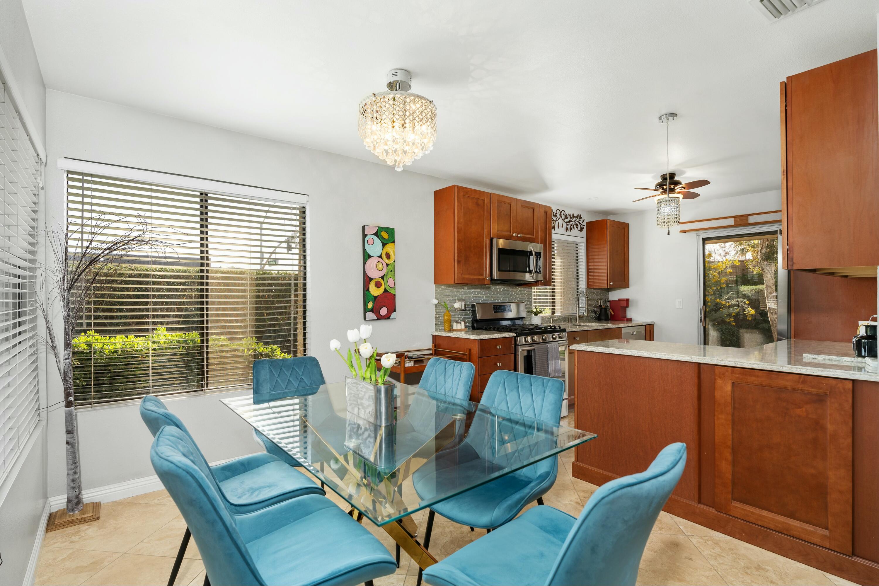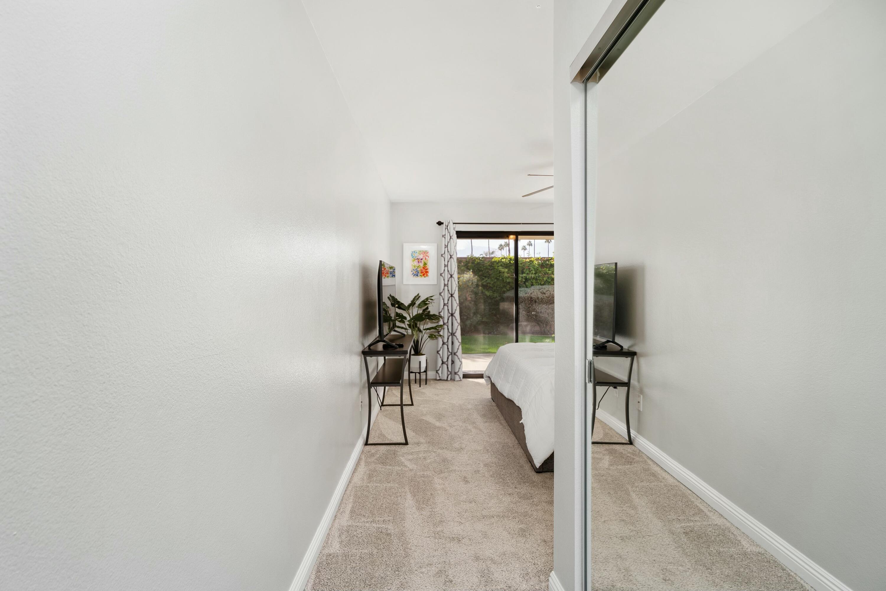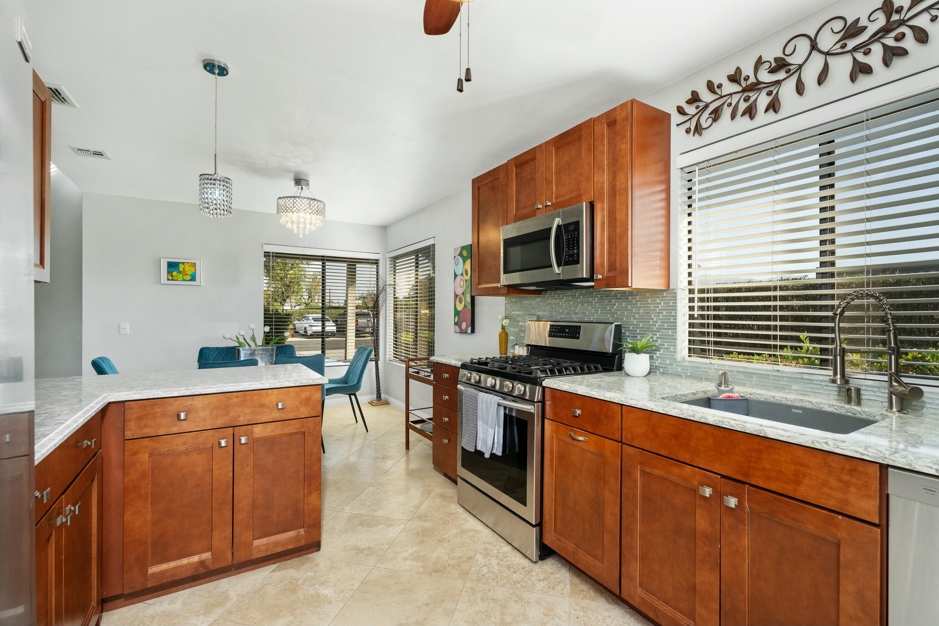 Experience the perfect desert retreat in this beautifully updated 2-bedroom, 2-bathroom condominium in Palm Desert. Offering 1,042 square feet of thoughtfully designed living space, this condo combines modern comforts with a relaxed, resort-style ambiance. Step inside to find an open-concept layout flooded with natural light, featuring high ceilings and stylish updates throughout. The modern kitchen is fully equipped with stainless steel appliances, granite countertops, and a sophisticated dining area, making it ideal for home-cooked meals or entertaining guests. The bathrooms boast modern finishes, one with a tile & glass shower and one with a showr-tub, including ample vanity space for ultimate comfort. Unwind in the private outdoor space, where a large west-facing covered patio provides the perfect setting for alfresco dining, complete with a BBQ grill and comfortable seating. A large two-car garage with direct access adds convenience. Located in a gated community, this property offers resort-style amenities, including two large pools, perfect for swimming laps, each with a spa, and a tennis & court. Ideally situated near El Paseo's premier shopping and dining, hiking trails, The Living Desert, Acrisure Arena, and more, this vacation rental provides an unbeatable combination of relaxation and accessibility to the best of the Coachella Valley. Whether you're seeking a weekend getaway or an extended stay, this stylish condo is the perfect home base for your desert escape. Monthly Rental Rates: $5,000 Jan-Apr, $4,500 Oct-Dec.