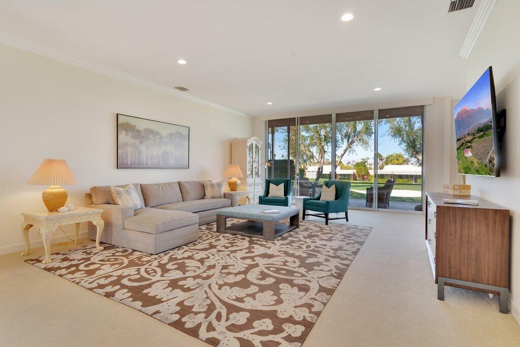 Available May 1, 2025 - end of October 2025. Booked Nov. 2025 through end of April 2026. Call for off-season rates. This stylishly furnished villa is spacious, light-filled, and cheerful, with gorgeous fairway and mountain views. Located within the iconic gated community of Marrakesh Country Club, known for John Elgin Woolf's Hollywood Regency design. Spacious living, dining and kitchen areas, along with 2 bedrooms, a den, and 3 baths. The primary ensuite sits along the golf course with a mature hedge shielding the terrace for privacy. The second ensuite opens to the enclosed courtyard. The den is located off a private hallway with a bath. From the elegant living and dining areas, the terrace, framed by olive trees, overlooks the 12th green and northerly mountain views, making it ideal for outdoor enjoyment. Rental includes use of golf cart and two Como electric bikes. Club amenities include an 18-hole executive course, 14 pools and spas, tennis, fitness, bridge and clubhouse with fine dining. Social and Golf membership opportunities are available to tenants for use of the facilities and may be added with additional cost. Close to the fine dining & shopping on El Paseo Drive.Interested in this Listing?