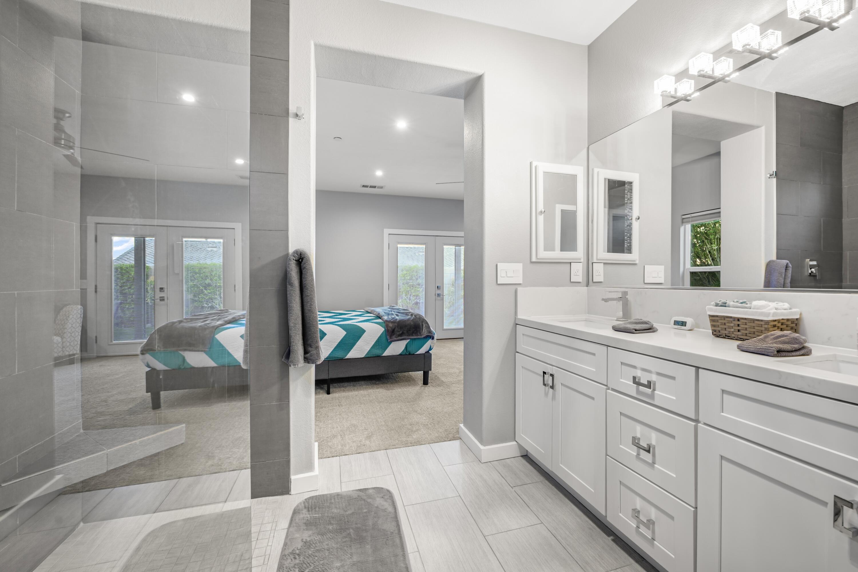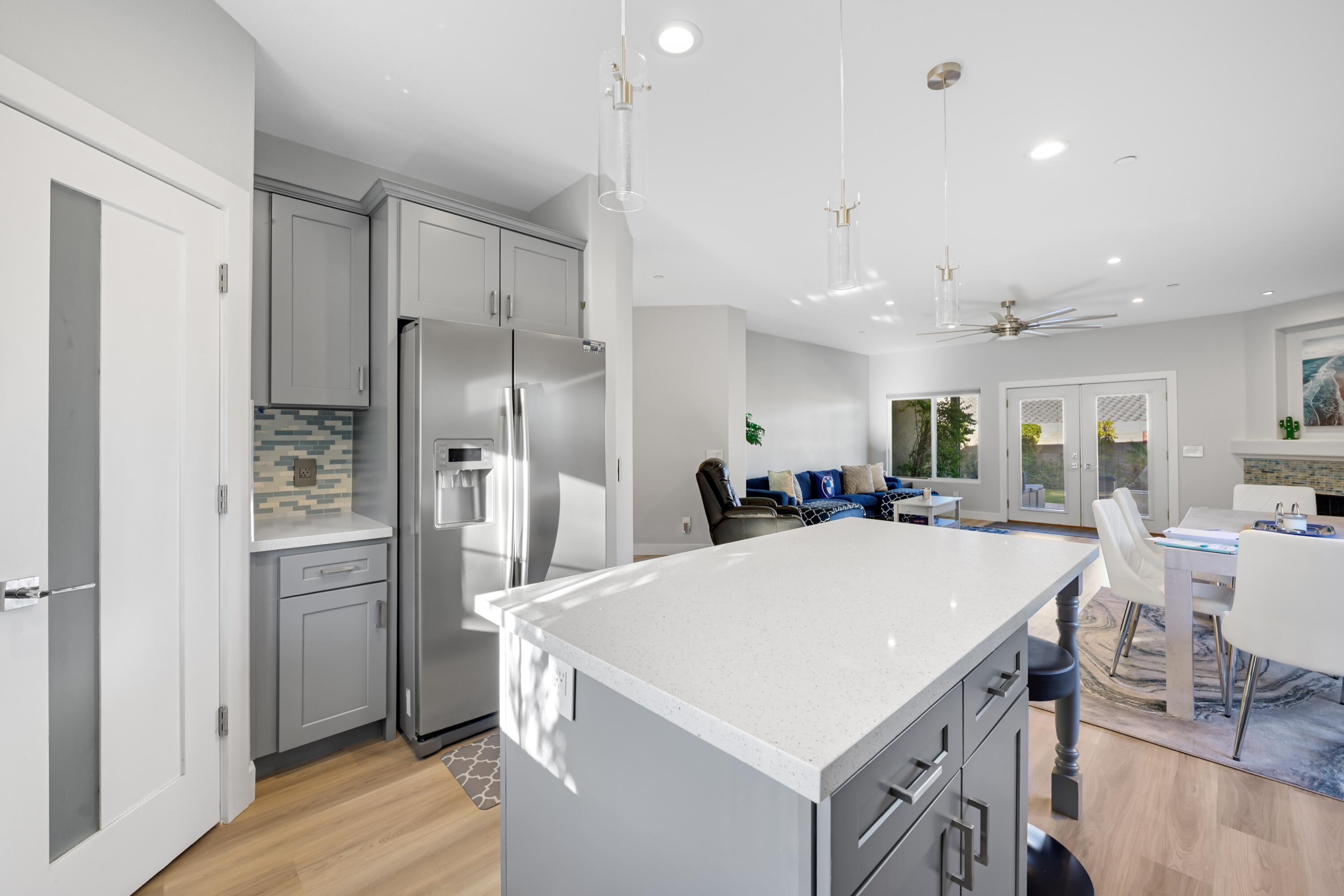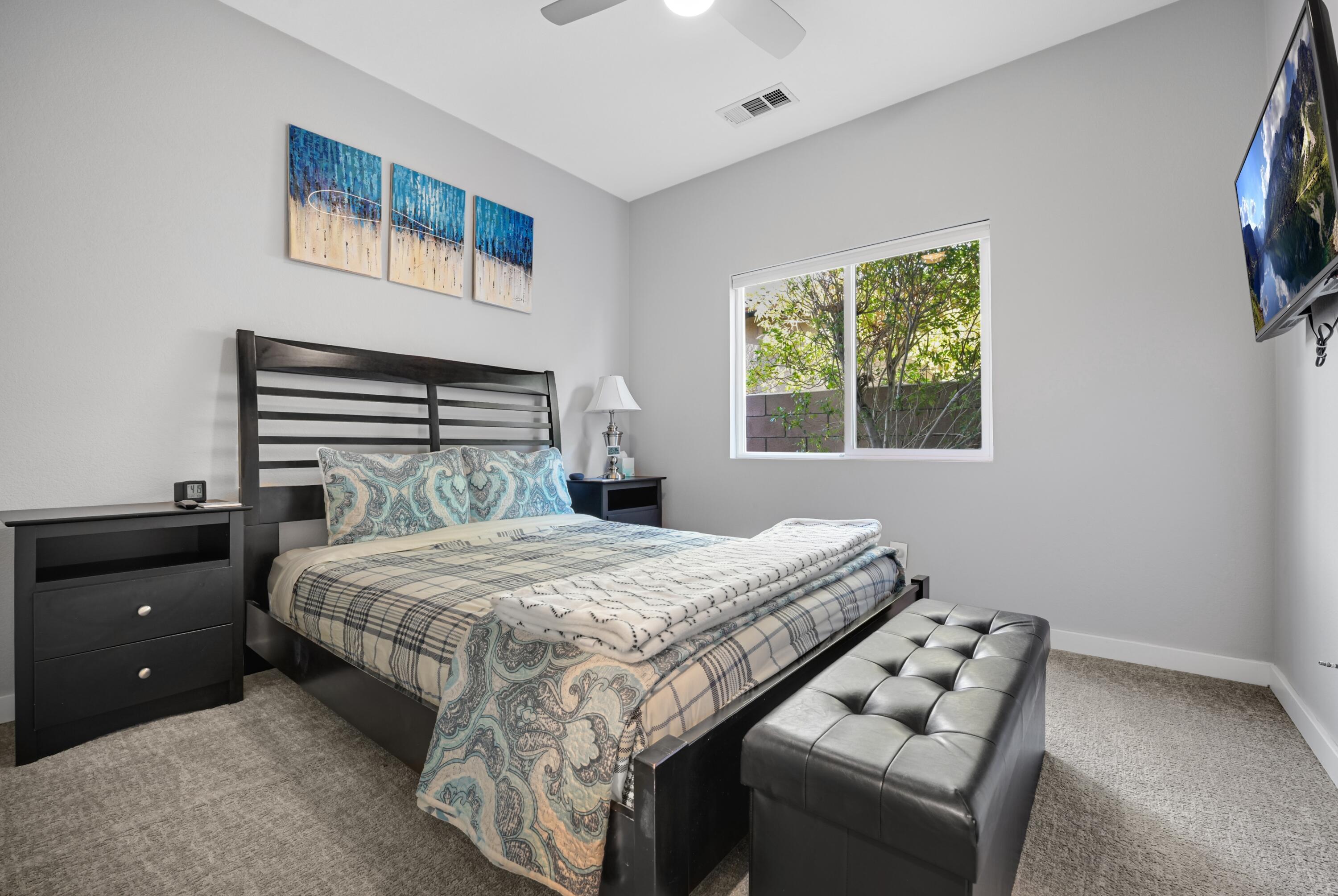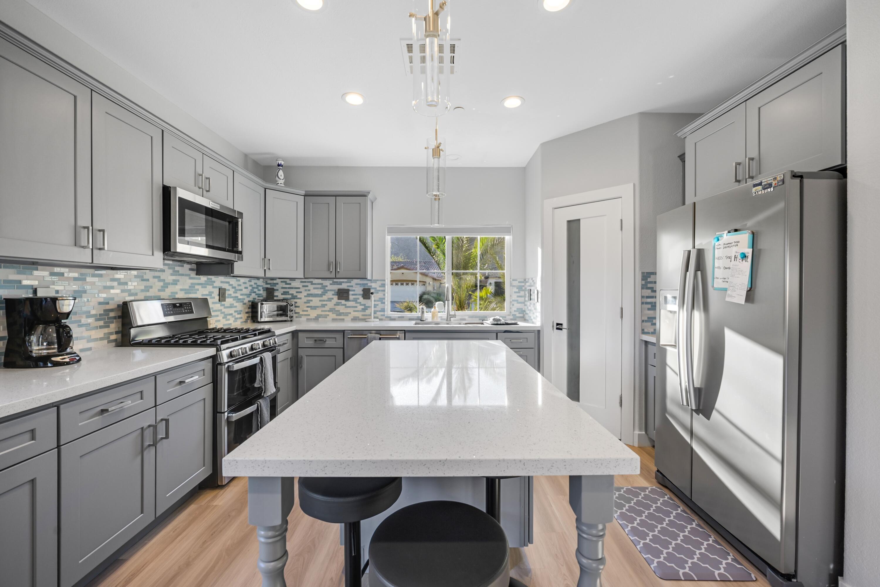 MOTIVATED SELLERS. Bring your best offer. Willing to Negotiate! Welcome to the Mountain Gate community, where breathtaking panoramic views and stunning sunsets over the San Jacinto mountains await you. Situated on a generous 6,098 SqFt lot, the 1,630 SqFt living space features 3 spacious bedrooms, 2 bathrooms, and boasts an easy-to-maintain desert landscaping while creating a tranquil oasis. The elegant stained glass front door and arched covered patio set the tone for the its beautifully open-concept design filled with natural light, creating a welcoming atmosphere perfect for relaxing or entertaining. The living room boasts a recessed entertainment system space and a large, tiled fireplace with full hearth, enhancing the modern appeal of the home. French doors lead to the backyard, where a covered patio with accent lighting and a built-in brick fire pit creates a perfect space for outdoor gatherings and star gazing. An elegant tile backsplash frames the kitchen complemented by stainless steel appliances and an expanded butcher's block island that offers ample storage and prep space as well as a perfect gathering spot for breakfasts or snacks. It seamlessly flows into the dining and living areas, making it ideal for hosting or enjoying relaxed meals. Throughout the common areas, sleek laminate flooring and upgraded ceiling fans in every room add a contemporary touch, while carpeted bedrooms provide warmth and comfort.The spacious primary suite serves as a private retreat, complete with a luxurious en-suite bathroom and a large walk-in closet with built-in organizers. Dual vanities, a privacy door, a sparkling hanging light fixture, and a beautifully tiled glass-enclosed shower enhance the spa-like ambiance. French doors from the suite lead to a covered patio, offering a peaceful spot to unwind.The 2-car garage is equipped with workbenches as well as 3 separate entry points from the driveway, to the sideyard from within the fence line, and access through the dedicInterested in this Listing?