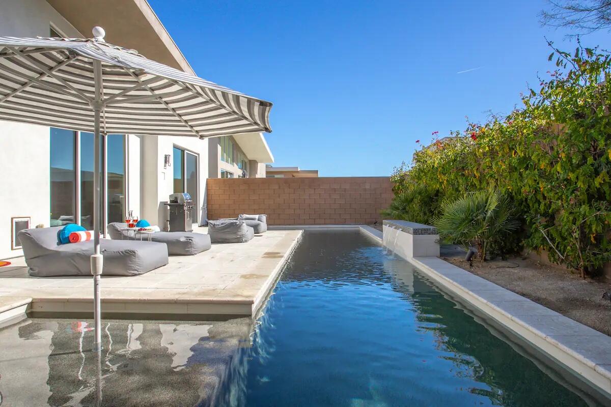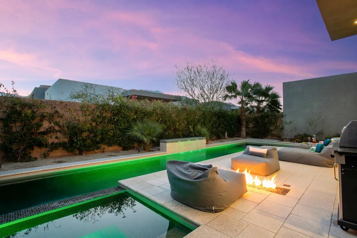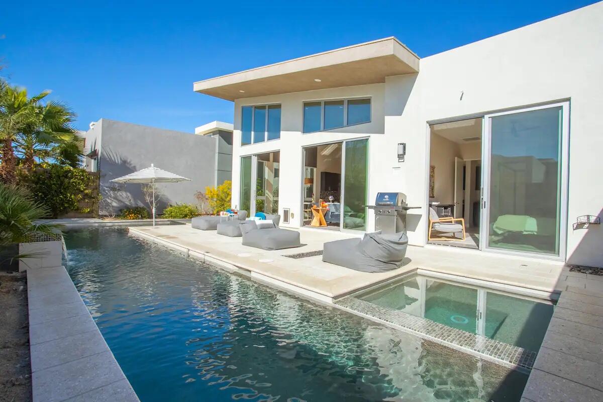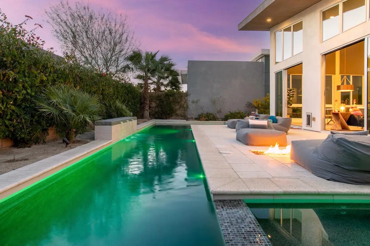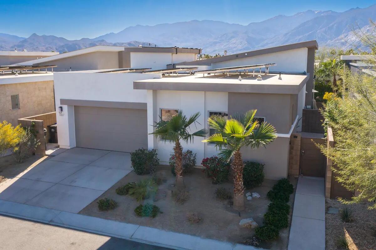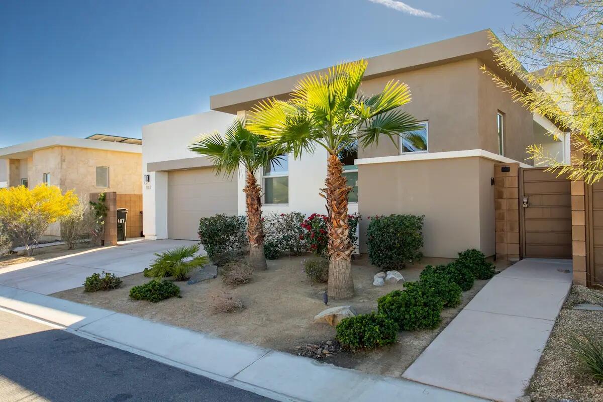 Enjoy the epitome of indoor/outdoor living in this stylish Brizo model home in Escena. With 2 bedrooms and an extra media/flex room, the focal point of this home is the spectacular great room which effortlessly connects the interior to the private backyard with generous lap pool and spa. Lined with sliding doors and soaring walls of windows, the volume and light in this space is astounding. Offered furnished, this magazine worthy home is yours to enjoy immediately. The living room has a built-in and floating media cabinet, wet bar, and is open to a generous dining area. The modern kitchen is the backstop to this space, with an amazing eat-in prep island, beautiful finishes, and full suite of handsome stainless steel appliances. The primary bedroom enjoys mountain views and sliding doors to access the back yard. Its spa like en-suite bath is exquisite, with free standing tub, walk-in shower, and clerestory windows which bathe the space with light. The media room off the entry hall is a flexible space that could be an office or extra sleeping area for guest. The 2nd bedroom with en-suite bath & walk-in closet will entice guests to stay too long. There is a half bath, laundry room, and other amenities: a fire pit adjacent to the pool, owned solar system, water filtration system, EV charger and more. Located in Escena, one of the few guard-gated communities in Palm Springs, you will enjoy a curated and beautiful neighborhood experience with waking trails and dog parks.Interested in this Listing?