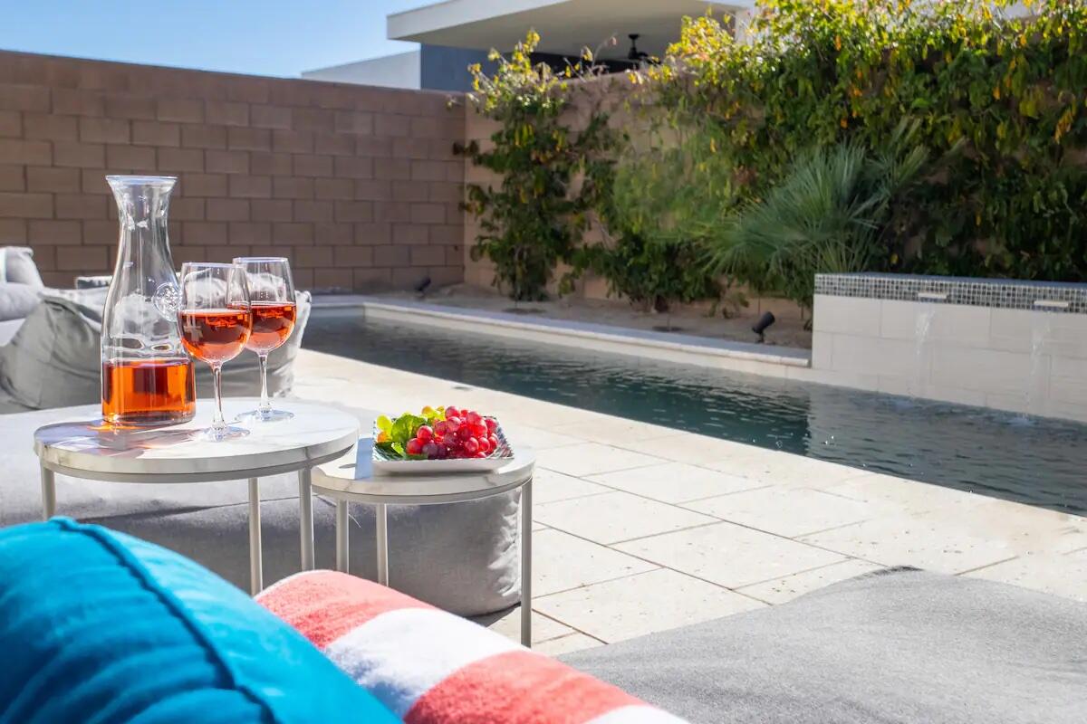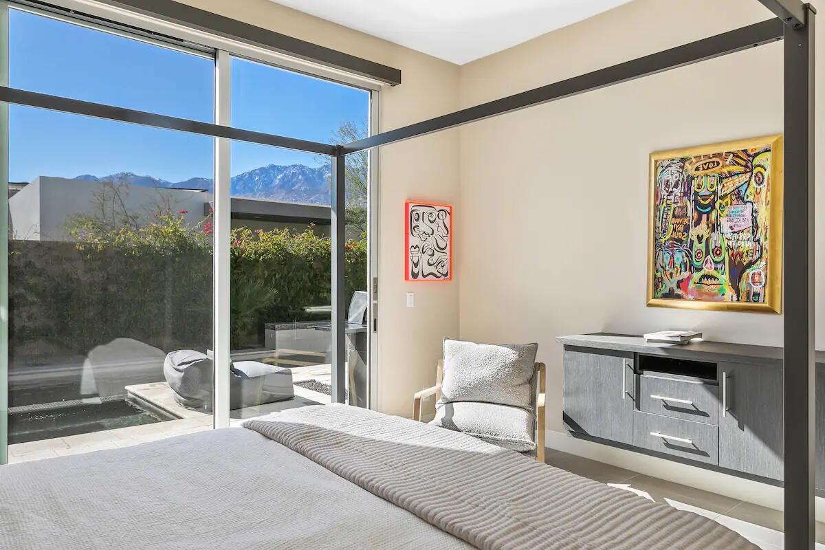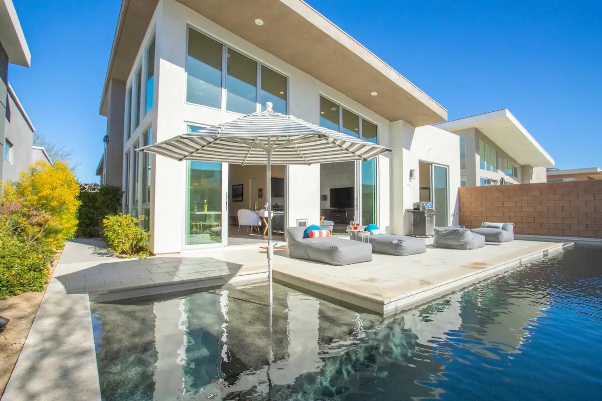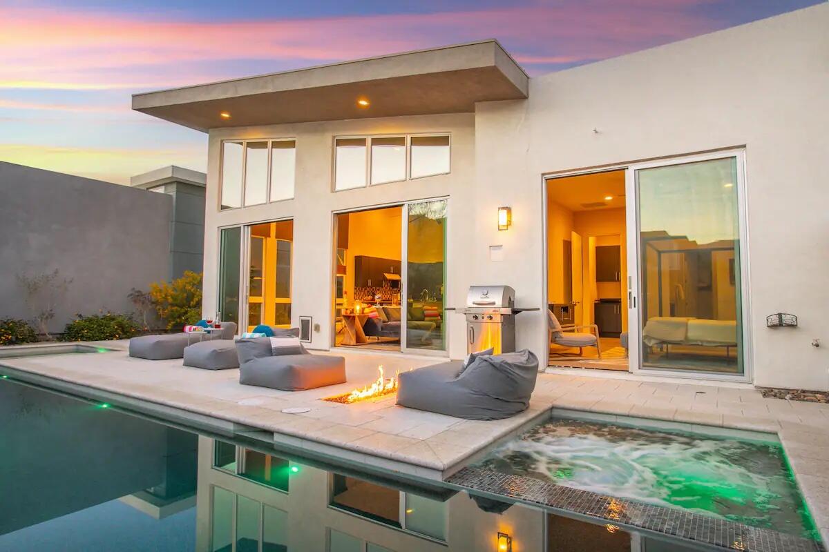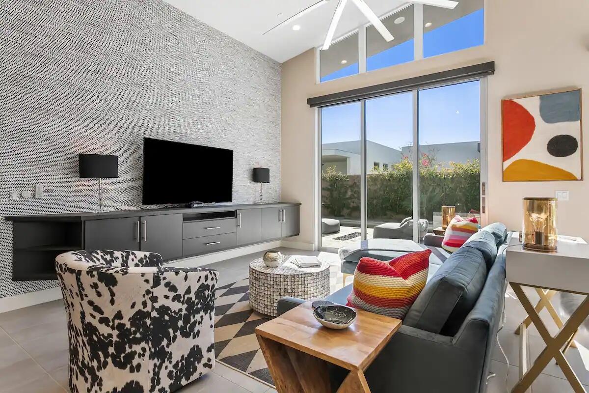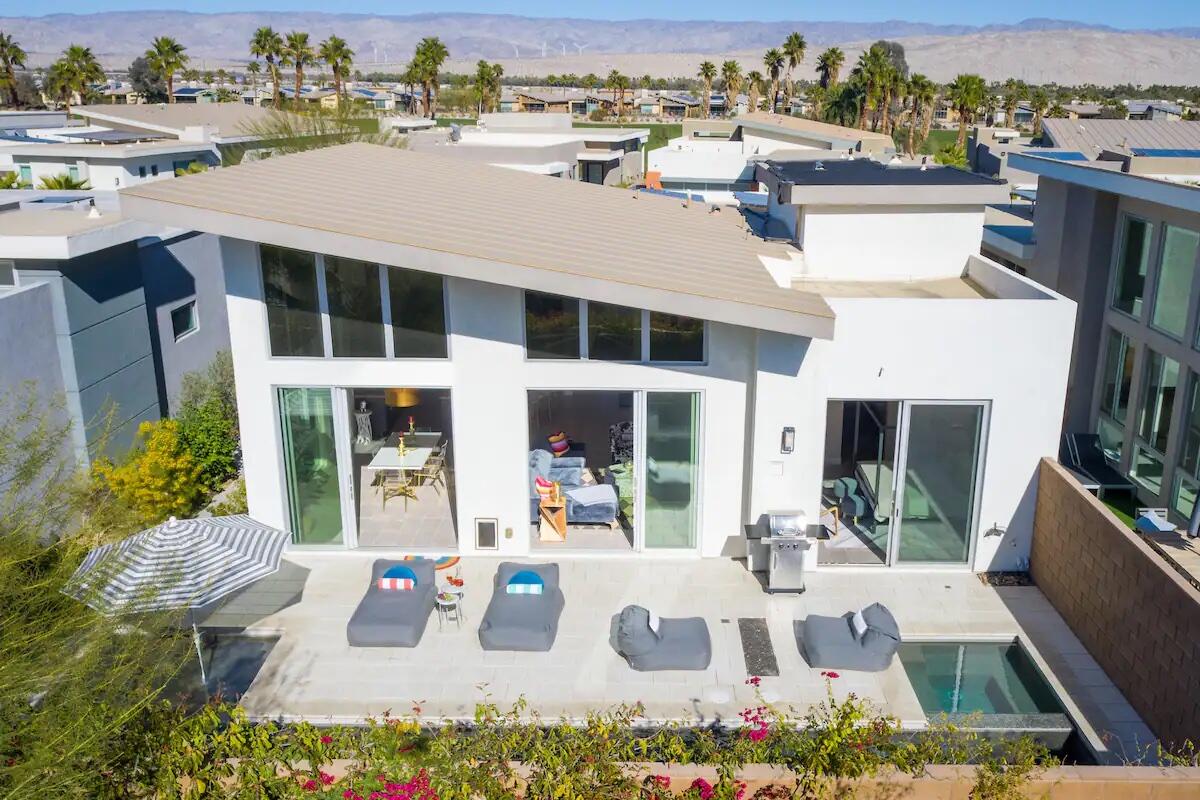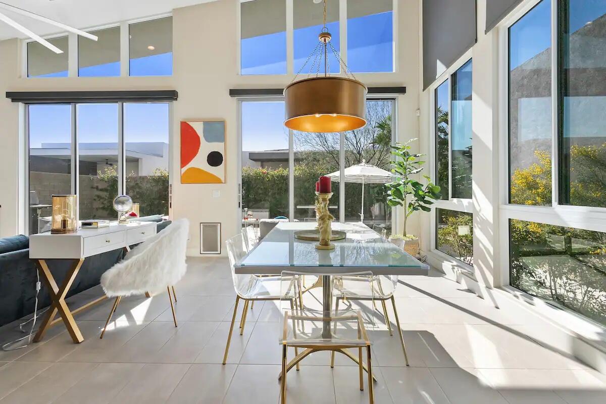 Enjoy the epitome of indoor/outdoor living in this stylish Brizo model home in Escena. With 2 bedrooms and an extra media/flex room, the focal point of this home is the spectacular great room which effortlessly connects the interior to the private backyard with generous lap pool and spa. Lined with sliding doors and soaring walls of windows, the volume and light in this space is astounding. Offered furnished, this magazine worthy home is yours to enjoy immediately. The living room has a built-in and floating media cabinet, wet bar, and is open to a generous dining area. The modern kitchen is the backstop to this space, with an amazing eat-in prep island, beautiful finishes, and full suite of handsome stainless steel appliances. The primary bedroom enjoys mountain views and sliding doors to access the back yard. Its spa like en-suite bath is exquisite, with free standing tub, walk-in shower, and clerestory windows which bathe the space with light. The media room off the entry hall is a flexible space that could be an office or extra sleeping area for guest. The 2nd bedroom with en-suite bath & walk-in closet will entice guests to stay too long. There is a half bath, laundry room, and other amenities: a fire pit adjacent to the pool, owned solar system, water filtration system, EV charger and more. Located in Escena, one of the few guard-gated communities in Palm Springs, you will enjoy a curated and beautiful neighborhood experience with waking trails and dog parks.Interested in this Listing?