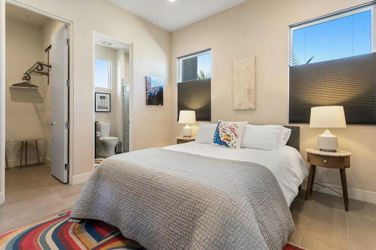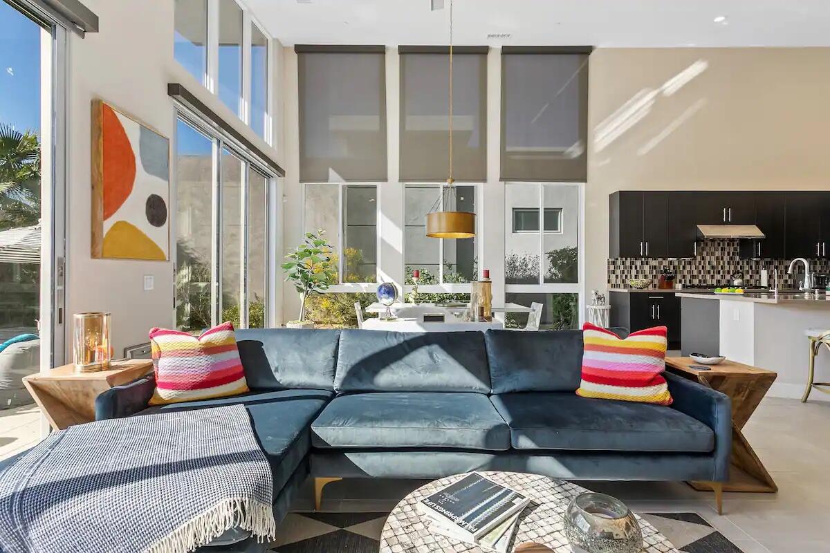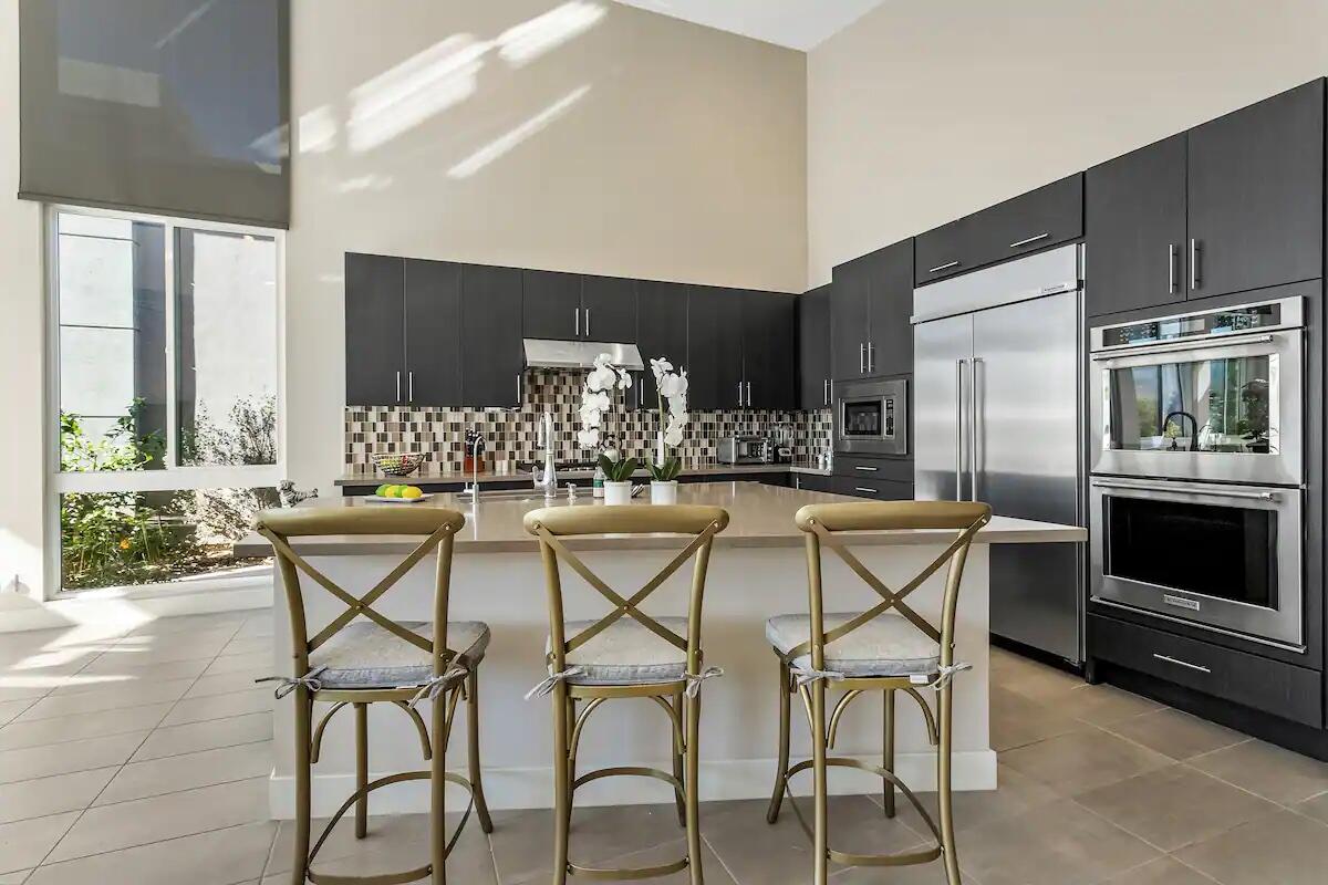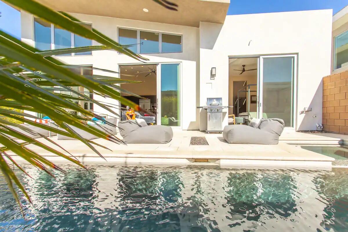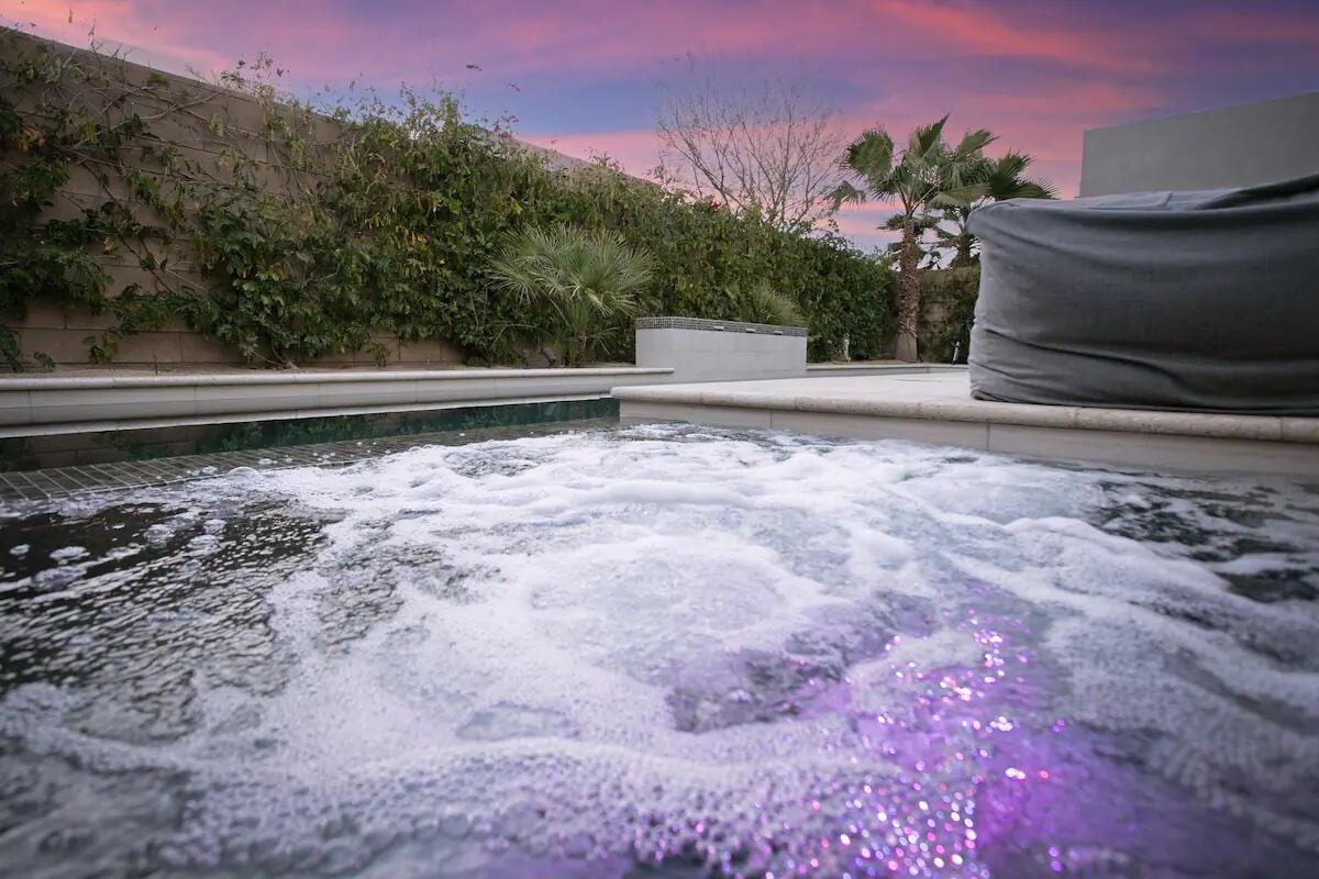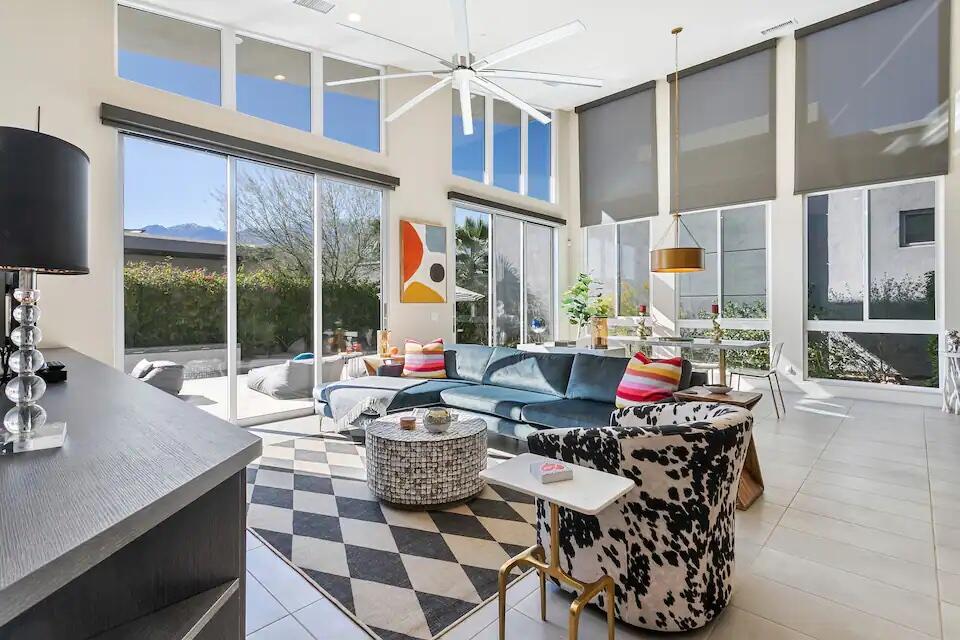 Enjoy the epitome of indoor/outdoor living in this stylish Brizo model home in Escena. With 2 bedrooms and an extra media/flex room, the focal point of this home is the spectacular great room which effortlessly connects the interior to the private backyard with generous lap pool and spa. Lined with sliding doors and soaring walls of windows, the volume and light in this space is astounding. Offered furnished, this magazine worthy home is yours to enjoy immediately. The living room has a built-in and floating media cabinet, wet bar, and is open to a generous dining area. The modern kitchen is the backstop to this space, with an amazing eat-in prep island, beautiful finishes, and full suite of handsome stainless steel appliances. The primary bedroom enjoys mountain views and sliding doors to access the back yard. Its spa like en-suite bath is exquisite, with free standing tub, walk-in shower, and clerestory windows which bathe the space with light. The media room off the entry hall is a flexible space that could be an office or extra sleeping area for guest. The 2nd bedroom with en-suite bath & walk-in closet will entice guests to stay too long. There is a half bath, laundry room, and other amenities: a fire pit adjacent to the pool, owned solar system, water filtration system, EV charger and more. Located in Escena, one of the few guard-gated communities in Palm Springs, you will enjoy a curated and beautiful neighborhood experience with waking trails and dog parks.Interested in this Listing?