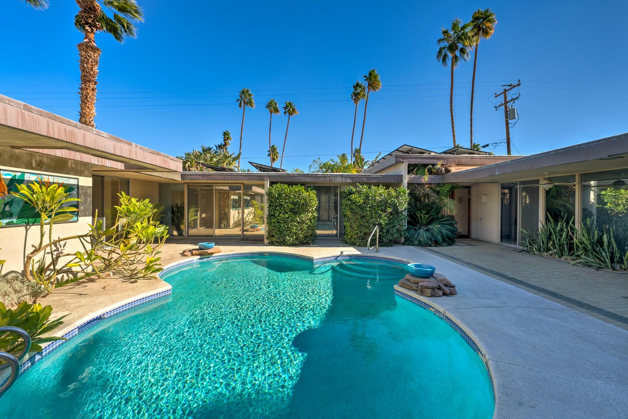 A true architectural paragon in the historic Deepwell neighborhood of Palm Springs. This 1966 post-and-beam mid-century home flaunts timeless clerestory windows, soaring ceilings, and walls of glass that flood the U-shaped layout with natural light-ideal for preservation or thoughtful updates. The front-loaded clover-shaped pool, enhanced by a custom glass mosaic, is surrounded by manicured landscaping and mature citrus trees, creating a private oasis. Inside, original terrazzo flooring, a dramatic fireplace, and unique details like a chandelier owned by Jolie Gabor highlight its authentic charm. With strong appeal to design enthusiasts and mid-century purists, this property offers exceptional potential while preserving Palm Springs' mid-century legacy. This energy efficient home includes 53 Owned Solar Panels (installed 2019), for near net-zero sustainability. Manzanita Avenue has been the home to many notables, such as William Holden (next door), Tippi Hedron, Julie London, Jack Webb and Loretta Young.Interested in this Listing?
