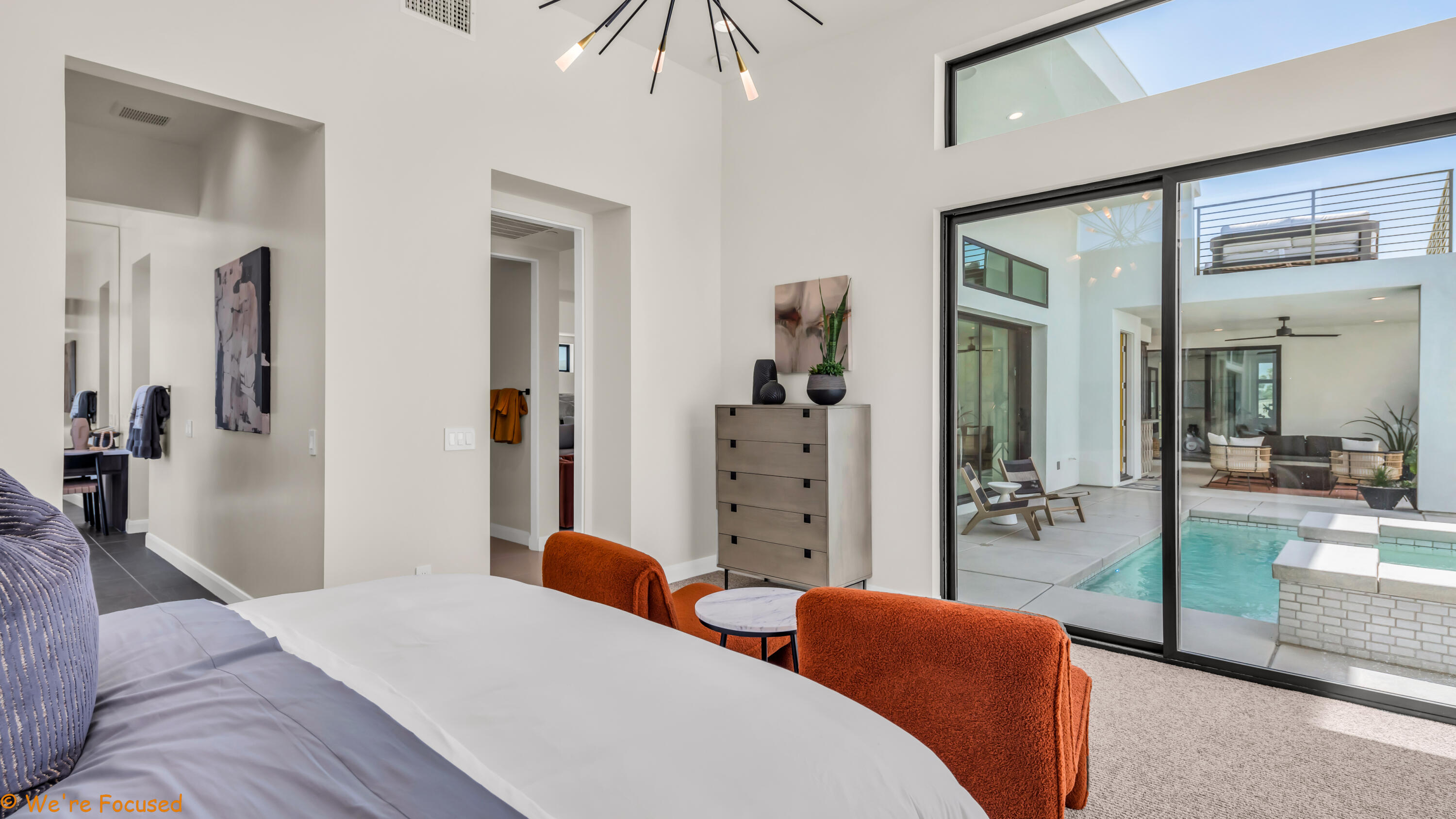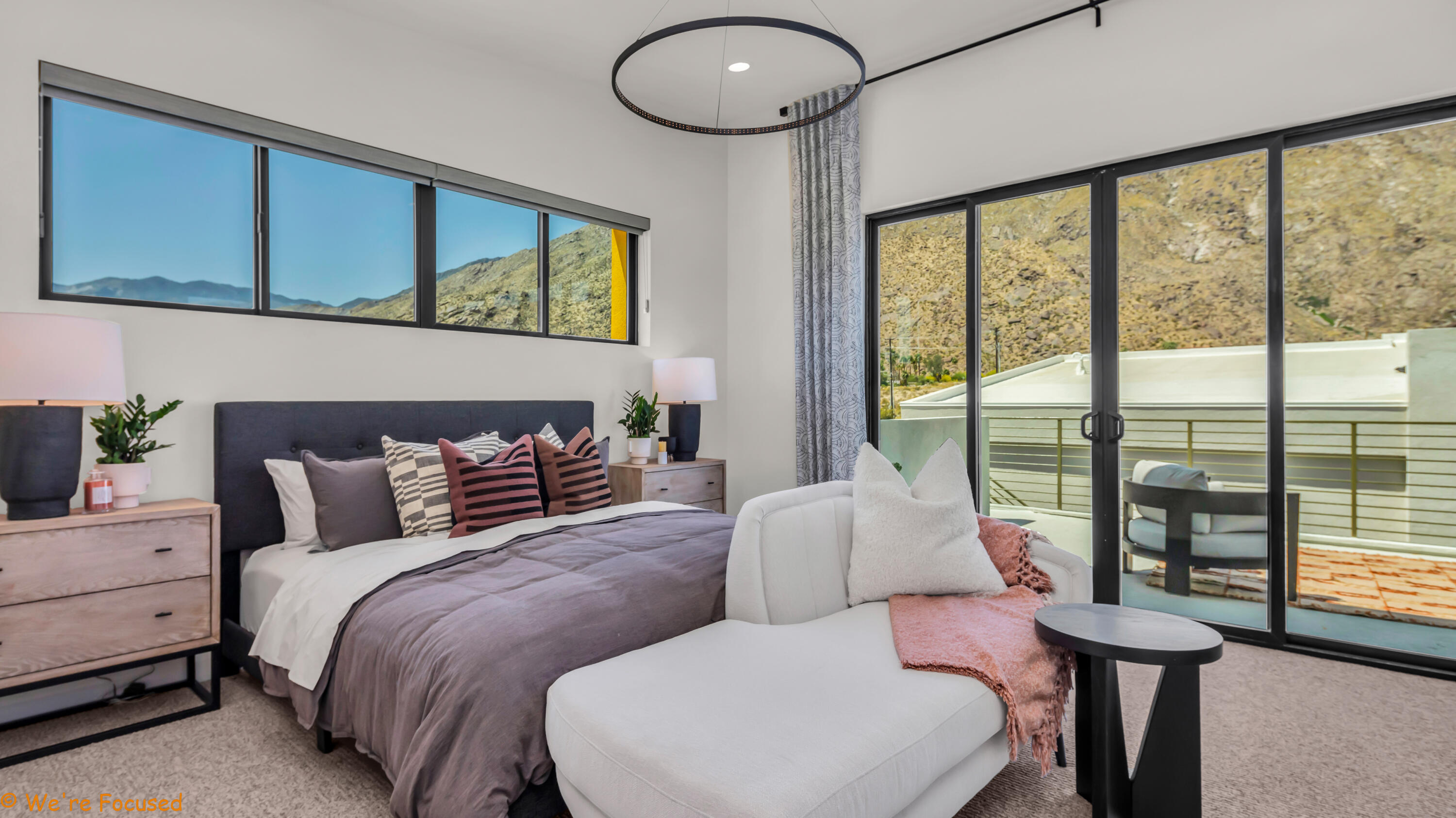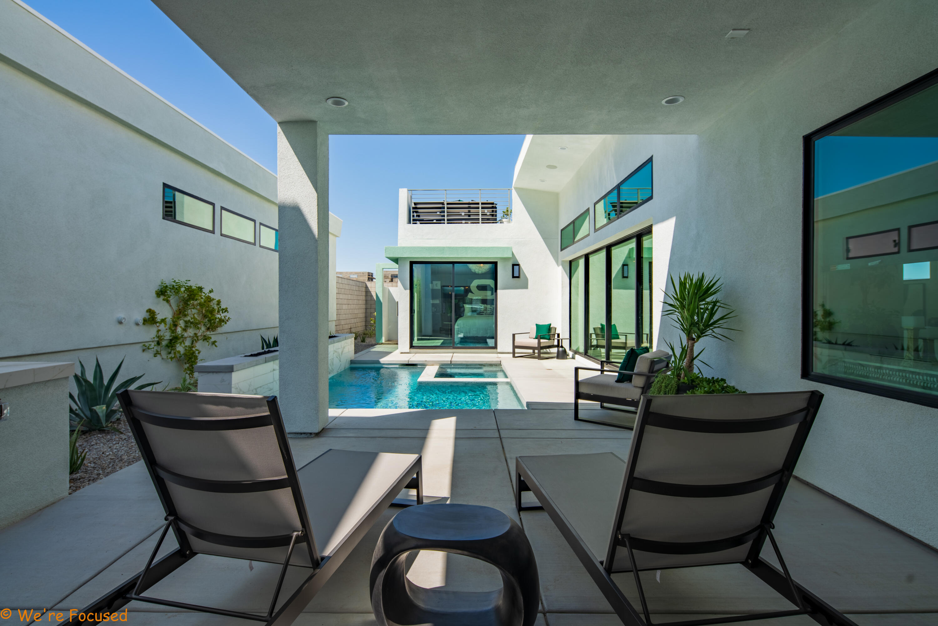 Model Home furnished! last of two homes at Elan. Resort style living at Elan in South Palm Springs. Only a few minutes walking distance from downtown! This 2,533 SF home features 2 Primary Suites, 3.5 baths, a Casita (bed 3), Thermador appliances, outdoor patio, deck with mountain views, waterfall quartzsite countertops, upgraded porcelain tile 24X24 flooring, Solar System 16 panels included no lease, large multi slide Western pocket sliders, outdoor shower, outdoor bar, cocktail pool and spa. Exterior picture of house is of a rendering. Built by Farwest Industries.Interested in this Listing?
