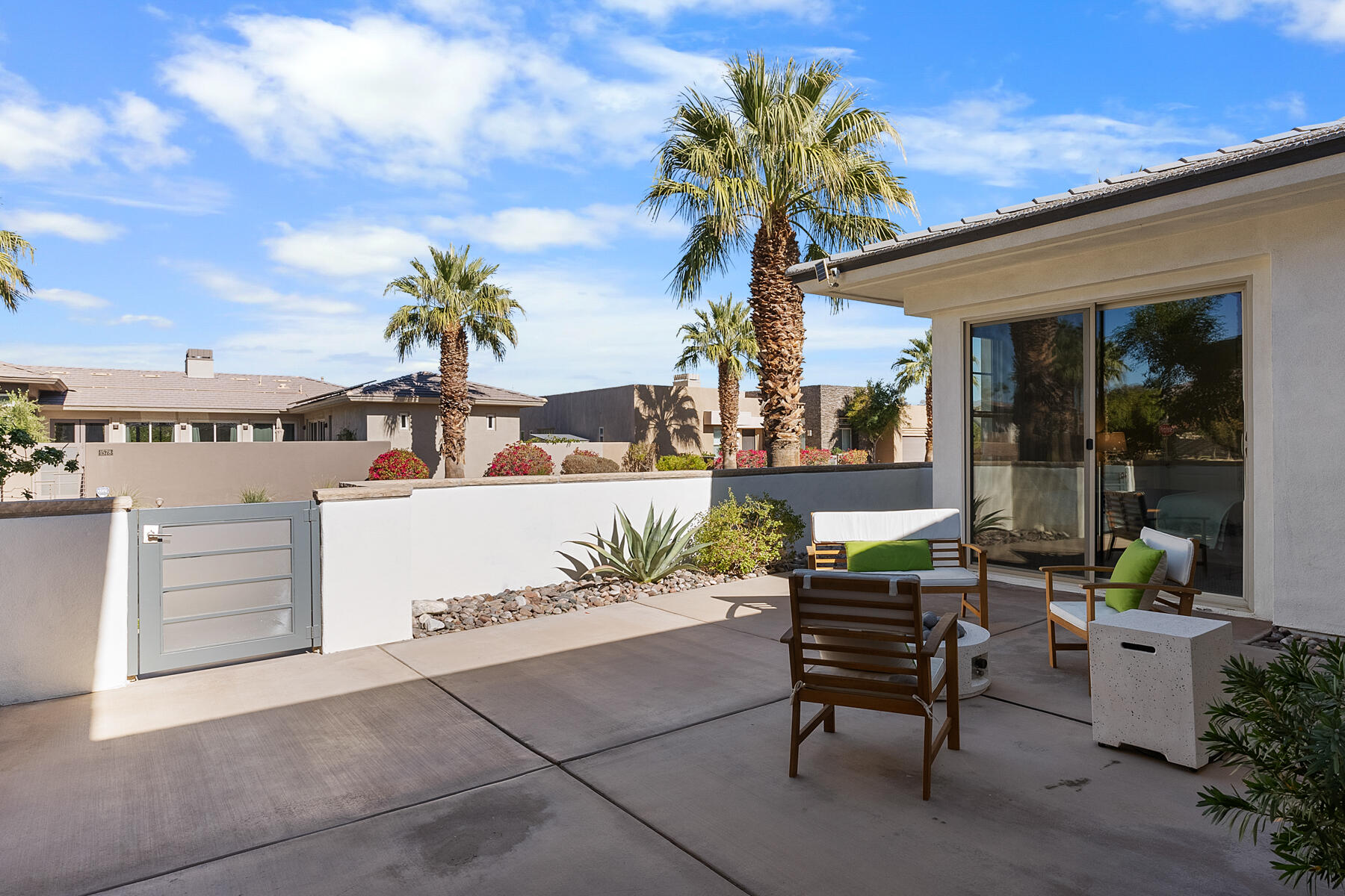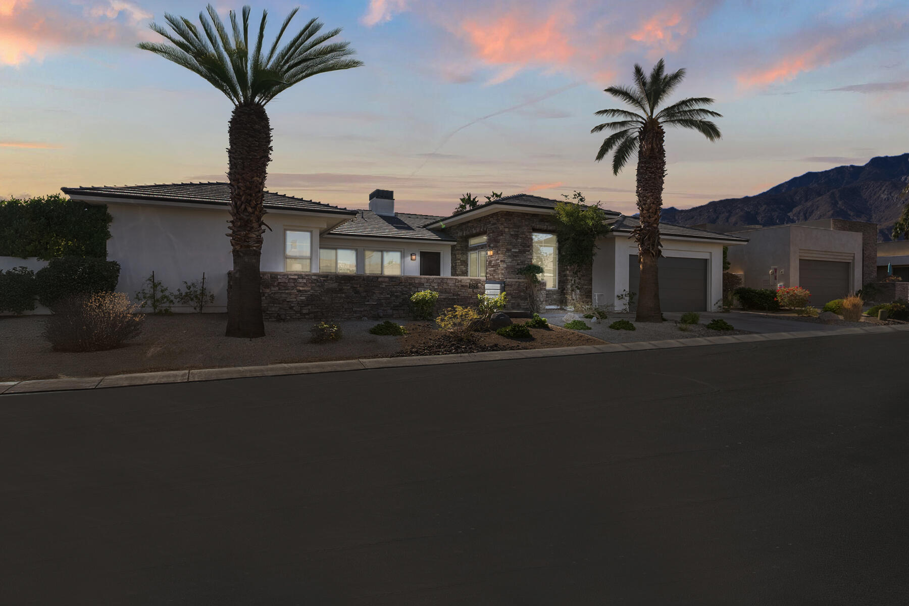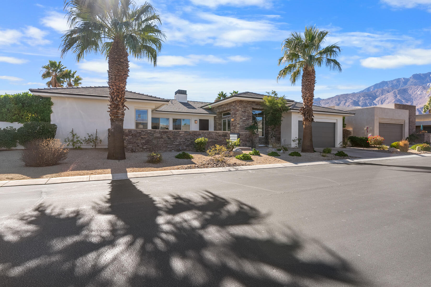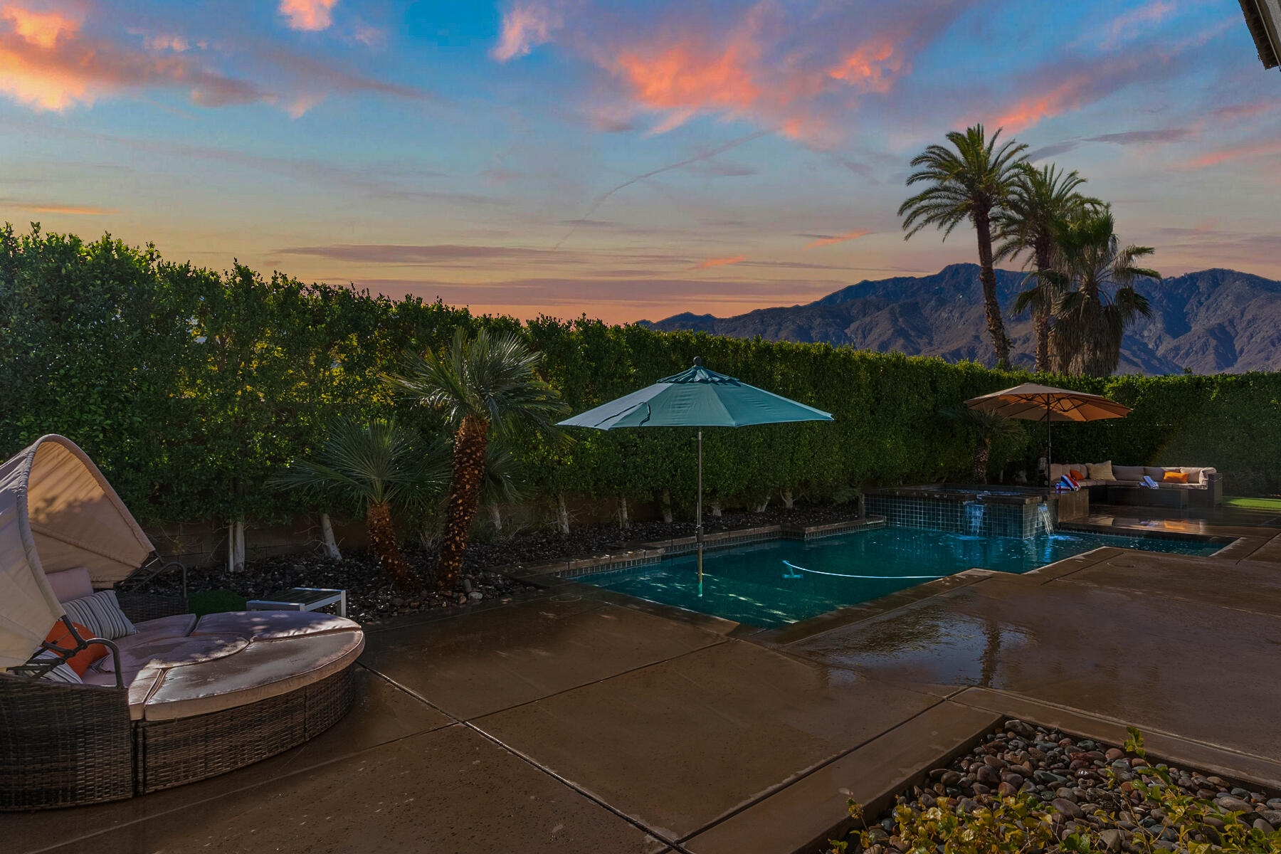 Discover breathtaking west mountain views from the serene backyard paradise of this exquisite home in Enclave at Sunrise! Dive into the beautifully designed Pebble-Tec saline pool and unwind in the inviting spa, all set against a backdrop of stunning sunsets. The meticulously maintained entertaining areas make it ideal for gatherings, while the charming front entry courtyard warmly welcomes you to this remarkable retreat. Step into this inviting home featuring vibrant sandstone-concrete tiles! The gourmet kitchen boasts an expansive island, double ovens, stainless-steel appliances, and stunning slab granite counters. It seamlessly connects to the great room, perfect for hosting. Enjoy meals in the charming dining area or relax by the fireplace in the cozy living space--ideal for unforgettable moments! Imagine stepping into a home where each of the three inviting bedrooms boasts its own pristine ensuite bathroom, offering the perfect blend of comfort and privacy. The thoughtful design continues with a stylish powder room and a flexible den that can easily serve as a sitting area or office, providing endless possibilities to suit your lifestyle. Plus, a dedicated laundry room and a spacious double garage. This home truly has it all, combining functionality with a welcoming atmosphere. Embrace the vibrant Palm Springs lifestyle with this stunning property featuring owned solar! This is your chance to own not just a home, but the LAND itself!Interested in this Listing?