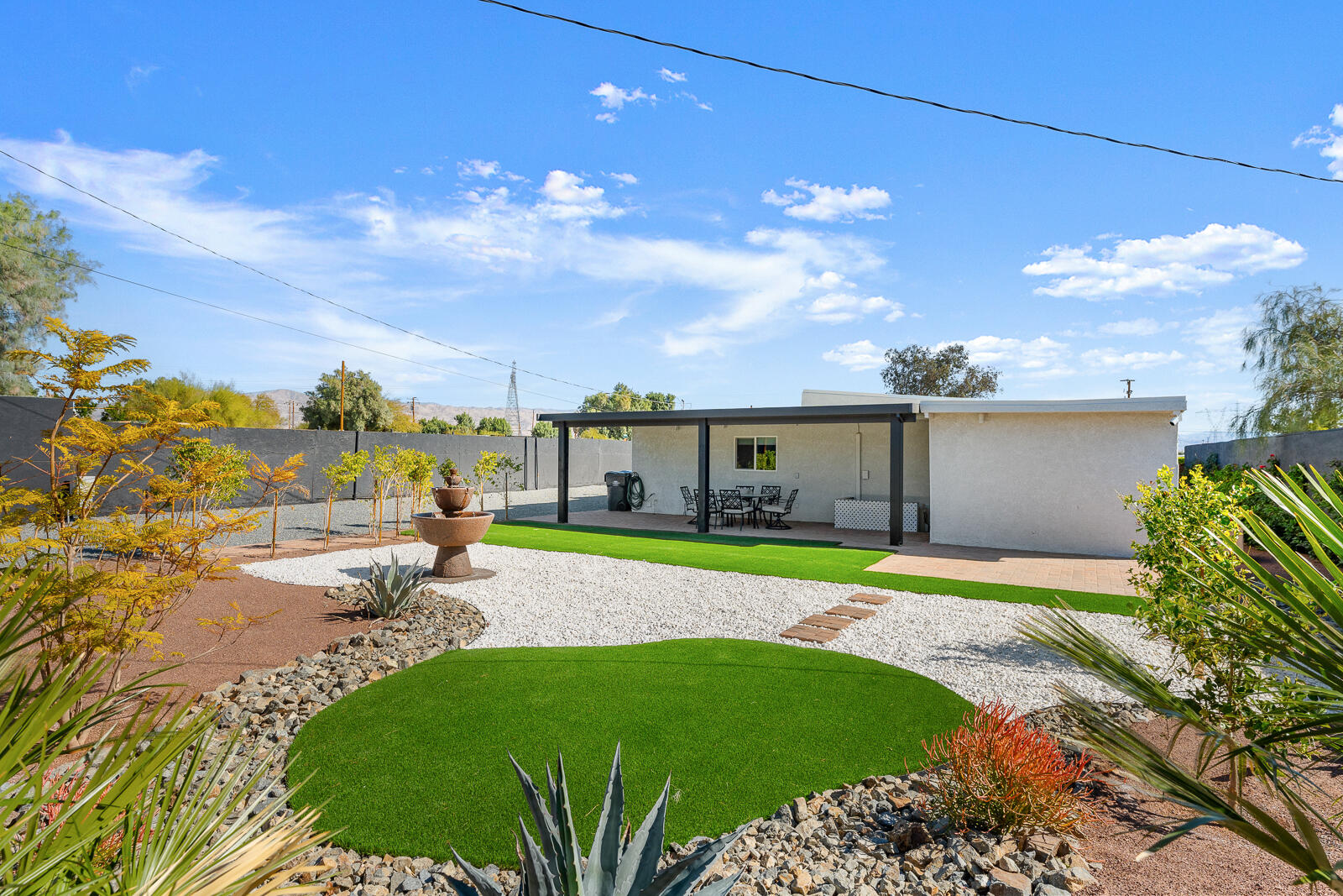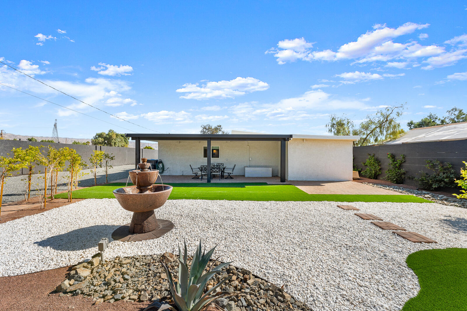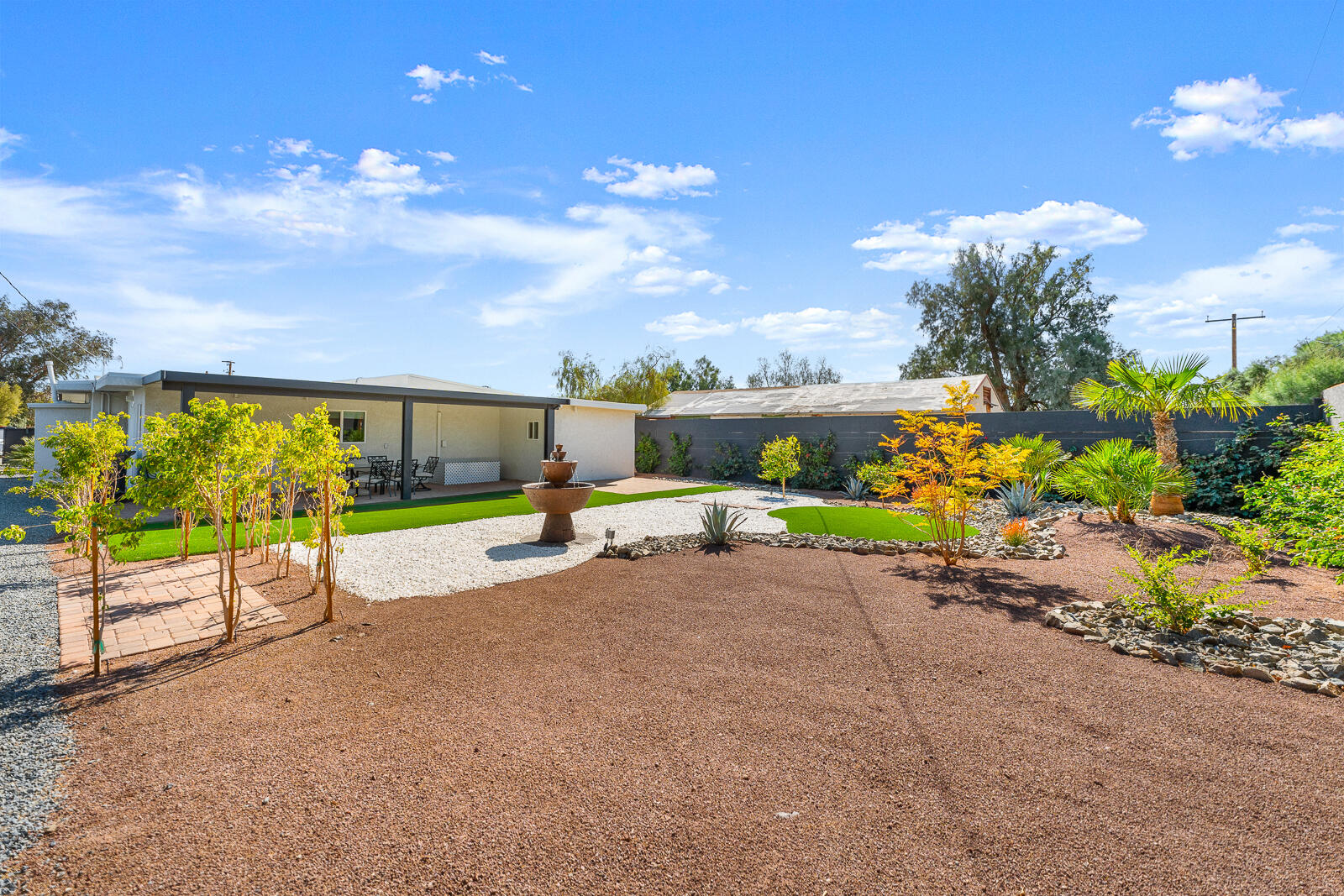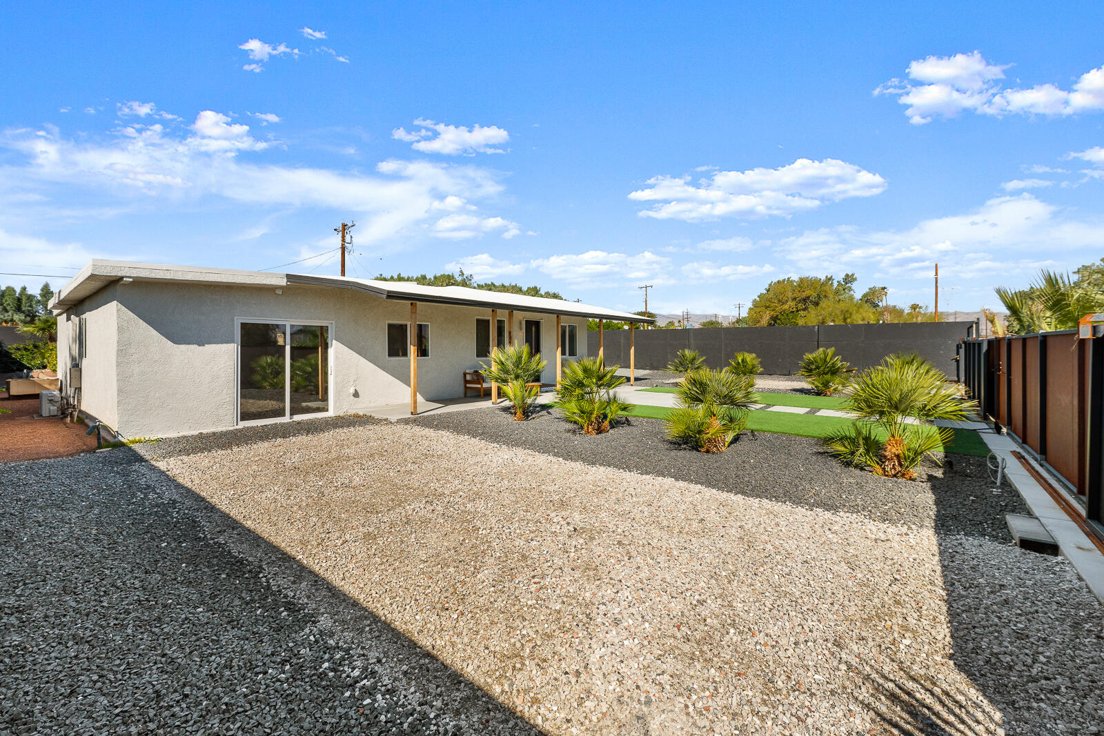 Completely Renovated Desert Oasis with Modern Finishes Discover this exceptional home, where thoughtful renovations meet sleek contemporary design. Recently remodeled for a total investment of $200,000 a remarkable achievement, thanks to the owner's hands-on approach this property has been fully transformed both inside and out. Upon entering, you'll appreciate the brand-new systems throughout, including updated plumbing, electrical work, irrigation, gas lines, and sewer lines, all designed for efficiency and peace of mind. New mini-split air conditioning units have been installed, ensuring climate control year-round. The addition of brand-new windows floods the home with natural light, enhancing the open layout. Both bathrooms and the kitchen have been stylishly remodeled with modern finishes that elevate everyday living. The interior boasts striking micro-topped concrete flooring that delivers a sophisticated and trendy aesthetic, while the master bath offers a stunning polished concrete countertop both practical and chic. Welcoming enhancements extend to the exterior, where the house has undergone a complete re-stucco, removing old wood eaves for a sleek, cohesive look, and has been freshly primed and painted both inside and out. The outdoor space is just as impressive, featuring a beautiful paver patio with a brand-new alumawood cover, complete with lighting and electrical outlets, perfect for outdoor entertaining. A tranquil water feature adds to the serene backyard environment, which is also equipped with RV hookups (20/30/50 amp). Additionally, provisions have been made for future expansion, with lines already run for a potential casita or added living space. This home perfectly blends modern convenience and stylish living, making it an unparalleled gem in the desert. Don't miss your chance to own this masterpiece.Interested in this Listing?