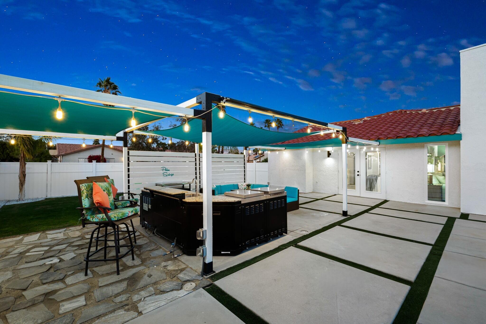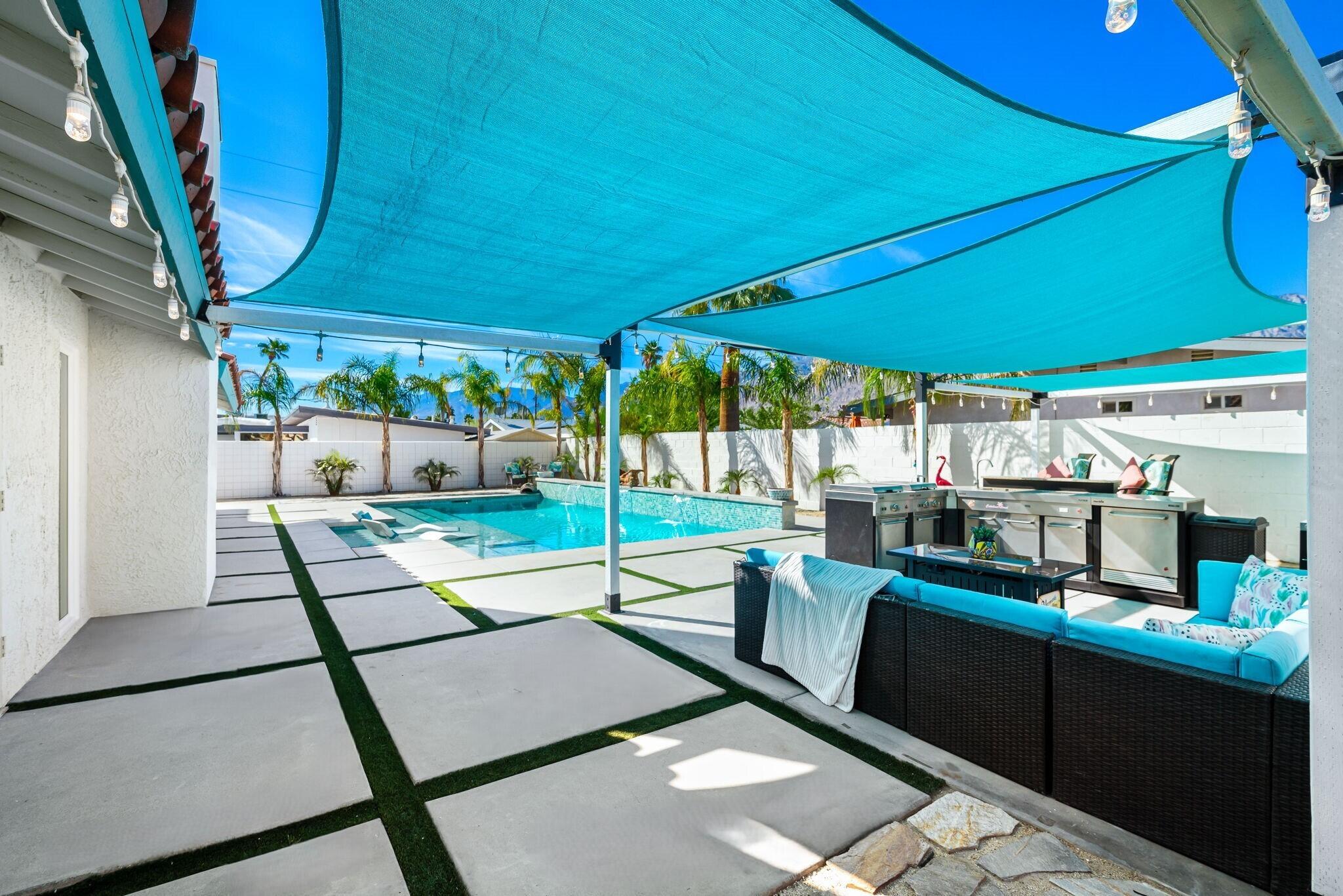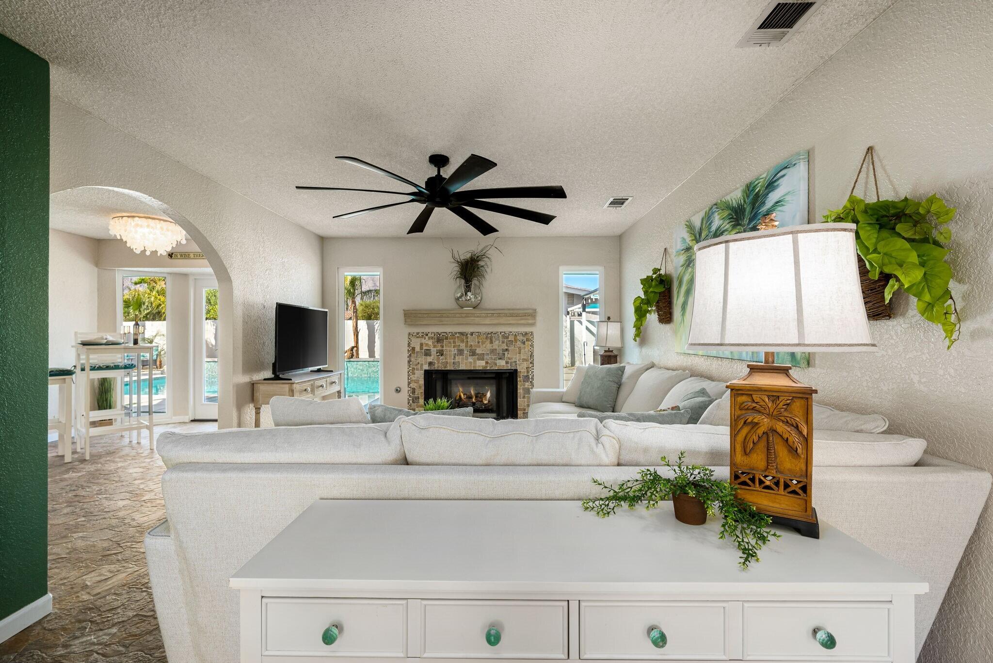 Price reduced and motivated sellers. Calm and tranquil setting surrounded by mountain views. Check out photos with AI enhancement at 2399nvolturnord.com. Welcoming enclosed front courtyard. Double door entry to the comfortable 3BR/ 2BA interior featuring a beautiful stone fireplace, new stone flooring, and 65-inch ceiling fan. Remodeled kitchen offers modern cabinets, textured glass doors, quartz counter tops, shimmering iridescent glass wall tile /backsplash, with stainless-steel appliances. Main bedroom suite opens poolside. Upgraded main bathroom features a tile shower, pebble stone mosaic floor, double sink modern vanity, and OVE bidet smart toilet. Seamless indoor/ outdoor vibe with three sets of new French doors opening to the West facing backyard fully walled and gated. Stunning custom pool showcasing iridescent shimmering glass tile, tanning shelf, and water features. To enhance your entertaining options, enjoy a custom outdoor kitchen cooking area and pergola covered lounge space. Tropical exterior landscapes with colorful lighting sets the mood. Ideal for a full-time home, 2nd home, or seasonal junior vacation rental. Don't miss out. Make your offer today. Motivated.Interested in this Listing?