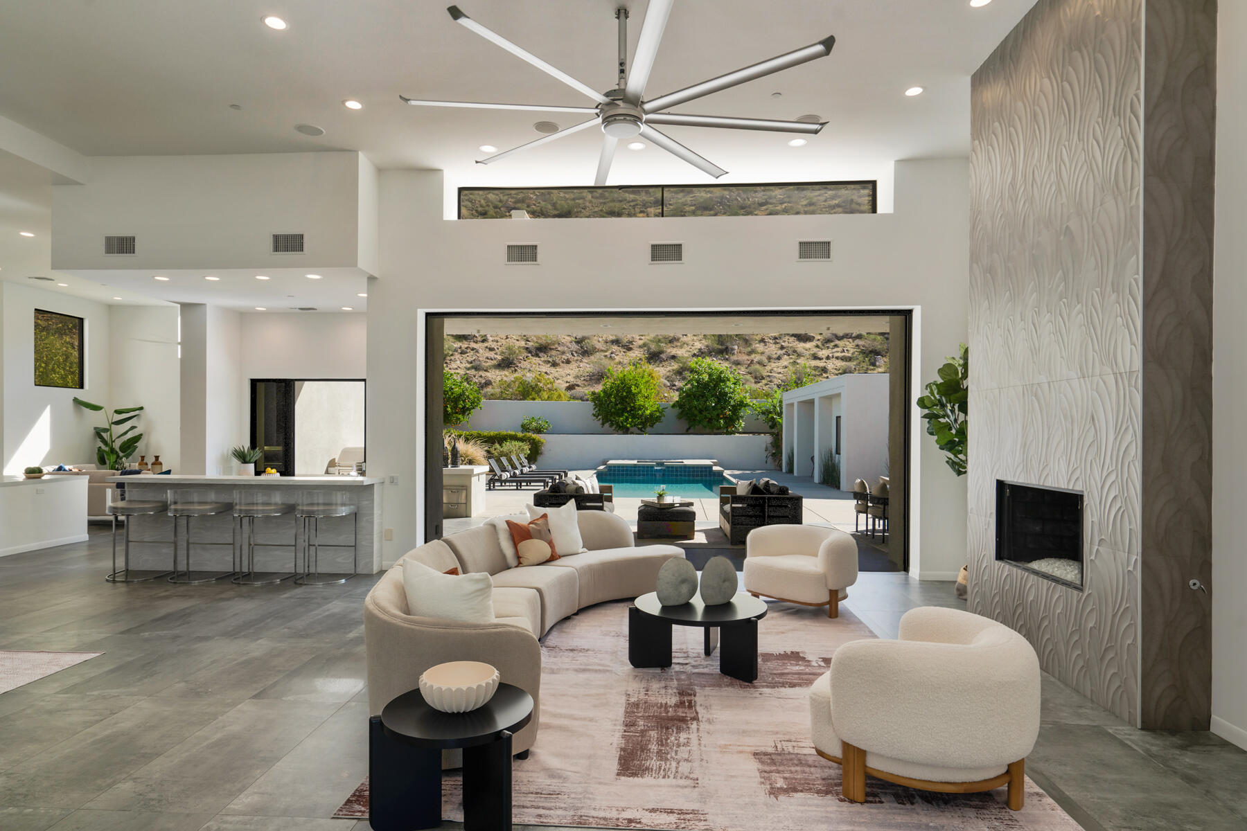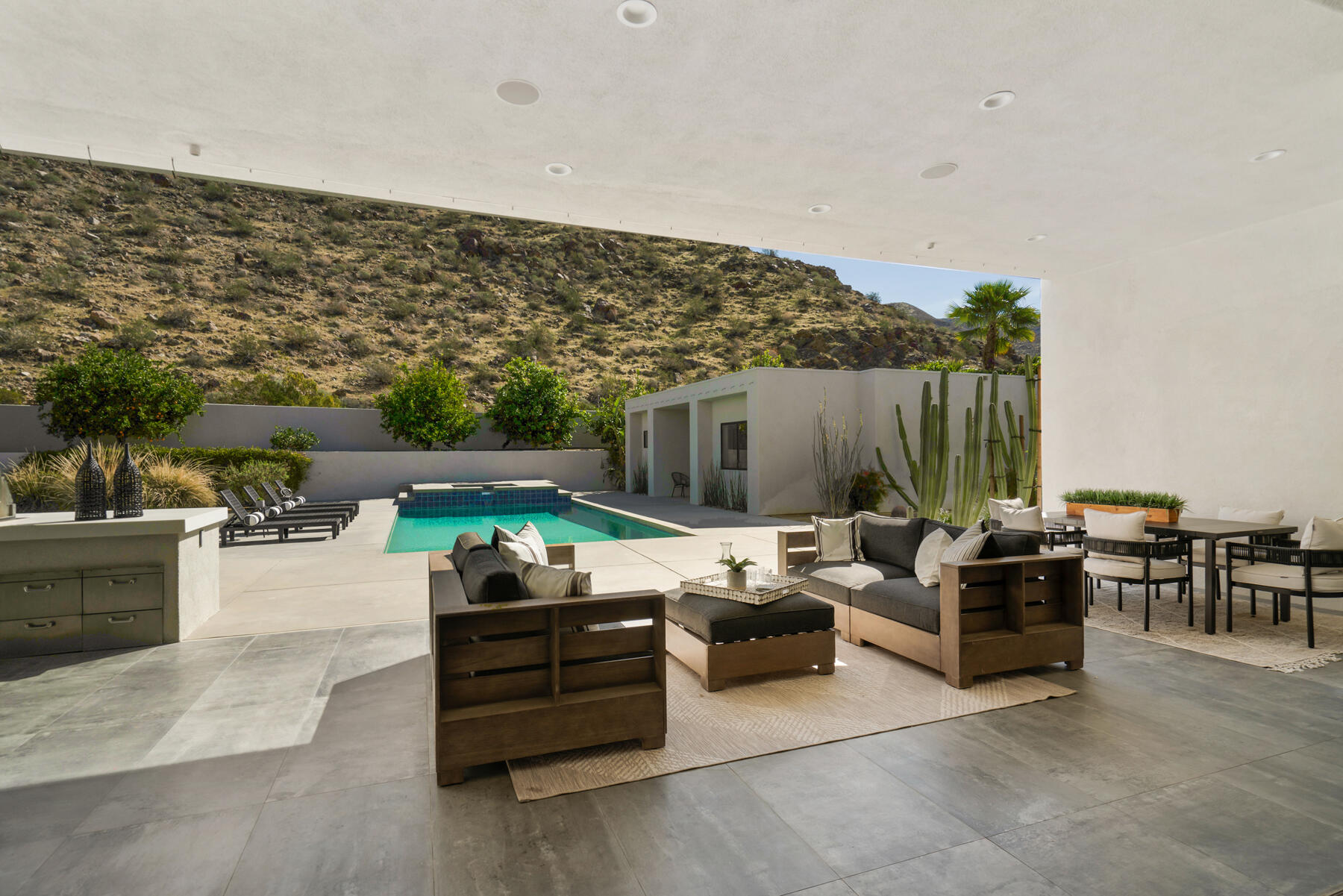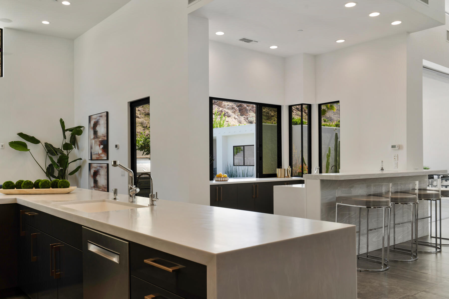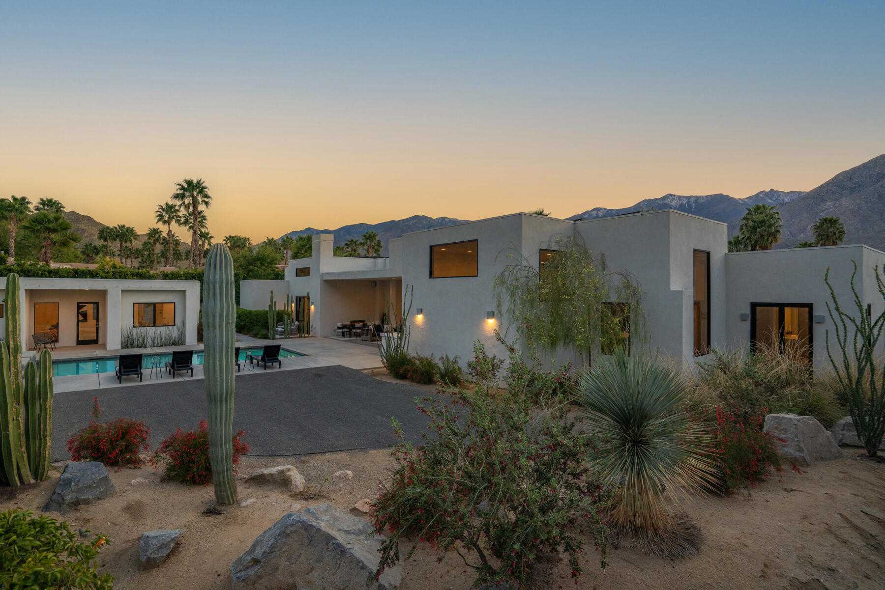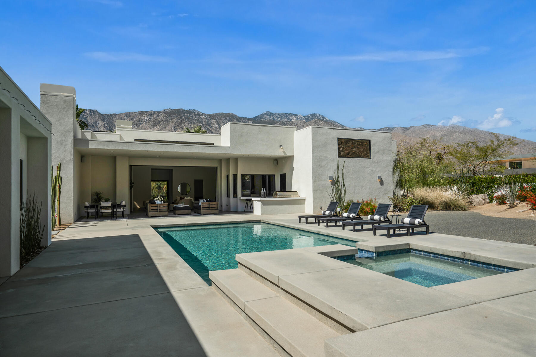 Modern, sophisticated and extensively upgraded, this bright and open custom estate redefines luxury livingin Palm Springs' preferred Andreas Hills enclave. Virtually stripped to the studs and reimagined, the contemporary residence generously accommodates both stylish daily living and grand-scale entertaining in a sprawling single-level floor plan that measures approx. 5,715 s.f. A large pivoting glass entry door introduces main living areas that include a great room with clerestory windows, a sleek fireplace, glass pocket doors to the backyard, and a walk-in wet bar with pass-thru to the outdoor kitchen. Five ensuite bedrooms and 6.5 baths--including a detached casita--ensure comfort for everyone. Open to living areas, a newer chef-caliber kitchen is appointed with high-gloss custom cabinetry and custom-designed countertop, two islands, stone countertops, two sinks, and top-tier appliances including a built-in cabinet-matched refrigerator and a 60 inch commercial-grade stainless steel American Range. Additionally, there are 2 30 inch gas ovens and a Commercial-grade fire suppressant system installed by Desert Fire. Powered by a rooftop net-zero solar array, and, this expertly crafted home hosts newer electrical and plumbing systems, oversized ceiling fans throughout, whole-house audio, and a three-car garage with EV charger. Homeowners will luxuriate in a primary suite with sitting area, fireplace, patio, a freestanding tub, oversized shower and a walk-in closet. Located on fee land (no lease), the expansive homesite backs to a hill and is distinguished by a pool and spa with solar heat, a spacious loggia, outdoor shower and a built-in BBQ.Interested in this Listing?