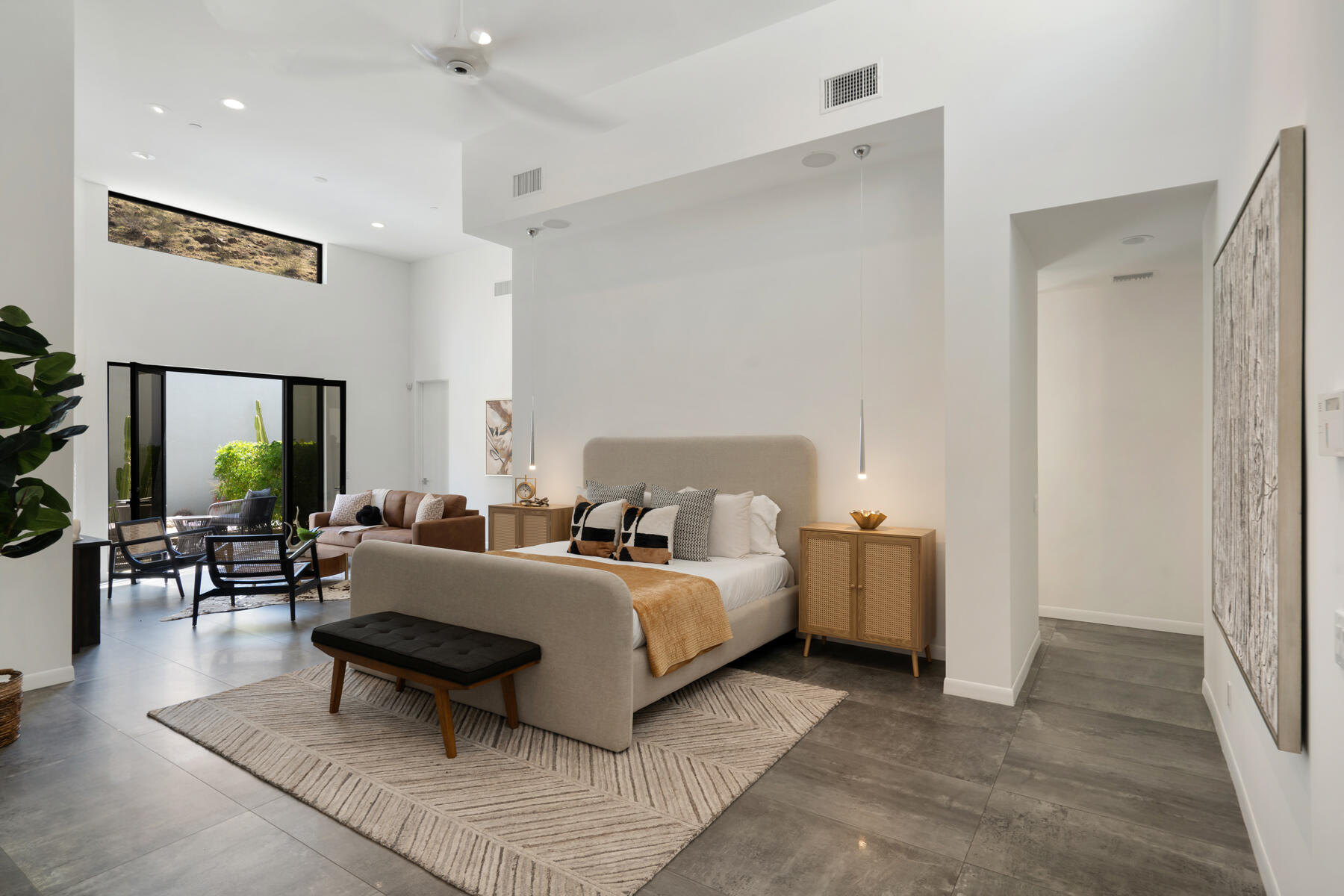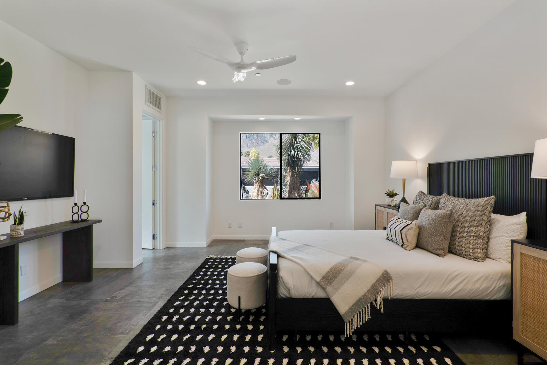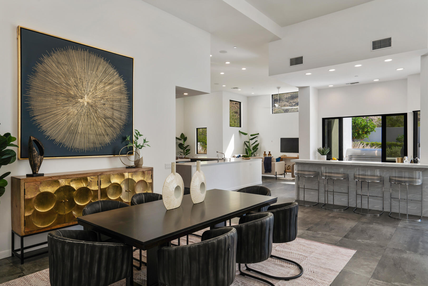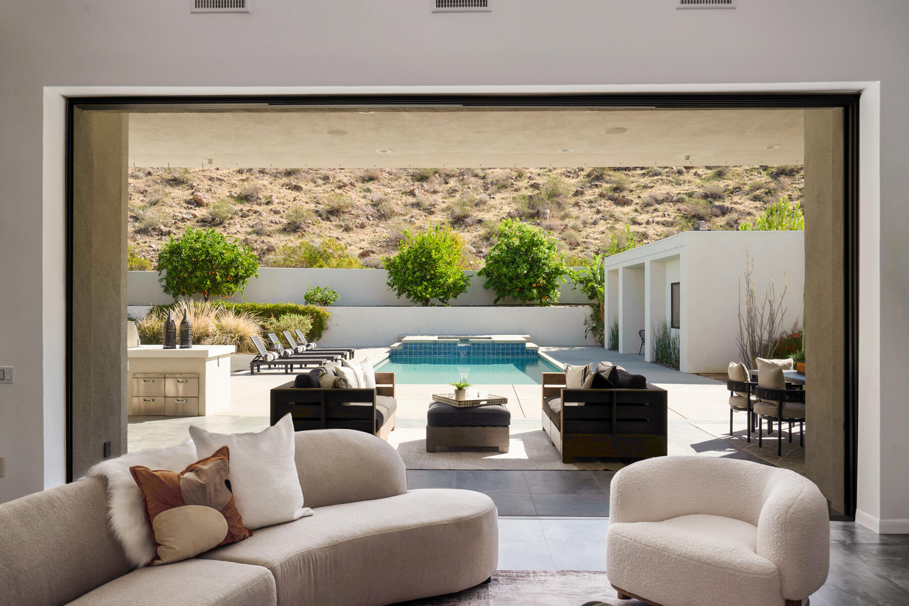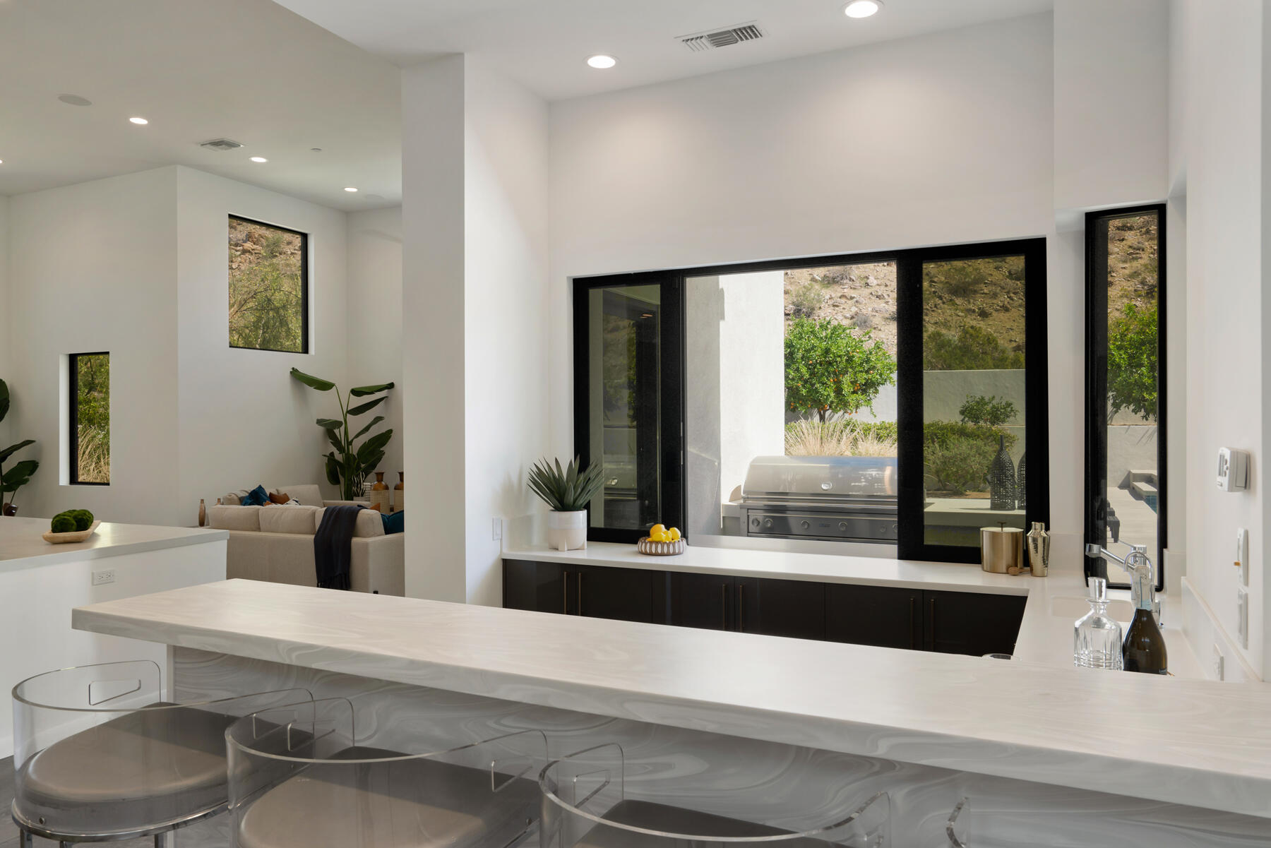 Modern, sophisticated and extensively upgraded, this bright and open custom estate redefines luxury livingin Palm Springs' preferred Andreas Hills enclave. Virtually stripped to the studs and reimagined, the contemporary residence generously accommodates both stylish daily living and grand-scale entertaining in a sprawling single-level floor plan that measures approx. 5,715 s.f. A large pivoting glass entry door introduces main living areas that include a great room with clerestory windows, a sleek fireplace, glass pocket doors to the backyard, and a walk-in wet bar with pass-thru to the outdoor kitchen. Five ensuite bedrooms and 6.5 baths--including a detached casita--ensure comfort for everyone. Open to living areas, a newer chef-caliber kitchen is appointed with high-gloss custom cabinetry and custom-designed countertop, two islands, stone countertops, two sinks, and top-tier appliances including a built-in cabinet-matched refrigerator and a 60 inch commercial-grade stainless steel American Range. Additionally, there are 2 30 inch gas ovens and a Commercial-grade fire suppressant system installed by Desert Fire. Powered by a rooftop net-zero solar array, and, this expertly crafted home hosts newer electrical and plumbing systems, oversized ceiling fans throughout, whole-house audio, and a three-car garage with EV charger. Homeowners will luxuriate in a primary suite with sitting area, fireplace, patio, a freestanding tub, oversized shower and a walk-in closet. Located on fee land (no lease), the expansive homesite backs to a hill and is distinguished by a pool and spa with solar heat, a spacious loggia, outdoor shower and a built-in BBQ.Interested in this Listing?