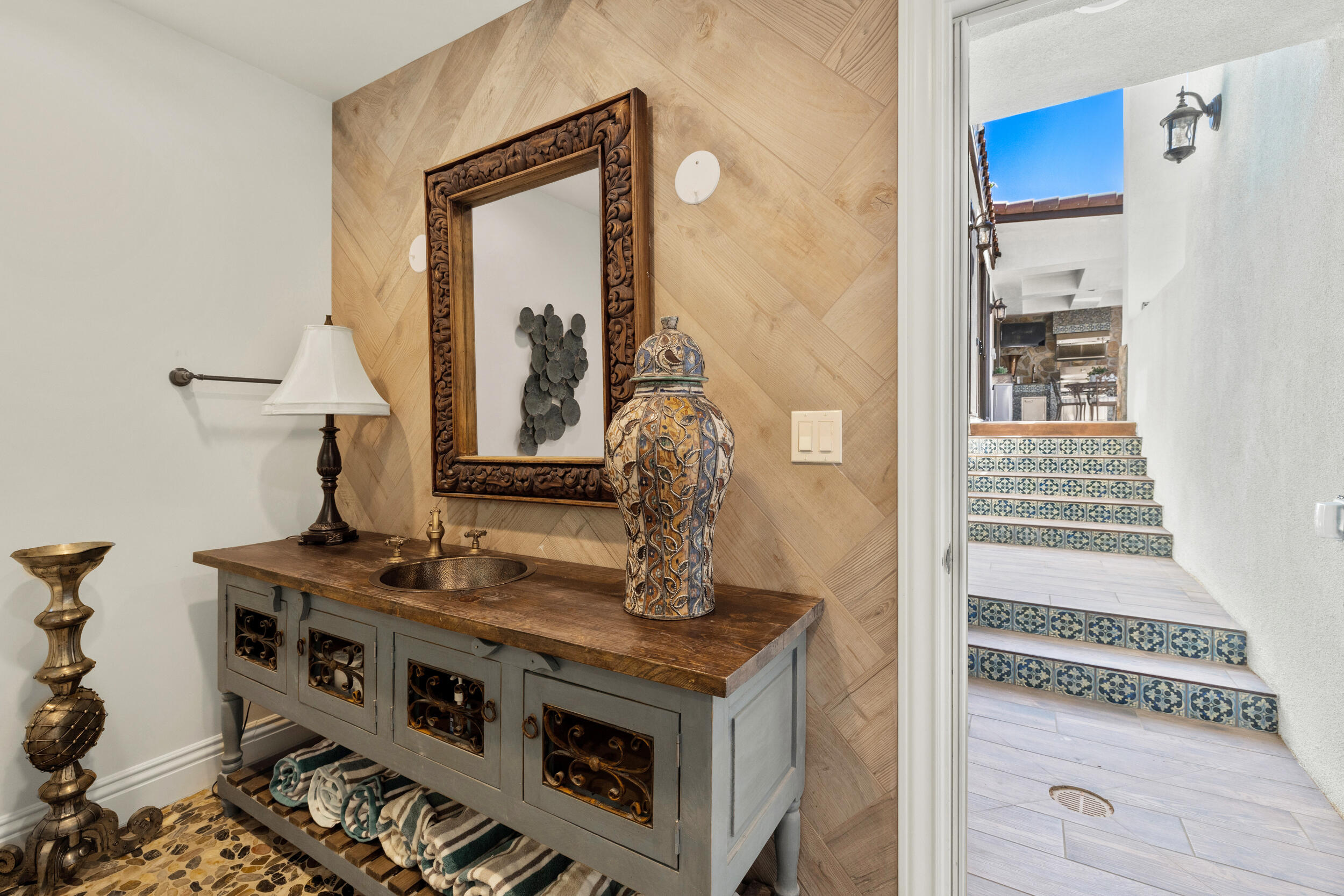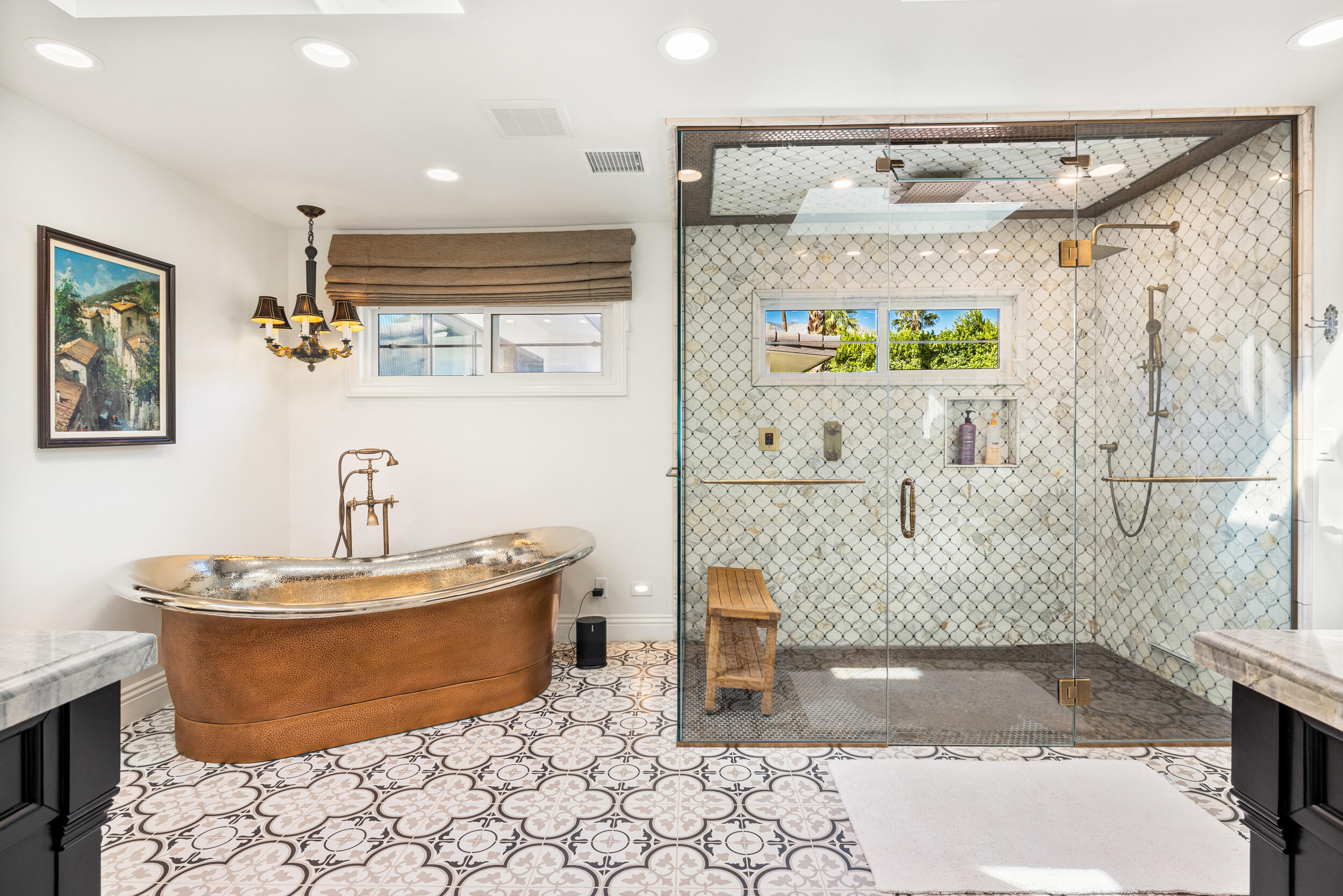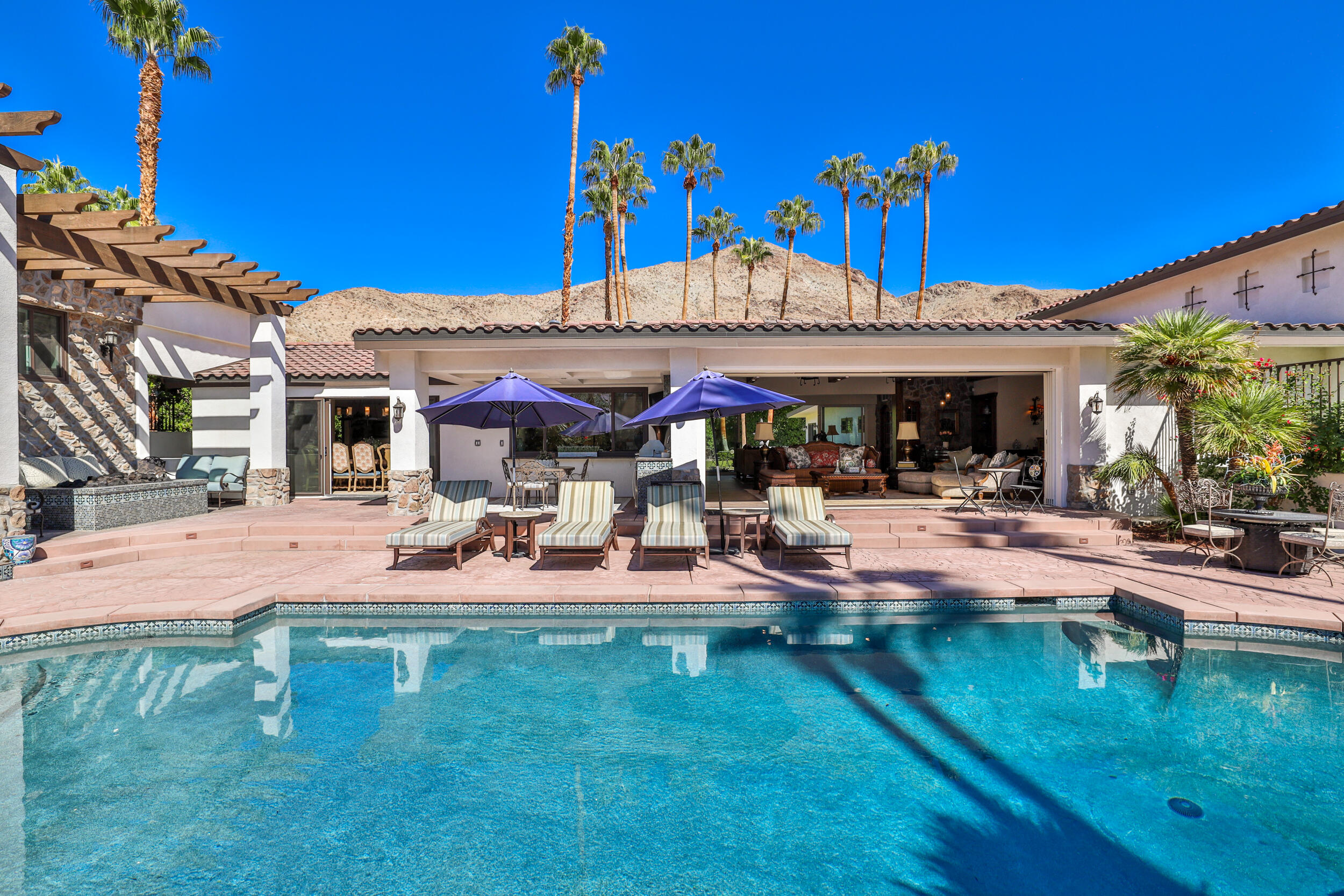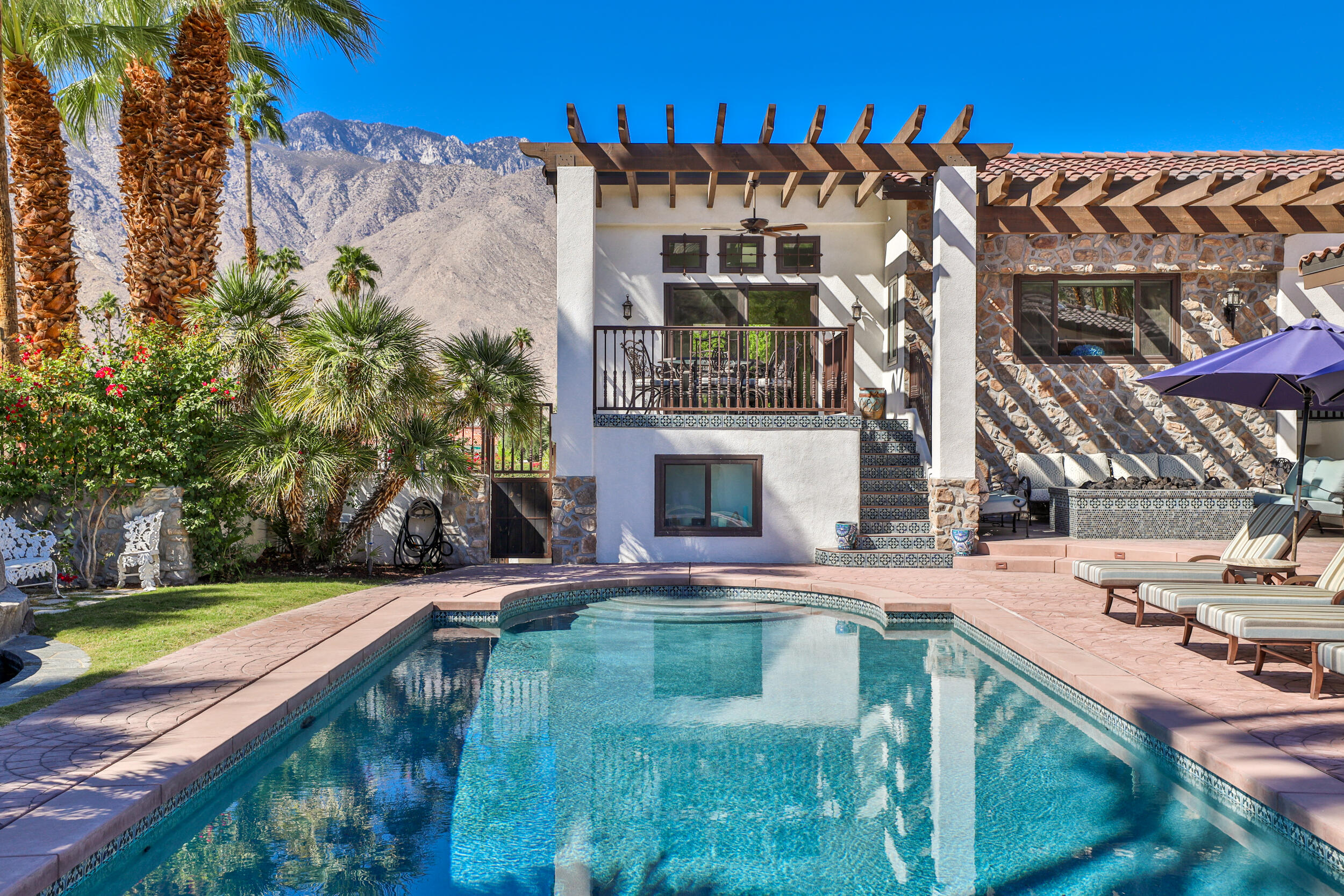 Welcome to Casa Suenos - an architectural masterpiece in the heart of South Palm Springs. Tucked away in the exclusive enclave of Andreas Hills, this private sanctuary blends timeless elegance with elevated design. Surrounded by awe-inspiring 360-degree mountain views, the estate offers a truly unrivaled setting--sheltered by the mountains, bathed in sunlight, & undisturbed by wind--where luxury & tranquility exist in perfect harmony. Set in one of South Palm Springs' most exclusive & tranquil neighborhoods, this residence is just moments from world-class hiking, premier golf, & all the best that Palm Springs has to offer. This 5,417 square foot custom estate is a true architectural jewel-- reimagined & completely rebuilt just three years ago. The result is a meticulously curated Spanish Colonial masterpiece, infused with romantic Moroccan & French architectural influences, seamlessly blended into an elegant & cohesive vision. Every detail, every finish, every texture has been intentionally selected to evoke a sense of escape, romance, & refined beauty. Designed as a private resort, the home includes 4 luxurious en suite bedrooms, a fully-appointed detached casita/guest house with its own kitchen, living room, and laundry, 7 baths, and a 4-car garage. The grand living spaces are anchored by soaring vaulted wood-beamed ceilings, a handcrafted dark wood tequila bar, bespoke custom tilework, and artisan cabinetry that reflect true craftsmanship. Indoor and outdoor living flow effortlessly with sliding pocket doors that open to a spectacular front-loaded resort-style pool & spa, framed by lush landscaping, a Spanish-tiled outdoor fireplace, a fully equipped al fresco kitchen, multiple lounge areas, & a raised patio offering what may be the most breathtaking mountain views in the entire Coachella Valley.The primary suite is the epitome of luxury--expansive, romantic, and indulgent. It features a spa-like bath, dual walk-in closets, and a private attached office for quietInterested in this Listing?