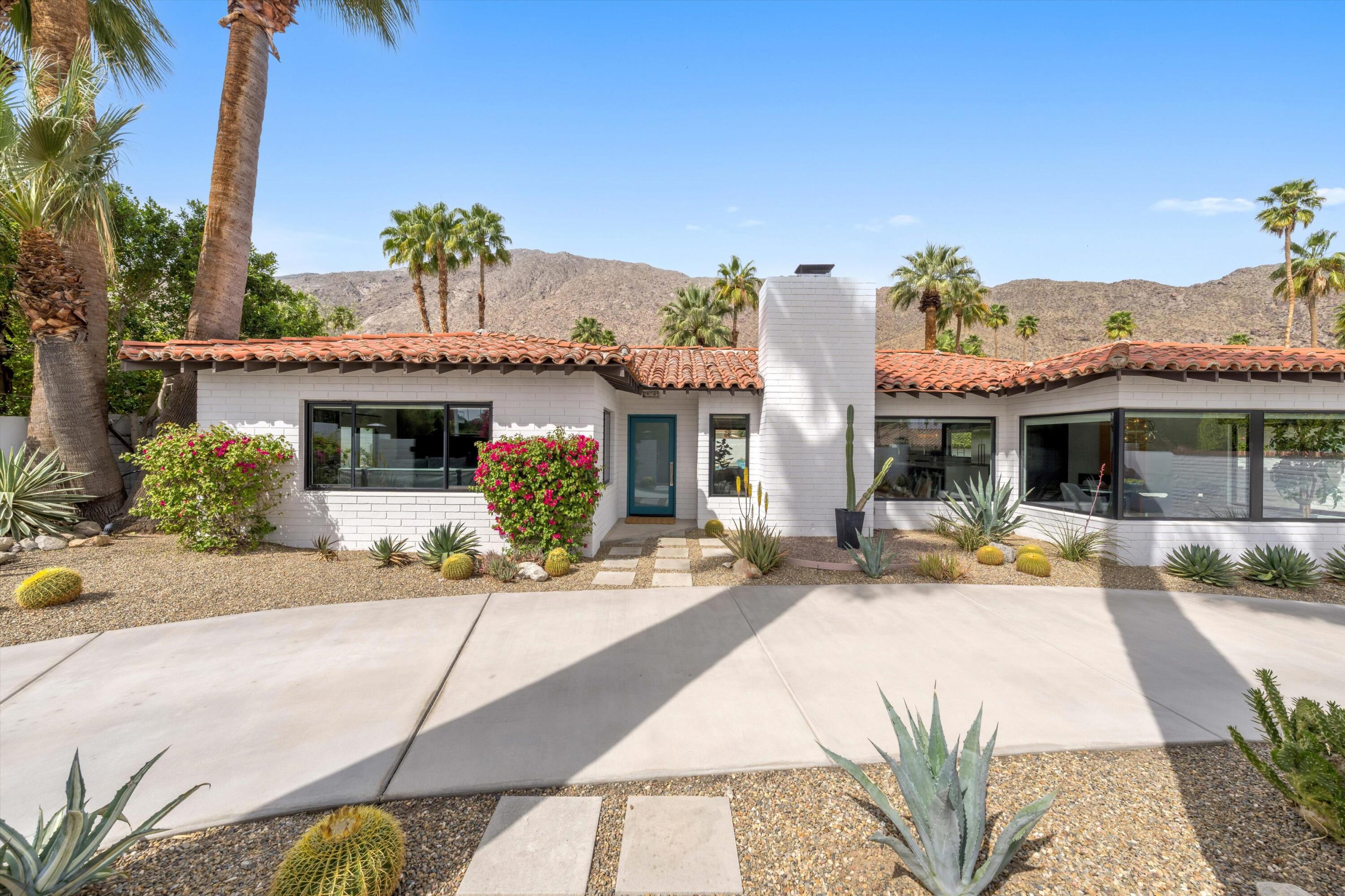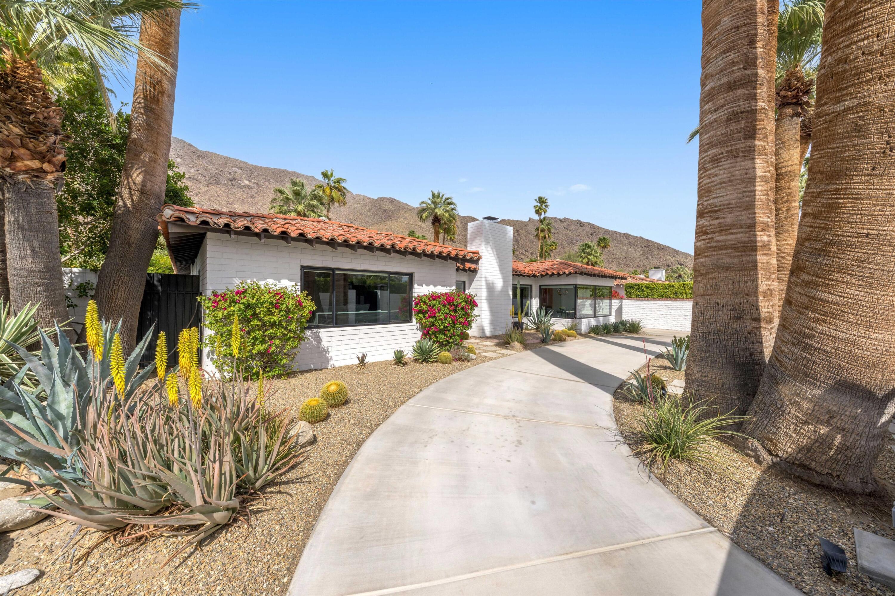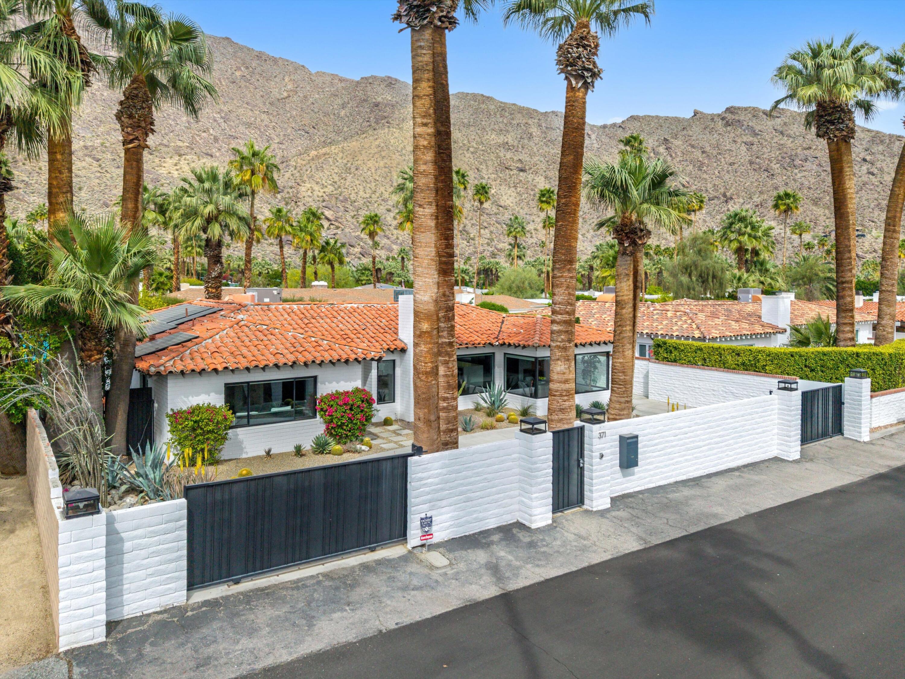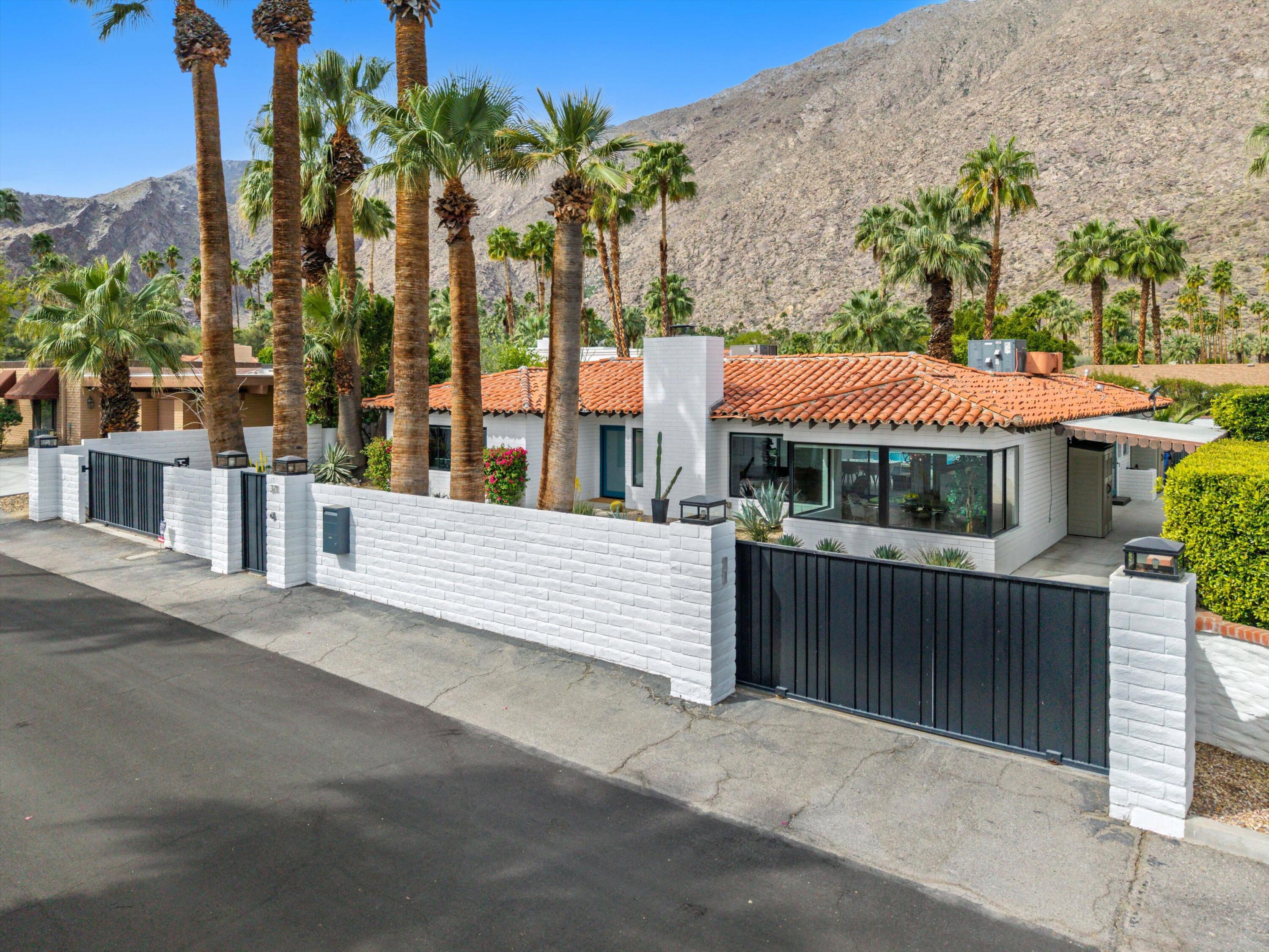 Nestled in the highly coveted Historic Tennis Club area, just a short walk from downtown Palm Springs, this private gated estate offers an exceptional living experience. Set on a gorgeous lot with a motorized gate and circular driveway, the home boasts complete privacy. Topping the list of upgrades is owned solar, resulting in little to no electric bills. Dual paned windows and sliders highlight the gorgeous views, and allow natural light to flood the interiors, creating a bright and airy feel. The beautifully renovated interior features a seamless flow between indoor and outdoor spaces, with ceramic tile wood floors throughout, which creates a cohesive modern look. The heart of the home is the chef's kitchen designed for entertaining, complete with a large island, ample storage, pull out shelves, and sleek quartz countertops. High end stainless steel appliances, including a Viking refrigerator and range, Marvel wine refrigerator, Miele dishwasher, built in microwave and chilling drawer, ensure both style and function. The spacious living room is anchored by a charming masonry block gas fireplace, perfect for relaxing or entertaining. Each of the four bedrooms is an ensuite, offering privacy and comfort. The spa like bathrooms feature floating vanities, three of which have double sinks, under lighting, quartz countertops, modern faucets, and tile walk in showers. Outside, the backyard is a true oasis featuring a vibrant saltwater mosaic pool and spa, breathtaking west mountain views, a fire pit, dining area, and two day beds perfect for lounging in the sun. Low maintenance desert landscaping completes this serene outdoor retreat. With the option to obtain a short term rental permit (the neighborhood is currently well under the 20 percent vacation rental density cap at time of listing), this property presents an outstanding opportunity as a primary residence, second home, investment property, or vacation rental. No HOA and you own the land. Don't miss your chanceInterested in this Listing?