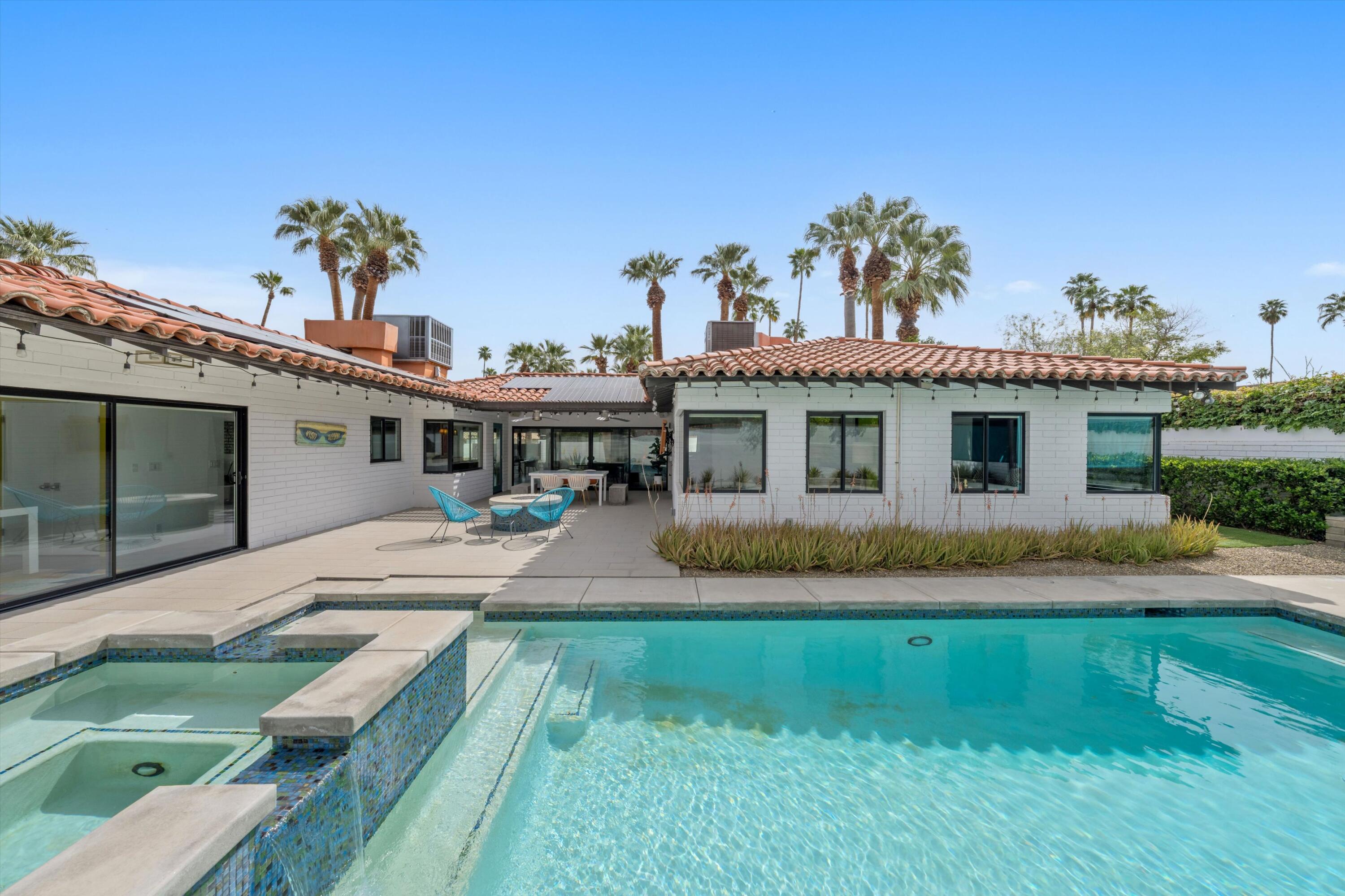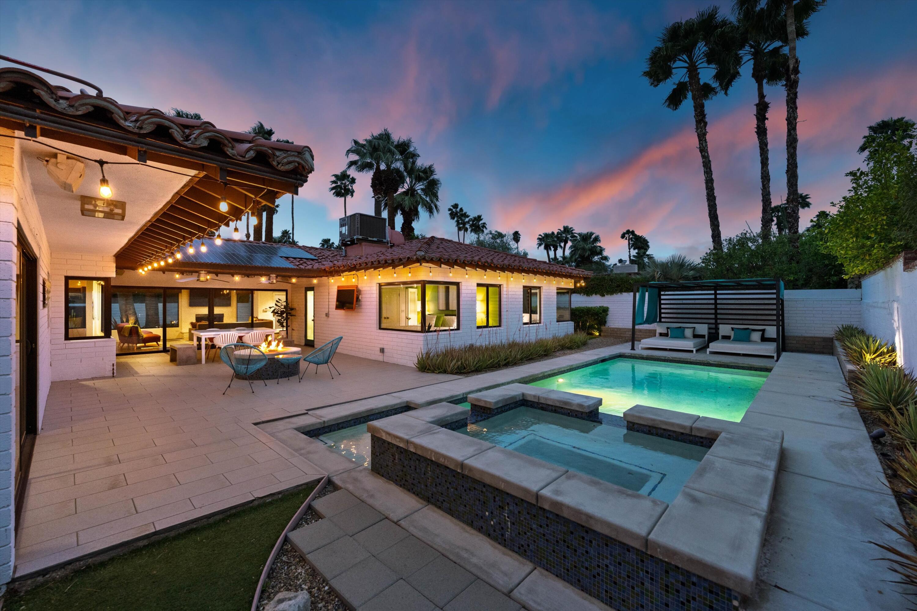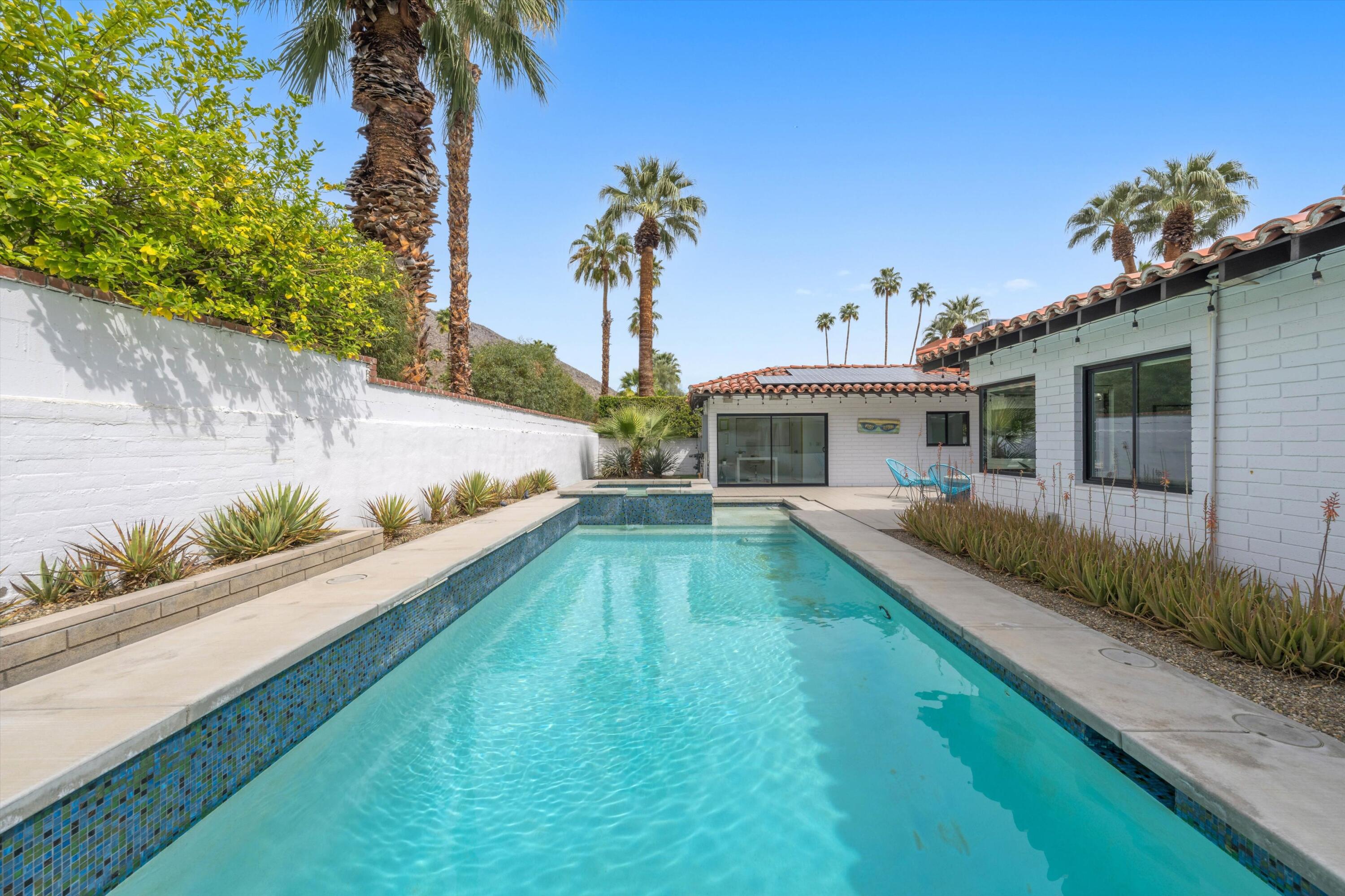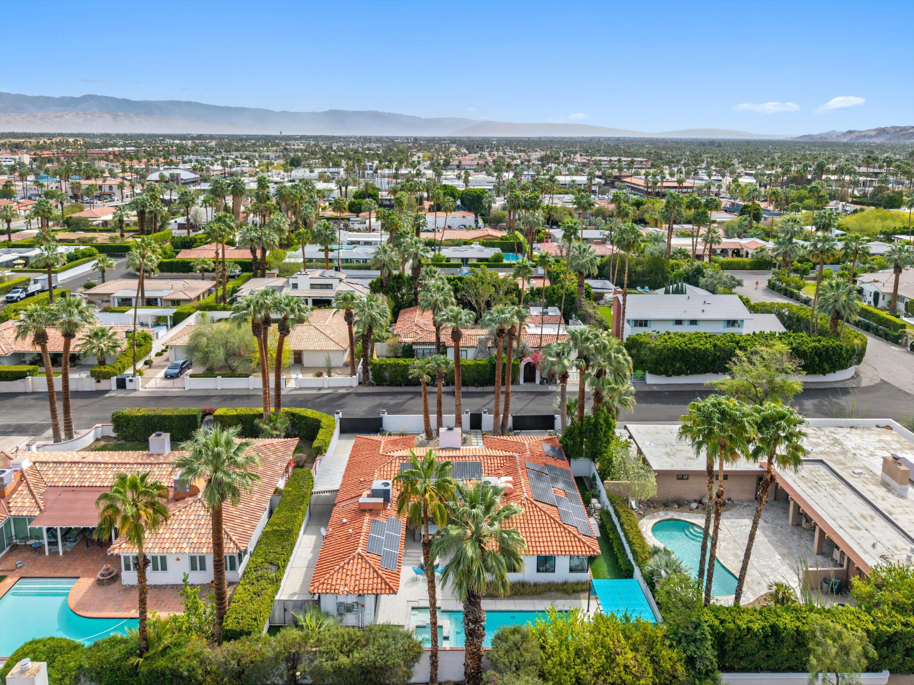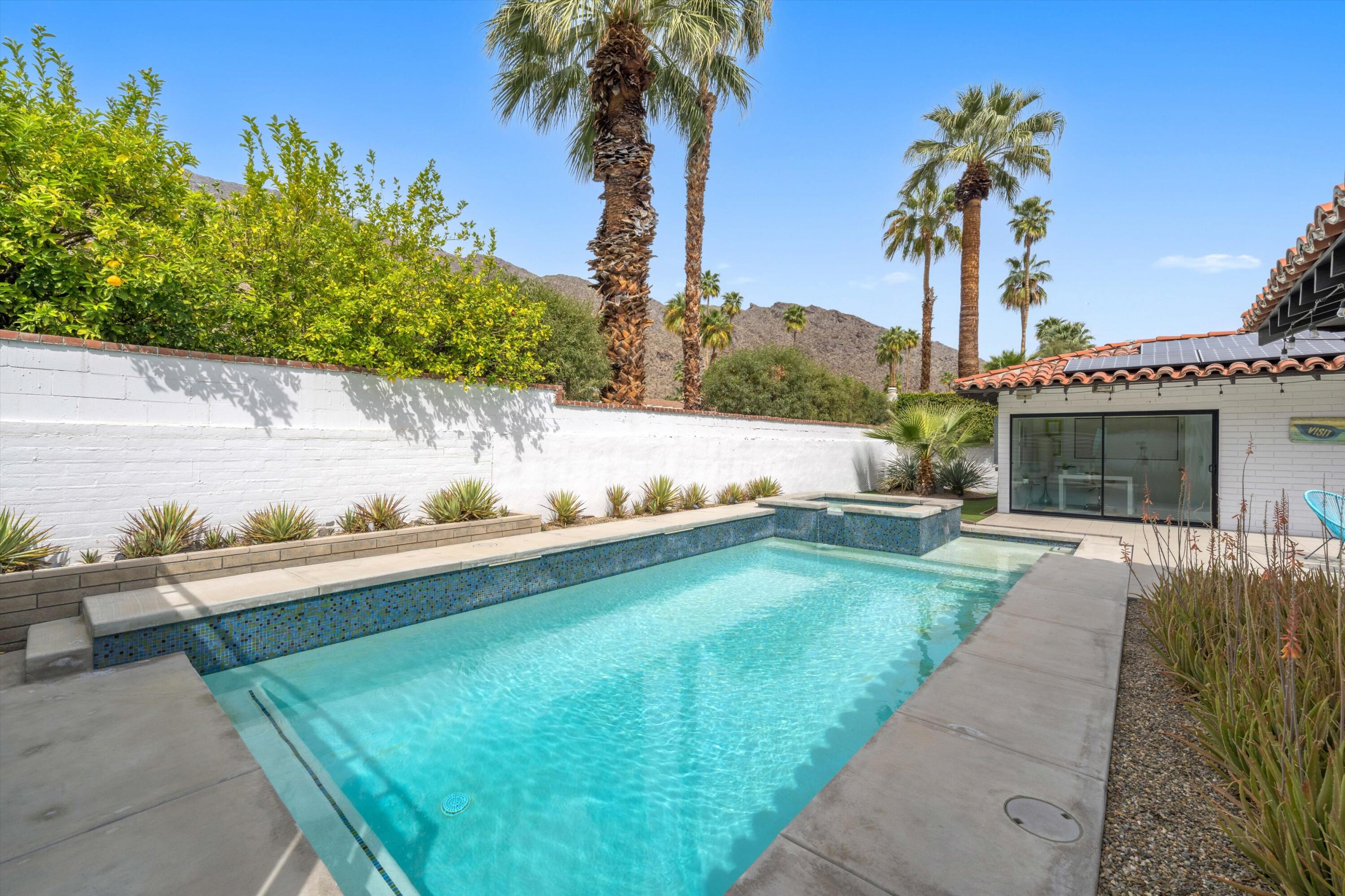 Nestled in the highly coveted Historic Tennis Club area, just a short walk from downtown Palm Springs, this private gated estate offers an exceptional living experience. Set on a gorgeous lot with a motorized gate and circular driveway, the home boasts complete privacy. Topping the list of upgrades is owned solar, resulting in little to no electric bills. Dual paned windows and sliders highlight the gorgeous views, and allow natural light to flood the interiors, creating a bright and airy feel. The beautifully renovated interior features a seamless flow between indoor and outdoor spaces, with ceramic tile wood floors throughout, which creates a cohesive modern look. The heart of the home is the chef's kitchen designed for entertaining, complete with a large island, ample storage, pull out shelves, and sleek quartz countertops. High end stainless steel appliances, including a Viking refrigerator and range, Marvel wine refrigerator, Miele dishwasher, built in microwave and chilling drawer, ensure both style and function. The spacious living room is anchored by a charming masonry block gas fireplace, perfect for relaxing or entertaining. Each of the four bedrooms is an ensuite, offering privacy and comfort. The spa like bathrooms feature floating vanities, three of which have double sinks, under lighting, quartz countertops, modern faucets, and tile walk in showers. Outside, the backyard is a true oasis featuring a vibrant saltwater mosaic pool and spa, breathtaking west mountain views, a fire pit, dining area, and two day beds perfect for lounging in the sun. Low maintenance desert landscaping completes this serene outdoor retreat. With the option to obtain a short term rental permit (the neighborhood is currently well under the 20 percent vacation rental density cap at time of listing), this property presents an outstanding opportunity as a primary residence, second home, investment property, or vacation rental. No HOA and you own the land. Don't miss your chanceInterested in this Listing?