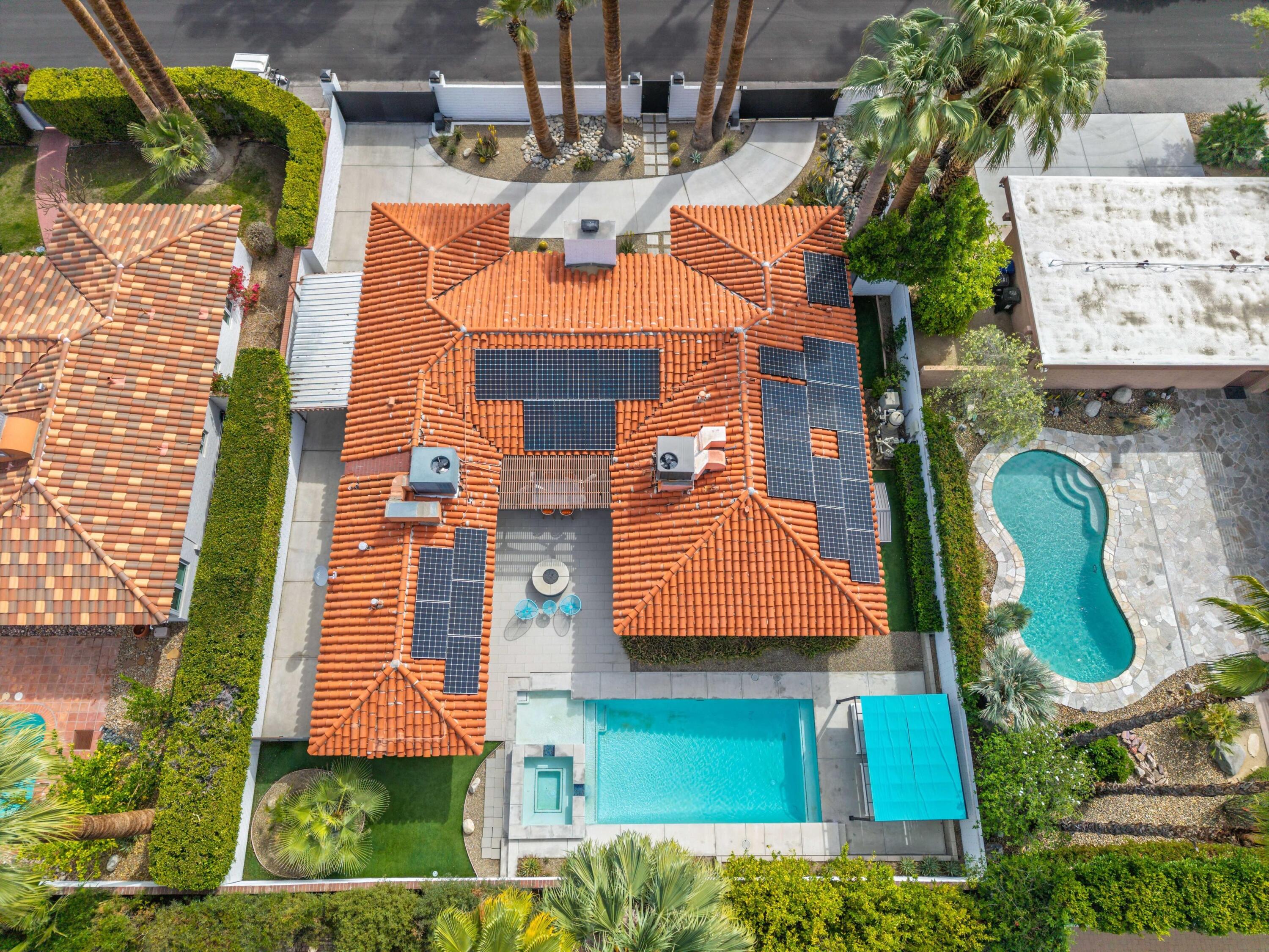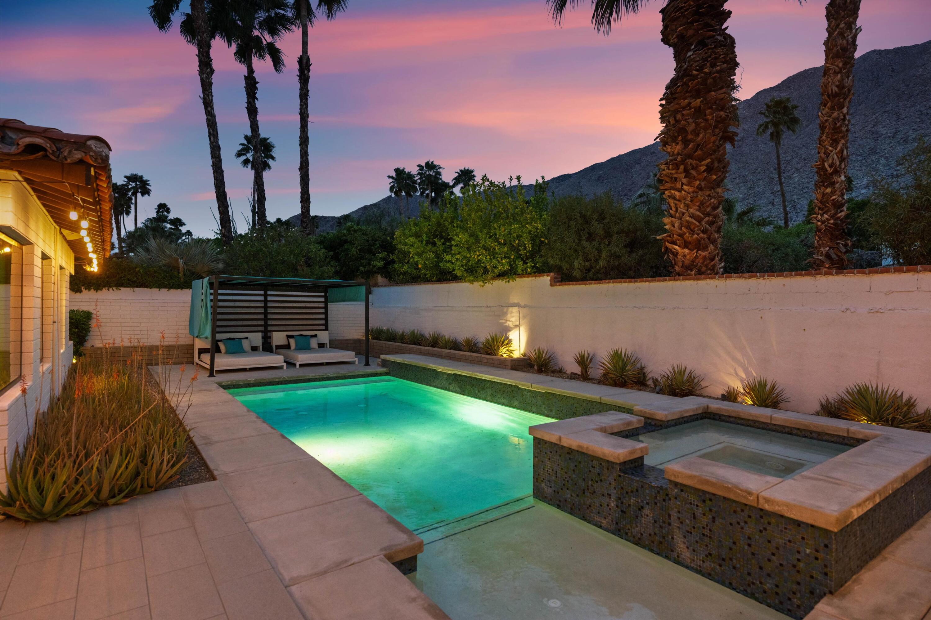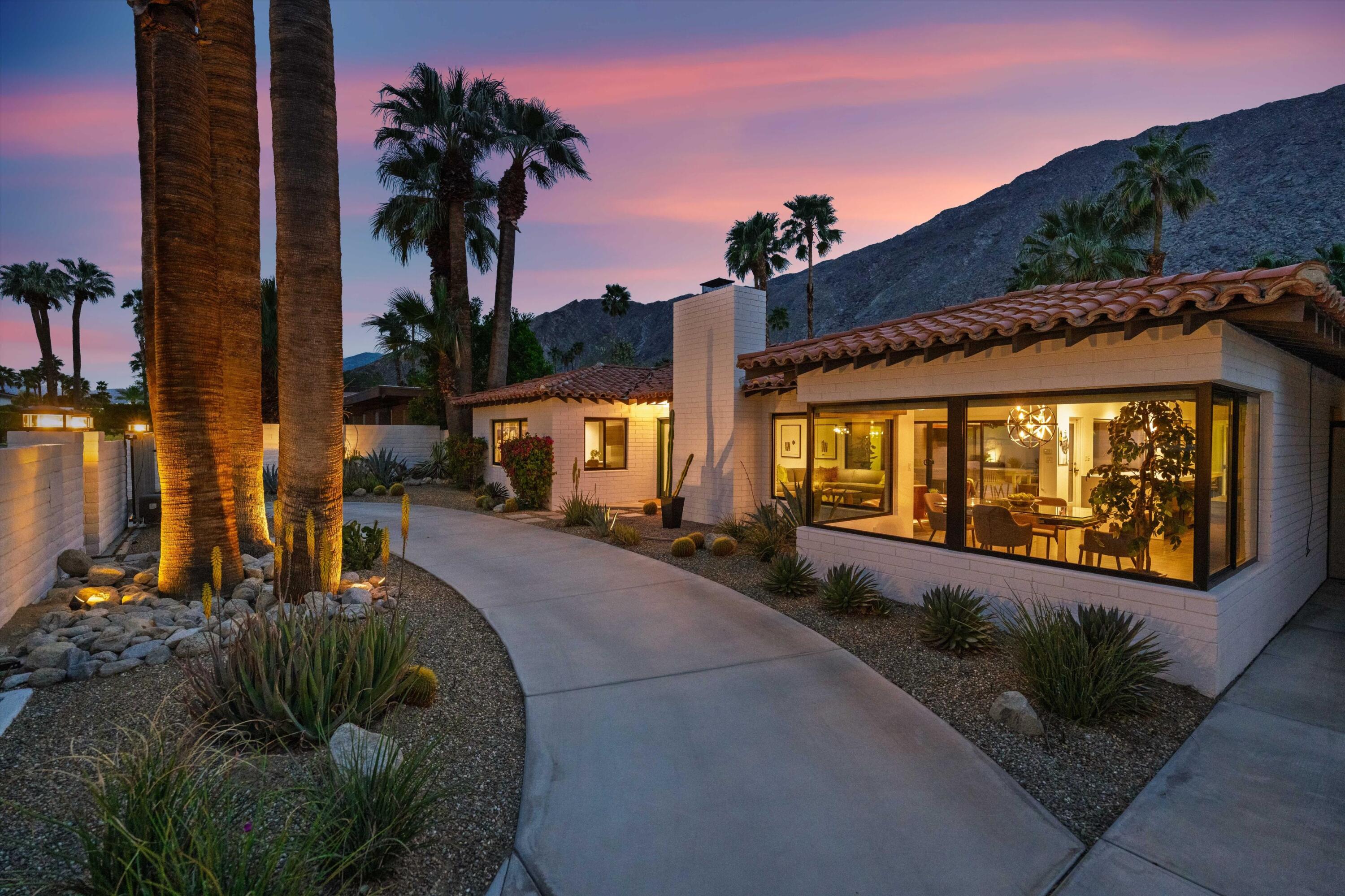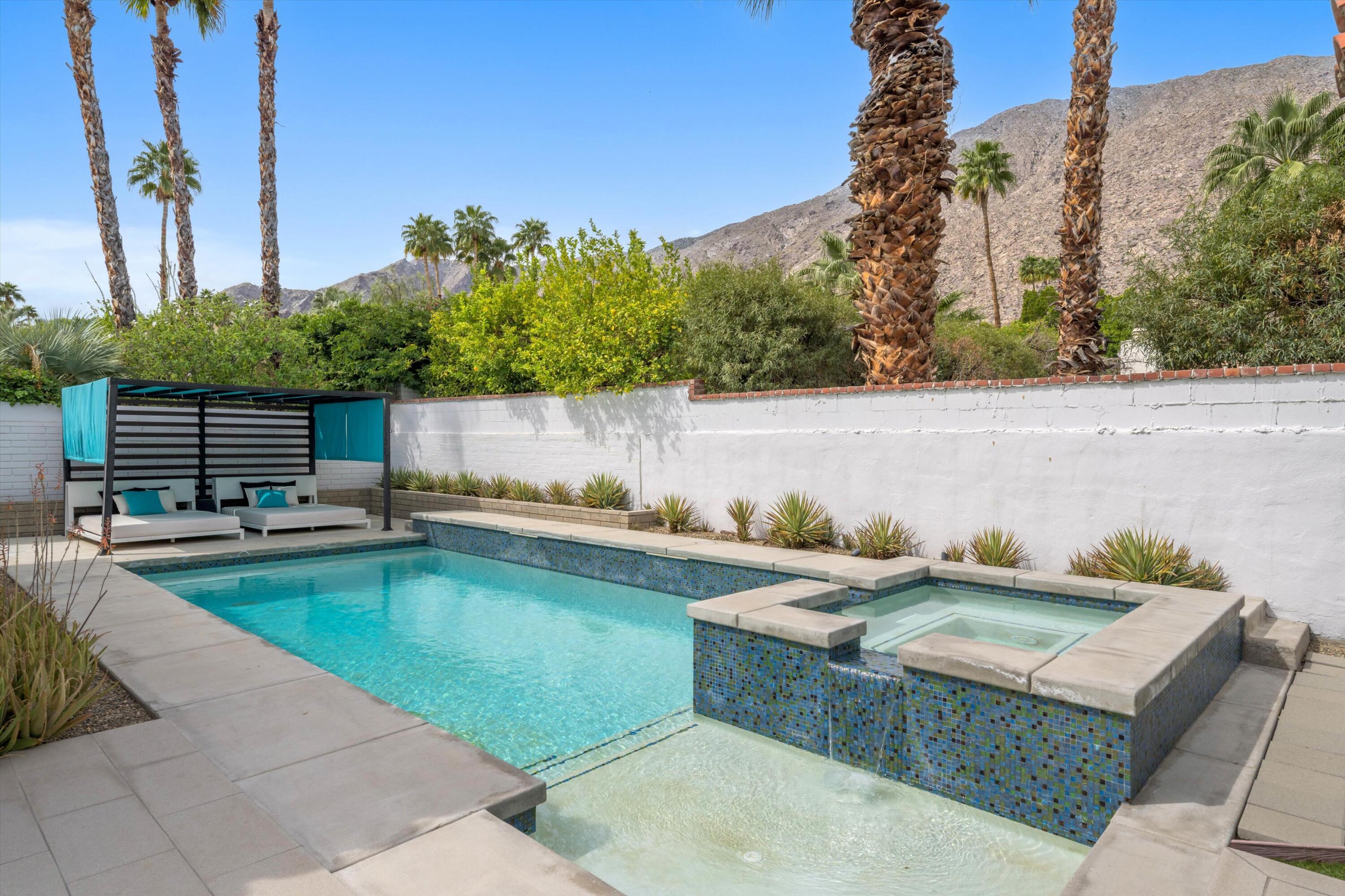 Nestled in the highly coveted Historic Tennis Club area, just a short walk from downtown Palm Springs, this private gated estate offers an exceptional living experience. Set on a gorgeous lot with a motorized gate and circular driveway, the home boasts complete privacy. Topping the list of upgrades is owned solar, resulting in little to no electric bills. Dual paned windows and sliders highlight the gorgeous views, and allow natural light to flood the interiors, creating a bright and airy feel. The beautifully renovated interior features a seamless flow between indoor and outdoor spaces, with ceramic tile wood floors throughout, which creates a cohesive modern look. The heart of the home is the chef's kitchen designed for entertaining, complete with a large island, ample storage, pull out shelves, and sleek quartz countertops. High end stainless steel appliances, including a Viking refrigerator and range, Marvel wine refrigerator, Miele dishwasher, built in microwave and chilling drawer, ensure both style and function. The spacious living room is anchored by a charming masonry block gas fireplace, perfect for relaxing or entertaining. Each of the four bedrooms is an ensuite, offering privacy and comfort. The spa like bathrooms feature floating vanities, three of which have double sinks, under lighting, quartz countertops, modern faucets, and tile walk in showers. Outside, the backyard is a true oasis featuring a vibrant saltwater mosaic pool and spa, breathtaking west mountain views, a fire pit, dining area, and two day beds perfect for lounging in the sun. Low maintenance desert landscaping completes this serene outdoor retreat. With the option to obtain a short term rental permit (the neighborhood is currently well under the 20 percent vacation rental density cap at time of listing), this property presents an outstanding opportunity as a primary residence, second home, investment property, or vacation rental. No HOA and you own the land. Don't miss your chanceInterested in this Listing?