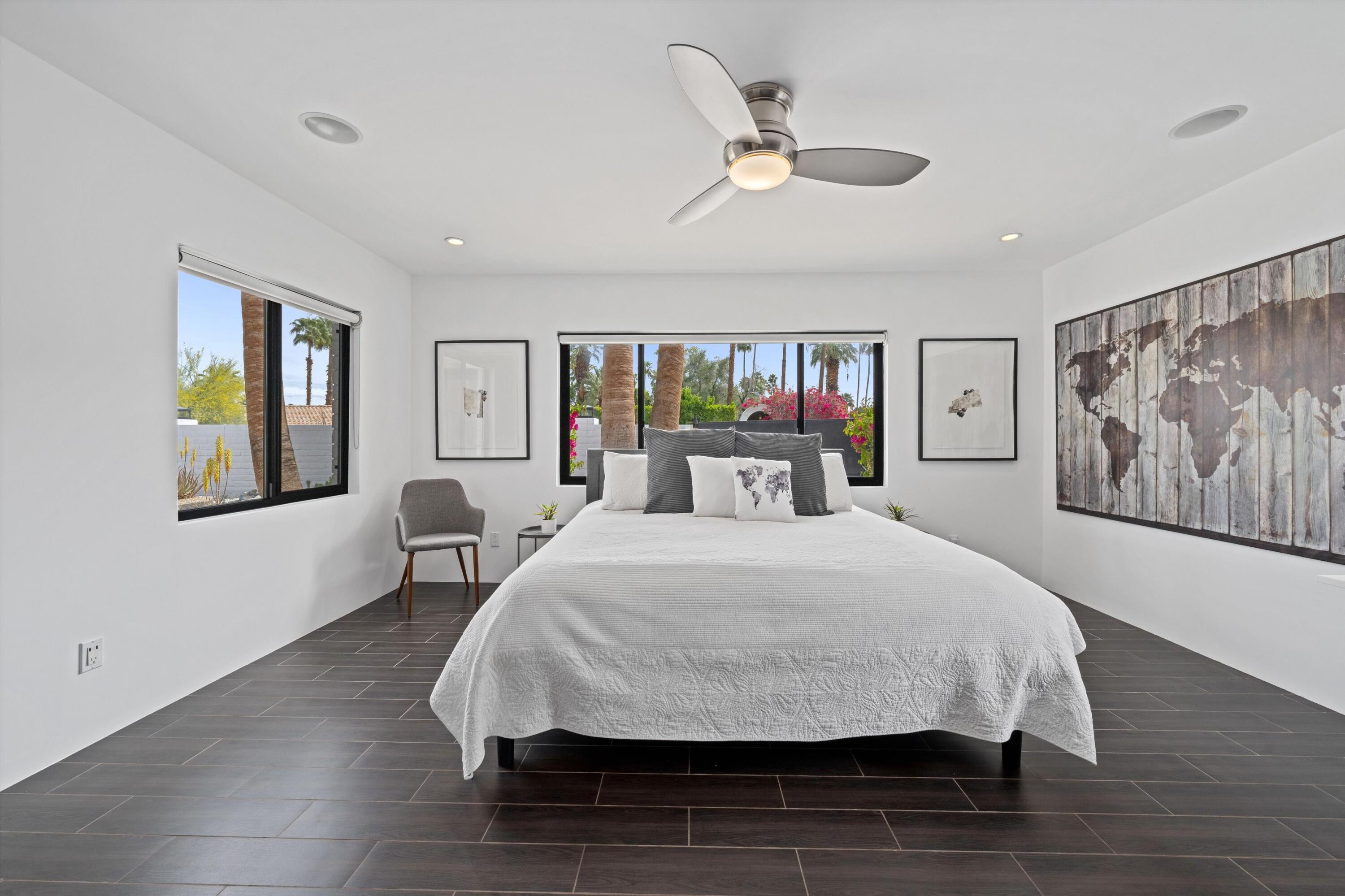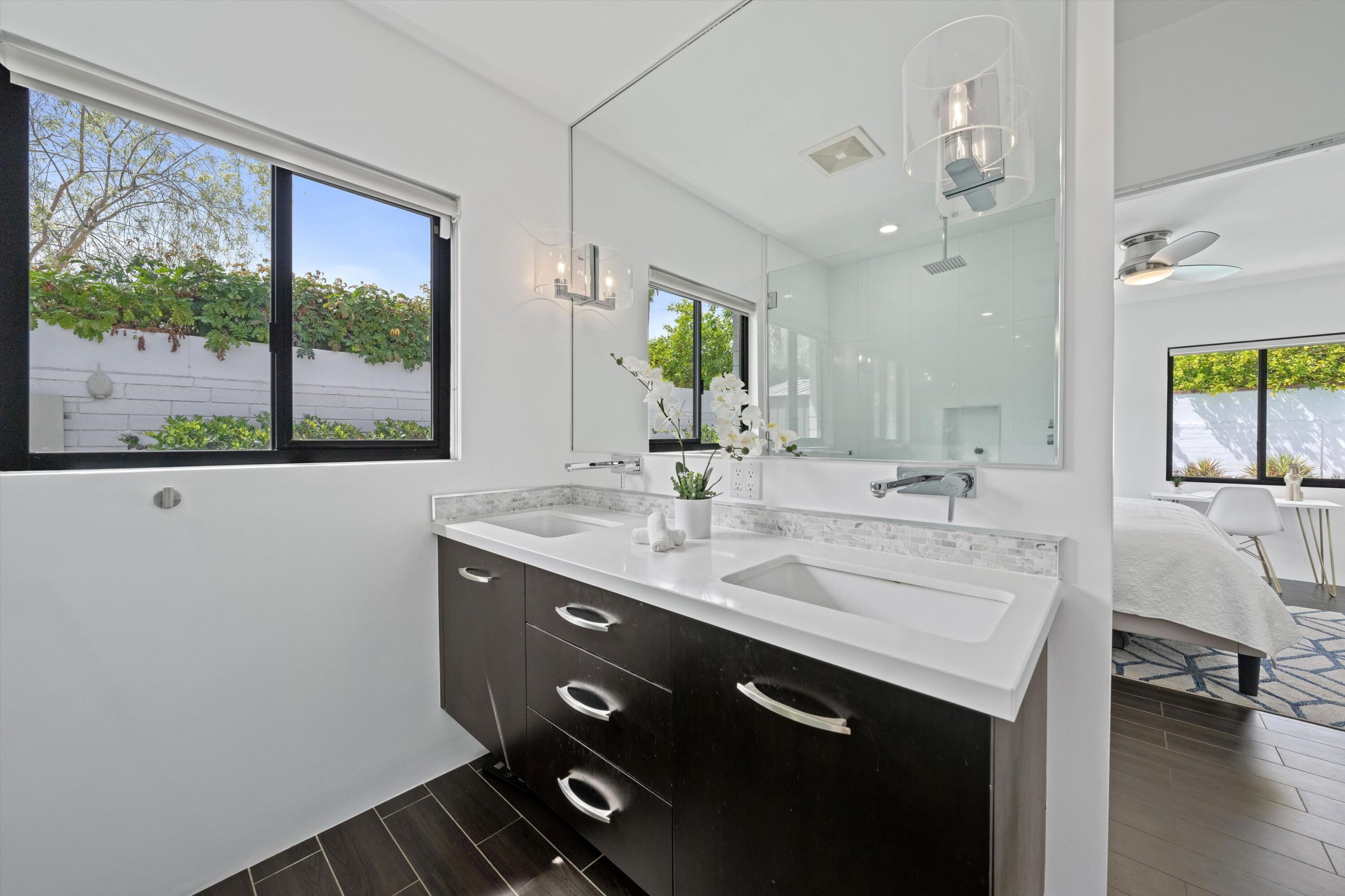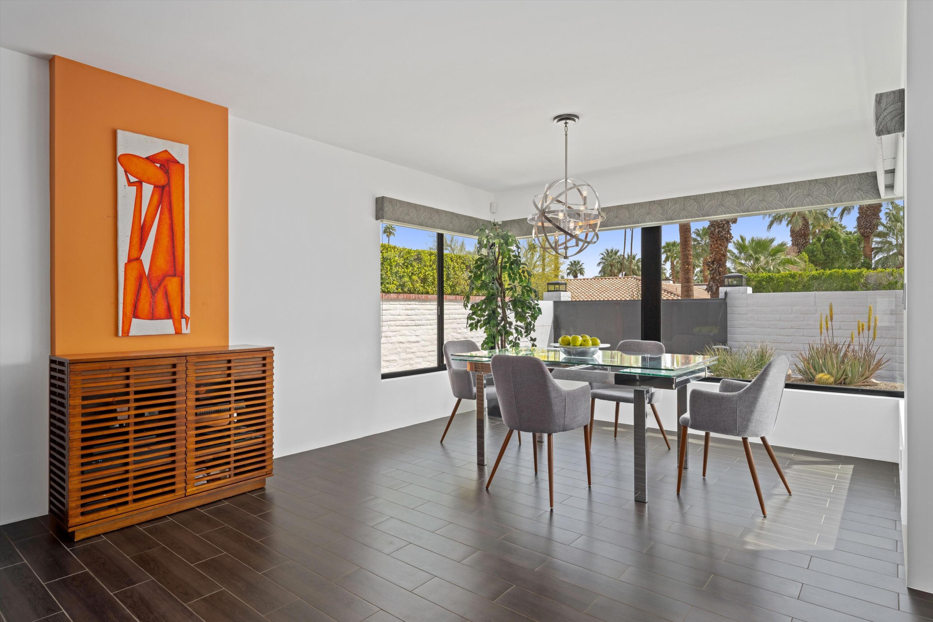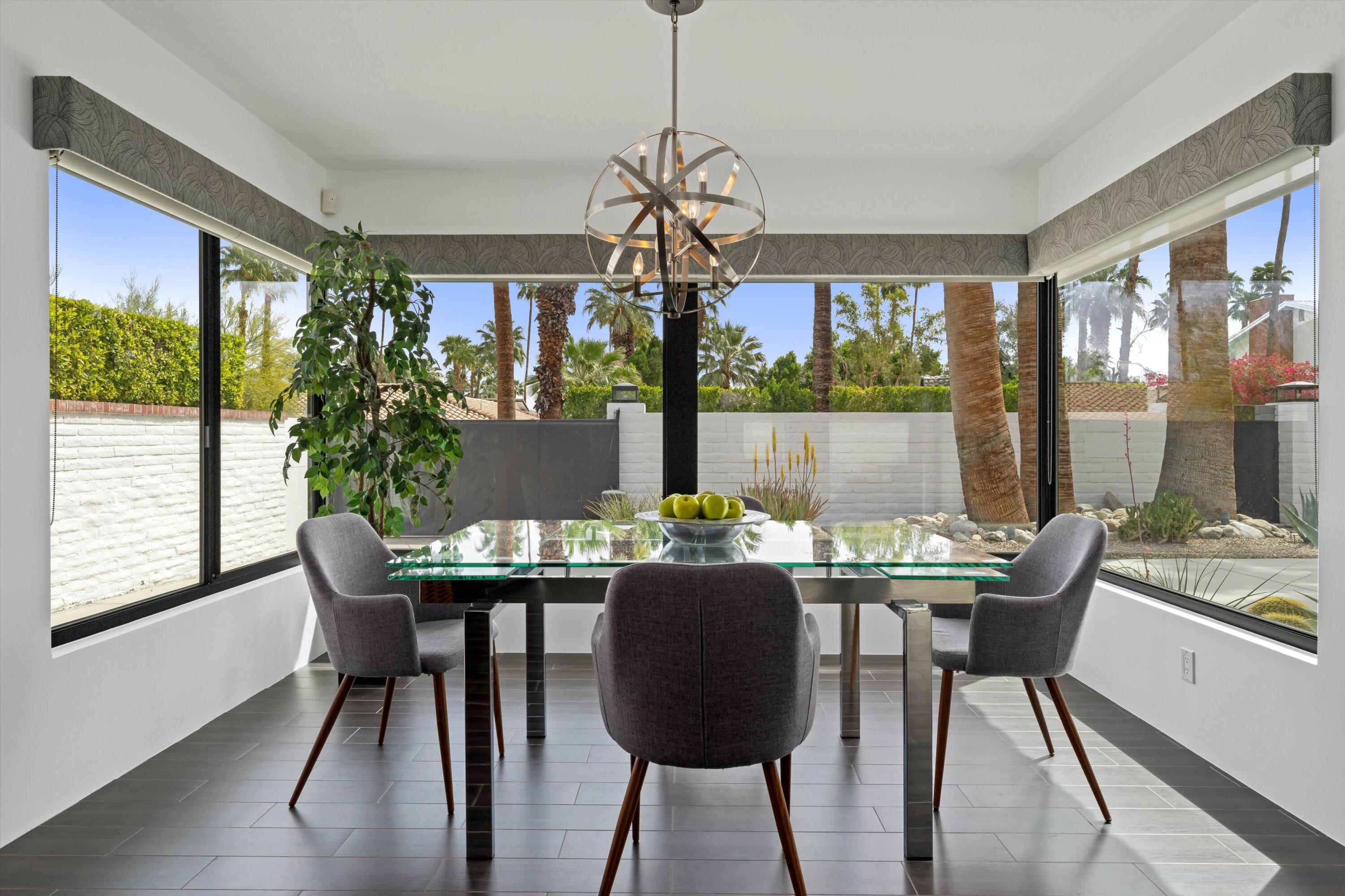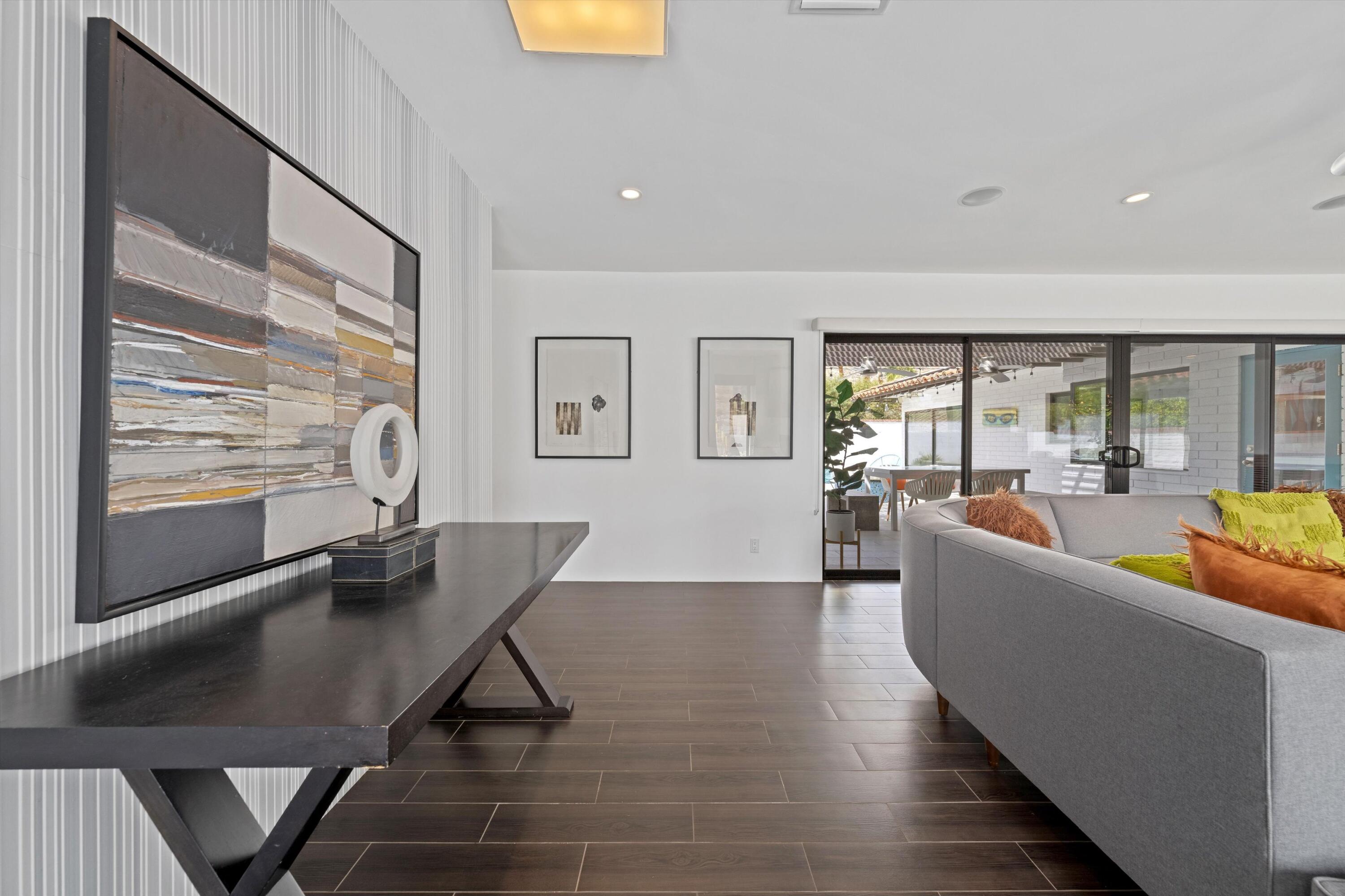 Nestled in the highly coveted Historic Tennis Club area, just a short walk from downtown Palm Springs, this private gated estate offers an exceptional living experience. Set on a gorgeous lot with a motorized gate and circular driveway, the home boasts complete privacy. Topping the list of upgrades is owned solar, resulting in little to no electric bills. Dual paned windows and sliders highlight the gorgeous views, and allow natural light to flood the interiors, creating a bright and airy feel. The beautifully renovated interior features a seamless flow between indoor and outdoor spaces, with ceramic tile wood floors throughout, which creates a cohesive modern look. The heart of the home is the chef's kitchen designed for entertaining, complete with a large island, ample storage, pull out shelves, and sleek quartz countertops. High end stainless steel appliances, including a Viking refrigerator and range, Marvel wine refrigerator, Miele dishwasher, built in microwave and chilling drawer, ensure both style and function. The spacious living room is anchored by a charming masonry block gas fireplace, perfect for relaxing or entertaining. Each of the four bedrooms is an ensuite, offering privacy and comfort. The spa like bathrooms feature floating vanities, three of which have double sinks, under lighting, quartz countertops, modern faucets, and tile walk in showers. Outside, the backyard is a true oasis featuring a vibrant saltwater mosaic pool and spa, breathtaking west mountain views, a fire pit, dining area, and two day beds perfect for lounging in the sun. Low maintenance desert landscaping completes this serene outdoor retreat. With the option to obtain a short term rental permit (the neighborhood is currently well under the 20 percent vacation rental density cap at time of listing), this property presents an outstanding opportunity as a primary residence, second home, investment property, or vacation rental. No HOA and you own the land. Don't miss your chanceInterested in this Listing?