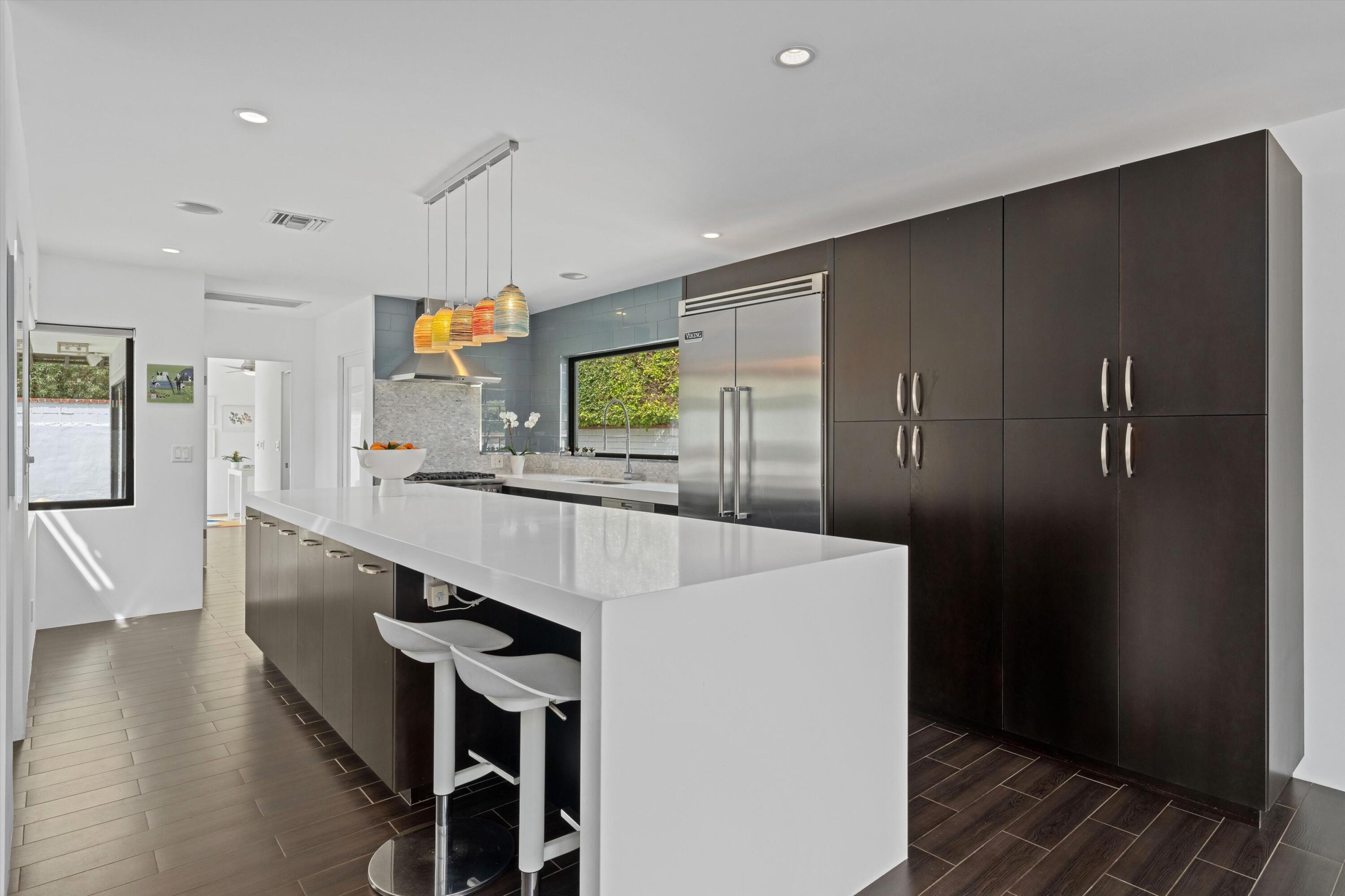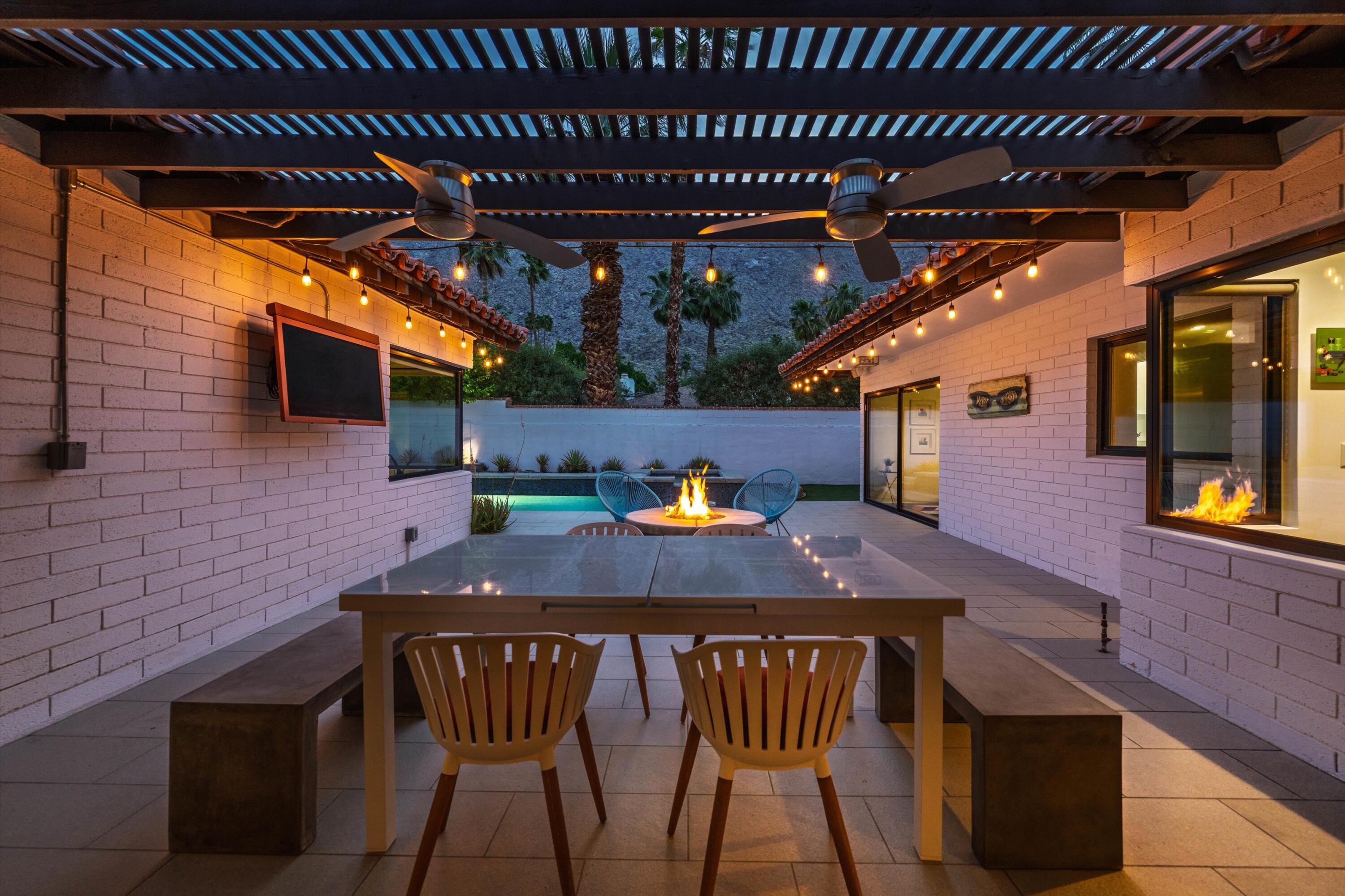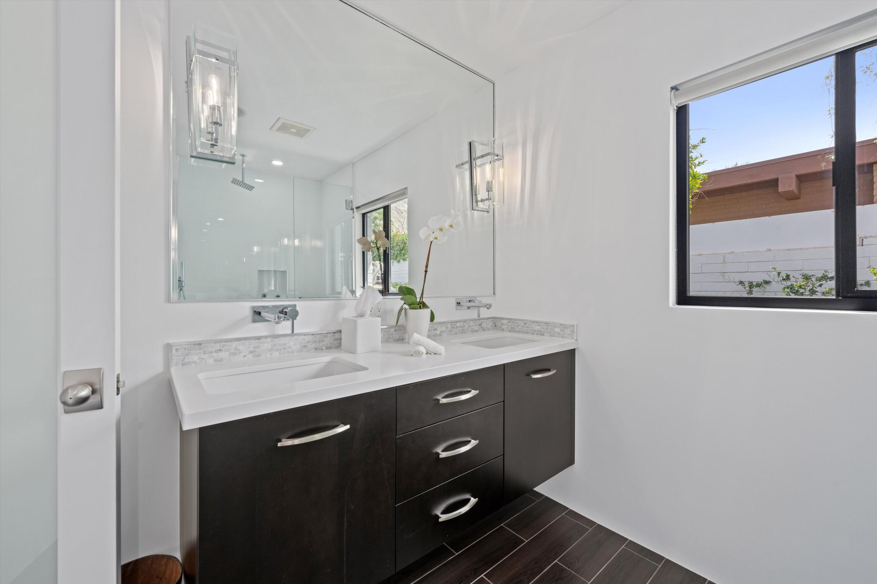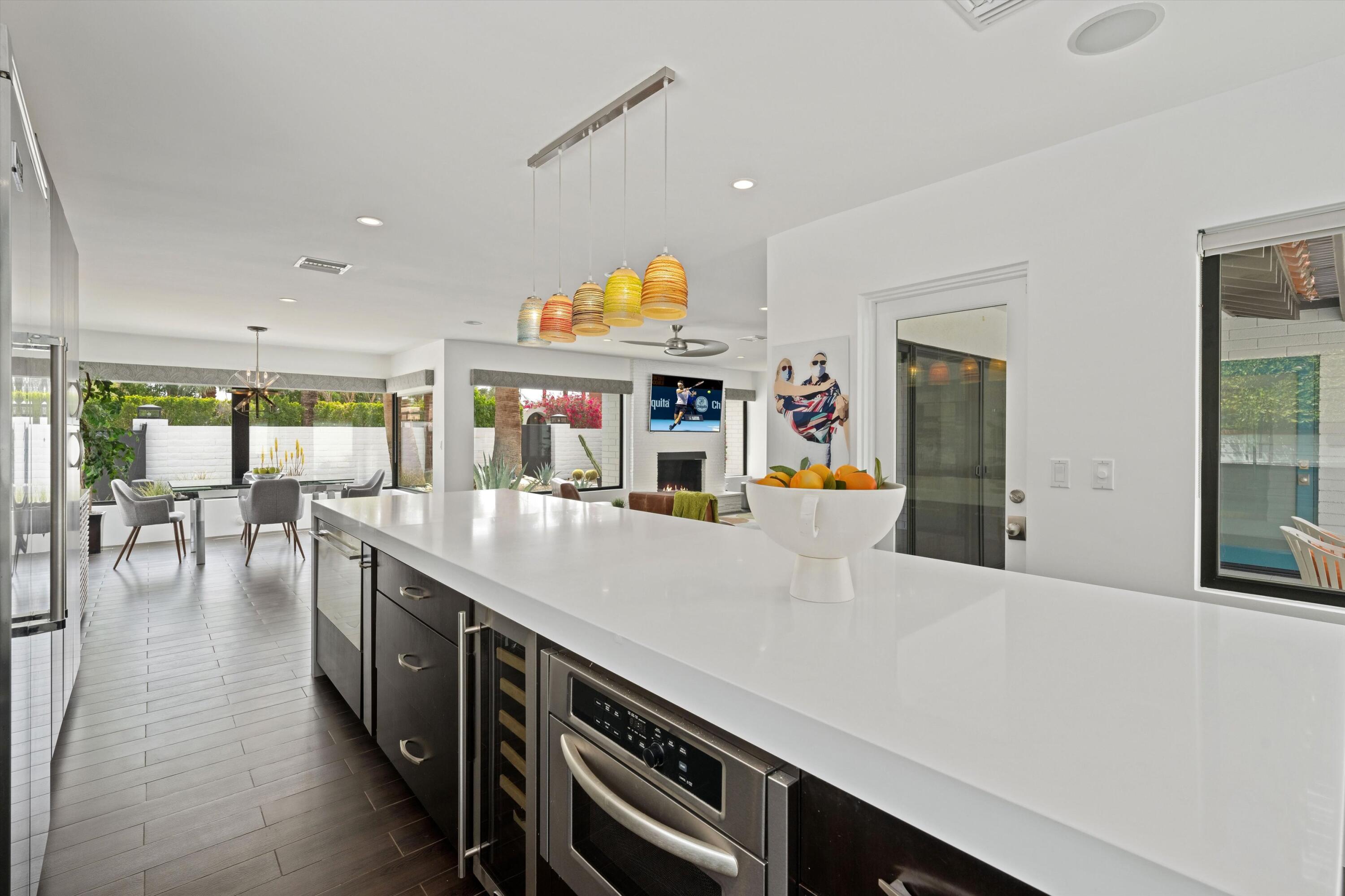 Nestled in the highly coveted Historic Tennis Club area, just a short walk from downtown Palm Springs, this private gated estate offers an exceptional living experience. Set on a gorgeous lot with a motorized gate and circular driveway, the home boasts complete privacy. Topping the list of upgrades is owned solar, resulting in little to no electric bills. Dual paned windows and sliders highlight the gorgeous views, and allow natural light to flood the interiors, creating a bright and airy feel. The beautifully renovated interior features a seamless flow between indoor and outdoor spaces, with ceramic tile wood floors throughout, which creates a cohesive modern look. The heart of the home is the chef's kitchen designed for entertaining, complete with a large island, ample storage, pull out shelves, and sleek quartz countertops. High end stainless steel appliances, including a Viking refrigerator and range, Marvel wine refrigerator, Miele dishwasher, built in microwave and chilling drawer, ensure both style and function. The spacious living room is anchored by a charming masonry block gas fireplace, perfect for relaxing or entertaining. Each of the four bedrooms is an ensuite, offering privacy and comfort. The spa like bathrooms feature floating vanities, three of which have double sinks, under lighting, quartz countertops, modern faucets, and tile walk in showers. Outside, the backyard is a true oasis featuring a vibrant saltwater mosaic pool and spa, breathtaking west mountain views, a fire pit, dining area, and two day beds perfect for lounging in the sun. Low maintenance desert landscaping completes this serene outdoor retreat. With the option to obtain a short term rental permit (the neighborhood is currently well under the 20 percent vacation rental density cap at time of listing), this property presents an outstanding opportunity as a primary residence, second home, investment property, or vacation rental. No HOA and you own the land. Don't miss your chanceInterested in this Listing?