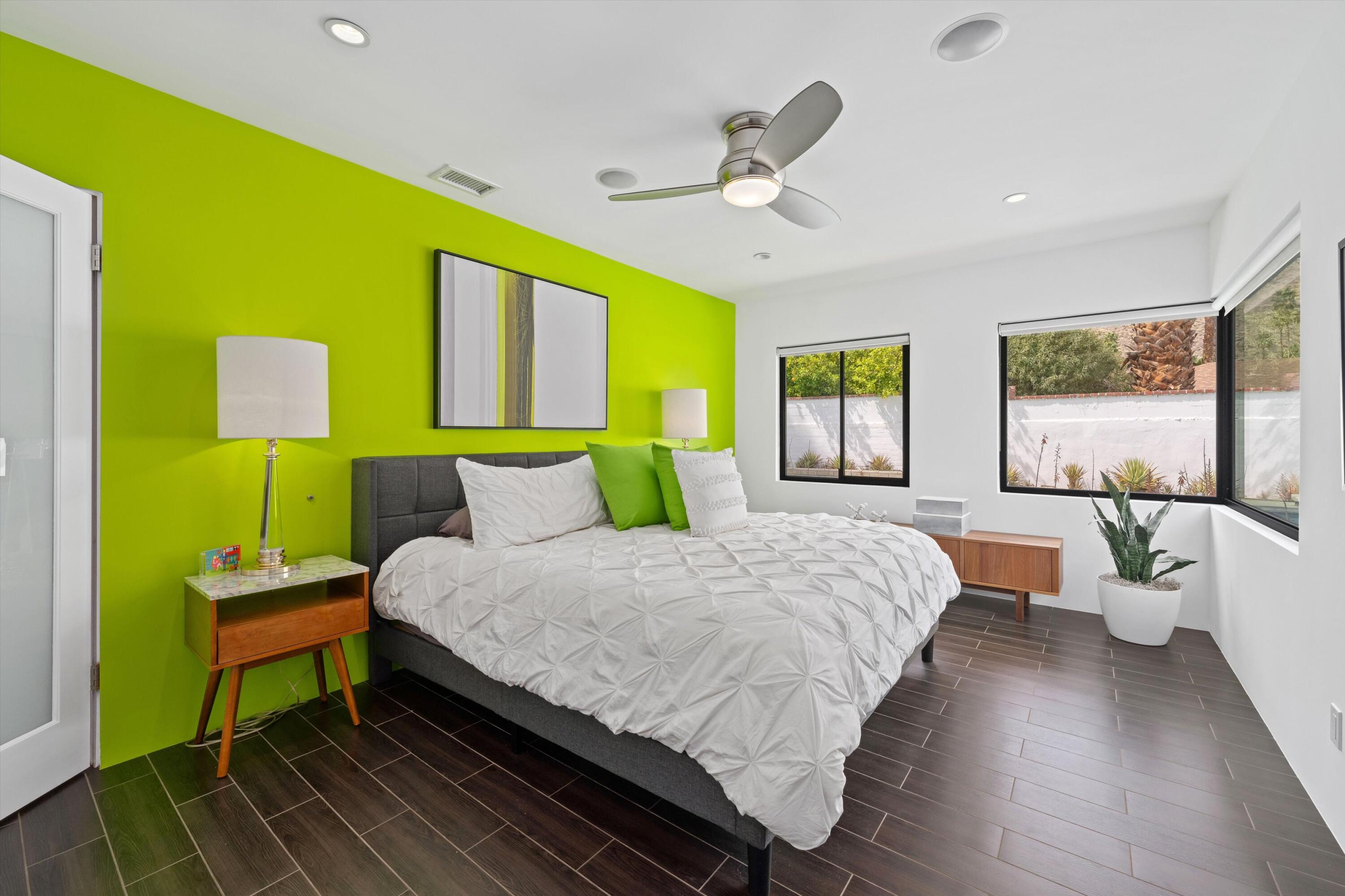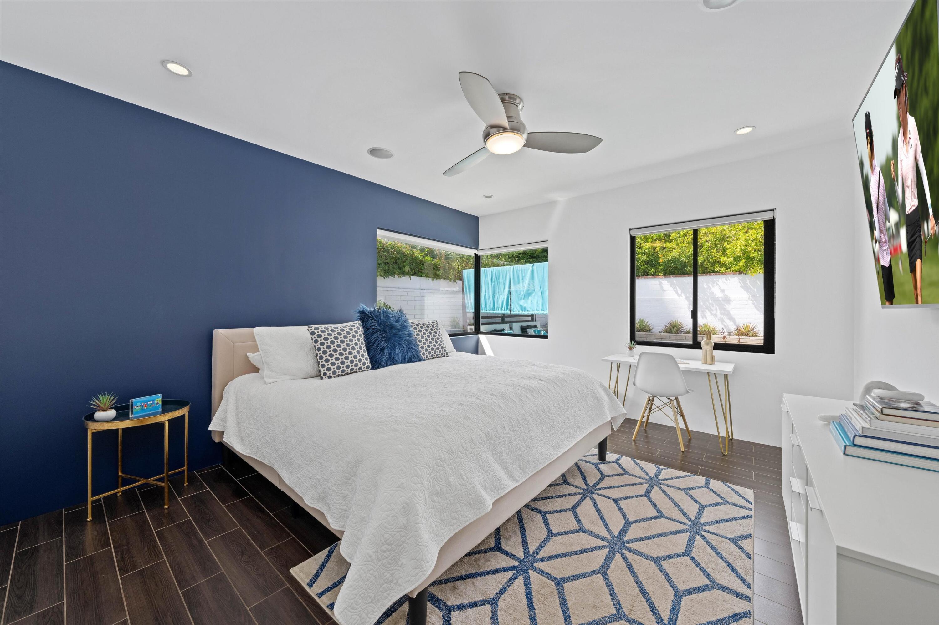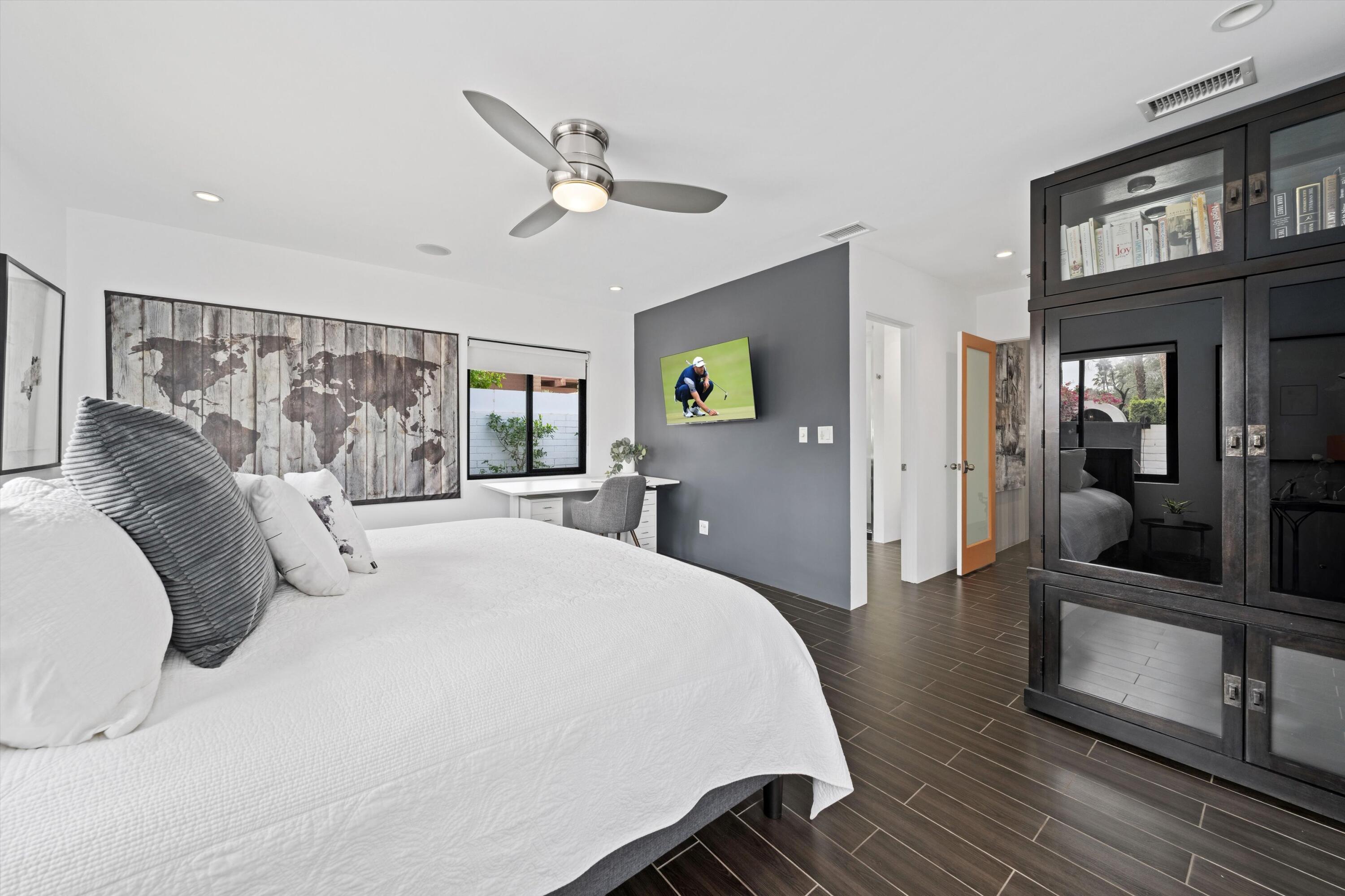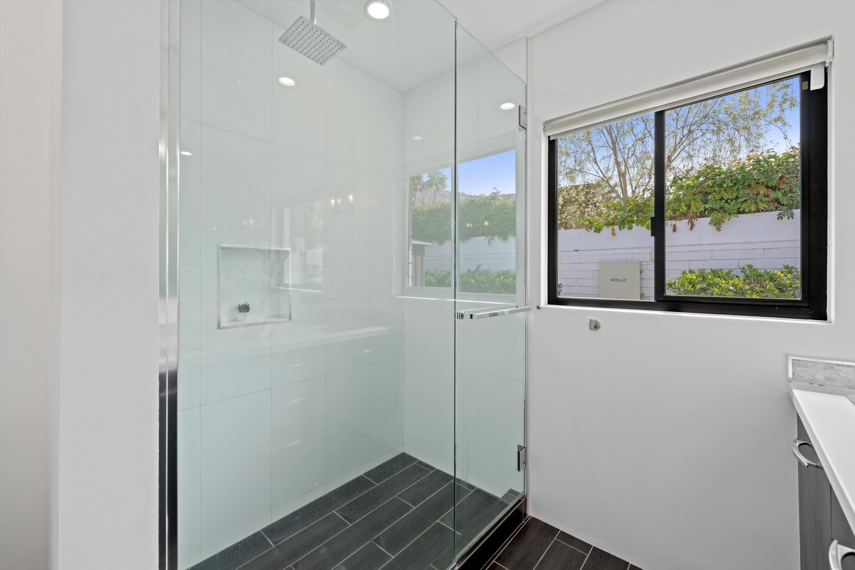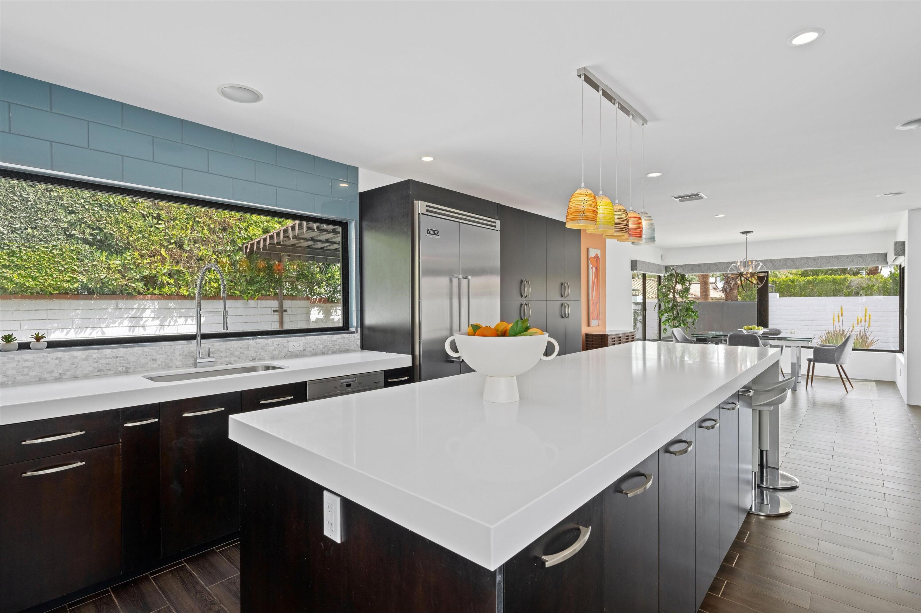 Nestled in the highly coveted Historic Tennis Club area, just a short walk from downtown Palm Springs, this private gated estate offers an exceptional living experience. Set on a gorgeous lot with a motorized gate and circular driveway, the home boasts complete privacy. Topping the list of upgrades is owned solar, resulting in little to no electric bills. Dual paned windows and sliders highlight the gorgeous views, and allow natural light to flood the interiors, creating a bright and airy feel. The beautifully renovated interior features a seamless flow between indoor and outdoor spaces, with ceramic tile wood floors throughout, which creates a cohesive modern look. The heart of the home is the chef's kitchen designed for entertaining, complete with a large island, ample storage, pull out shelves, and sleek quartz countertops. High end stainless steel appliances, including a Viking refrigerator and range, Marvel wine refrigerator, Miele dishwasher, built in microwave and chilling drawer, ensure both style and function. The spacious living room is anchored by a charming masonry block gas fireplace, perfect for relaxing or entertaining. Each of the four bedrooms is an ensuite, offering privacy and comfort. The spa like bathrooms feature floating vanities, three of which have double sinks, under lighting, quartz countertops, modern faucets, and tile walk in showers. Outside, the backyard is a true oasis featuring a vibrant saltwater mosaic pool and spa, breathtaking west mountain views, a fire pit, dining area, and two day beds perfect for lounging in the sun. Low maintenance desert landscaping completes this serene outdoor retreat. With the option to obtain a short term rental permit (the neighborhood is currently well under the 20 percent vacation rental density cap at time of listing), this property presents an outstanding opportunity as a primary residence, second home, investment property, or vacation rental. No HOA and you own the land. Don't miss your chanceInterested in this Listing?