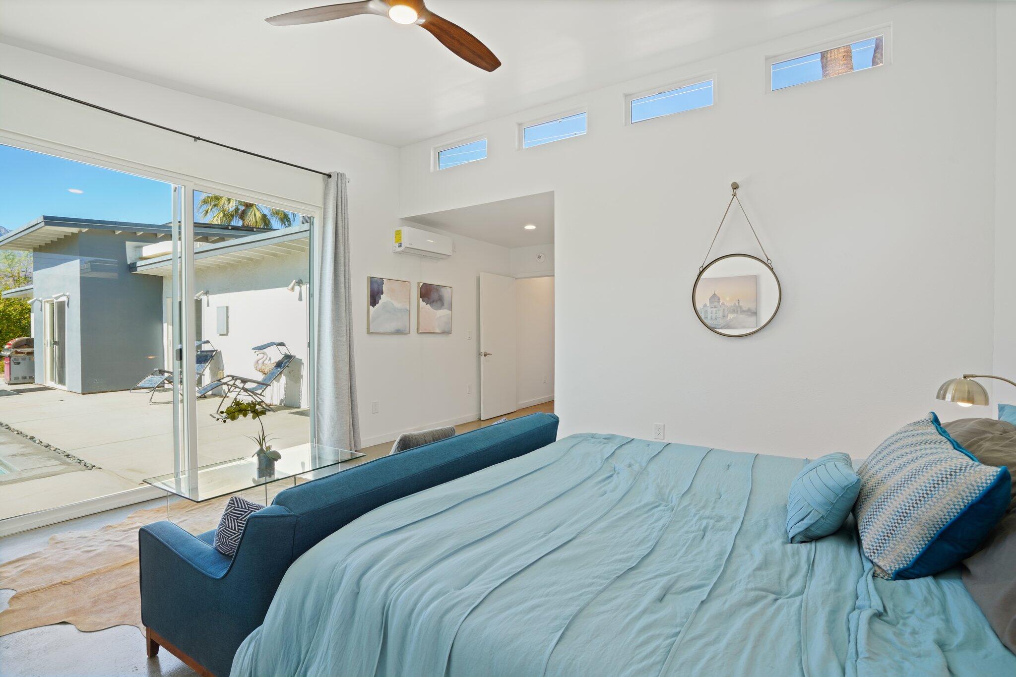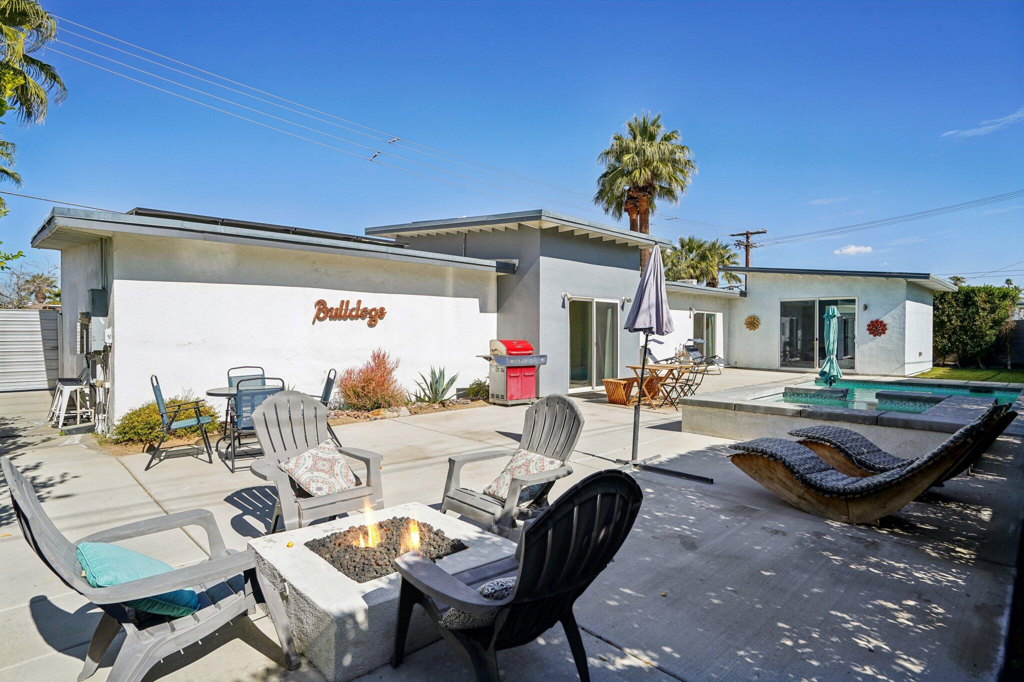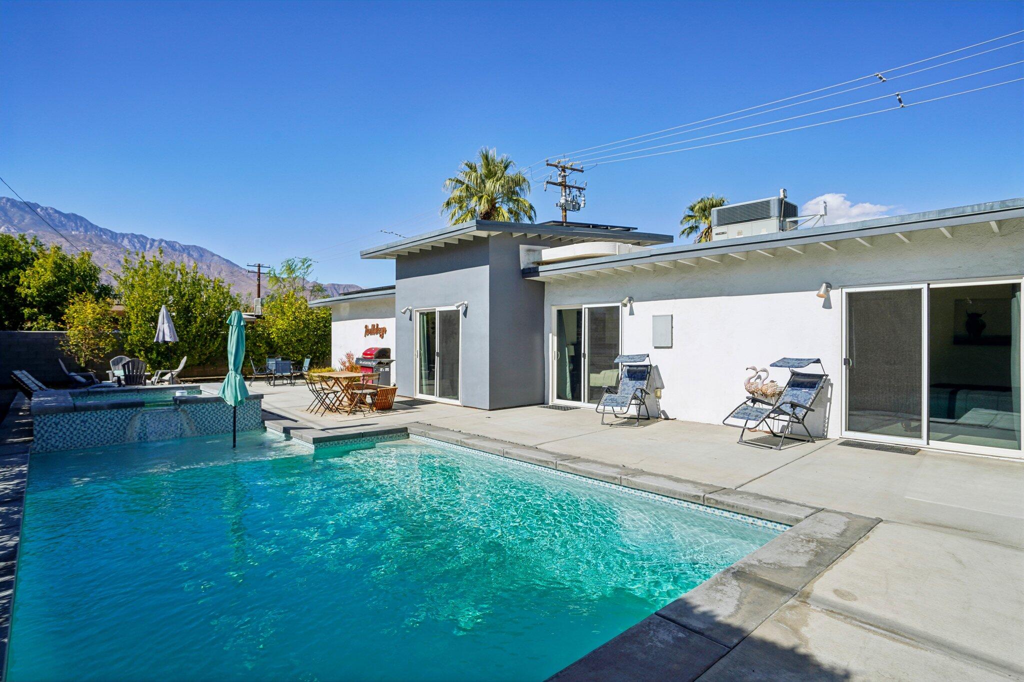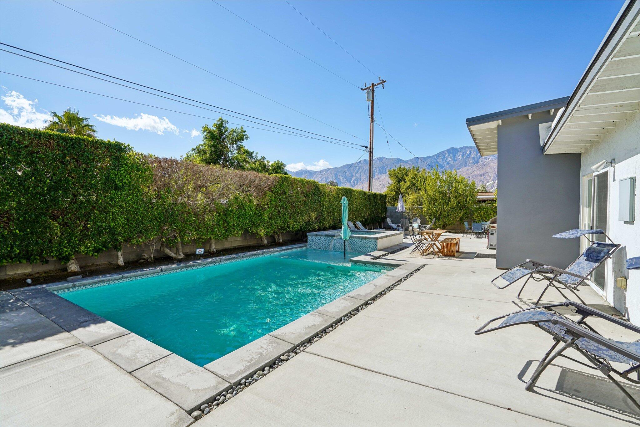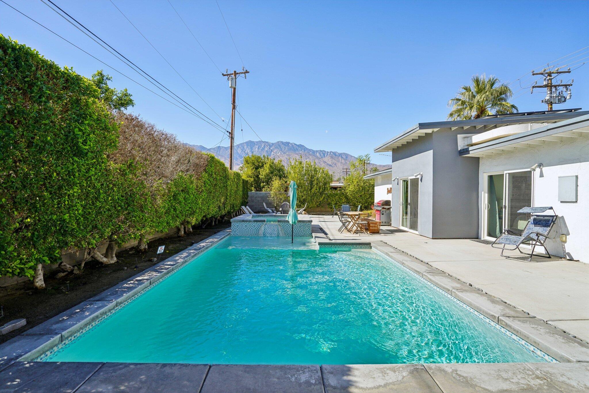 Discover this stunning AIRB&B READY 3-bedroom, 2-bathroom mid-century modern home, perfectly situated in the vibrant heart of Palm Springs. This property seamlessly blends classic Palm Springs charm with contemporary amenities, offering an exceptional living experience while also offering low utility bills ( you gotta love owned solar! ). The outdoor area features a recently updated PebbleTec pool and spa, complete with a relaxing Baja shelf, ideal for sunbathing and leisure. The expansive space is perfect for hosting gatherings, featuring a cozy firepit for cooler evenings. Encased by a substantial privacy hedge and adorned with fruit trees, the backyard offers a serene retreat. Inside, the gourmet chef's kitchen boasts quartz countertops, sleek white cabinetry, a stylish hexagon backsplash, and top-of-the-line stainless steel appliances. The luxurious primary suite features vaulted ceilings, clerestory windows, and sliding glass doors that provide direct access to the pool and showcase breathtaking mountain views. The en-suite bathroom includes a walk-in shower with chic tile, a seamless glass enclosure, a floating vanity, and a spacious walk-in closet. Both additional bedrooms are generously sized and offer direct access to the pool area, ensuring comfort and convenience for guests. Located in a neighborhood where less than 20% of properties are designated for short-term rentals, this home presents a prime opportunity for Airbnb hosting, a vacation getaway, or a primary residence. The combination of luxury amenities and favorable rental policies enhances its appeal in the Palm Springs market. Embrace the quintessential Palm Springs lifestyle with this exquisite property. Don't miss the chance to make this mid-century modern masterpiece your own!Interested in this Listing?
