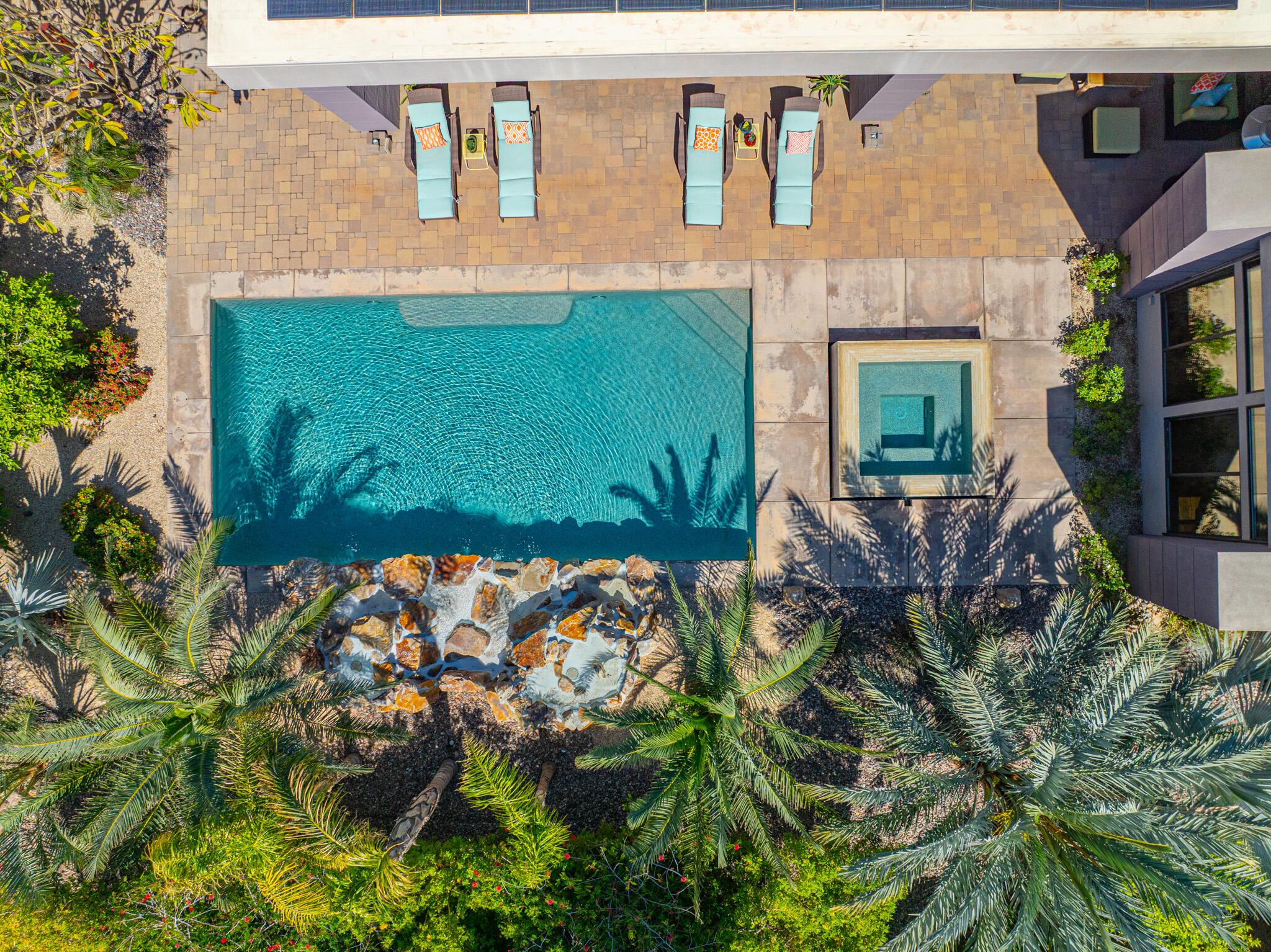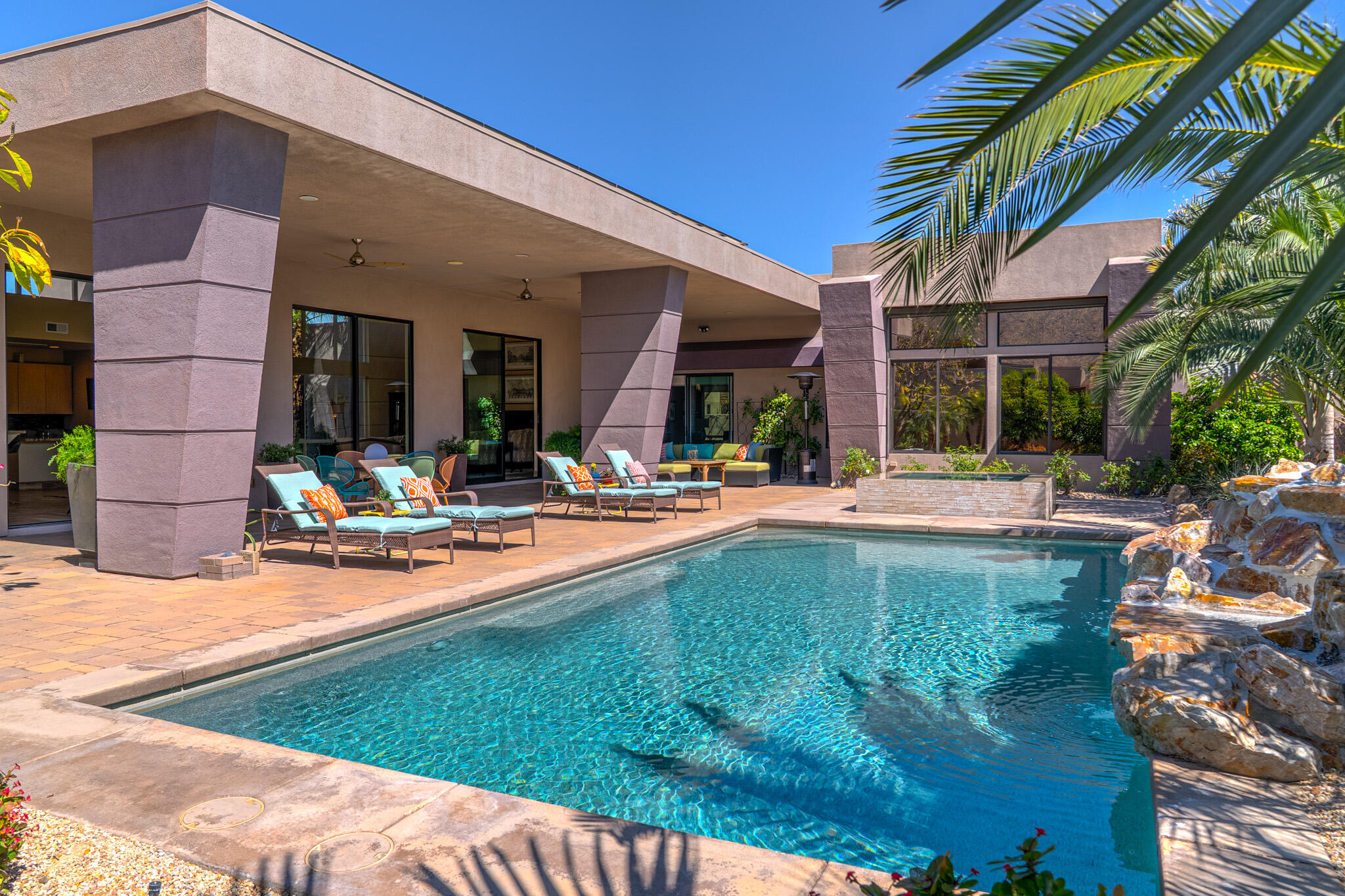 We invite you to experience a true showcase property with 3-bedrooms, 3.5-bathrooms on a coveted corner lot with south exposure at the Alta community. This 3,804 square feet traditional beauty is one of only six homes boasting a unique architectural layout, one benefit of which is the 40 x 12 covered patio in a lush garden surrounding and striking views of the mountain beyond. High ceilings and and its open format lend the space a feeling of greatness and with clerestory windows and a wall of tinted windows and sliding doors, fantastic natural light. Gather by the fireplace in the expansive living area, or in the well-equipped kitchen with custom cabinetry, an enlarged island with bar seating, Wolf appliances, a walk-in pantry, and a separate bar area. Entertaining, with speakers throughout, among the many features already mentioned, make this an entertainer's dream. The primary suite is as serene as its stunning views of the pool and rock feature, featuring tall ceilings, and an upgraded bath. The saltwater Pebble-Tec pool is adorned by a striking rock feature fountain, and additional amenities include a laundry room, dual garages with custom cabinets, and epoxy floors (3-Cars total). Forty-Two solar panels offer significant savings. You Own the Land! A sanctuary at the Alta awaits.Interested in this Listing?