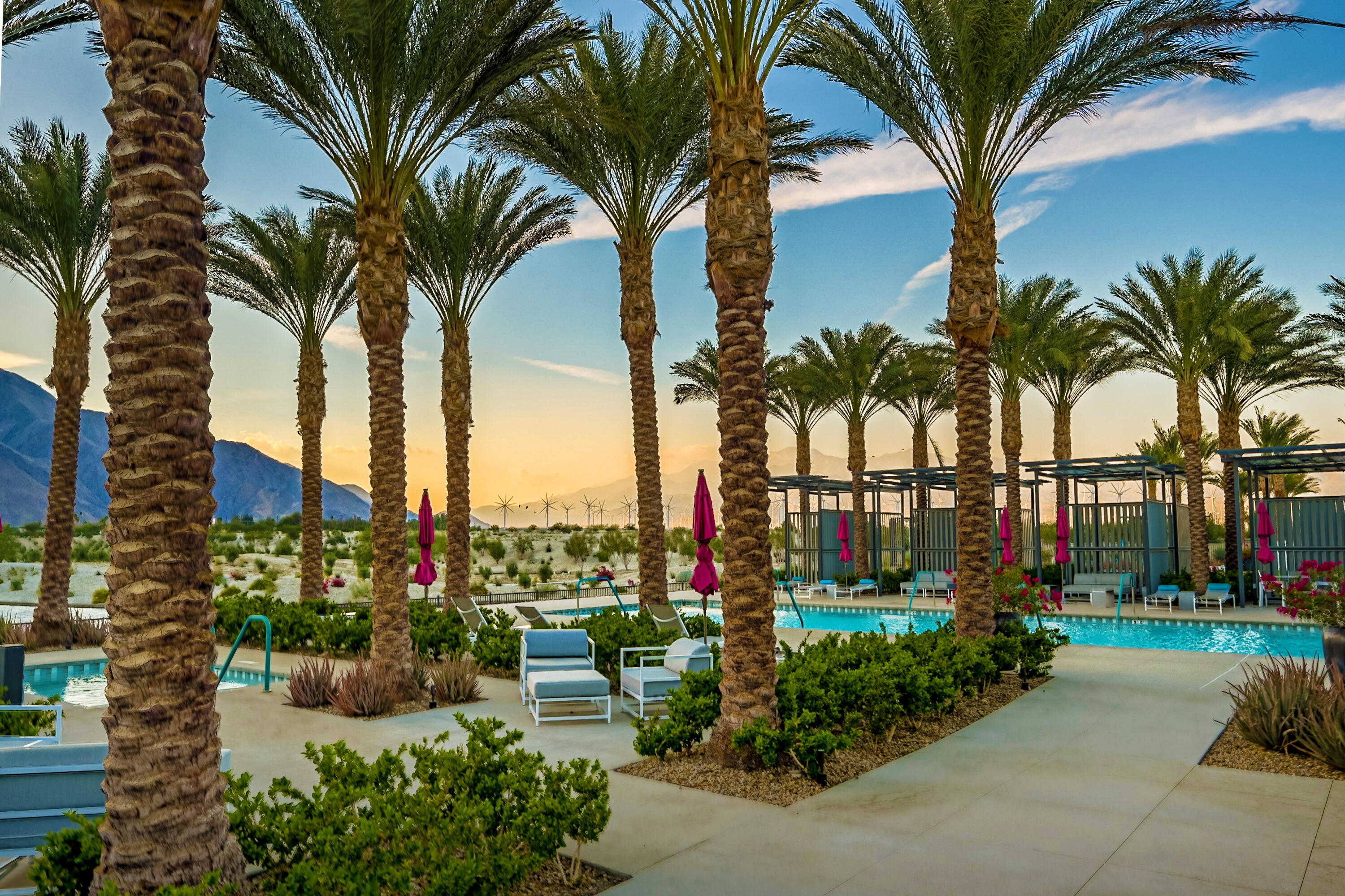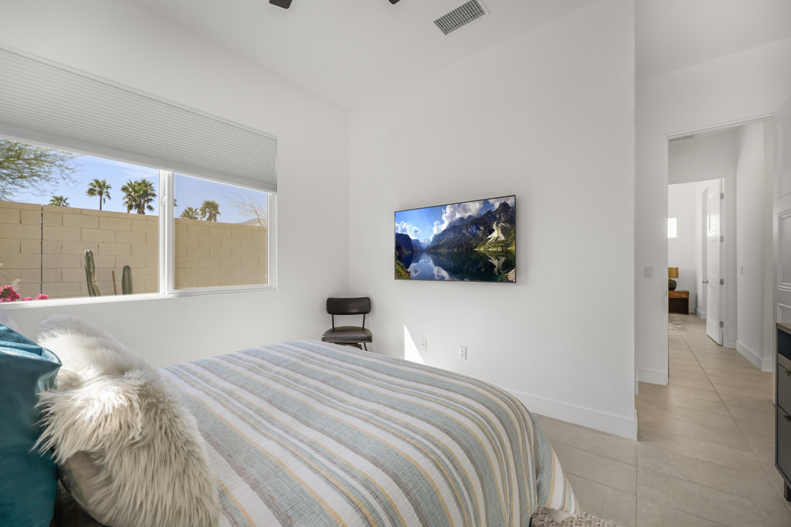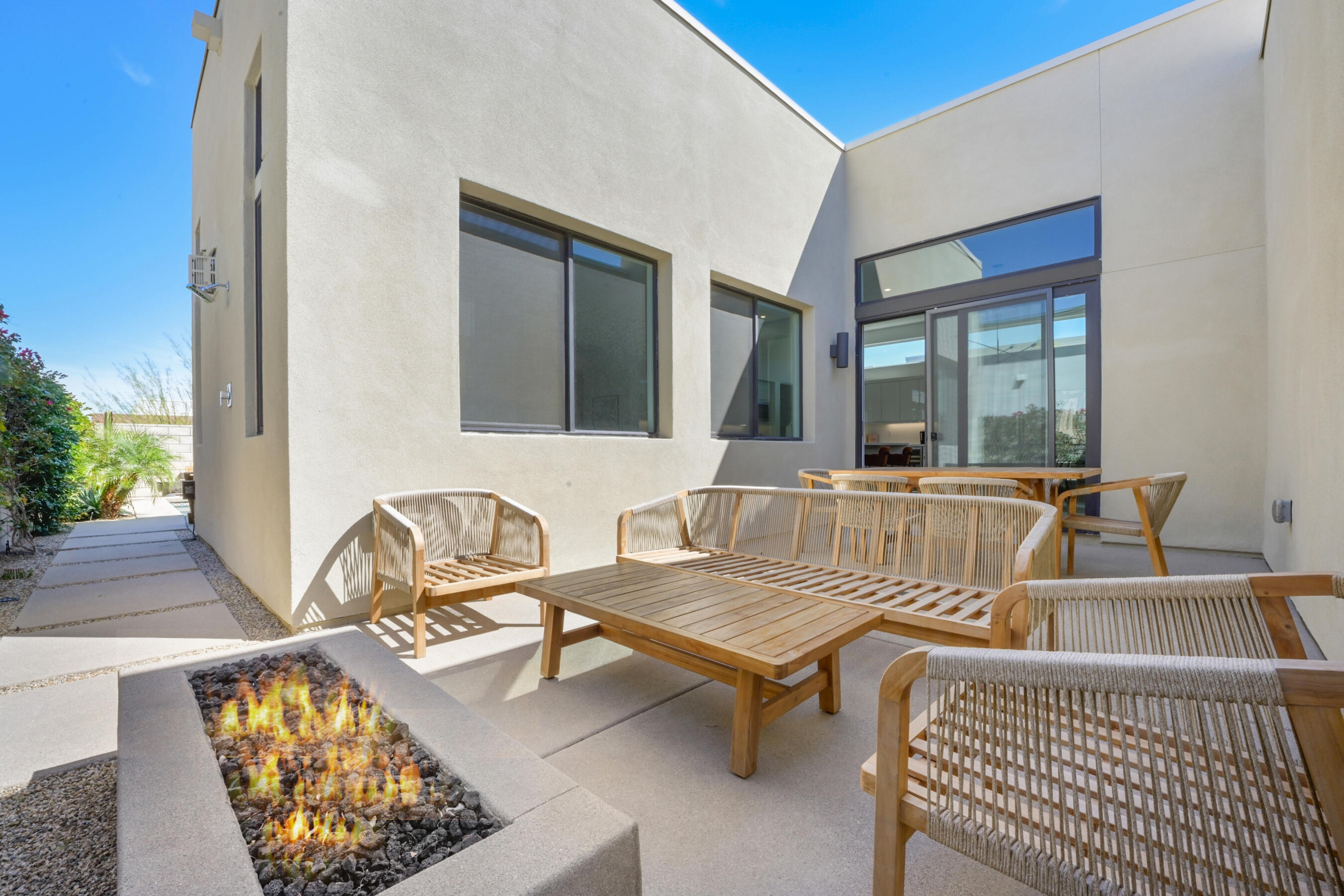 Welcome to this stunning 2021 original build, an impeccable blend of sleek, modern design and contemporary comfort. With 3 bedrooms, 3.5 bathrooms, and 1,894 square feet of thoughtfully designed living space, this home offers the perfect atmosphere for both everyday relaxing and entertaining.A seamless flow of sleek tile flooring runs throughout the home, highlighted by recessed accent lighting. The spacious living room is complimented by the warmth of an elevated, built-in fireplace. Enjoy a kitchen equipped with all stainless steel appliances, a built-in wine refrigerator, and a large breakfast bar connecting the kitchen to the dining and leisure areas, perfect for casual meals or entertaining guests. The dining room is enhanced by a contemporary hanging light feature, adding a touch of elegance to every meal.Each bedroom is a private retreat, offering its own dedicated bathroom for ultimate comfort and privacy, while a separate half bath serves the common areas with class. The gorgeous primary suite boasts a walk-in closet, large tile shower, and dual vanity, creating the ideal space for relaxation after a long day.The home's outdoor living spaces are equally impressive, with an enclosed patio with stone fire pit that sets the stage for memorable evenings. For a refreshing dip or a relaxing soak, enjoy the heated spool that invites you to unwind in style.A two-car garage provides ample storage and parking, while a paved stone walkway along the side yard offers convenient access to the home.This property is located within the prestigious Miralon community in Palm Springs, a modern oasis that offers a range of amenities designed to enhance your lifestyle. Enjoy resort-style living with access to pools, walking trails, a 24-hour fitness center, and a clubhouse, all set within beautifully landscaped surroundings.This home is more than just a place to live - it's a statement of modern luxury and convenience. Don't miss your chance to make it yours!Interested in this Listing?