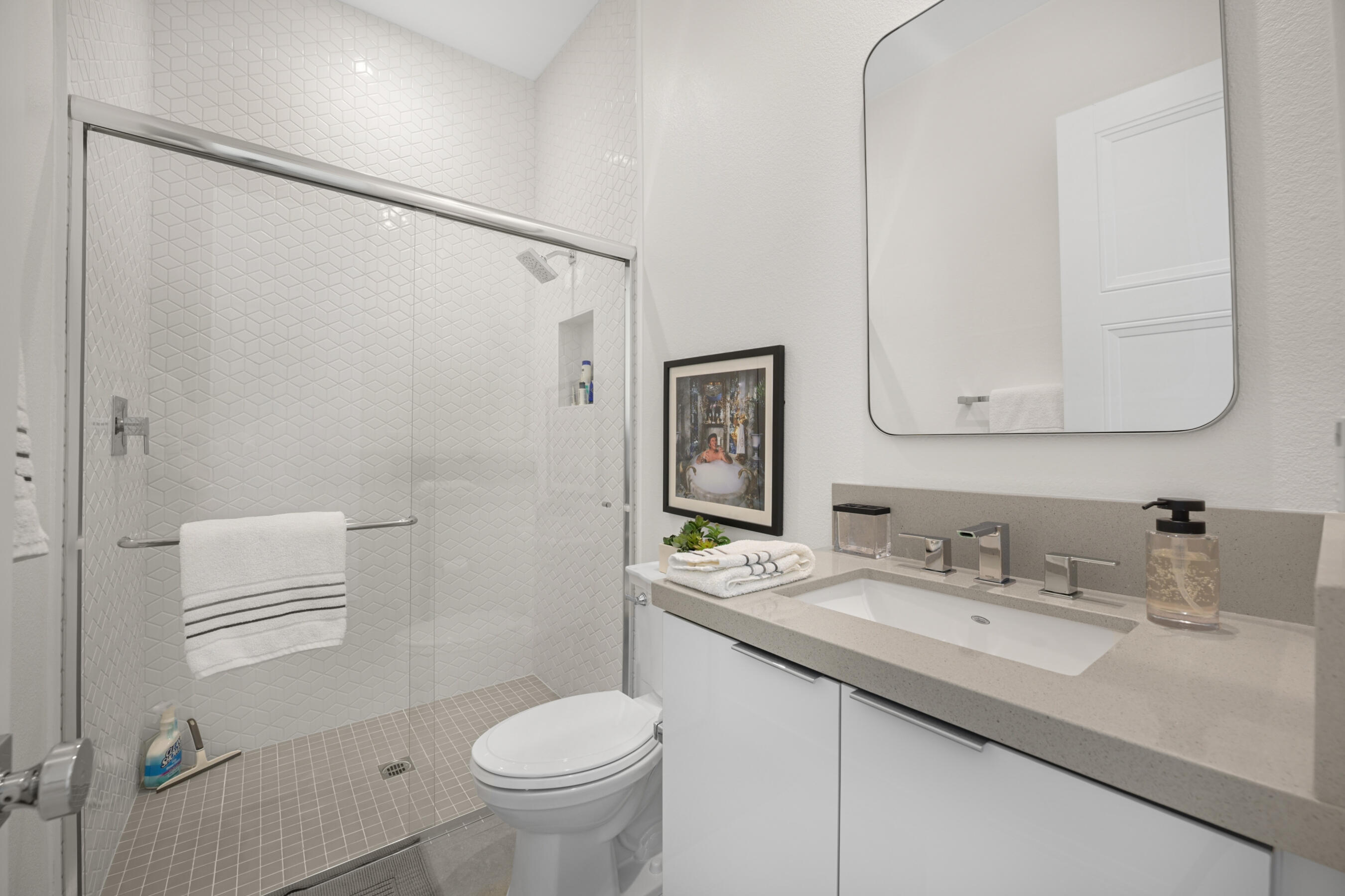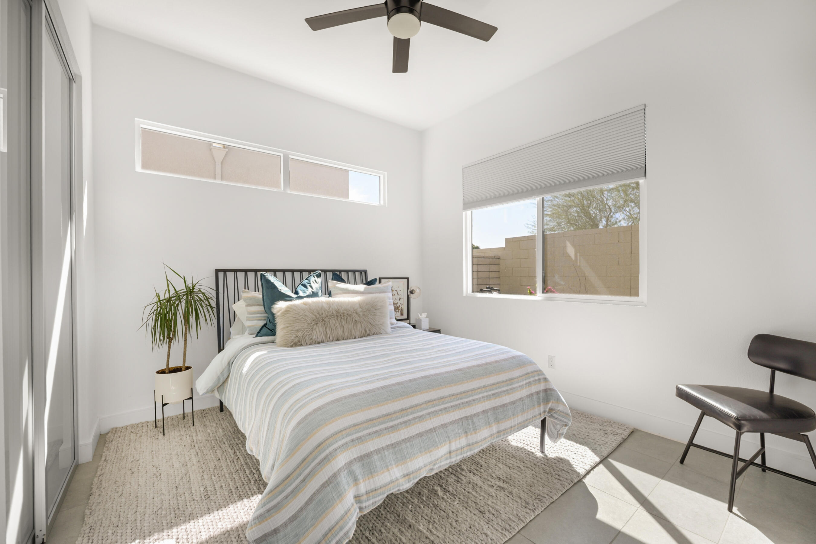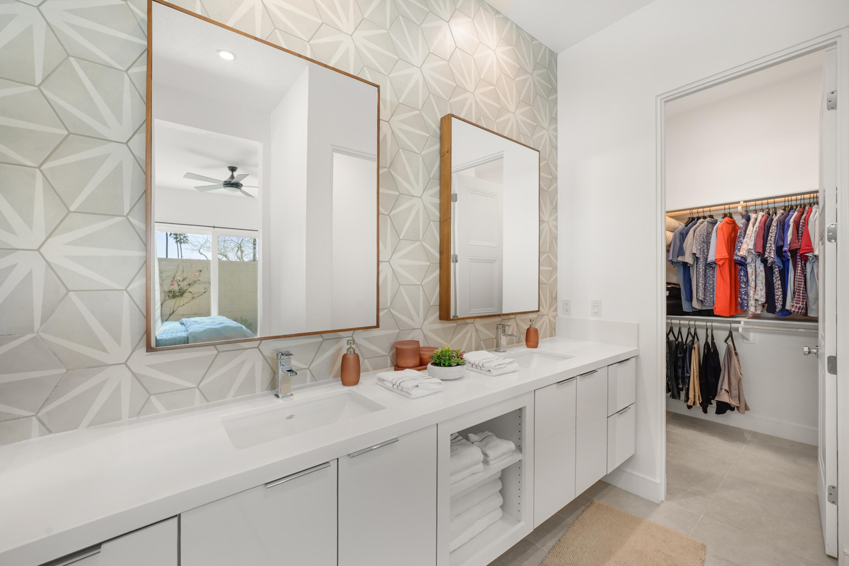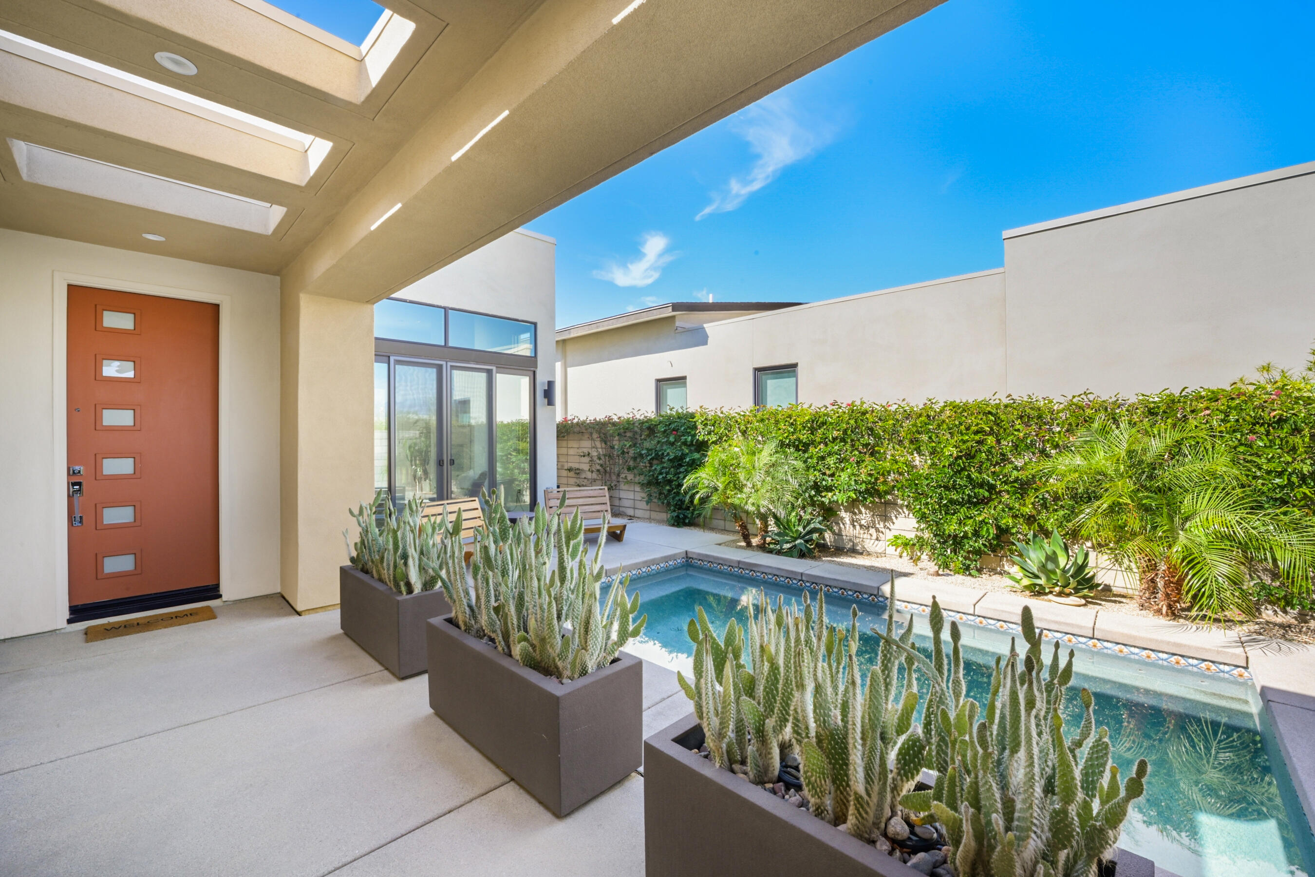 Welcome to this stunning 2021 original build, an impeccable blend of sleek, modern design and contemporary comfort. With 3 bedrooms, 3.5 bathrooms, and 1,894 square feet of thoughtfully designed living space, this home offers the perfect atmosphere for both everyday relaxing and entertaining.A seamless flow of sleek tile flooring runs throughout the home, highlighted by recessed accent lighting. The spacious living room is complimented by the warmth of an elevated, built-in fireplace. Enjoy a kitchen equipped with all stainless steel appliances, a built-in wine refrigerator, and a large breakfast bar connecting the kitchen to the dining and leisure areas, perfect for casual meals or entertaining guests. The dining room is enhanced by a contemporary hanging light feature, adding a touch of elegance to every meal.Each bedroom is a private retreat, offering its own dedicated bathroom for ultimate comfort and privacy, while a separate half bath serves the common areas with class. The gorgeous primary suite boasts a walk-in closet, large tile shower, and dual vanity, creating the ideal space for relaxation after a long day.The home's outdoor living spaces are equally impressive, with an enclosed patio with stone fire pit that sets the stage for memorable evenings. For a refreshing dip or a relaxing soak, enjoy the heated spool that invites you to unwind in style.A two-car garage provides ample storage and parking, while a paved stone walkway along the side yard offers convenient access to the home.This property is located within the prestigious Miralon community in Palm Springs, a modern oasis that offers a range of amenities designed to enhance your lifestyle. Enjoy resort-style living with access to pools, walking trails, a 24-hour fitness center, and a clubhouse, all set within beautifully landscaped surroundings.This home is more than just a place to live - it's a statement of modern luxury and convenience. Don't miss your chance to make it yours!Interested in this Listing?