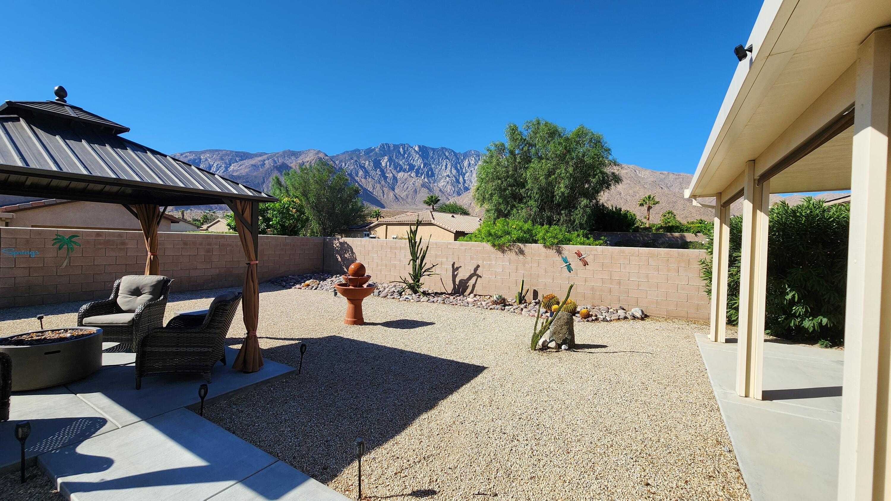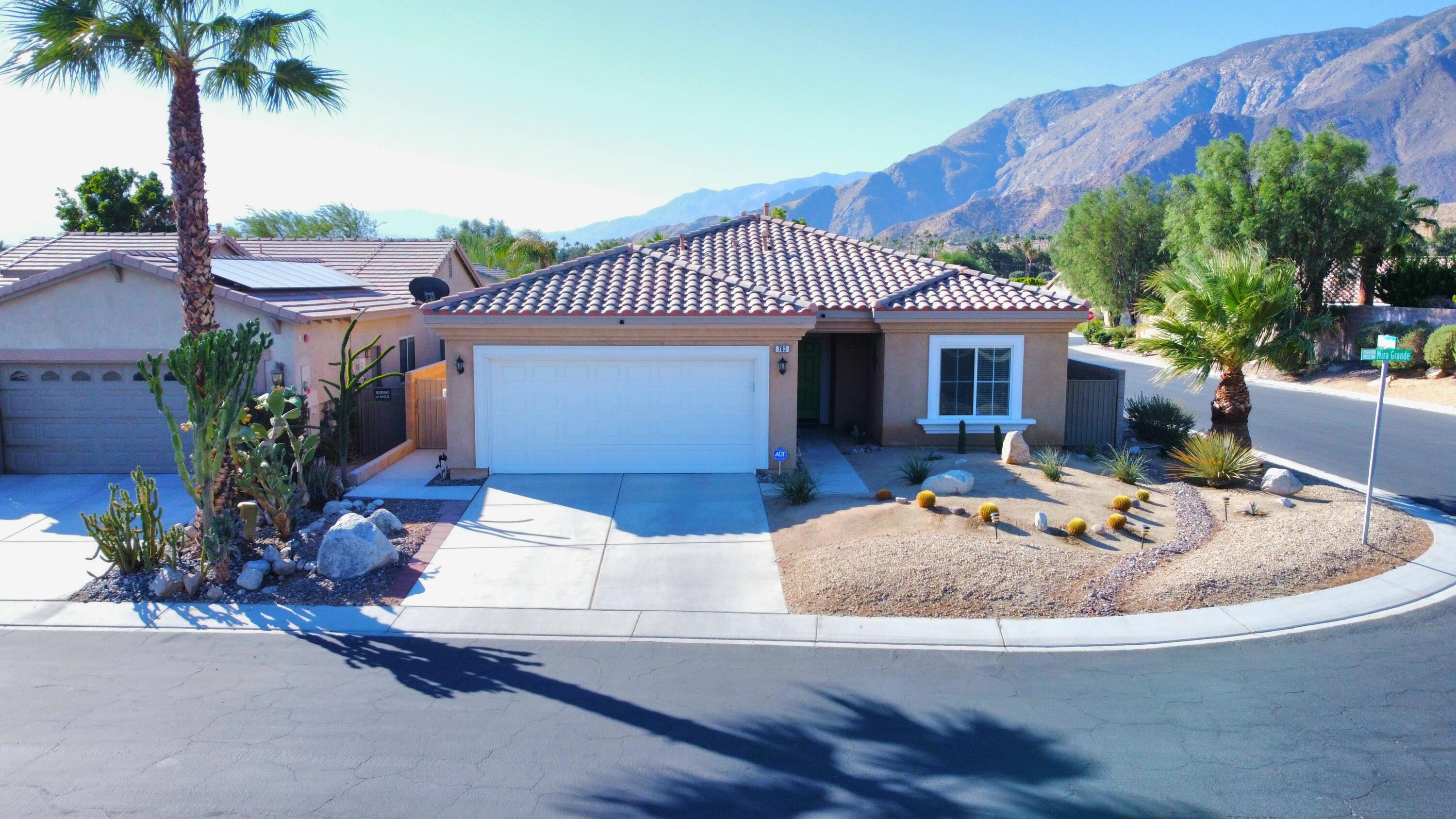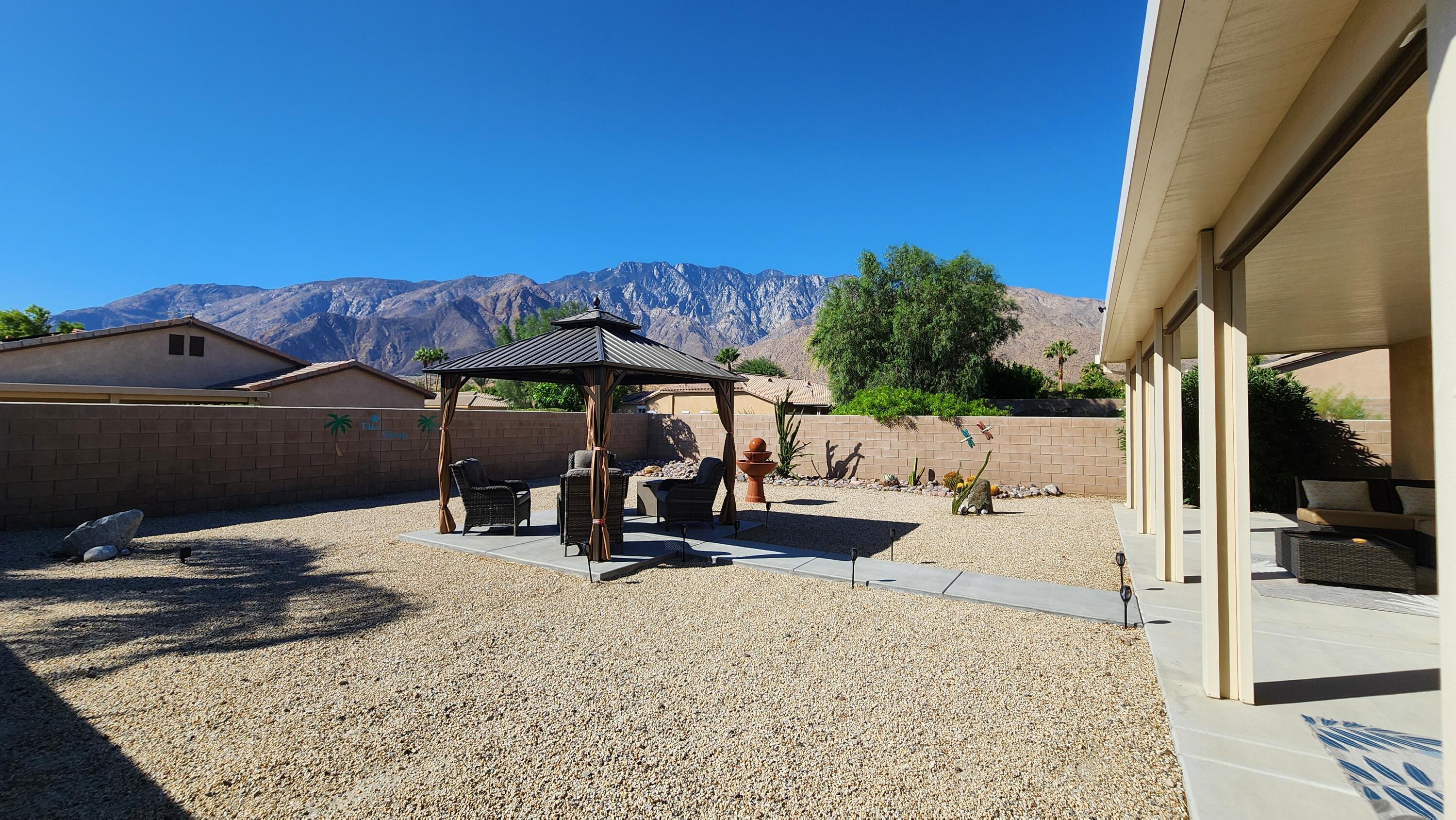 Wow, grab a cup of coffee and enjoy these spectacular views of the San Jacinto Mtns. from your backyard in this oversized corner lot. Home is beautifully decorated, upgraded and ready to move in and start enjoying. Seller will include furnishings in the house minus some artwork. A/C unit is newer. Water softener is owned. Tile throughout. Kitchen has large island, pantry, and stainless appliances. Great room has gas log fireplace and media niche. Inside laundry room leads to 2 car attached and finished garage. New Gazebo and alumawood patio cover provide plenty of shade. The yard is big enough for the largest of pools however the Gated community has 3 pools, spas, tennis courts, basketball court, covered BBQ area, childrens' playground, walking paths, and roving patrol. Super low HOA dues. Located just off Palm Canyon and a short drive to Dining, shops, entertainment and one light away from the famous Palm Springs Aerial Tramway. Don't wait on this one, Very well priced!Interested in this Listing?
