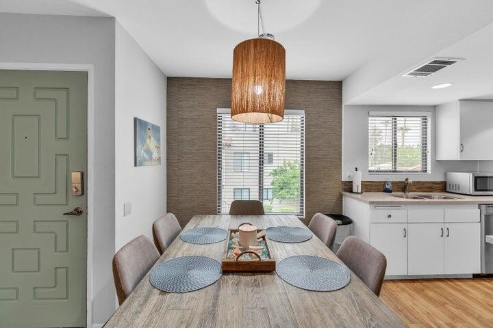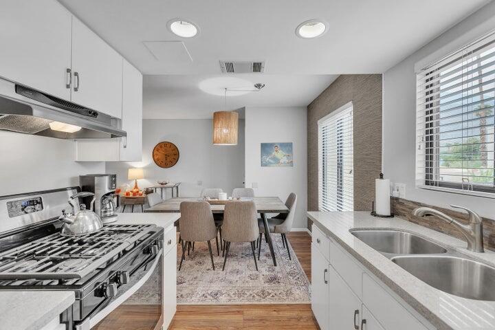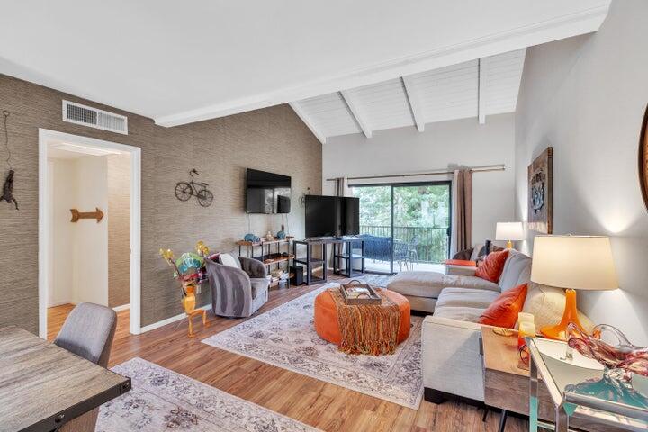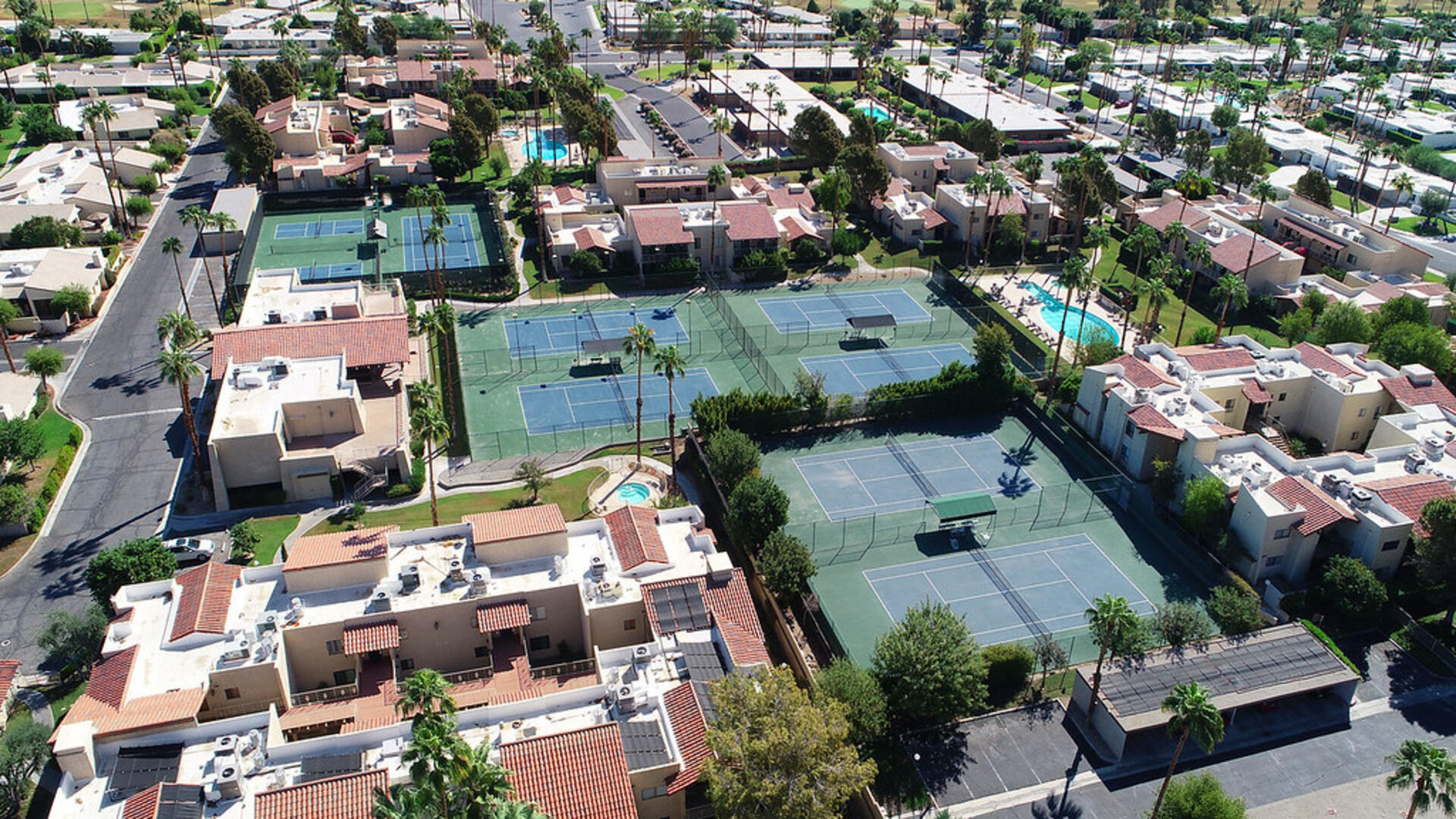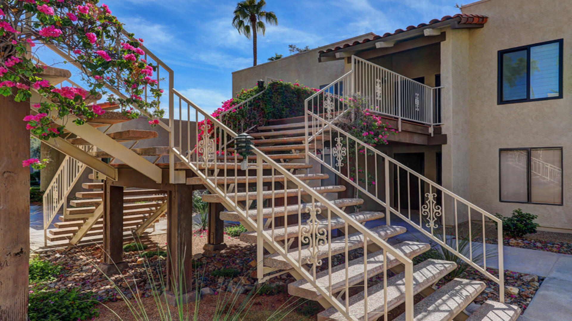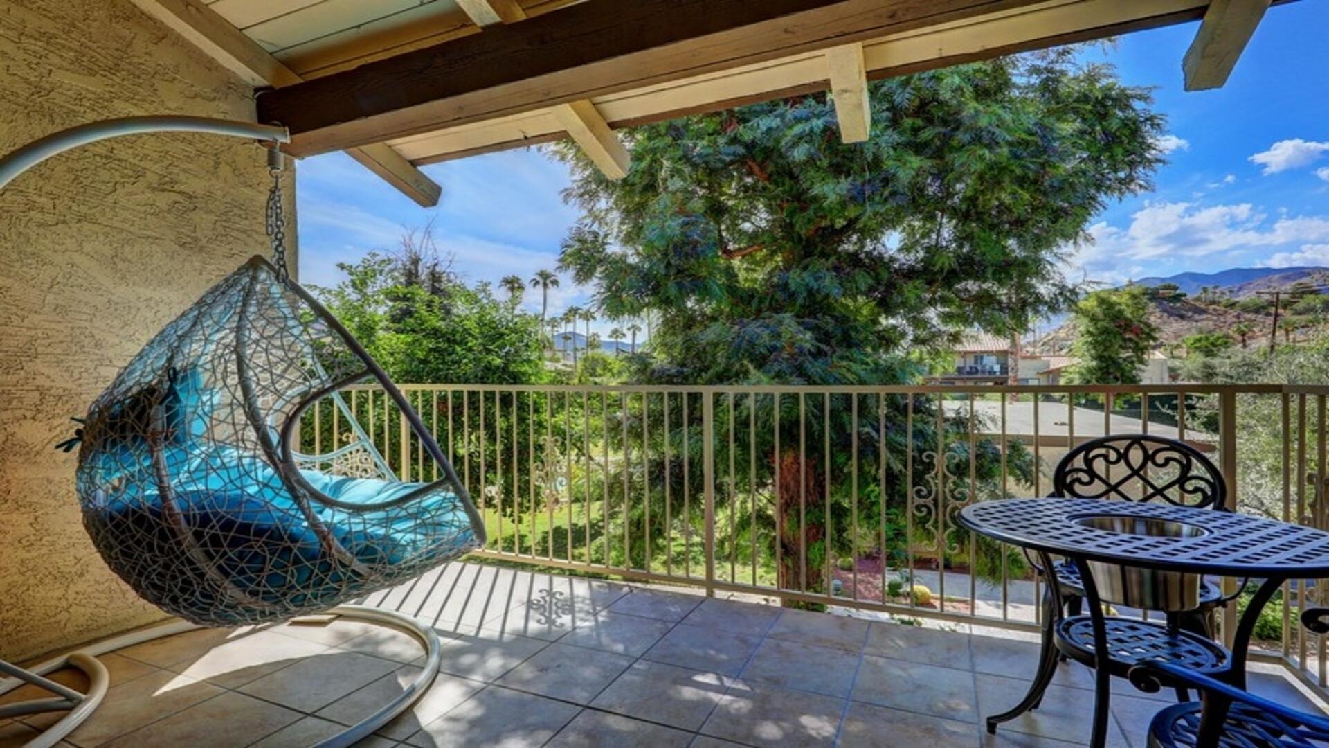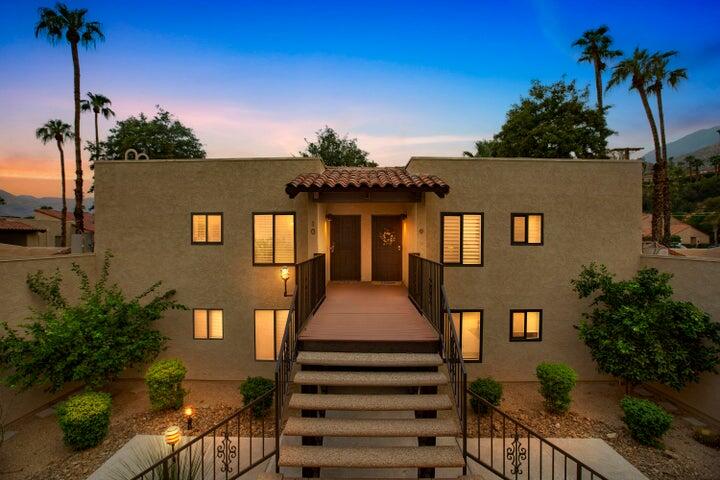 Unique, fun, second story condo located in Canyon Country Club Estados in far South Palm Springs. Awesome location with gorgeous mountain views from balcony and primary bedroom window. Jogger or walker paradise, this south end of Palm Springs is a popular destination for outside recreation. Master planned community is immaculately maintained and one of the most beautiful communities in Palm Springs. 4 enormous, heated pools in shape of tennis rackets, numerous spas with one directly behind this unit. Quality courts - racket and tennis. Spacious, remodeled club house with game room - may be reserved for parties. There is one covered parking spot a short distance and guest parking. You'll adore the positive, relaxing energy in this unit! Unit was used by owner and also steadily leased through VRBO for 5+ years. Tasteful living room with cathedral ceiling opens to balcony, dining and kitchen. Ideal set up for entertaining. Recent quartz countertops and SS appliances. Unit was newly furnished with current owner. Furnishings convey per inventory, or can be removed. Spacious primary suite accommodates California king bedroom suit. You don't want to miss this one! New HW heater and electric panel box 2023. Showings by appointment.Interested in this Listing?
