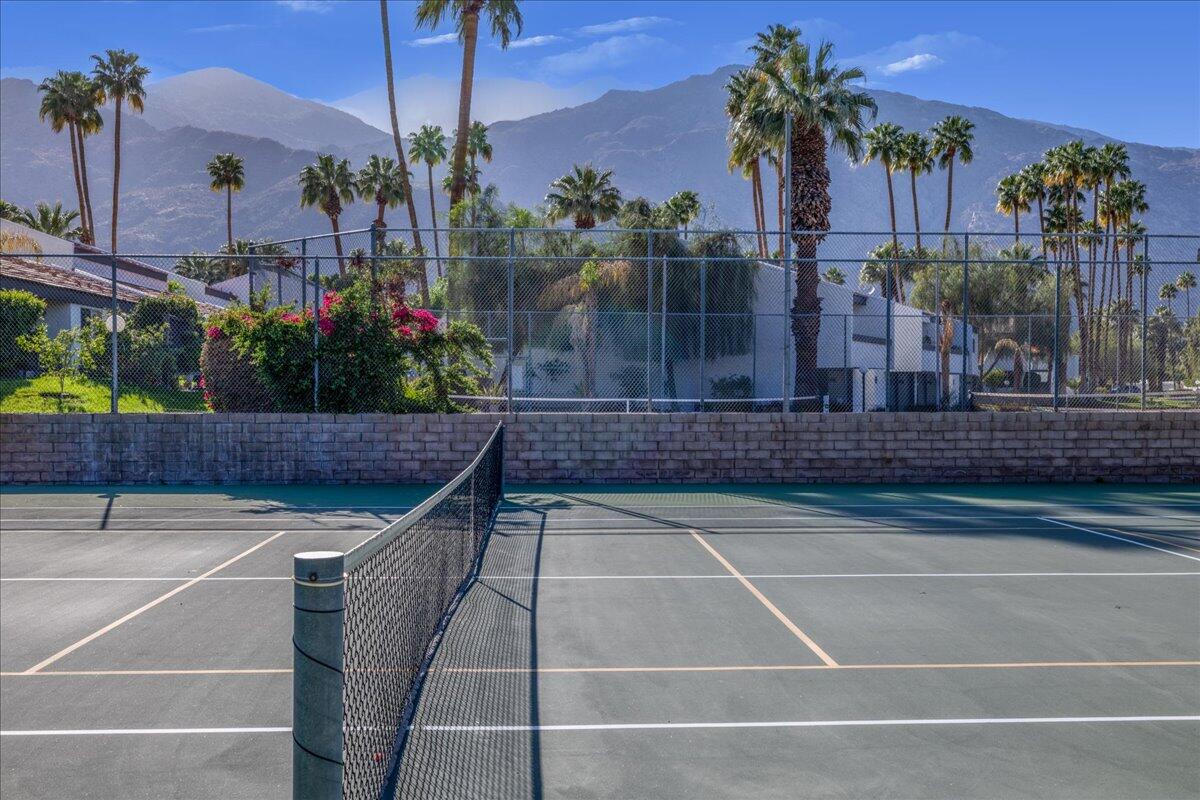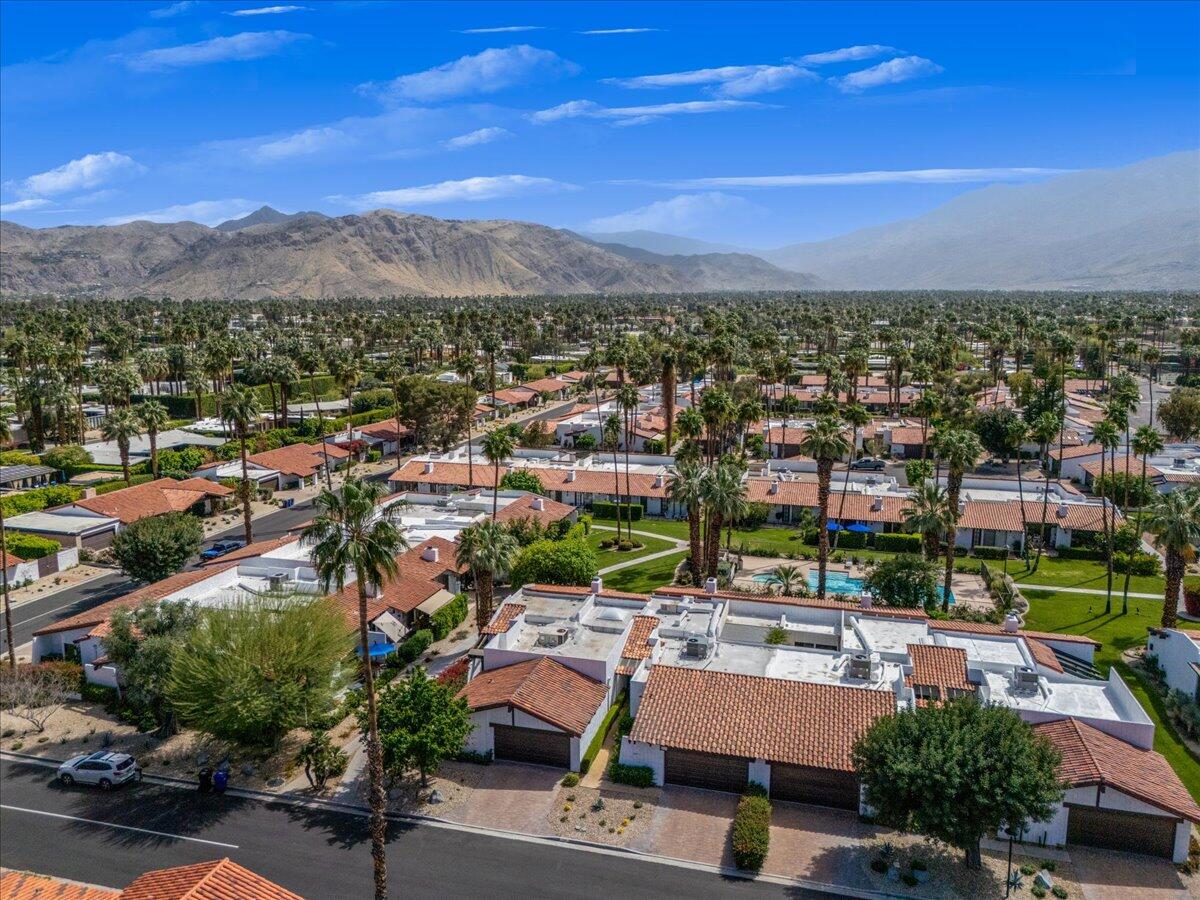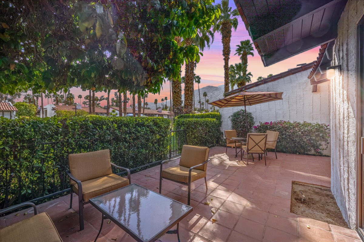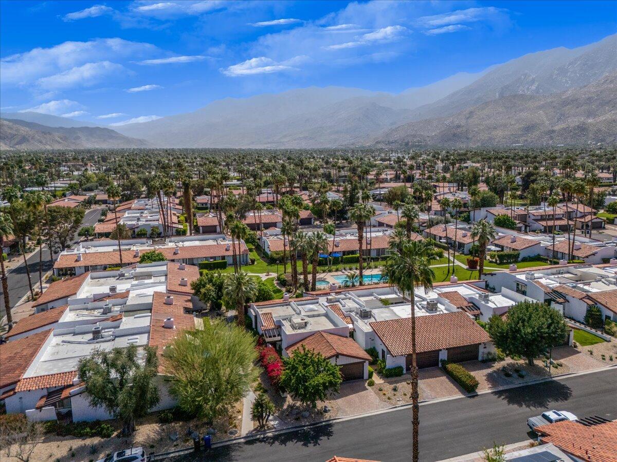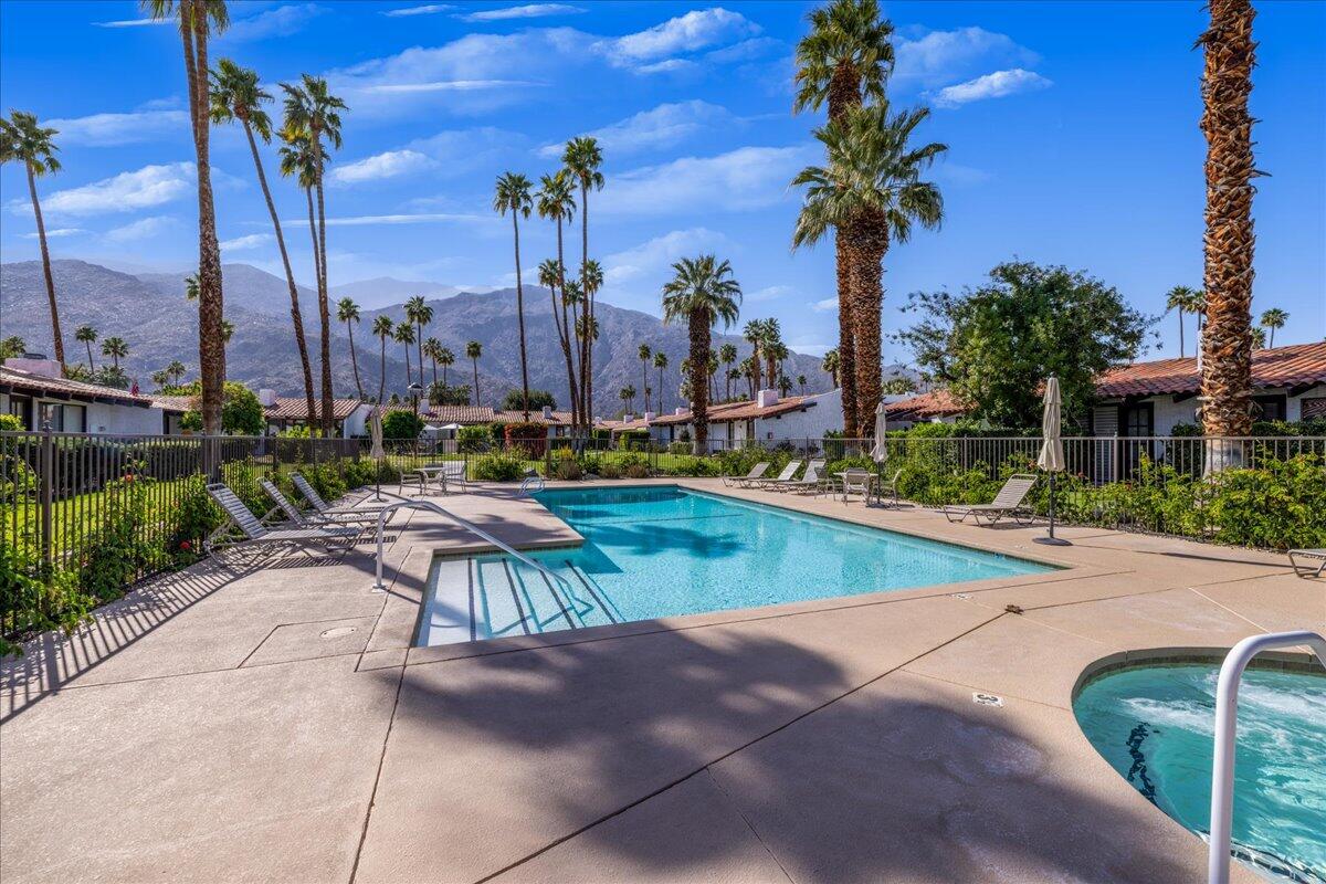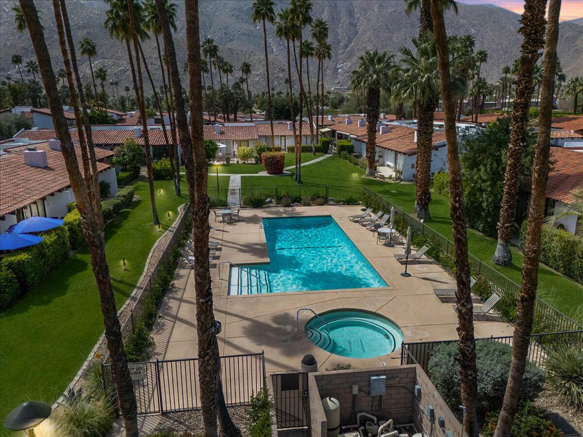 Your South Palm Springs Sanctuary Awaits! Nestled in the heart of Deepwell Ranch, this stunning 2-bedroom, 2-bath corner unit offers the perfect blend of luxury, comfort, and convenience. Just steps from the pool and spa, this home boasts breathtaking southwest mountain views along a lush greenbelt, creating a serene and picturesque backdrop from your private patio. Inside, you experience the spaciousness of vaulted wood-beamed ceilings and the warm ambiance of a fireplace, making the living area perfect for both elegant entertaining and relaxed everyday living. The open floor plan bathed in natural light, showcases an updated kitchen that flows seamlessly into the spacious family/dining room. The primary suite is a true retreat, enhanced with solar tubes and recessed lighting. It features custom closets and a spa-inspired bathroom with quartz countertops, twin sinks, and a full-length mirror. A separate soaking tub and the glass mosaic walk-in shower create a luxurious spa-like escape. The versatile guest bedroom features a Murphy bed, making it ideal as a bedroom or office. It offers access to a stylish bathroom with a glass mosaic-tiled shower and doubles as a powder room for hosting visitors. Every detail has been thoughtfully upgraded, including windows coated with film for privacy and passive temperature control that fills the space with soft, natural light. Stepping outside to your spacious back patio; the perfect spot for morning coffee, sunset cocktails, or summer barbecues, while taking in the breathtaking views. Within the patio you can either enjoy the cooling shade from the mature grapefruit tree or the warmth of the brilliant sun. As part of Deepwell Ranch, you'll enjoy resort-style amenities, including three saltwater pools and spas, tennis court, pickle ball courts, and 24-hour manned security--all within a meticulously maintained, gated community. The attached 2-car garage with epoxy floor and built-in cabinets adds convenience and ample storage.Interested in this Listing?