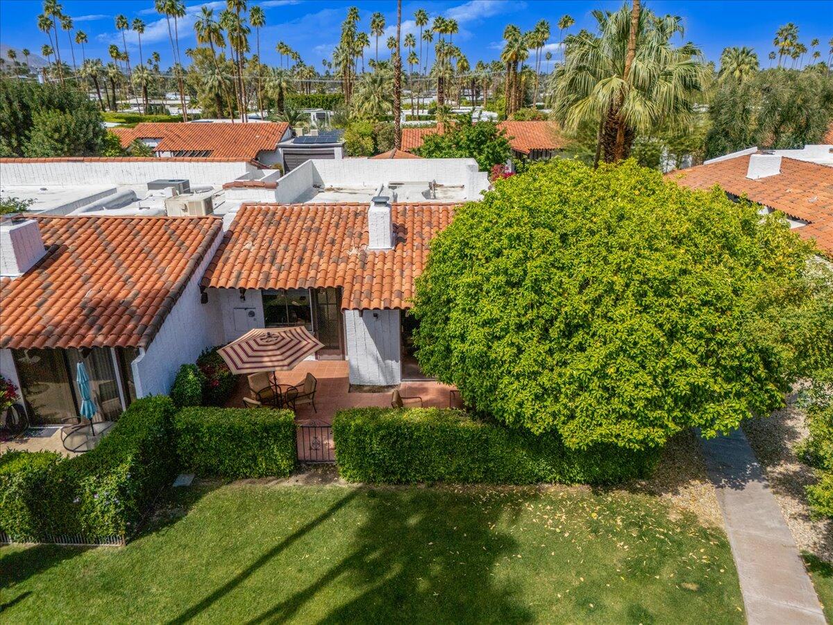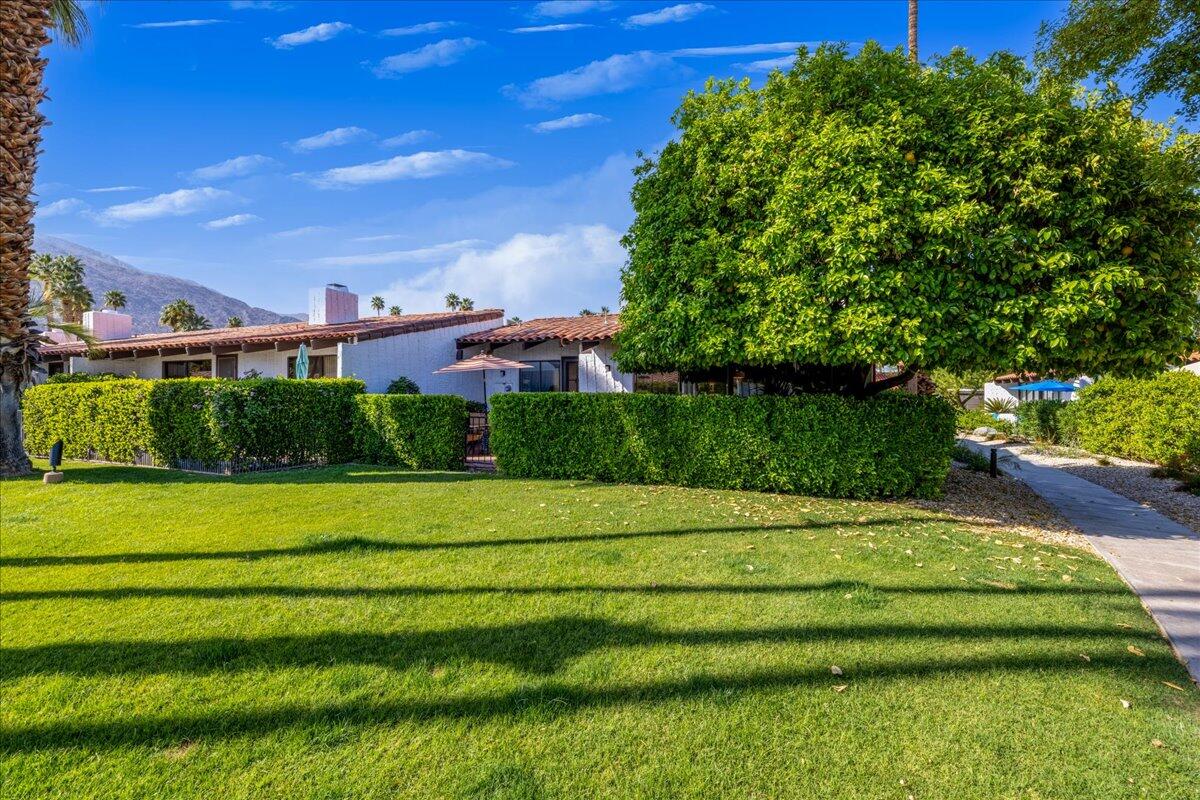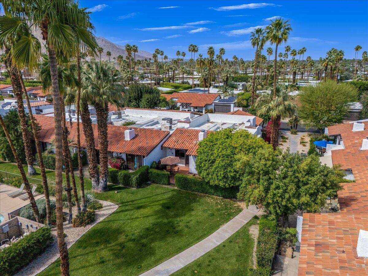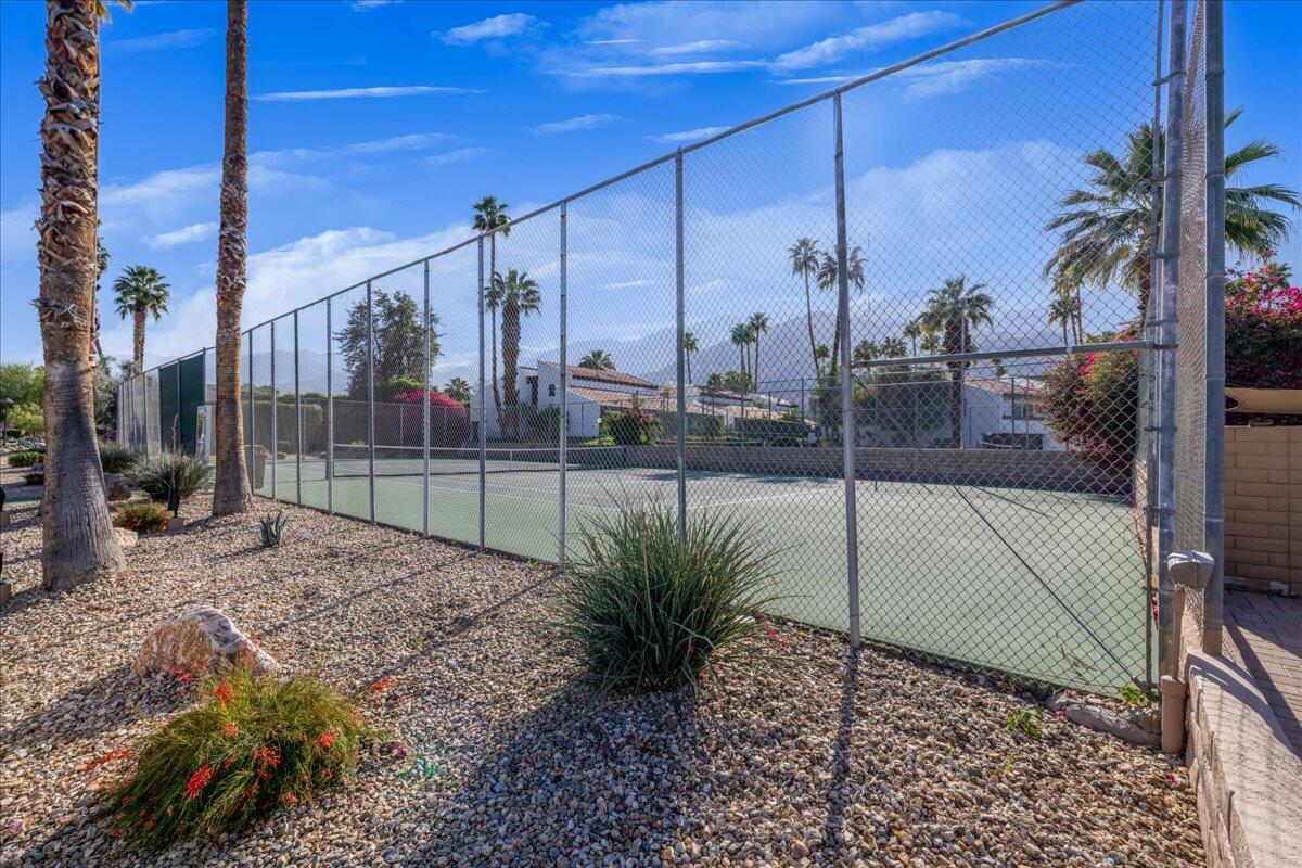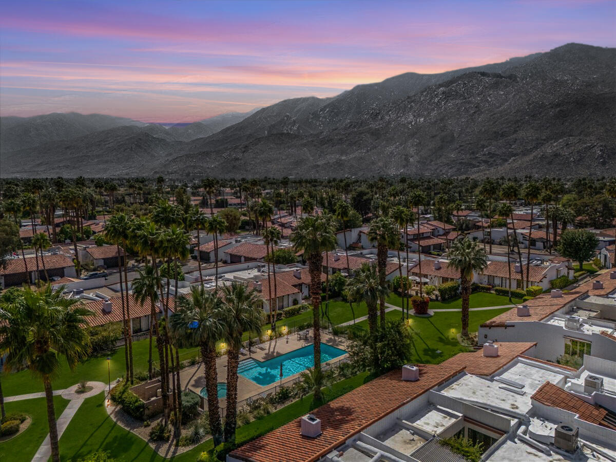 Your South Palm Springs Sanctuary Awaits! Nestled in the heart of Deepwell Ranch, this stunning 2-bedroom, 2-bath corner unit offers the perfect blend of luxury, comfort, and convenience. Just steps from the pool and spa, this home boasts breathtaking southwest mountain views along a lush greenbelt, creating a serene and picturesque backdrop from your private patio. Inside, you experience the spaciousness of vaulted wood-beamed ceilings and the warm ambiance of a fireplace, making the living area perfect for both elegant entertaining and relaxed everyday living. The open floor plan bathed in natural light, showcases an updated kitchen that flows seamlessly into the spacious family/dining room. The primary suite is a true retreat, enhanced with solar tubes and recessed lighting. It features custom closets and a spa-inspired bathroom with quartz countertops, twin sinks, and a full-length mirror. A separate soaking tub and the glass mosaic walk-in shower create a luxurious spa-like escape. The versatile guest bedroom features a Murphy bed, making it ideal as a bedroom or office. It offers access to a stylish bathroom with a glass mosaic-tiled shower and doubles as a powder room for hosting visitors. Every detail has been thoughtfully upgraded, including windows coated with film for privacy and passive temperature control that fills the space with soft, natural light. Stepping outside to your spacious back patio; the perfect spot for morning coffee, sunset cocktails, or summer barbecues, while taking in the breathtaking views. Within the patio you can either enjoy the cooling shade from the mature grapefruit tree or the warmth of the brilliant sun. As part of Deepwell Ranch, you'll enjoy resort-style amenities, including three saltwater pools and spas, tennis court, pickle ball courts, and 24-hour manned security--all within a meticulously maintained, gated community. The attached 2-car garage with epoxy floor and built-in cabinets adds convenience and ample storage.Interested in this Listing?