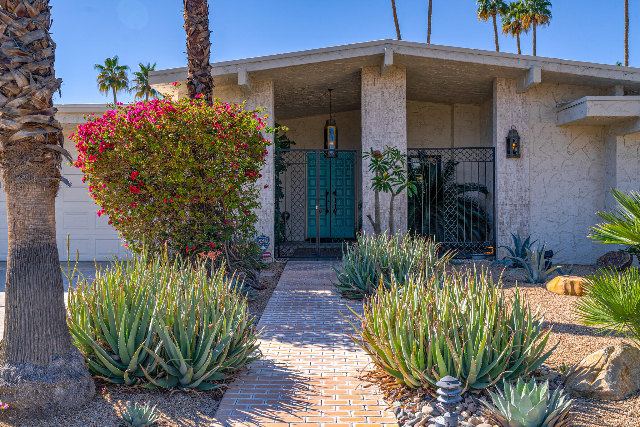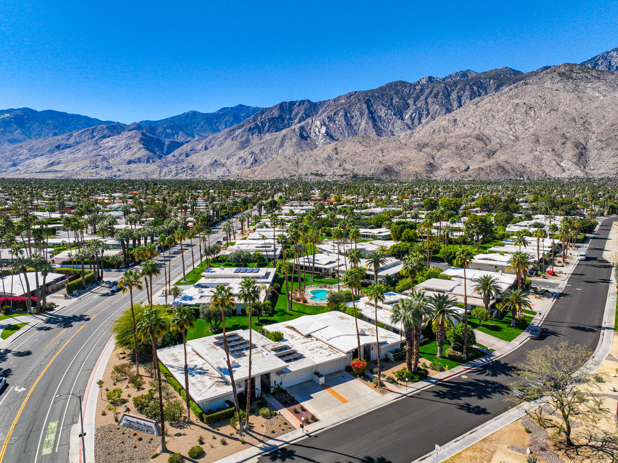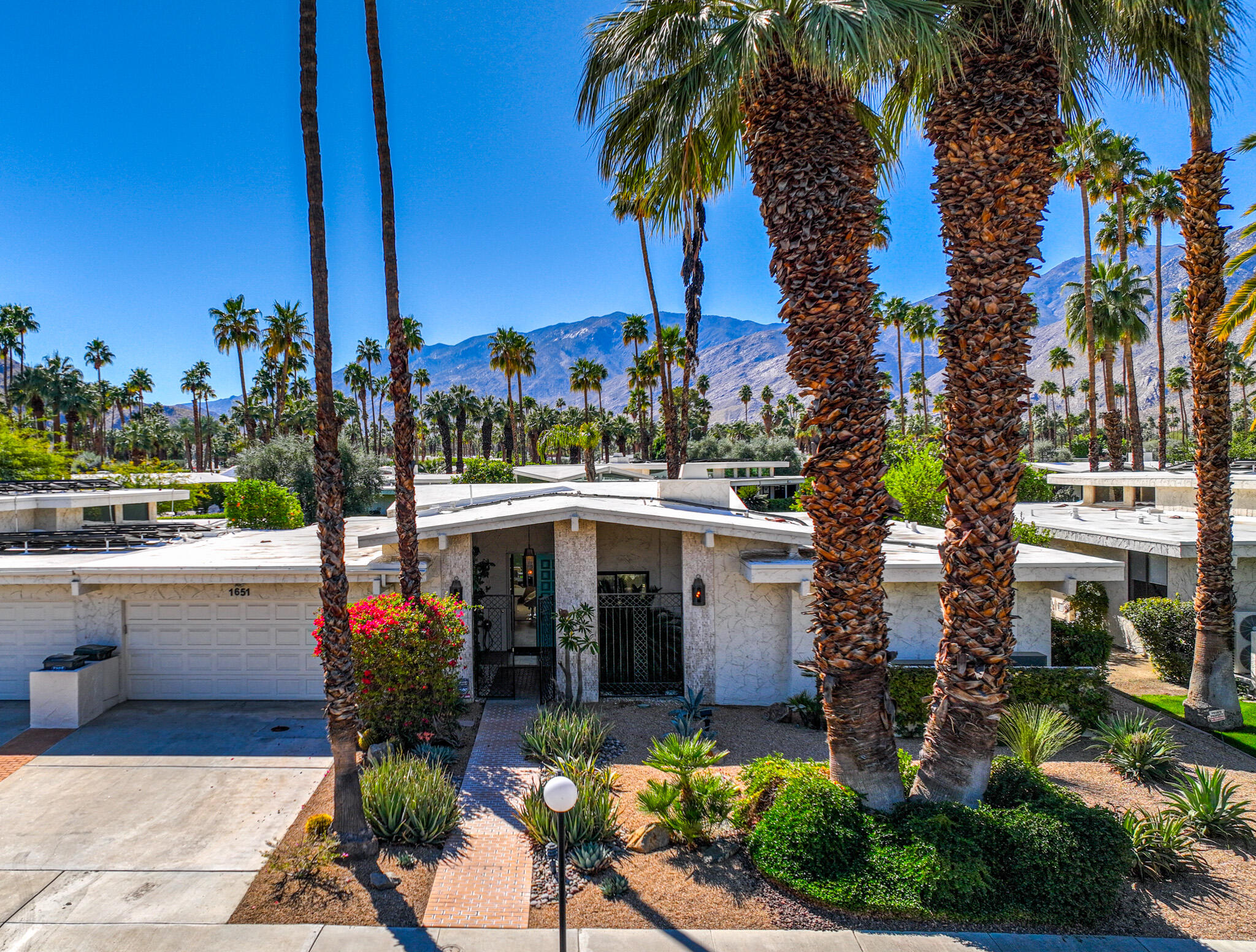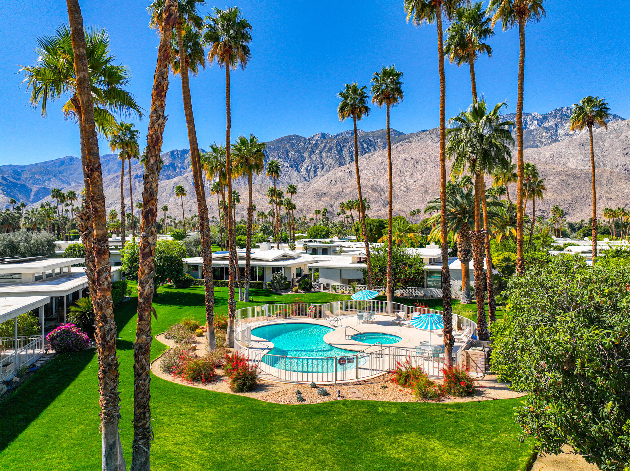 Canyon Vista Estates in South Palm Springs offers unparalleled resort-like living. Designed by Charles E. Du Bois and built by Roy Fey, this residence is one of just 26 homes in a low-density enclave spanning eight acres of lush landscaping. Step onto the expansive covered patio and enjoy al fresco dining with stunning mountain views--just steps from the pools, spas, and tennis court. This beautiful home showcases the distinctive elements of Mid-Century Modern architecture, featuring open-concept Living and Dining areas with soaring 12' ceilings, clerestory windows, and seamless indoor-outdoor flow. The iconic sunken bar and easy access to the patio from the Living Room, Kitchen, and Primary Suite create the perfect setting for entertaining. A closet and doors have been thoughtfully added to the inviting den with a fireplace, creating a comfortable and private third bedroom--ideal for hosting guests. Recent key upgrades include a fully remodeled kitchen, new windows and sliding doors, HVAC from 2020, a water heater, and a new shower in the guest bath. A spacious Laundry Room with ample storage leads directly to the two-car garage. The primary and guest suites offer excellent separation, en-suite baths, and large walk-in closets. The primary bath features dual sink-vanity, a soaking tub, and a separate shower.This beautifully maintained home is move-in ready, with an option to purchase all furniture separately. Conveniently located within walking distance of Smoke Tree Plaza, offering shopping, dining, and entertainment. Fee Simple (You Own the Land).Interested in this Listing?