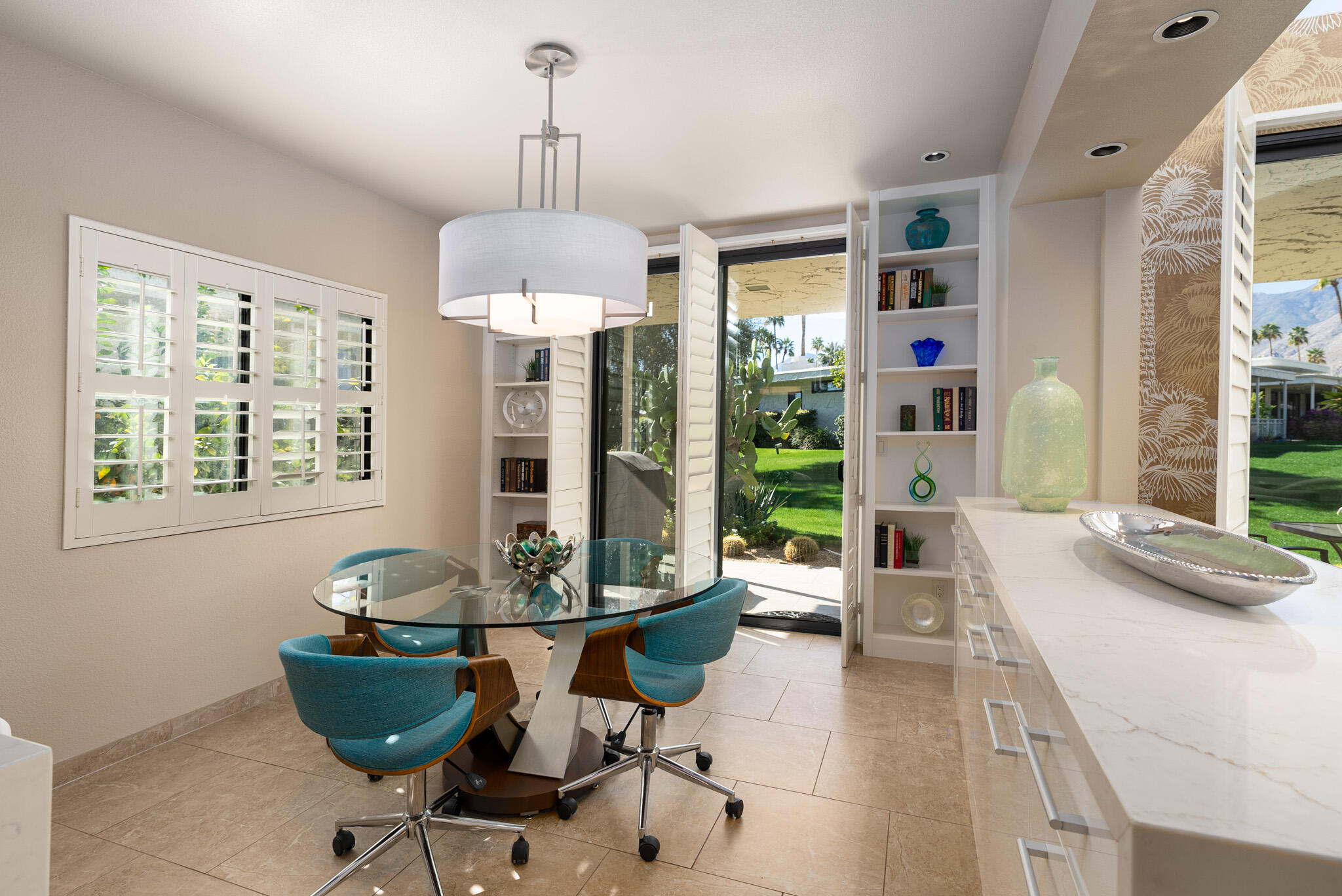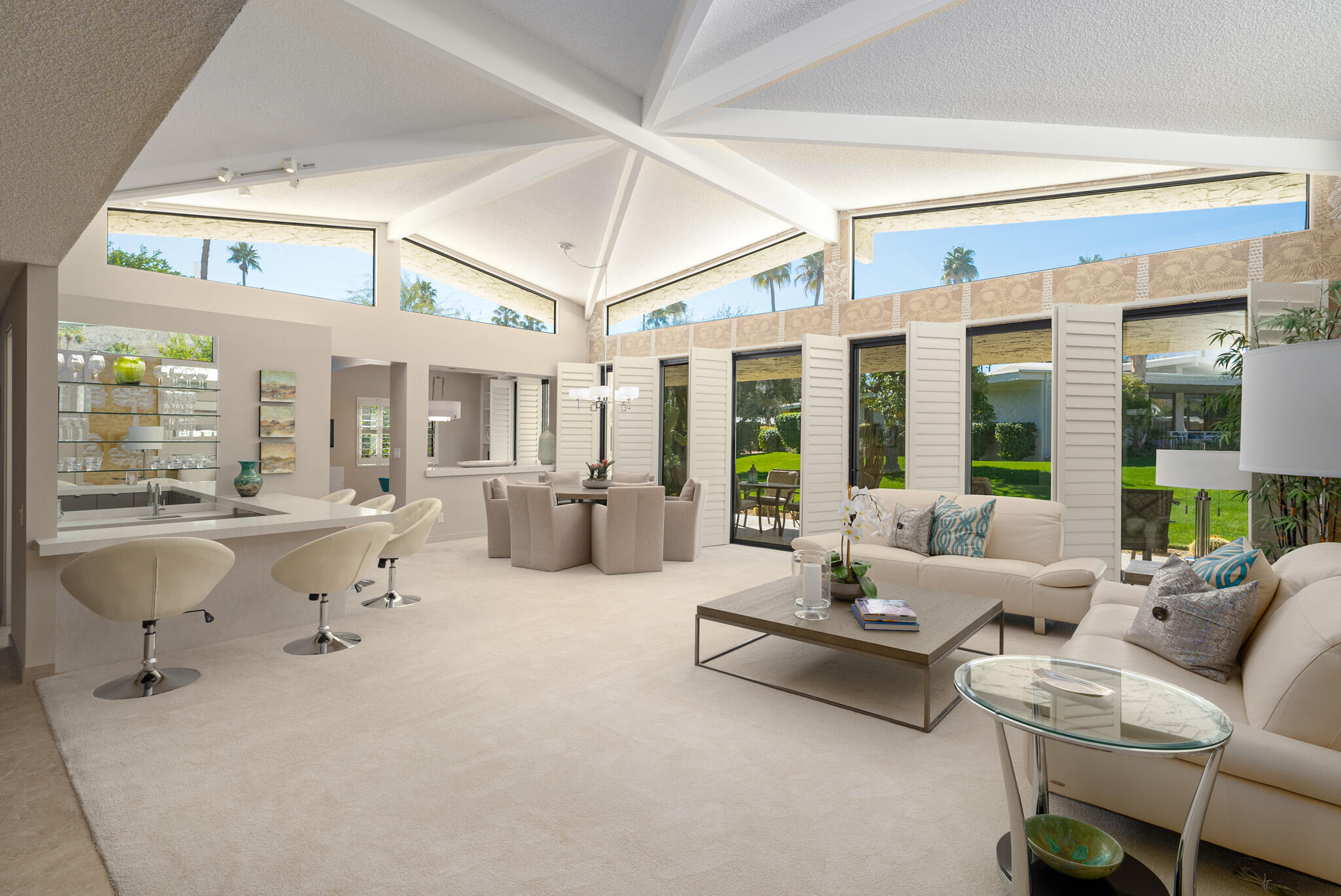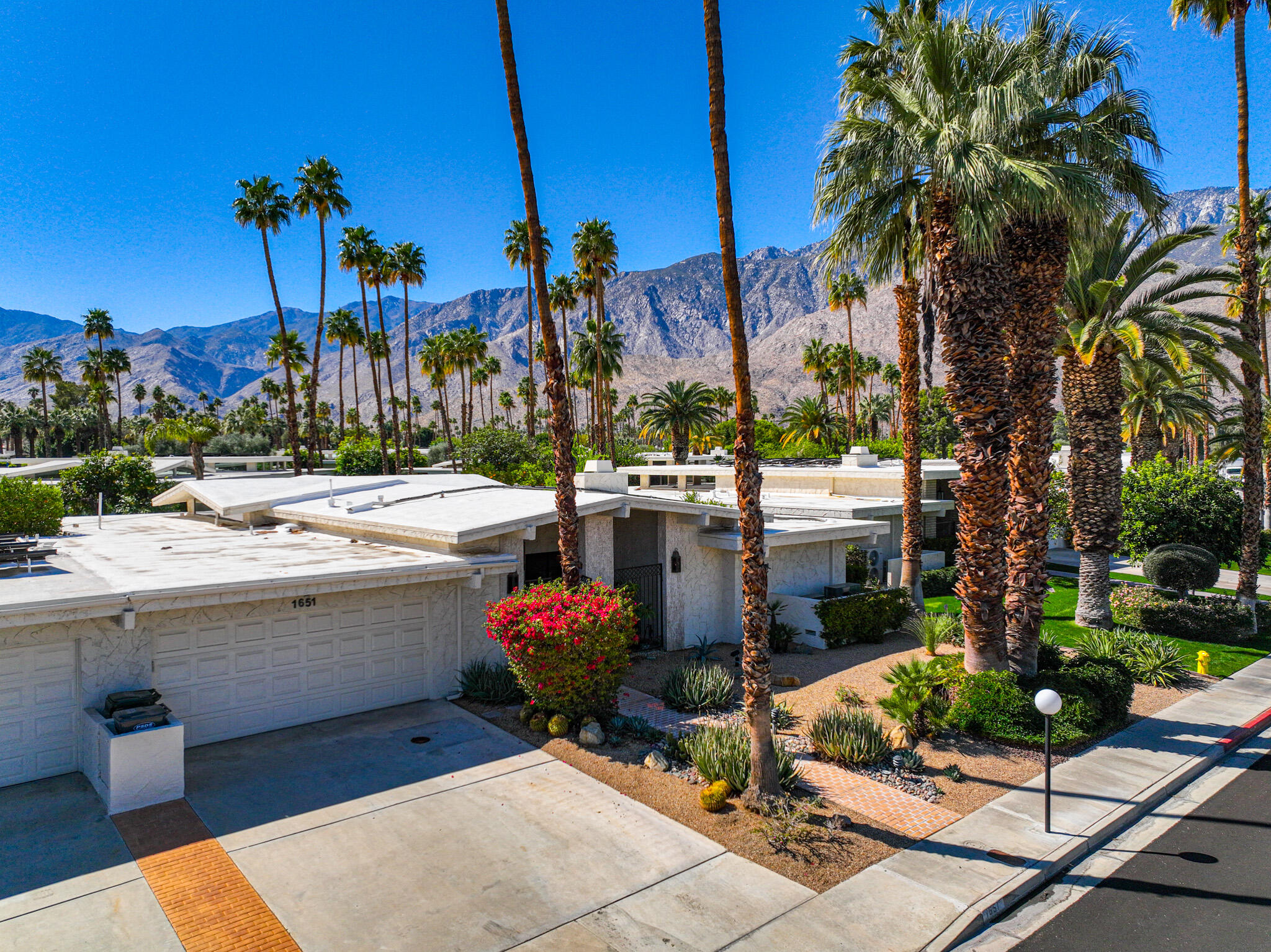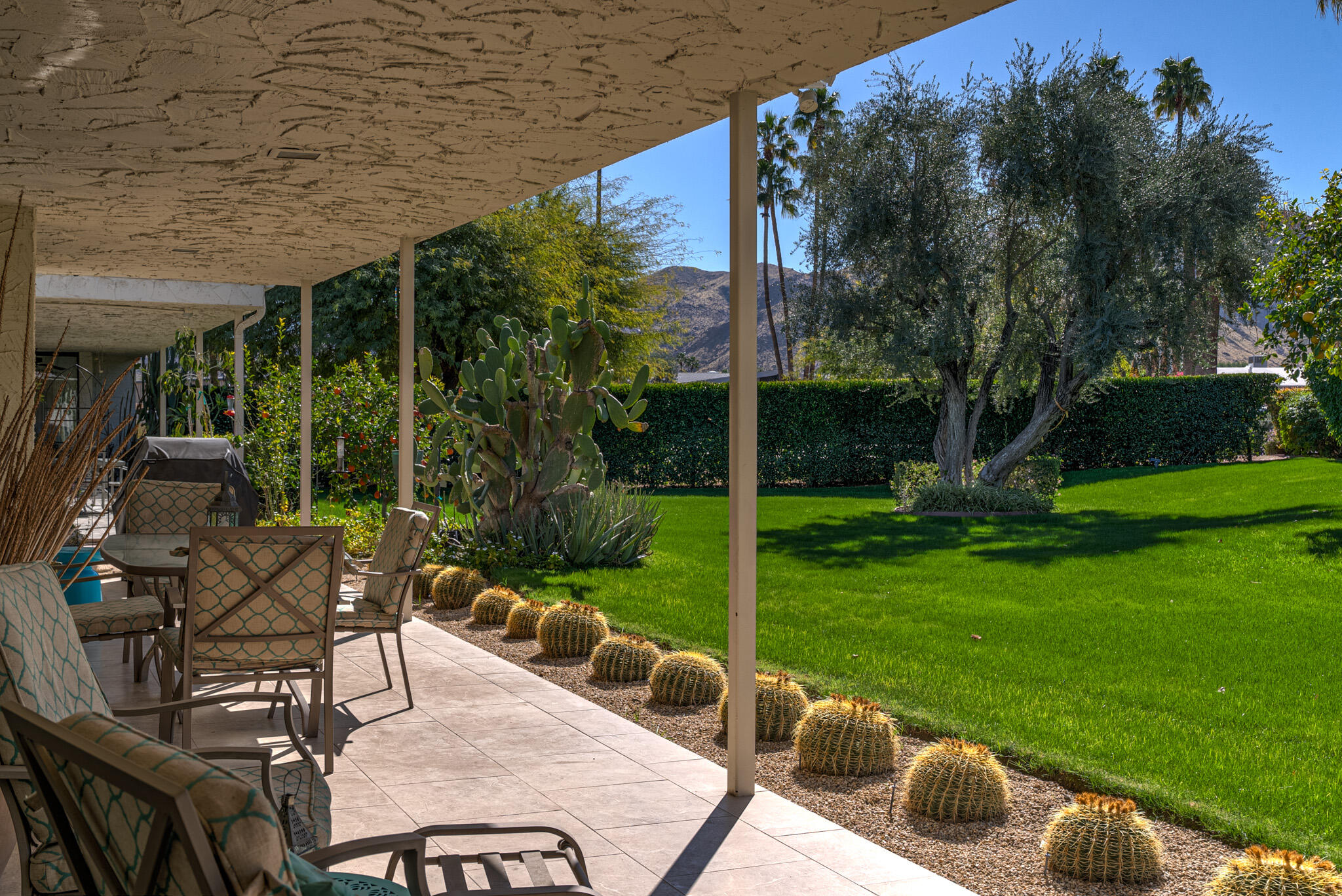 Canyon Vista Estates in South Palm Springs offers unparalleled resort-like living. Designed by Charles E. Du Bois and built by Roy Fey, this residence is one of just 26 homes in a low-density enclave spanning eight acres of lush landscaping. Step onto the expansive covered patio and enjoy al fresco dining with stunning mountain views--just steps from the pools, spas, and tennis court. This beautiful home showcases the distinctive elements of Mid-Century Modern architecture, featuring open-concept Living and Dining areas with soaring 12' ceilings, clerestory windows, and seamless indoor-outdoor flow. The iconic sunken bar and easy access to the patio from the Living Room, Kitchen, and Primary Suite create the perfect setting for entertaining. A closet and doors have been thoughtfully added to the inviting den with a fireplace, creating a comfortable and private third bedroom--ideal for hosting guests. Recent key upgrades include a fully remodeled kitchen, new windows and sliding doors, HVAC from 2020, a water heater, and a new shower in the guest bath. A spacious Laundry Room with ample storage leads directly to the two-car garage. The primary and guest suites offer excellent separation, en-suite baths, and large walk-in closets. The primary bath features dual sink-vanity, a soaking tub, and a separate shower.This beautifully maintained home is move-in ready, with an option to purchase all furniture separately. Conveniently located within walking distance of Smoke Tree Plaza, offering shopping, dining, and entertainment. Fee Simple (You Own the Land).Interested in this Listing?