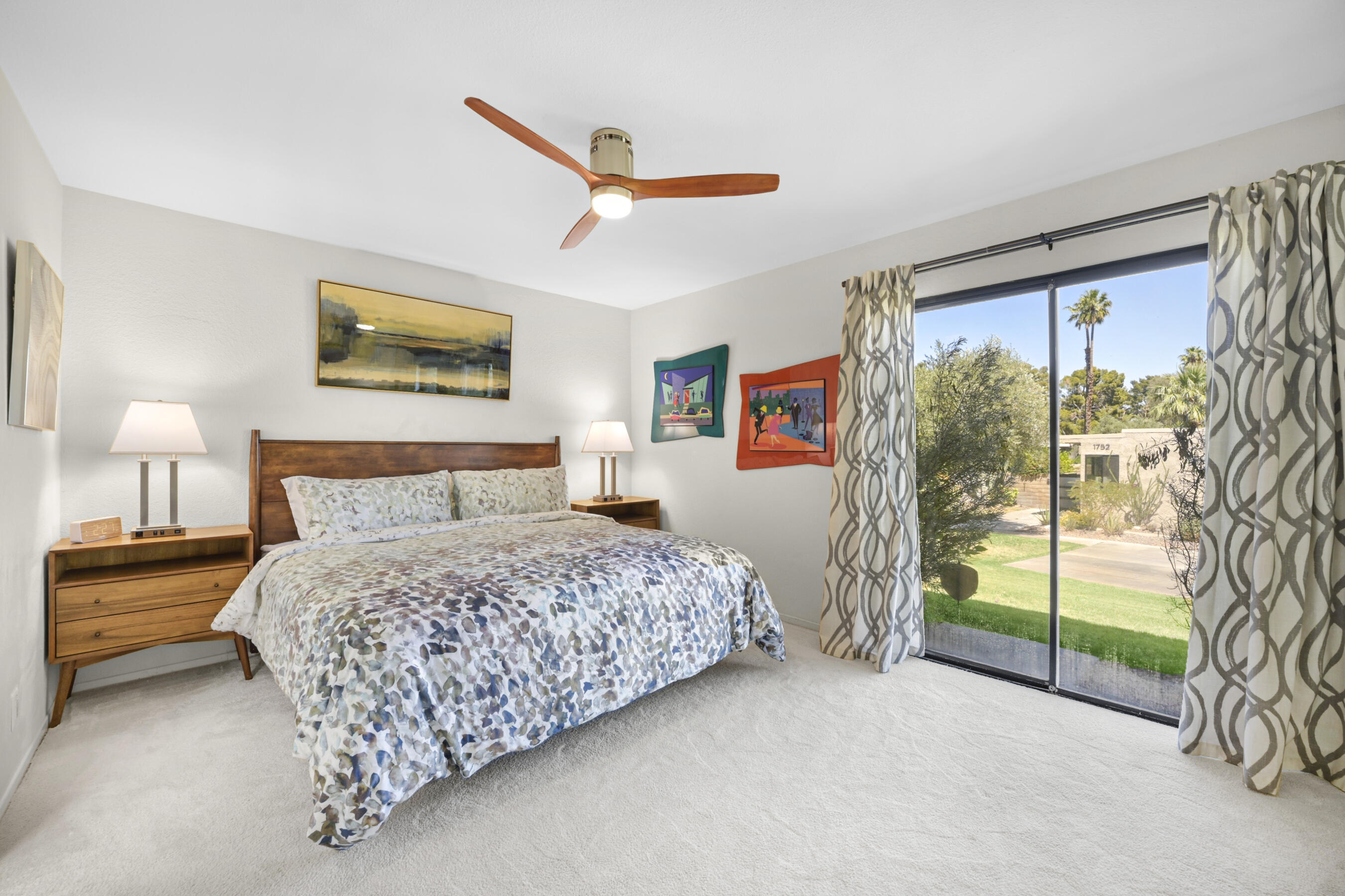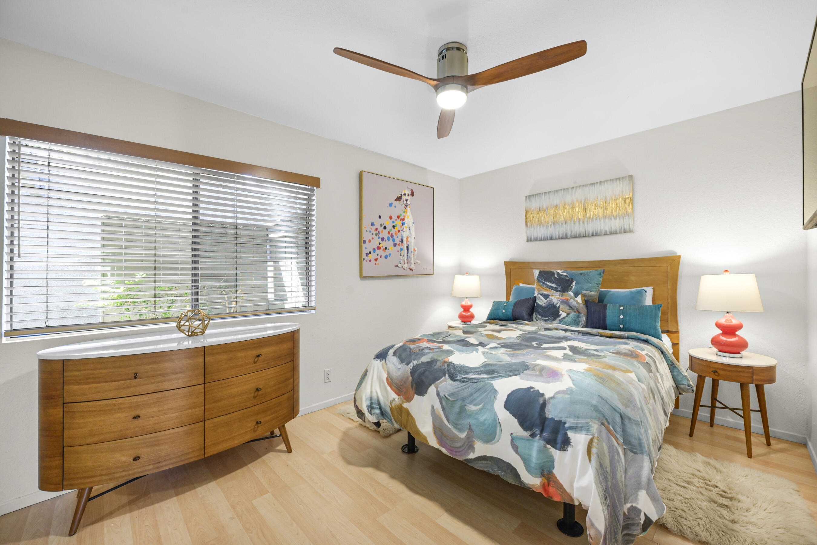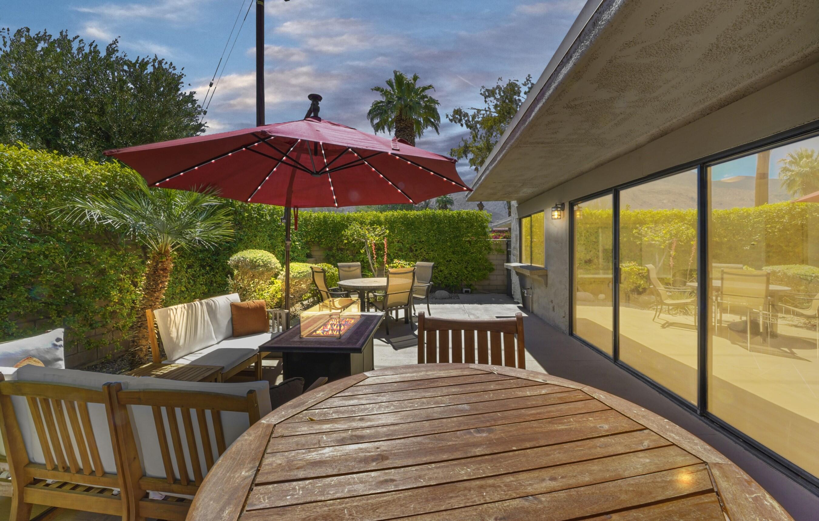 Stylish Desert Living in a Donald Wexler-Designed Home. Enjoy the privacy of a single-family home with the convenience of a condo in this architecturally significant 1,050 sq. ft. end-unit residence at Sagewood--designed by legendary modernist Donald Wexler. Situated on a premium lot within one of Palm Springs' most iconic communities, this rare offering captures the essence of mid-century design with timeless appeal and effortless indoor-outdoor flow. This 2-bedroom, 2-bathroom home is thoughtfully designed to maximize natural light, privacy, and livability. The spacious open-concept living, dining, and kitchen area is ideal for entertaining and everyday living. The kitchen features new white quartz countertops, a modern sink, and a breakfast bar, blending style, convenience, and functionality. Floor-to-ceiling windows and expansive glass sliders in the living room invite the outdoors in, opening to a private, south-facing lush garden patio with spectacular mountain views. Adorned with a gorgeous hedge, this serene outdoor space offers natural beauty, privacy, and a perfect setting for relaxation or entertaining guests. The primary bathroom has been fully remodeled, offering a luxurious spa-like experience with high-end finishes and thoughtful design. Additional highlights include an attached garage, an extra-long driveway for convenient guest parking, and prime end-unit positioning that enhances privacy and quiet enjoyment rarely found in condo living. The home is being sold furnished, offering a turnkey opportunity for full-time residents, vacationers, or investors. Sagewood is a low-density, 18-acre community with only 108 homes--one-third of the site dedicated to open green space. The landscaping is lush and meticulously maintained, featuring mature desert trees, vibrant flora, and expansive greenbelts. Community amenities include three sparkling pools with spas and a newly upgraded pickleball/tennis court, professionally installed by the same company that crafInterested in this Listing?