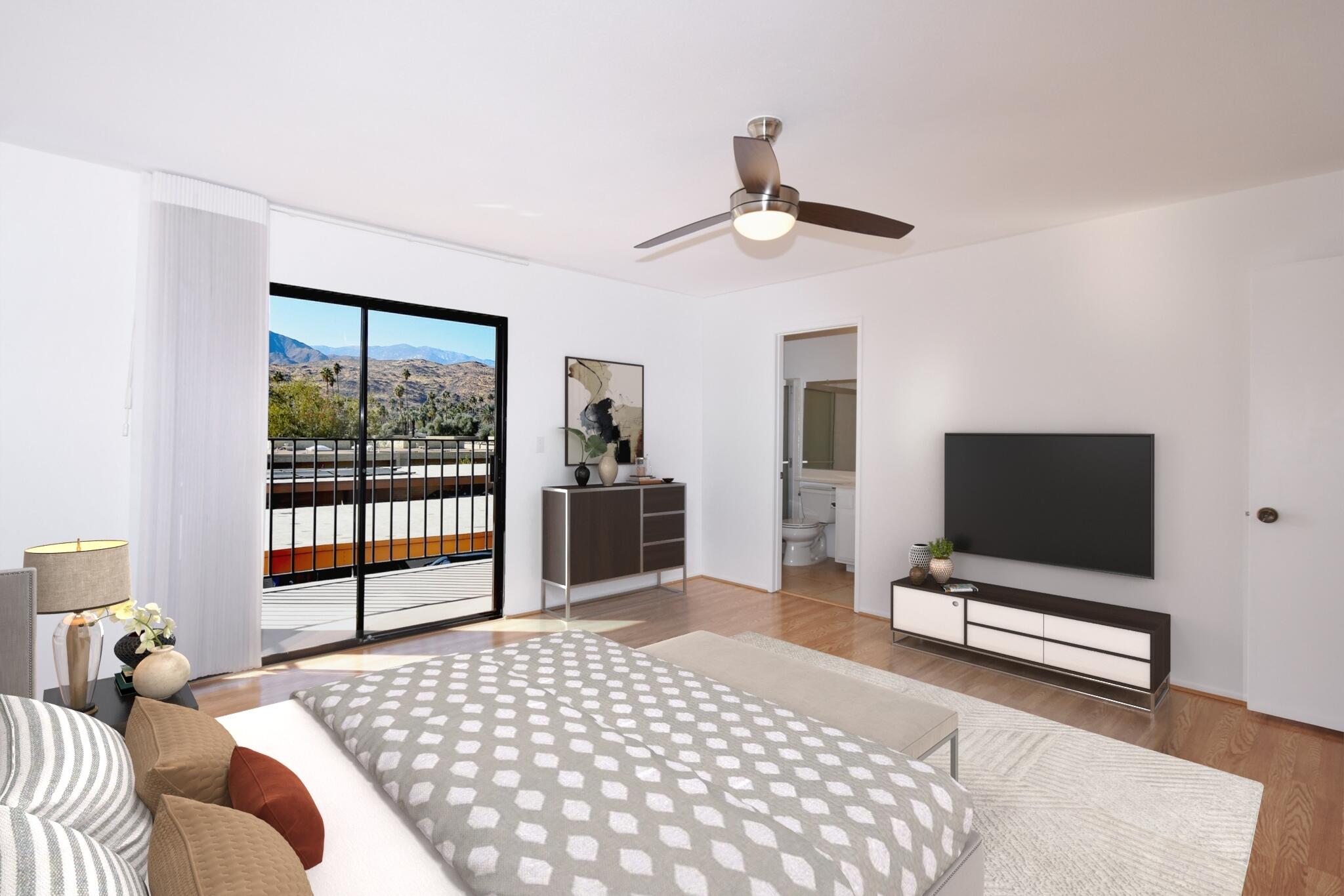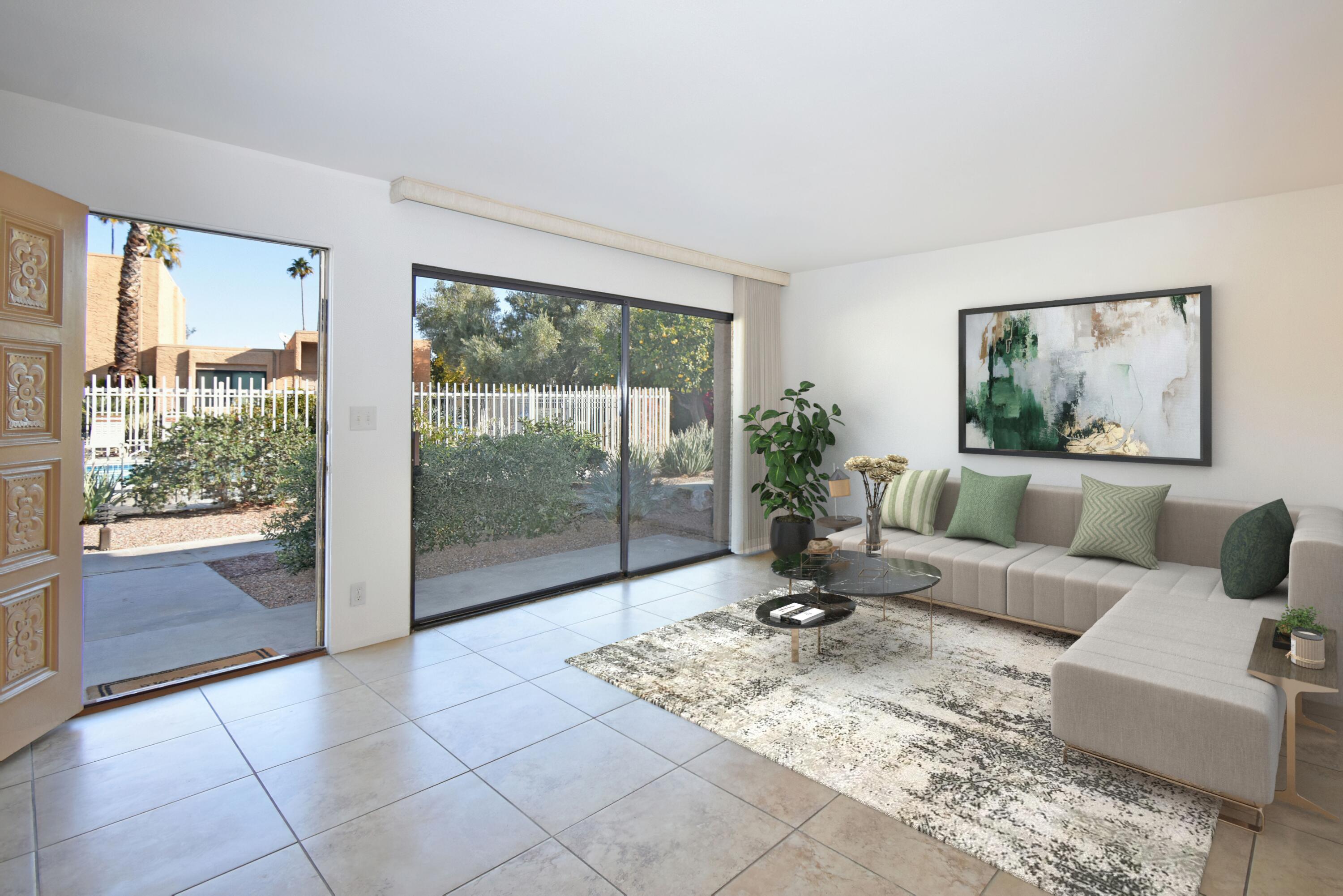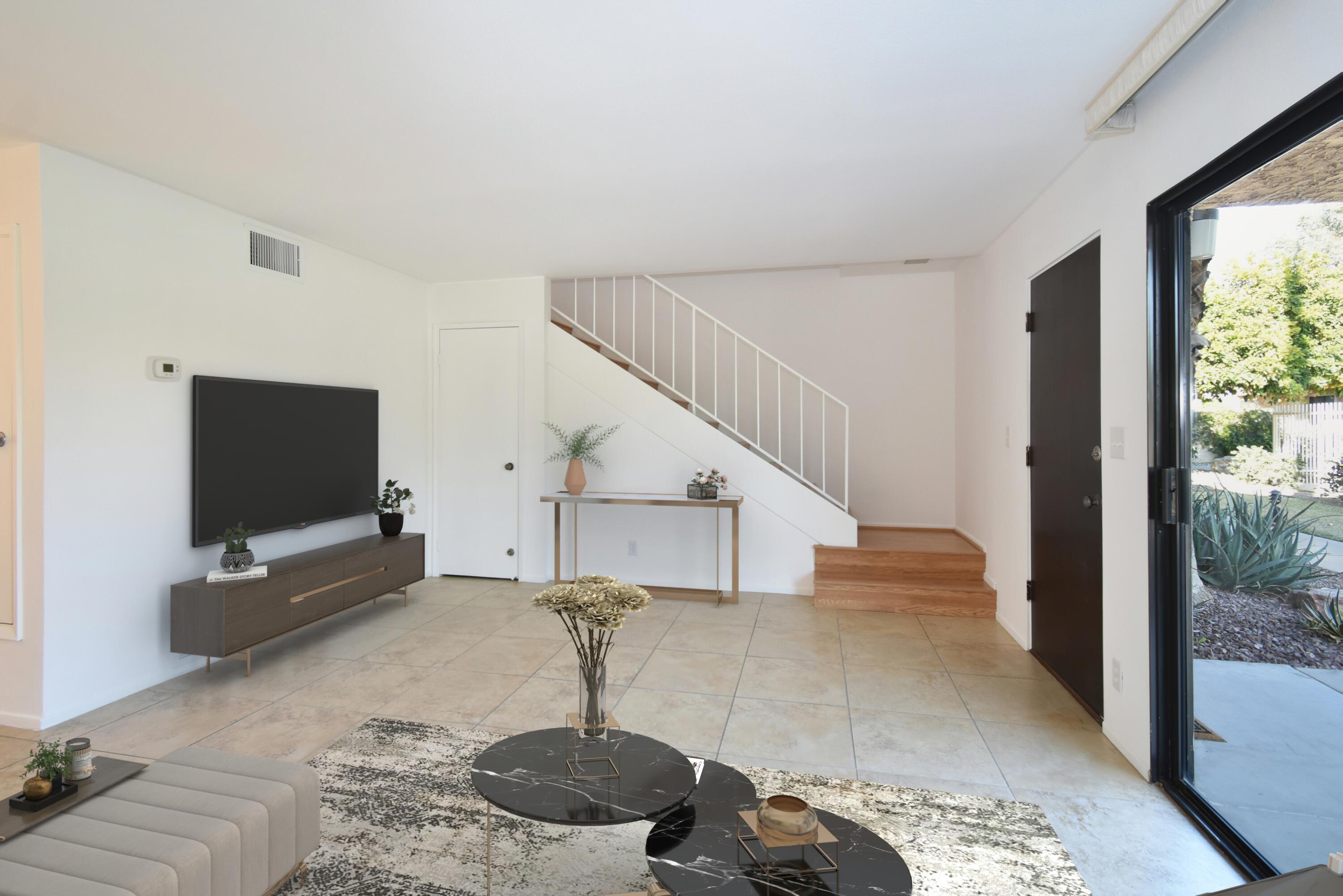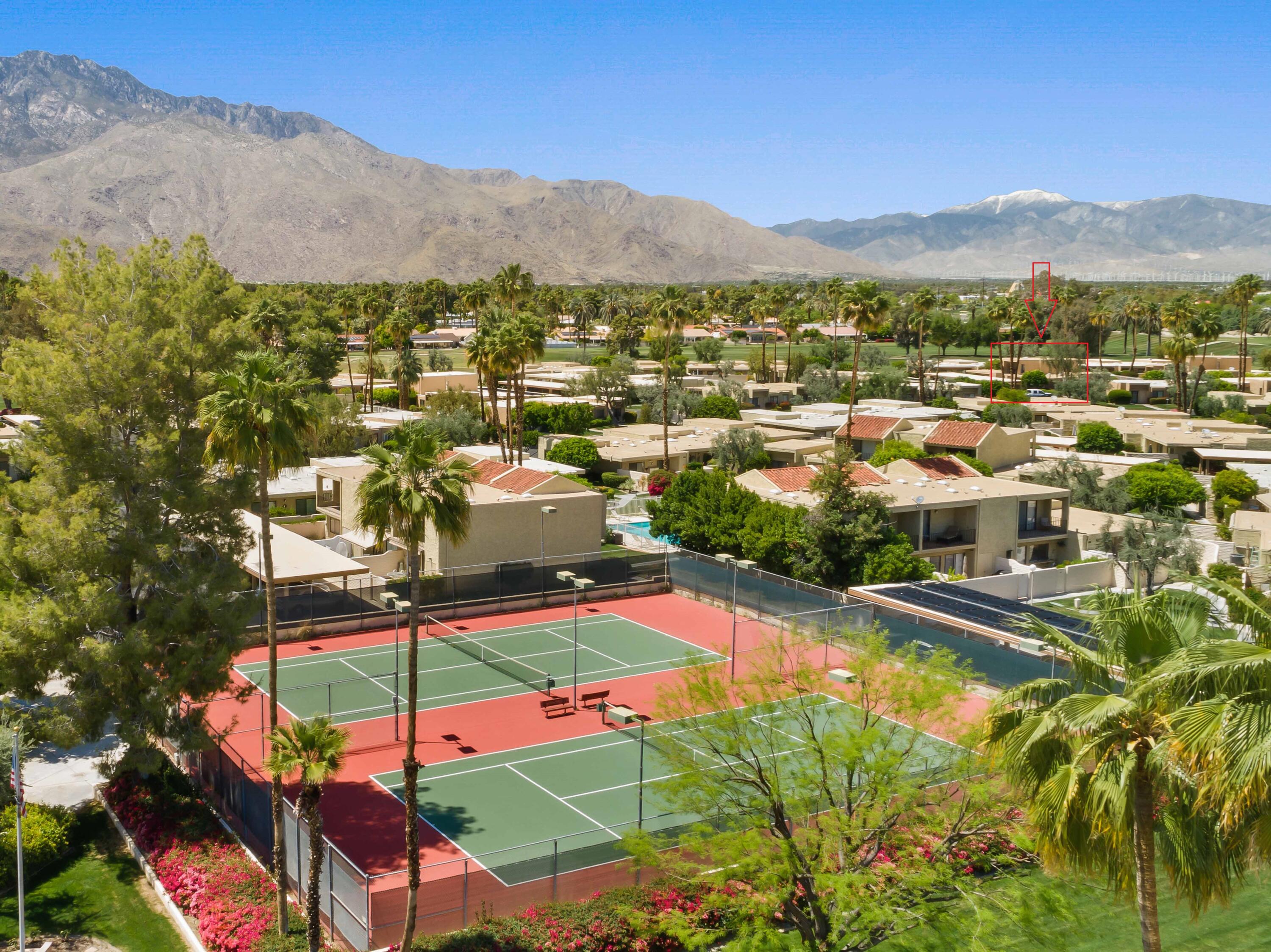 Just Reduced - new price and priced to sell! IMMACULATE and MOVE IN READY - A place to call home - or - a great investment for seasonal or a full-time rental. The TRIFECTA - Mountain, Pool & nearby Golf Course views, all just steps away! Gorgeous and updated condo on FEE land (you own it) in the popular South Palm Springs - away from the wind and close to downtown. Newer updates include A/C in 2024, new paint and garbage disposal in 2025. The updated kitchen has granite counters. Allergy sufferers love NO CARPET with tile downstairs, wood laminate on the stairs and upstairs. This home also has a private rear patio with adjoining assigned carport parking. The upstairs bedrooms are HUGE, each with their own balcony and jaw-dropping views! The downstairs bedroom is being used a den (still has a closet, but interior doors removed) with a slider to the private back patio. Step out front and enjoy the pool just a few feet away. The HOA has 11 community pools, 8 newer pickleball courts, 2 lighted tennis courts, 2 hot tubs, a workout room and a meeting room all with the ease of a 14-day minimum rental policy. Dues include water, trash, exterior maintenance and roof coverage - and new for 2025 - the HOA has earthquake insurance. The community is conveniently located, just a short drive to downtown Palm Springs, the airport, lots of shopping or a quick hop to El Paseo in Palm Desert. Shopping, bike trails, walking and hiking - all nearby - the fun starts here, come tour this home today!Interested in this Listing?
