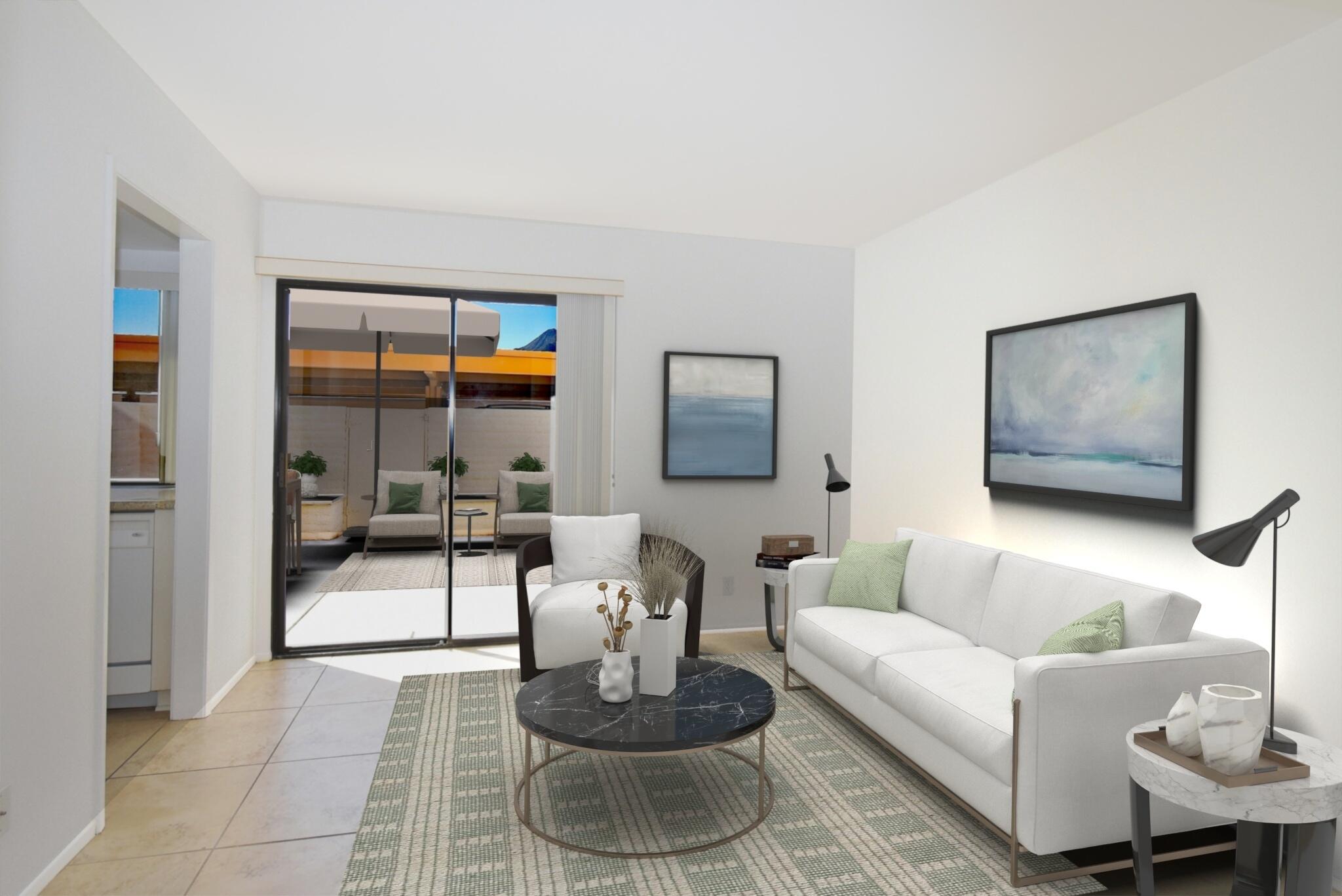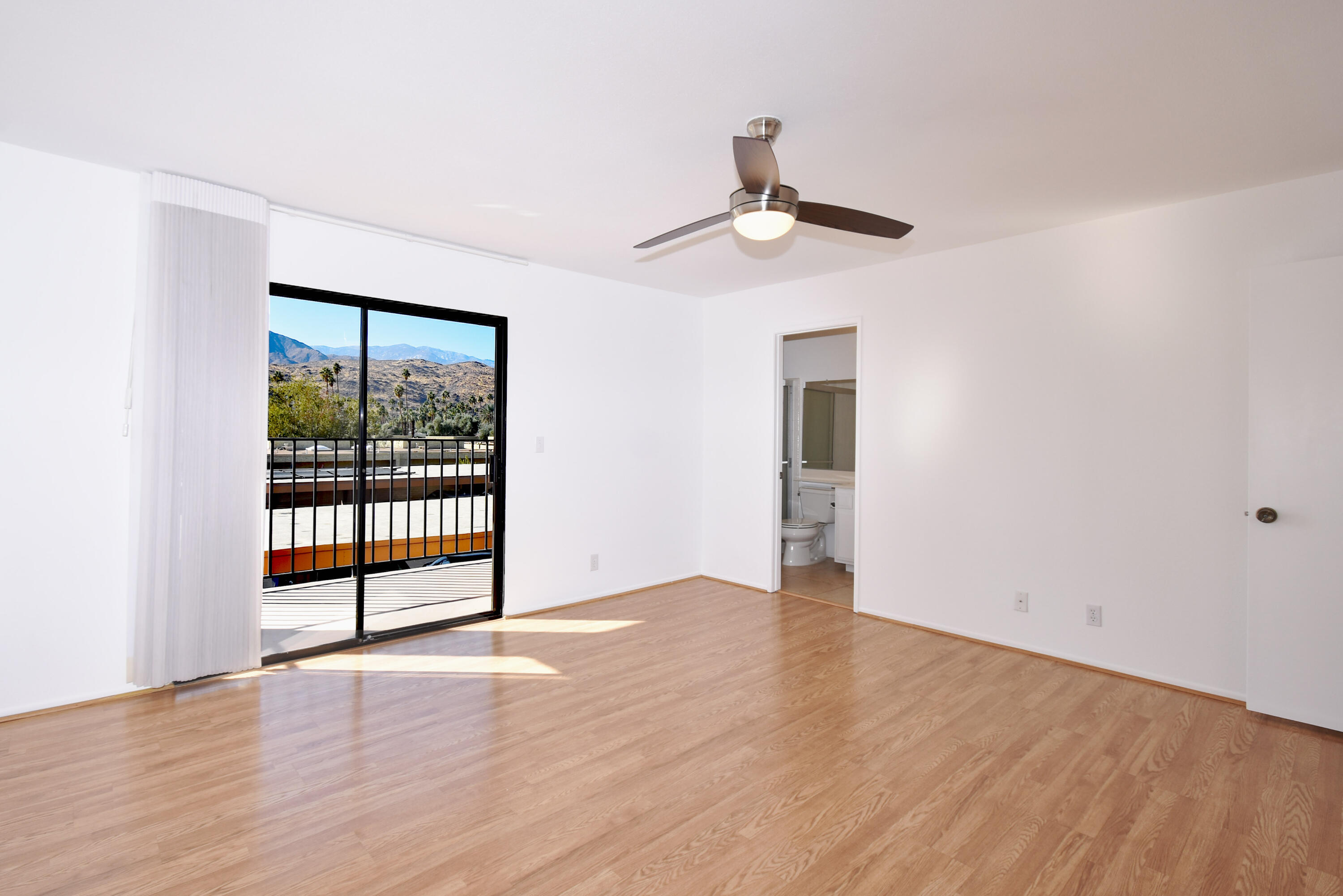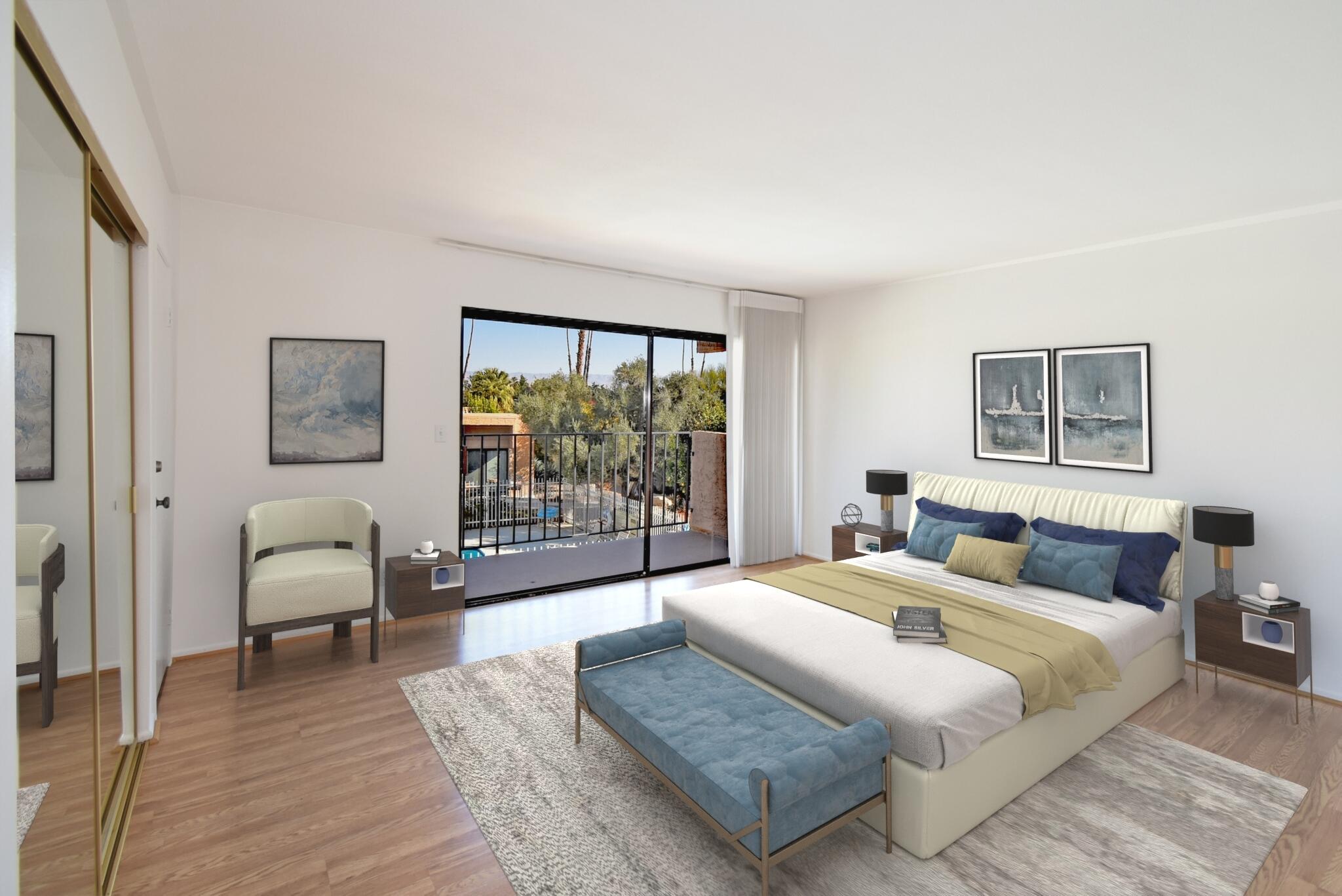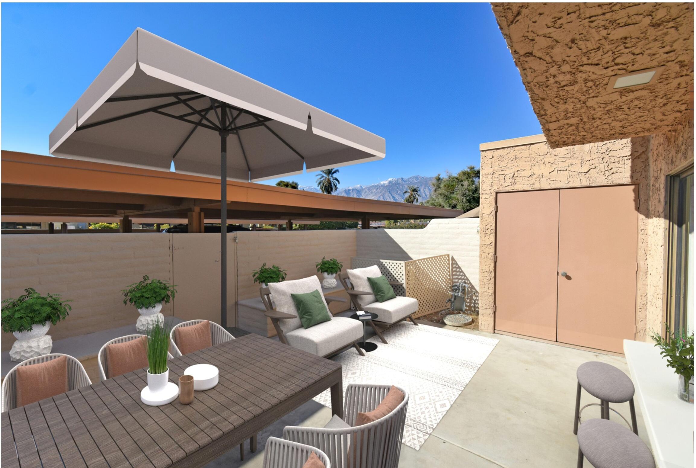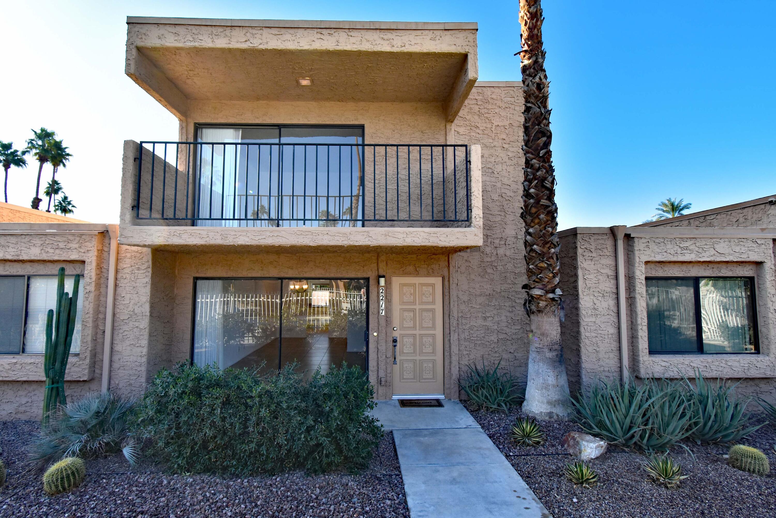 Just Reduced - new price and priced to sell! IMMACULATE and MOVE IN READY - A place to call home - or - a great investment for seasonal or a full-time rental. The TRIFECTA - Mountain, Pool & nearby Golf Course views, all just steps away! Gorgeous and updated condo on FEE land (you own it) in the popular South Palm Springs - away from the wind and close to downtown. Newer updates include A/C in 2024, new paint and garbage disposal in 2025. The updated kitchen has granite counters. Allergy sufferers love NO CARPET with tile downstairs, wood laminate on the stairs and upstairs. This home also has a private rear patio with adjoining assigned carport parking. The upstairs bedrooms are HUGE, each with their own balcony and jaw-dropping views! The downstairs bedroom is being used a den (still has a closet, but interior doors removed) with a slider to the private back patio. Step out front and enjoy the pool just a few feet away. The HOA has 11 community pools, 8 newer pickleball courts, 2 lighted tennis courts, 2 hot tubs, a workout room and a meeting room all with the ease of a 14-day minimum rental policy. Dues include water, trash, exterior maintenance and roof coverage - and new for 2025 - the HOA has earthquake insurance. The community is conveniently located, just a short drive to downtown Palm Springs, the airport, lots of shopping or a quick hop to El Paseo in Palm Desert. Shopping, bike trails, walking and hiking - all nearby - the fun starts here, come tour this home today!Interested in this Listing?