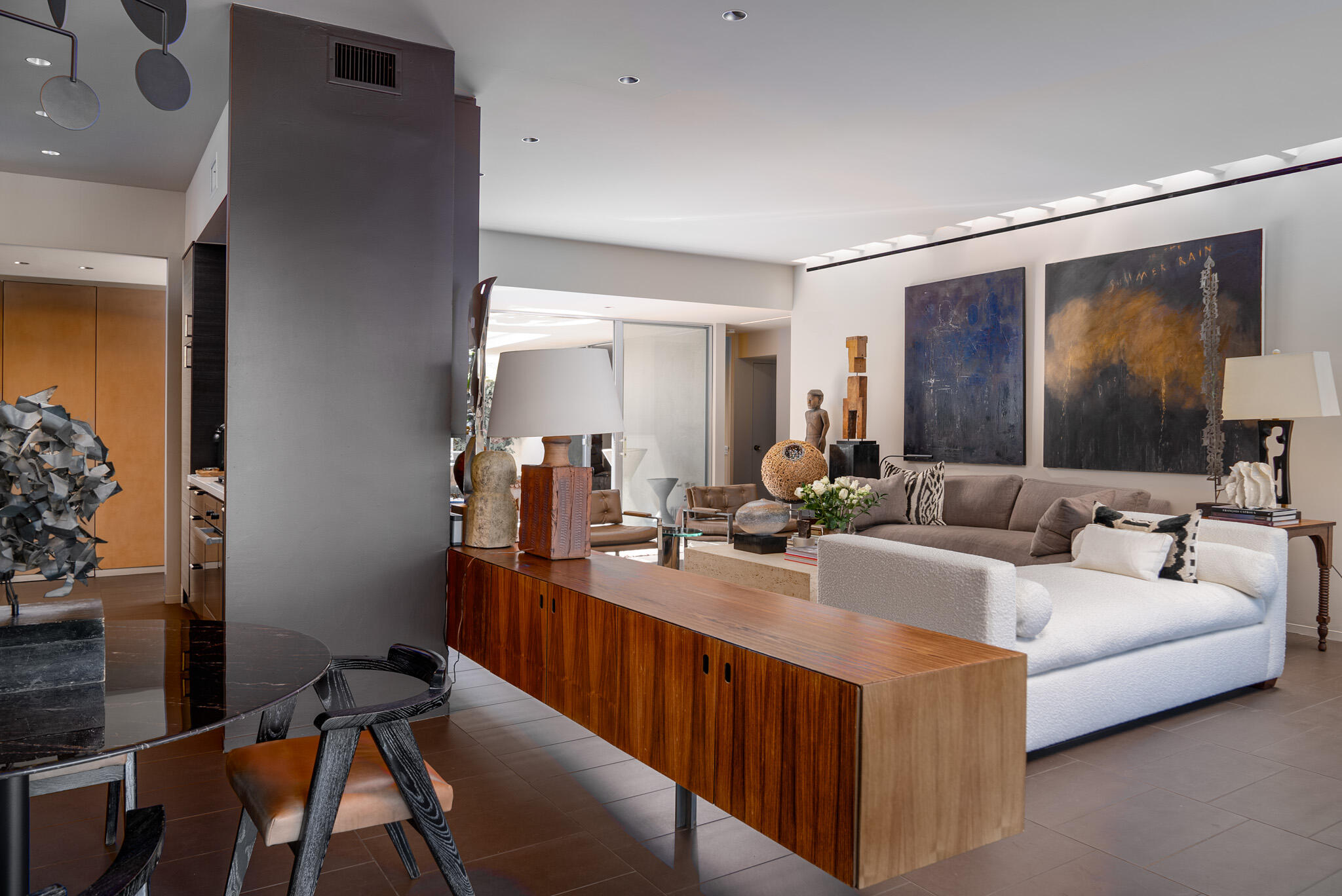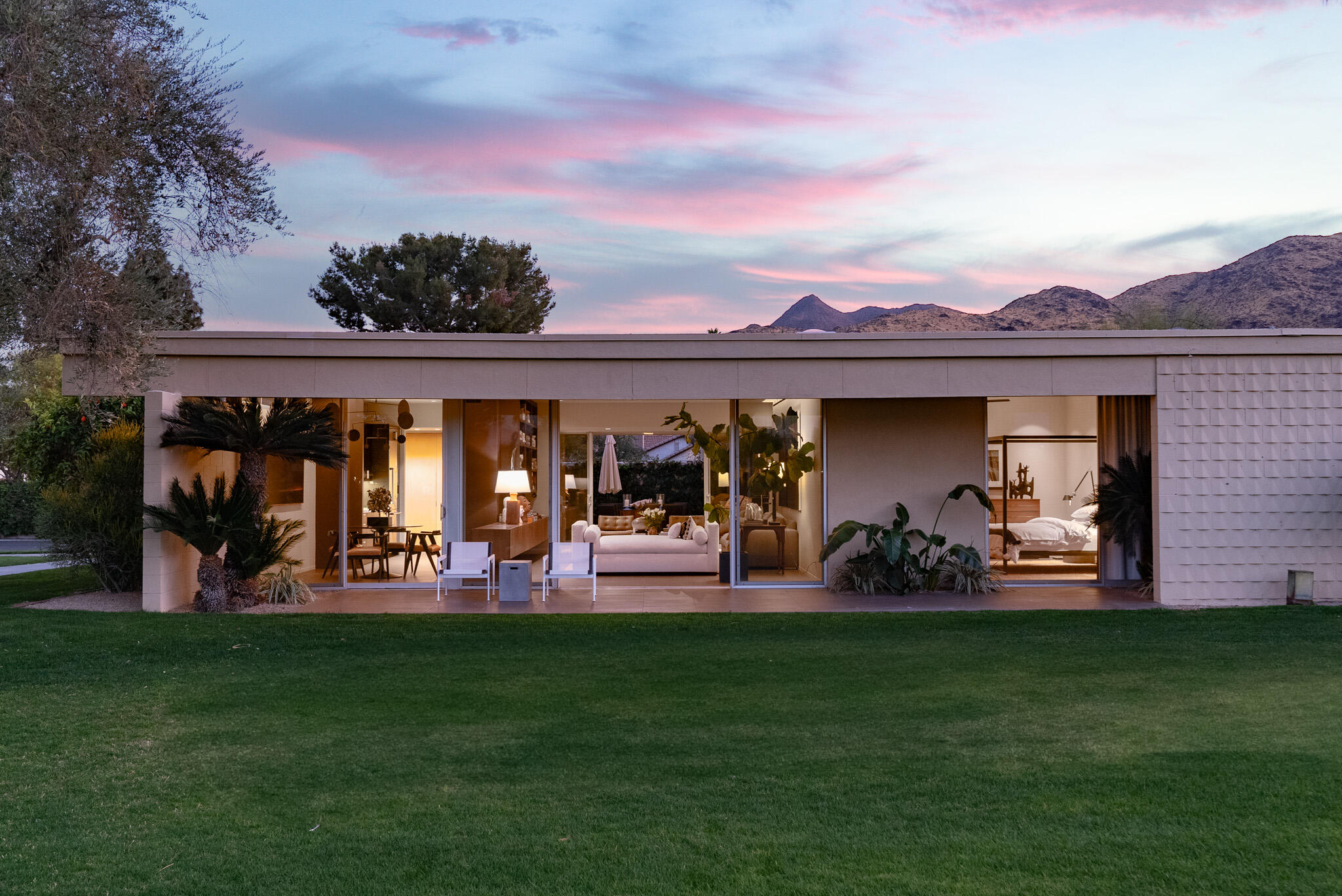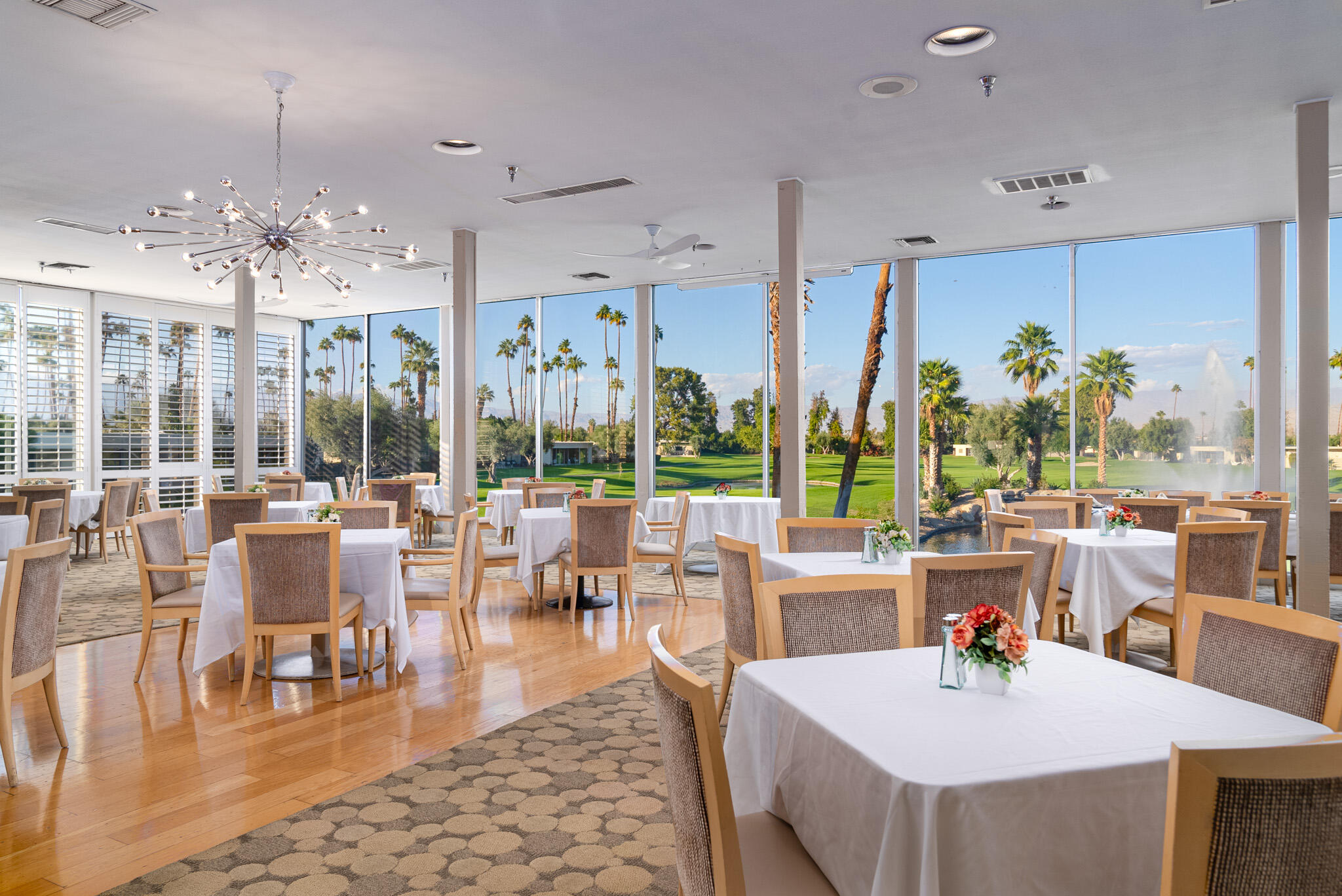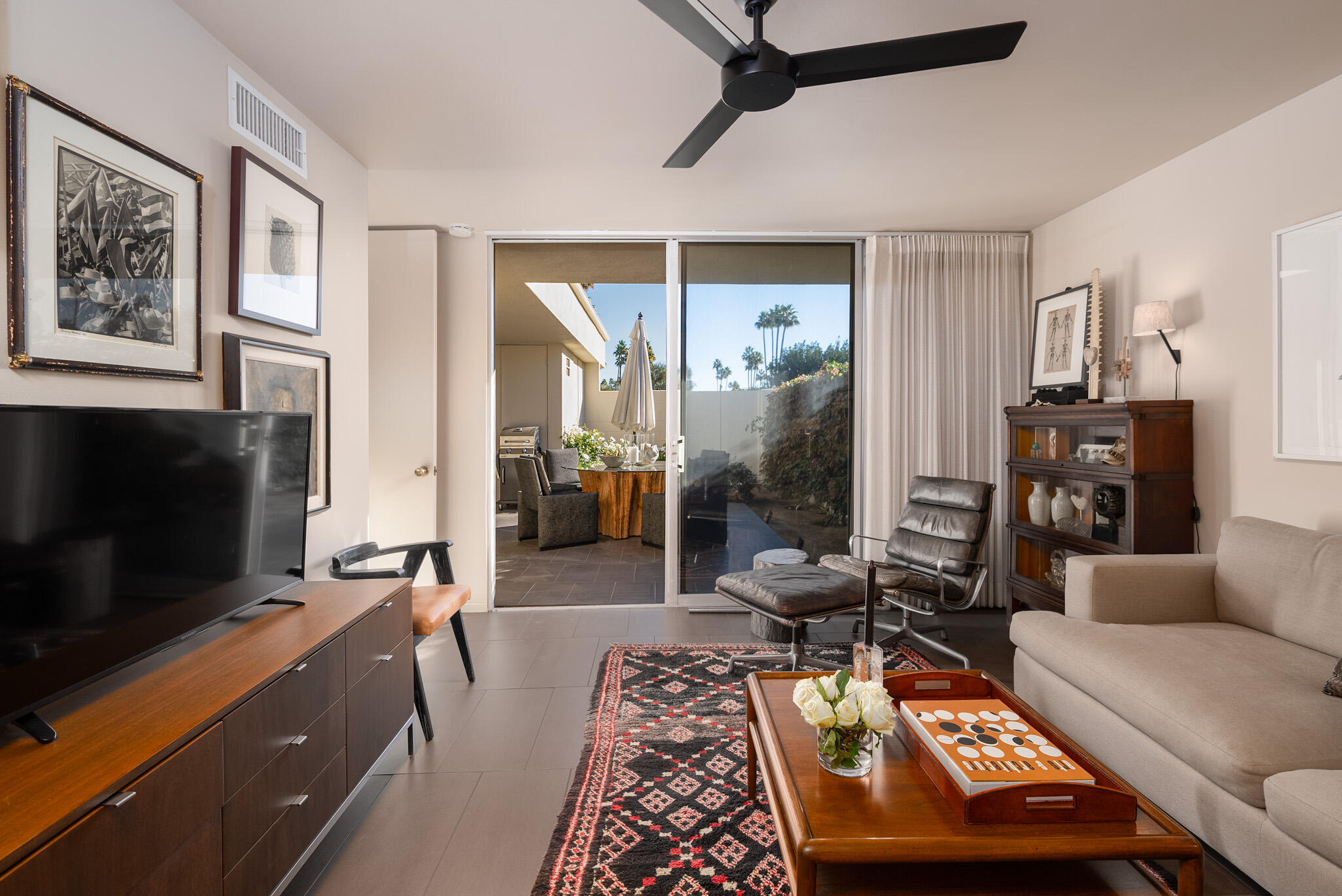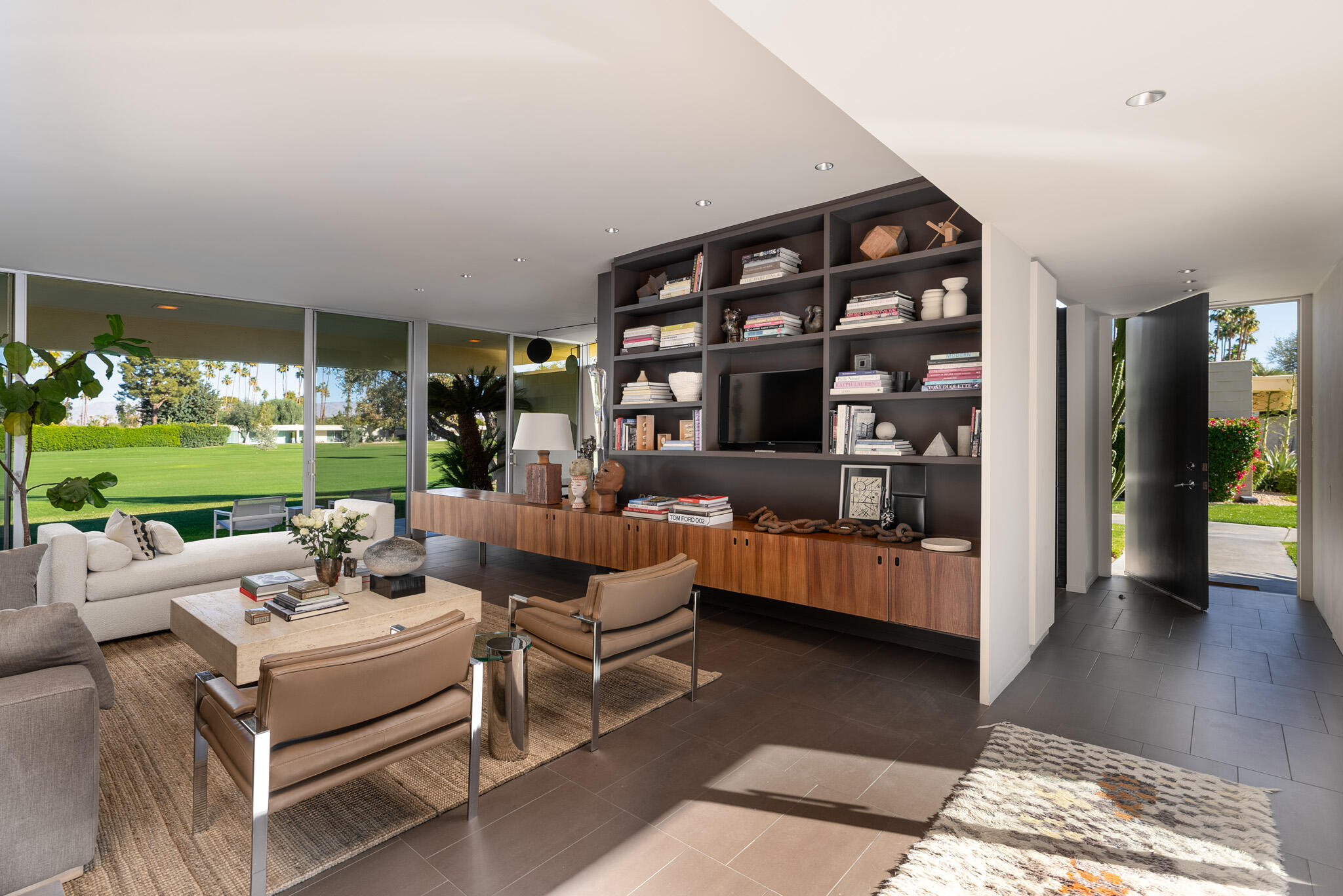 Embrace the iconic Palm Springs Mid-Century lifestyle in the coveted Seven Lakes Country Club. Situated in a prime location with breathtaking triple fairway views, this architectural gem, designed by renowned modernist architect Richard Harrison, epitomizes desert luxury. Step into a sun-drenched living space, where natural light pours in through a dramatic linear skylight that stretches across the living room. A custom cantilevered rosewood credenza thoughtfully divides the living and dining areas, adding a touch of artistry and sophistication. Each room seamlessly connects to the outdoors, with floor-to-ceiling sliders that open onto either a serene private patio or a lush inner courtyard--perfect for year-round indoor-outdoor living. The home's porcelain tile, laid in a striking ashlar bond pattern, exudes contemporary elegance while flowing effortlessly from interior spaces to exterior tranquility, creating a harmonious connection to the surrounding landscape. At the heart of the home, a modern chef's kitchen awaits, outfitted with premium Miele and Thermador appliances and custom wooden cabinetry crowned with sleek new quartz countertops--an ideal space for culinary creativity. New ceiling fans and discreet linear HVAC diffusers ensure optimal comfort in every room. Both spacious bedrooms feature lacquered cabinetry, built-in shelving, and ample closet storage, offering a blend of practicality and style.This exceptional residence is the ultimate retreat, where refined design and luxury living converge in one of Palm Springs' most desirable communities.Interested in this Listing?
