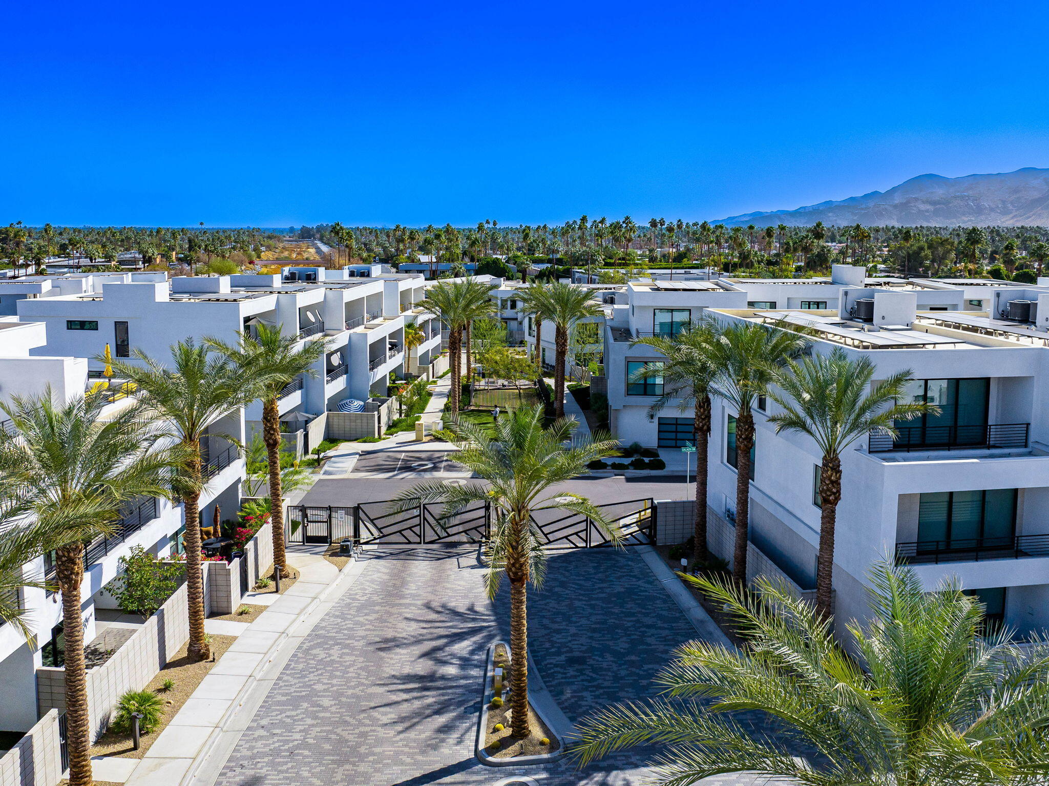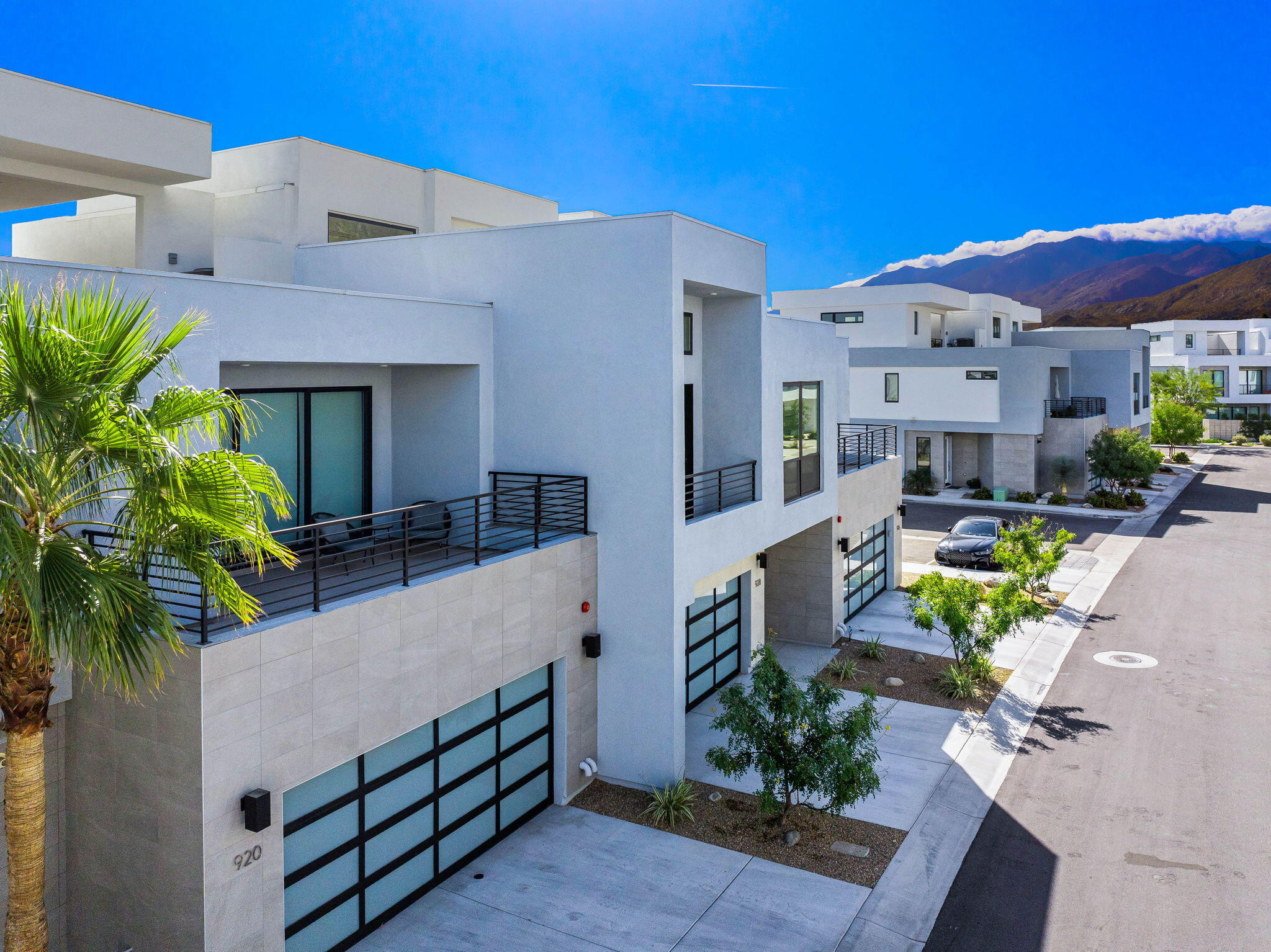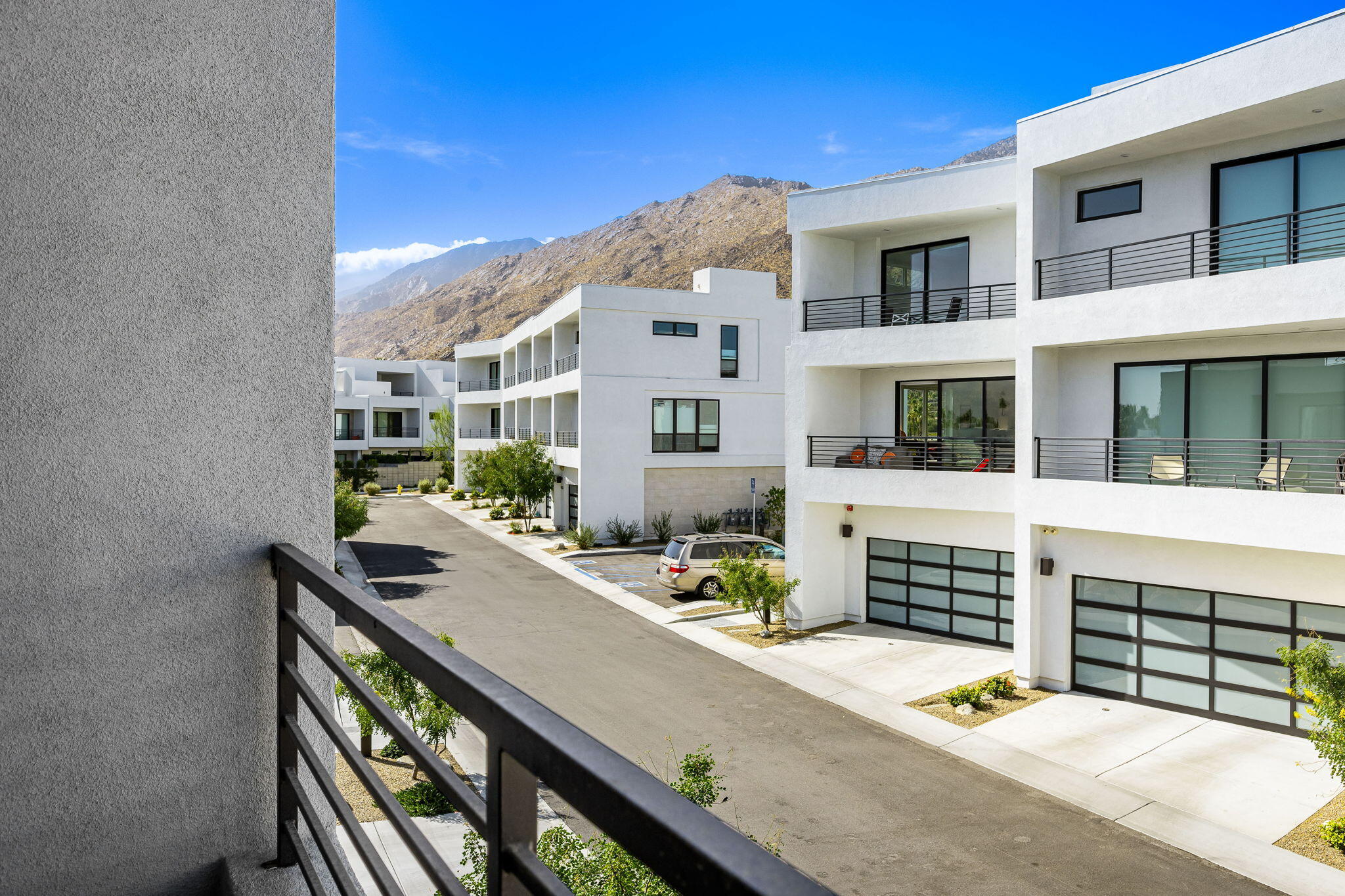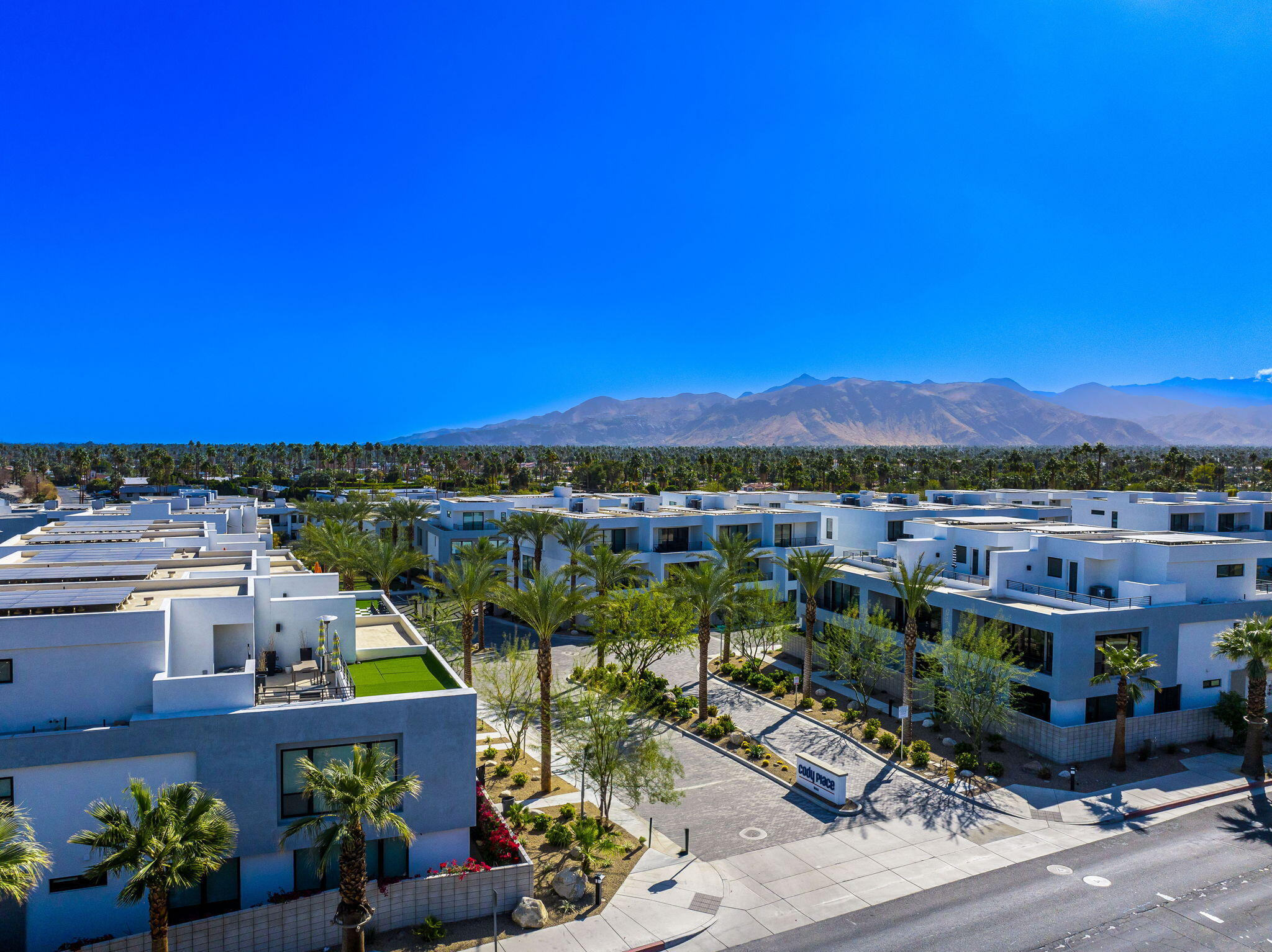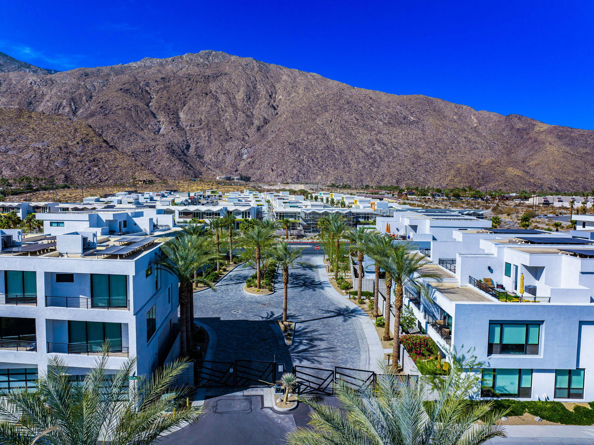 Experience the best of Palm Springs living in this stunning contemporary home located in Cody Place, a premier gated community just moments from downtown. Enjoy the convenience of being within walking distance of top rated restaurants, vibrant nightlife, and shopping, all while indulging in resort style amenities. This exquisite multi-level residence is designed for modern comfort and efficiency, featuring an owned solar system, a finished two-car garage with epoxy flooring, EV charging, and a dual-zone HVAC system for year-round comfort. Step inside to find a custom-upgraded kitchen with a spacious island, perfect for entertaining. The open concept first level is accentuated by large custom tile flooring and sliding stack doors that seamlessly extend the living/dining space to an outdoor area, ready for your personal touch. A grand staircase leads to the second floor, where a loft with soaring ceilings and clerestory windows offers breathtaking west-facing mountain views. This flexible space can serve as a den, media room, or home office. The second floor also features a laundry room, a guest bedroom with an adjacent bathroom, and a primary suite boasting southern mountain views of Southridge, with a spa-like ensuite, and a spacious walk-in closet. The highlight of this home is the third-level covered rooftop deck, perfect for entertaining or relaxing while taking in the breathtaking views. The home is also prewired for all your media and electrical needs, ensuring seamless connectivity throughout. Cody Place offers residents exclusive access to a beautiful clubhouse, two resort-style pools, including an olympic sized lap pool, a large spa, an outdoor fire pit, and a dog park. Don't miss this opportunity to own a luxurious, energy-efficient home in one of Palm Springs' most desirable communities. In the heart of the city, this is Cody Place!