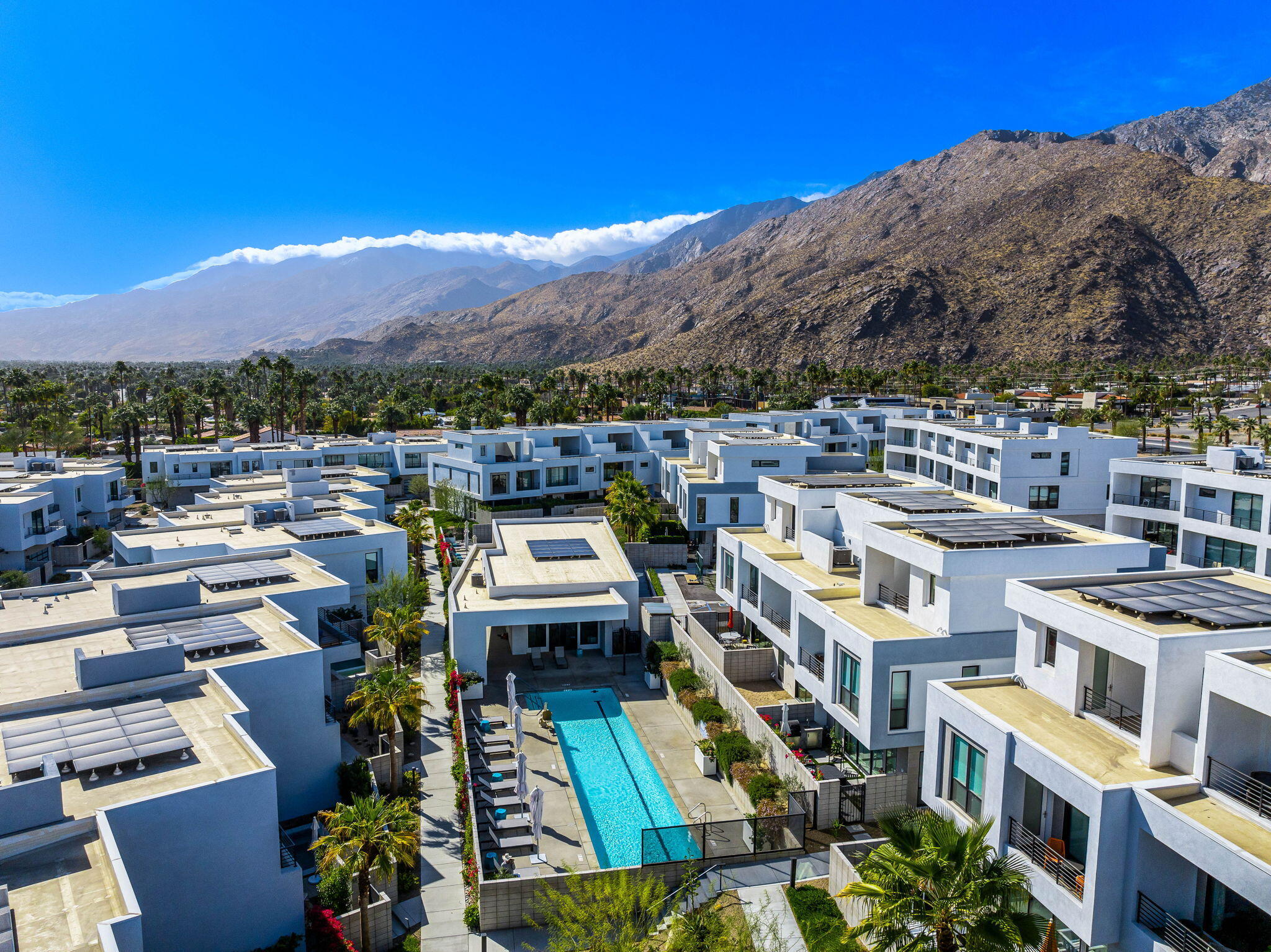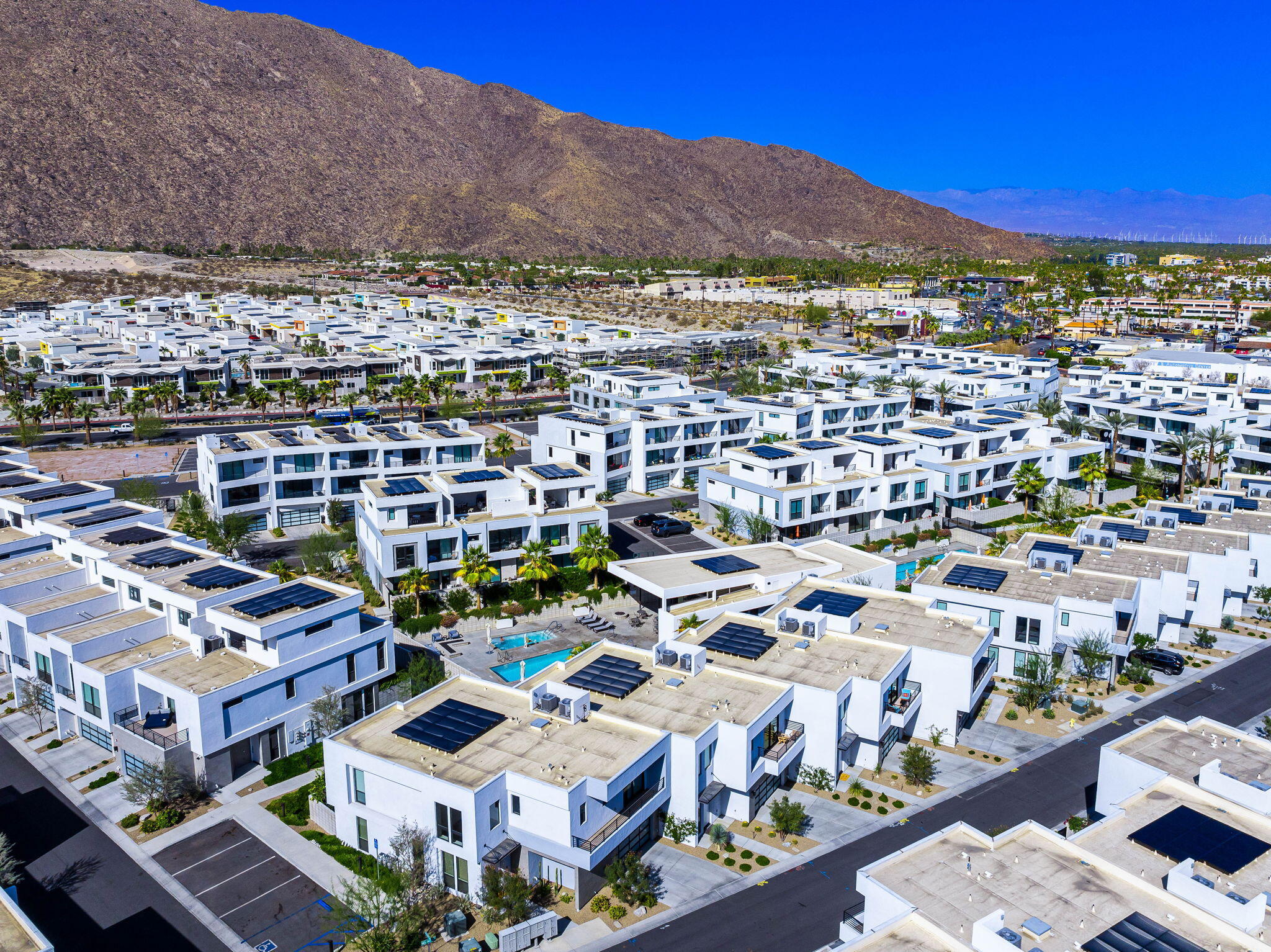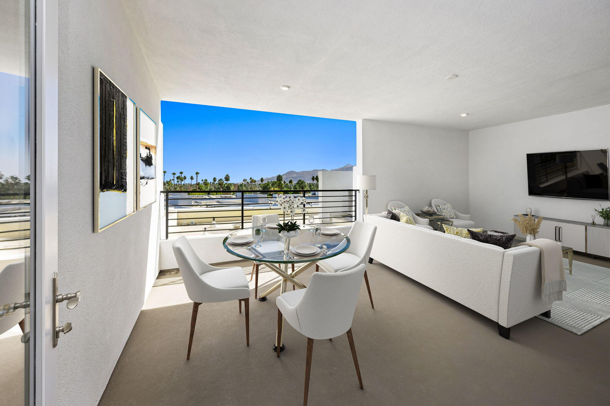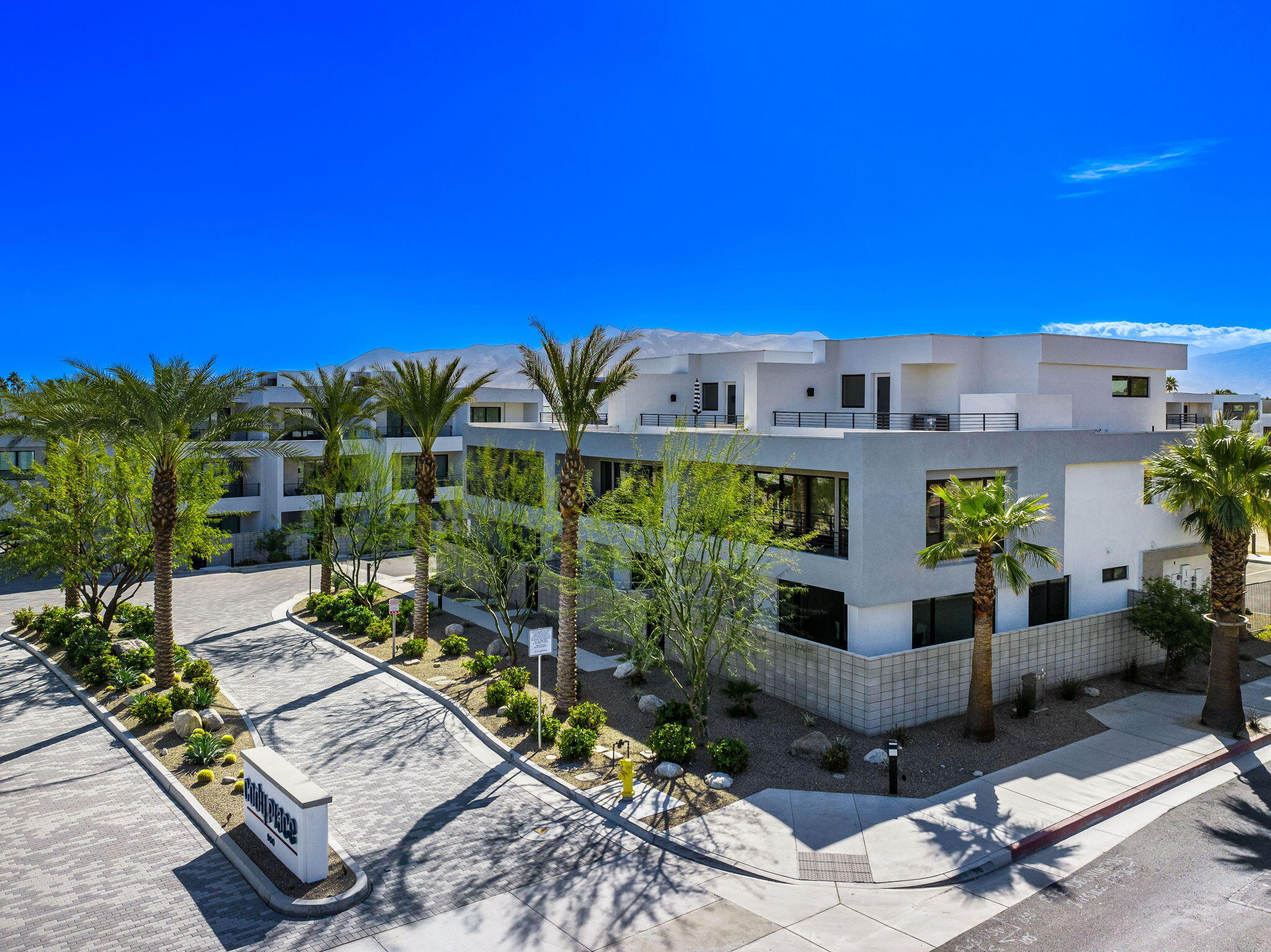 Experience the best of Palm Springs living in this stunning contemporary home located in Cody Place, a premier gated community just moments from downtown. Enjoy the convenience of being within walking distance of top rated restaurants, vibrant nightlife, and shopping, all while indulging in resort style amenities. This exquisite multi-level residence is designed for modern comfort and efficiency, featuring an owned solar system, a finished two-car garage with epoxy flooring, EV charging, and a dual-zone HVAC system for year-round comfort. Step inside to find a custom-upgraded kitchen with a spacious island, perfect for entertaining. The open concept first level is accentuated by large custom tile flooring and sliding stack doors that seamlessly extend the living/dining space to an outdoor area, ready for your personal touch. A grand staircase leads to the second floor, where a loft with soaring ceilings and clerestory windows offers breathtaking west-facing mountain views. This flexible space can serve as a den, media room, or home office. The second floor also features a laundry room, a guest bedroom with an adjacent bathroom, and a primary suite boasting southern mountain views of Southridge, with a spa-like ensuite, and a spacious walk-in closet. The highlight of this home is the third-level covered rooftop deck, perfect for entertaining or relaxing while taking in the breathtaking views. The home is also prewired for all your media and electrical needs, ensuring seamless connectivity throughout. Cody Place offers residents exclusive access to a beautiful clubhouse, two resort-style pools, including an olympic sized lap pool, a large spa, an outdoor fire pit, and a dog park. Don't miss this opportunity to own a luxurious, energy-efficient home in one of Palm Springs' most desirable communities. In the heart of the city, this is Cody Place!