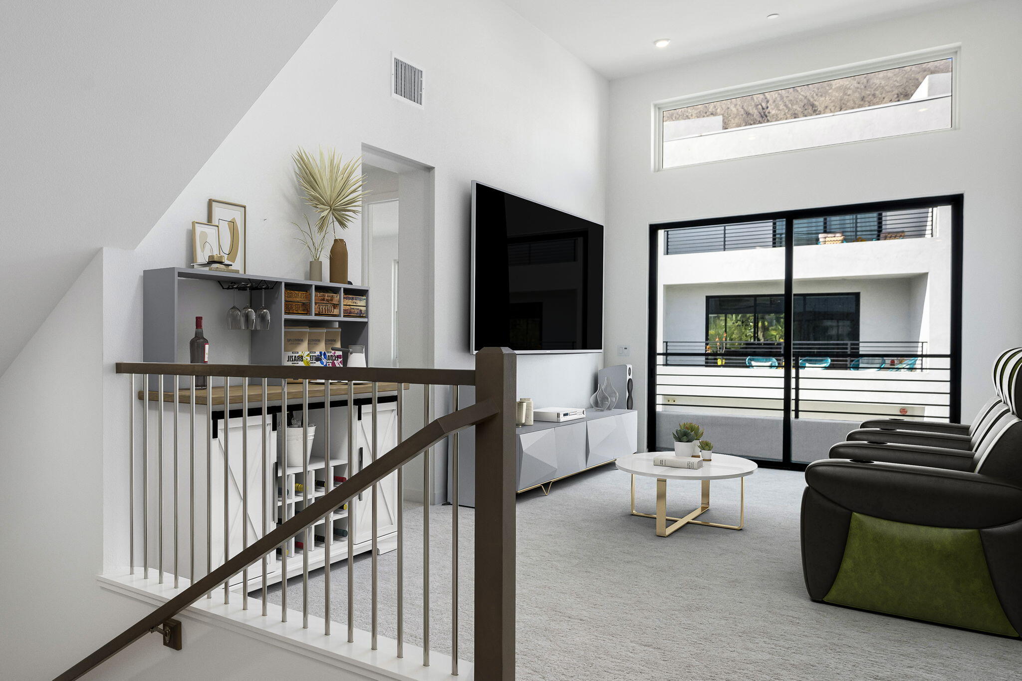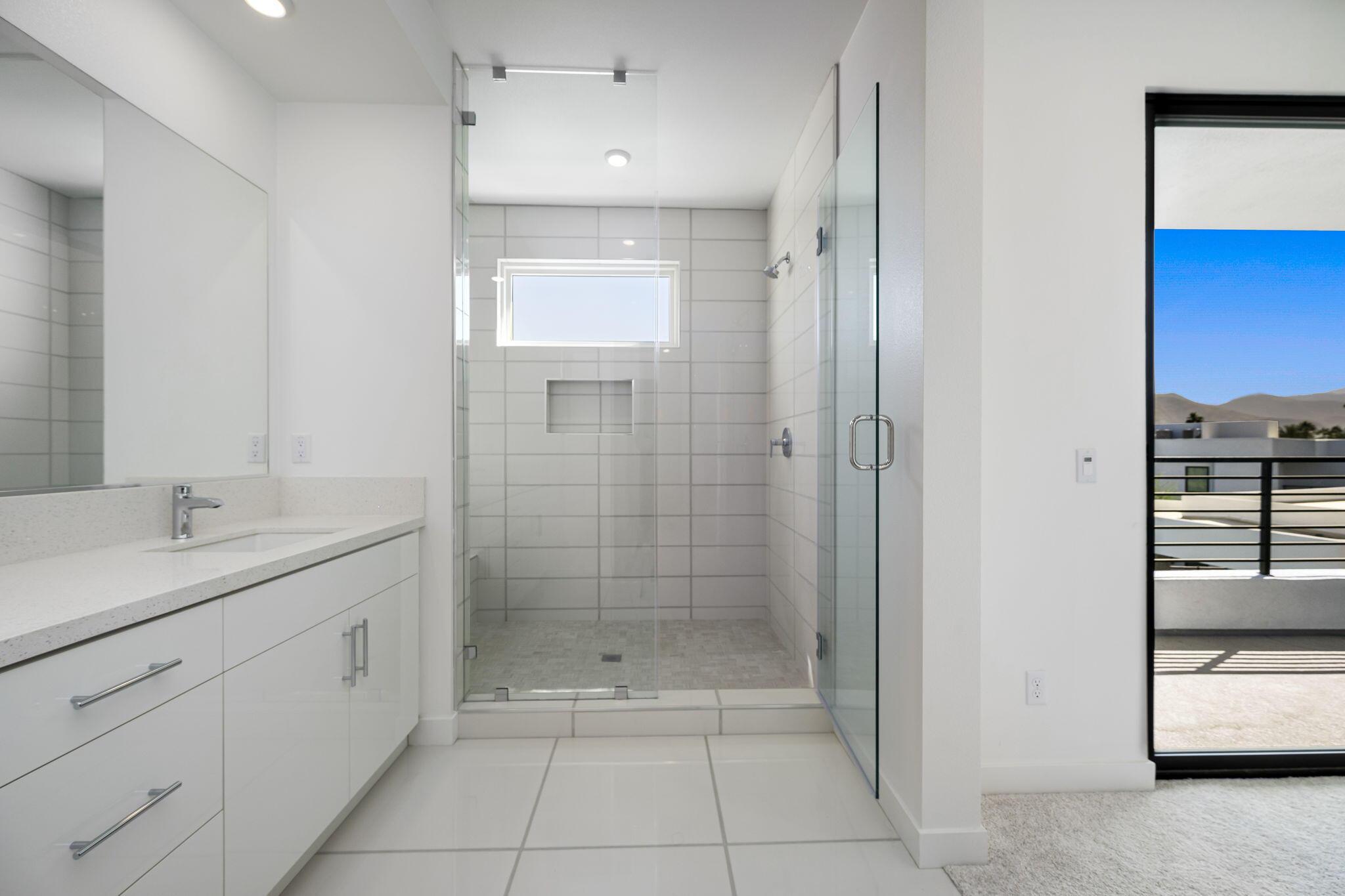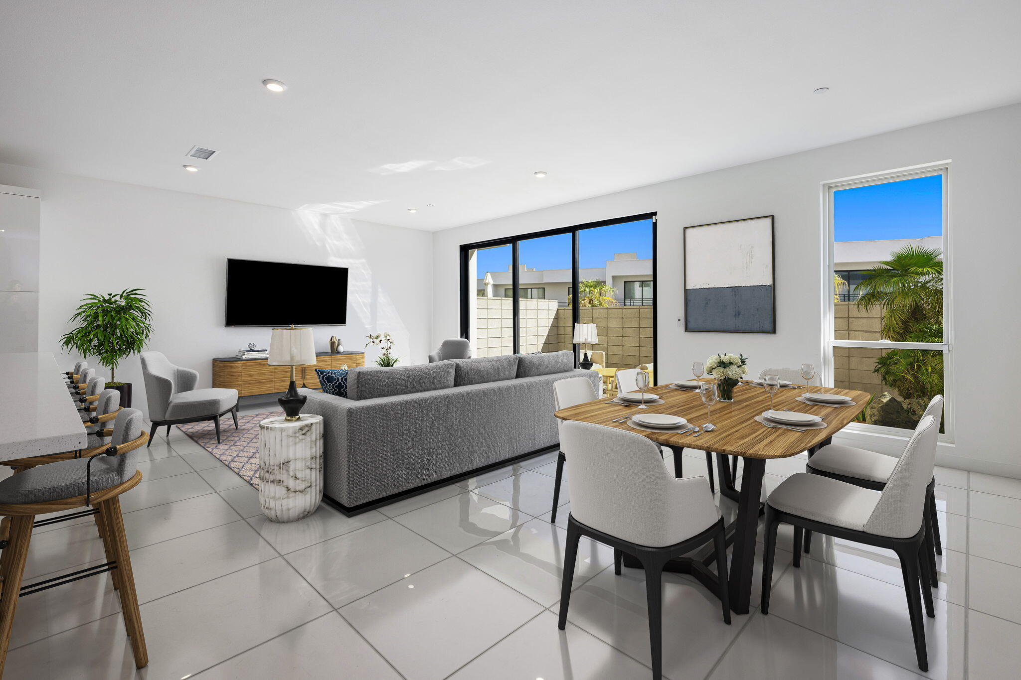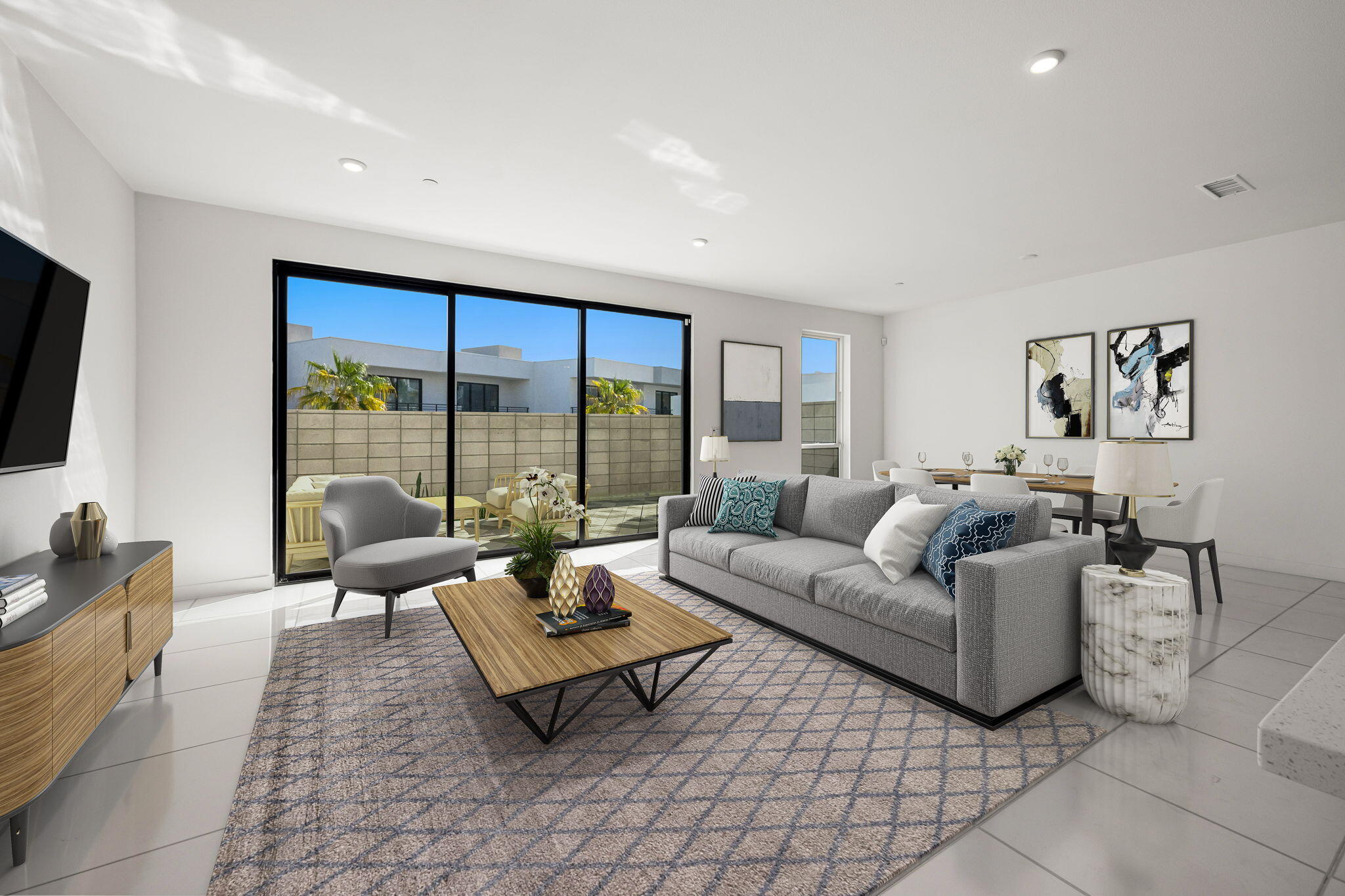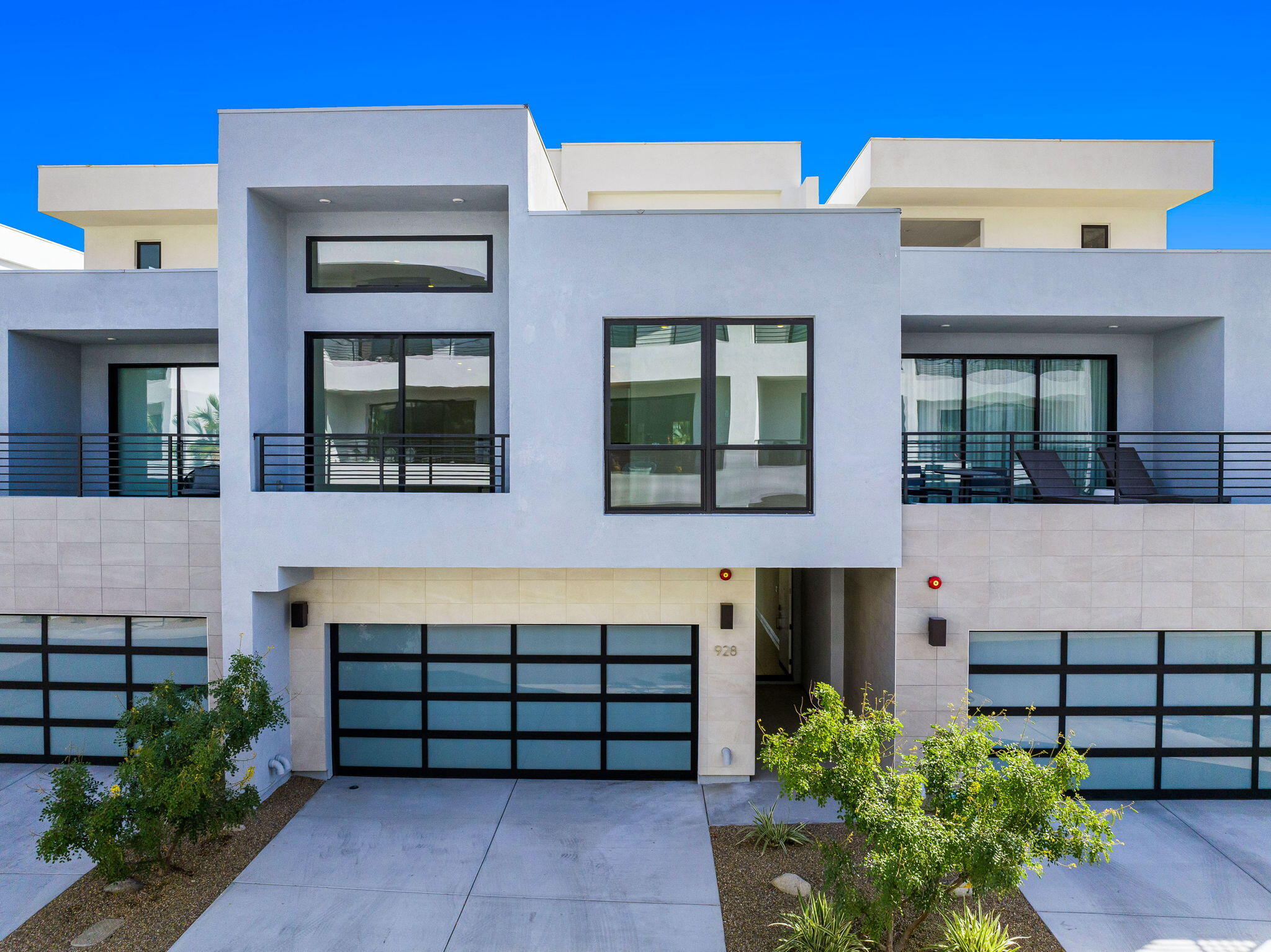 Experience the best of Palm Springs living in this stunning contemporary home located in Cody Place, a premier gated community just moments from downtown. Enjoy the convenience of being within walking distance of top rated restaurants, vibrant nightlife, and shopping, all while indulging in resort style amenities. This exquisite multi-level residence is designed for modern comfort and efficiency, featuring an owned solar system, a finished two-car garage with epoxy flooring, EV charging, and a dual-zone HVAC system for year-round comfort. Step inside to find a custom-upgraded kitchen with a spacious island, perfect for entertaining. The open concept first level is accentuated by large custom tile flooring and sliding stack doors that seamlessly extend the living/dining space to an outdoor area, ready for your personal touch. A grand staircase leads to the second floor, where a loft with soaring ceilings and clerestory windows offers breathtaking west-facing mountain views. This flexible space can serve as a den, media room, or home office. The second floor also features a laundry room, a guest bedroom with an adjacent bathroom, and a primary suite boasting southern mountain views of Southridge, with a spa-like ensuite, and a spacious walk-in closet. The highlight of this home is the third-level covered rooftop deck, perfect for entertaining or relaxing while taking in the breathtaking views. The home is also prewired for all your media and electrical needs, ensuring seamless connectivity throughout. Cody Place offers residents exclusive access to a beautiful clubhouse, two resort-style pools, including an olympic sized lap pool, a large spa, an outdoor fire pit, and a dog park. Don't miss this opportunity to own a luxurious, energy-efficient home in one of Palm Springs' most desirable communities. In the heart of the city, this is Cody Place!